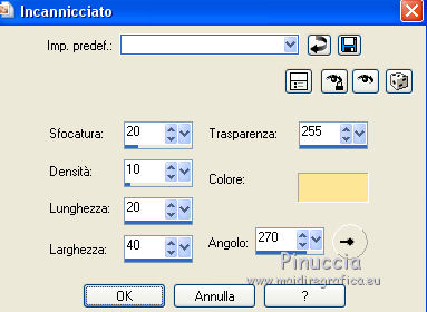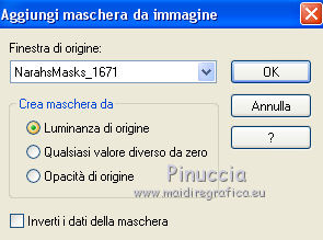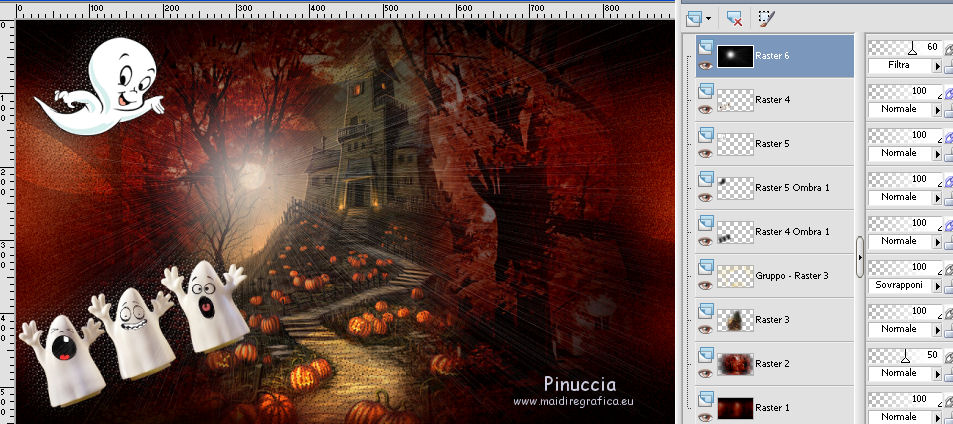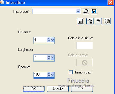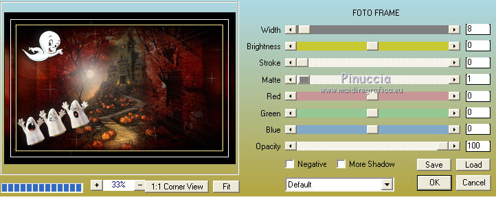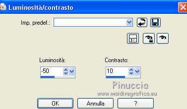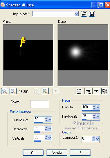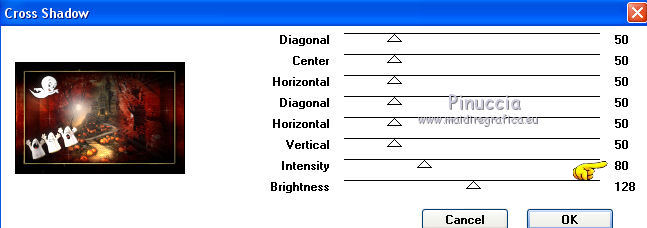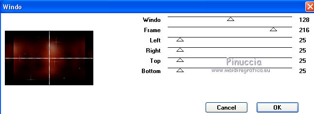 qui puoi trovare qualche risposta ai tuoi dubbi. Se l'argomento che ti interessa non è presente, ti prego di segnalarmelo. Questo tutorial è stato tradotto con PSPX, ma può essere realizzato anche con le altre versioni di PSP. Dalla versione X4, il comando Immagine>Rifletti è stato sostituito con Immagine>Capovolgi in orizzontale, e il comando Immagine>Capovolgi con Immagine>Capovolgi in verticale. Nelle versioni X5 e X6, le funzioni sono state migliorate rendendo disponibile il menu Oggetti. Con la nuova versione X7, sono tornati Rifletti>Capovolgi, ma con nuove varianti. Vedi la scheda sull'argomento qui Occorrente: Materiale qui Per i tubes e la maschera grazie Tine e Narah Il resto del maeriale è di Colybrix. (in questa pagina trovi i links ai siti dei creatori di tubes) Filtri: se hai problemi con i filtri, consulta la mia sezione filtri qui Filters Unlimited 2.0 qui Graphics Plus - Cross Shadow qui VM Natural - Sparkles qui Mock - Windo qui I filtri Graphics Plus, VM Natural e Mock si possono usare da soli o importati in Filters Unlimited (come fare vedi qui) Se un filtro fornito appare con questa icona ![]() non esitare a cambiare modalità di miscelatura e opacità secondo i colori utilizzati. ![]() Apri la maschera in PSP e minimizzala con il resto del materiale. (se necessario, non dimenticare di togliere il watermark, prima di copiare il tube) Imposta il colore di primo piano con #39180f e il colore di sfondo con #fce796. ![]() 1. Apri una nuova immagine trasparente 900 x 550 pixels, e riempila con il colore di primo piano.Selezione>Seleziona tutto. 3. Apri il tube del paesaggio di Tine. Attiva lo strumento Trasforma in destinazione ![]() dimensione 300 pixels, e passa il mouse su tutto il livello per cambiare il colore. ![]() ![]() Modifica>Copia. puoi chiudere il tube, senza salvare le modifiche Torna al tuo lavoro e vai a Modifica>Incolla nella selezione. Selezione>Deseleziona. 4. Effetti>Effetti di immagine>Motivo unico, Fianco a fianco ![]() Regola>Sfocatura>Sfocatura gaussiana - raggio 30. ![]() Regola>Aggiungi/Rimuovi disturbo>Aggiungi disturbo. ![]() 5. Modifica>Incolla come nuovo livello (il paesaggio è sempre in memoria). Non lo ridimensionare. Abbassa l'opacità di questo livello al 50%. Facoltativo: secondo il tuo tube Regola>Luminosità e contrasto>Luminosità e contrasto. ![]() Attiva il livello Raster 1. Modifica>Ripeti Luminosità e contrasto. Il mio risultato ![]() 6. Attiva il livello superiore, Raster 2. Livelli>Nuovo livello raster. Riempi il livello con il colore di sfondo.Livelli>Nuovo livello maschera>Da immagine. Apri il menu sotto la finestra d'origine e vedrai la lista dei files aperti. Seleziona la maschera NarahsMasks_1671. ![]() Effetti>Effetti di bordo>Aumenta. Livelli>Unisci>Unisci gruppo. Cambia la modalità di miscelatura di questo livello in Sovrapponi. 7. Effetti>Effetti di trama>Intessitura colore intessitura: primo piano ![]() 8. Apri il tube hallow26mist e vai a Modifica>Copia. Torna al tuo lavoro e vai a Modifica>Incolla come nuovo livello. Immagine>Ridimensiona, al 75%, tutti i livelli non selezionato. Tasto K per attivare lo strumento Puntatore ![]() e imposta Posizione X: 175,00 e Posizione Y: -69,00. ![]() 9. Livelli>Disponi>Sposta giù. Attiva nuovamente il livello superiore. 10. Apri il tube Hallow39-coly e vai a Modifica>Copia. Torna al tuo lavoro e vai a Modifica>Incolla come nuovo livello. Immagine>Ridimensiona, al 50%, tutti i livelli non selezionato. Imposta Posizione X: 3,00 e Posizione Y: 327,00. ![]() 11. Effetti>Effetti 3D>Sfalsa ombra, ombra su nuovo livello selezionato. ![]() Rimani sul livello dell'ombra Effetti>Effetti di trama>Intessitura colore intessitura: bianco ![]() 12. Apri il tube casper2-hallow13 e vai a Modifica>Copia. Torna al tuo lavoro e vai a Modifica>Incolla come nuovo livello. Immagine>Ridimensiona, al 35%, tutti i livelli non selezionato. Imposta Posizione x: 23,00 e Posizione Y: 22,00. ![]() 13. Effetti>Effetti 3D>Sfalsa ombra, con i settaggi precedenti. Sul livello dell'ombra: Effetti>Effetti di trama>Intessitura, con i settaggi precedenti. 14. Attiva il livello superiore. Livelli>Nuovo livello raster. Imposta il colore di primo piano con il colore nero. Riempi il livello con il colore nero.Effetti>Effetti d'illuminazione>Sprazzo di luce si usi un altro paesaggio, nella finestra di sinistra, prova a posizionare la piccola croce all'altezza della luna, se il tube ne ha una (annulla e ricomincia se non sei soddisfatto del risultato) ![]() Effetti>Effetti di bordo>Aumenta. Cambia la modalità di miscelatura di questo livello in Filtra, e abbassa l'opacità al 60%. ![]() 15. Attiva il livello di sfondo, Raster 1. Effetti>Plugins>Filters Unlimited 2.0 - VM Natural - Sparkle ![]() se rifai il tutorial e hai usato il filtro in Unlimited, ricorda che Unlimited non tiene i risultati in memoria 16. Livelli>Duplica. Effetti>Plugins>Mock - Windo, con i settaggi standard. ![]() Abbassa l'opacità di questo livello al 50%. 17. Attiva il livello di sfondo. Modifica>Copia. Livelli>Unisci>Unisci tutto. Selezione>Seleziona tutto. Effetti>Effetti 3D>Ritaglio. ![]() Selezione>Deseleziona. 18. Immagine>Aggiungi bordatura, 1 pixel, simmetriche, colore nero. Immagine>Aggiungi bordatura, 3 pixels, simmetriche, colore di sfondo #fce796. Immagine>Aggiungi bordatura, 1 pixel, simmetriche, colore nero. 19. Selezione>Seleziona tutto. Immagine>Aggiungi bordatura, 50 pixels, colore nero. Selezione>Inverti. Modifica>Incolla nella selezione. 20. Effetti>Effetti di trama>Incannicciato, colore di sfondo. ![]() 21. Effetti>Plugins>Graphics Plus - Cross Shadow. ![]() 22. Selezione>Inverti. Effetti>Effetti 3D>Sfalsa ombra, ombra su nuovo livello non selezionato. ![]() Modifica>Ripeti Sfalsa ombra. Selezione>Deseleziona. 23. Effetti>Plugins>AAA Frames - Foto Frame. ![]() 24. Apri il tube principale fetes_halloween13_tine e vai a Modifica>Copia. Torna al tuo lavoro e vai a Modifica>Incolla come nuovo livello. Immagine>Ridimensiona, al