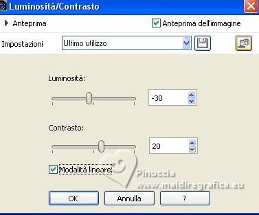 qui puoi trovare qualche risposta ai tuoi dubbi. Se l'argomento che ti interessa non è presente, ti prego di segnalarmelo. Questo tutorial è stato tradotto con PSPX7, ma può essere realizzato con le versioni più antiche. Dalla versione X4, il comando Immagine>Rifletti è stato sostituito con Immagine>Capovolgi in orizzontale, e il comando Immagine>Capovolgi con Immagine>Capovolgi in verticale. Nelle versioni X5 e X6, le funzioni sono state migliorate rendendo disponibile il menu Oggetti. Con la nuova versione X7, sono tornati Rifletti>Capovolgi, ma con nuove varianti. Vedi la scheda sull'argomento qui Traduzione inglese qui Le vostre versioni quiOccorrente: ![]() Per le maschere grazie Narah. Il resto del materiale è di Colybrix (in questa pagina trovi i links ai siti dei creatori di tubes) Filtri: in caso di dubbi, ricorda di consultare la mia sezione filtri qui Filters Unlimited 2.0 qui Alien Skin Eye Candy 5 Impact - Glass qui Graphics Plus - Cross shadow qui AAA Frames - Texture Frame qui I filtri Graphics Plus si possono usare da soli o importati in Filters Unlimited (come fare vedi qui) Se un filtro fornito appare con questa icona ![]() non esitare a cambiare modalità di miscelatura e opacità secondo i colori utilizzati. ![]() Apri le maschere in PSP e minimizzale con il resto del materiale. 1. Colori ![]() Imposta il colore di primo piano con #ffffff, e il colore di sfondo con il colore chiaro #e4cf8e. ![]() Apri Alpha Fin été Finestra>Duplica o sulla tastiera maiuscola+D per fare una copia. ![]() Chiudi l'originale. La copia, che sarà la base del tuo lavoro, non é vuota, ma contiene una selezione salvata sul canale alfa. Selezione>Seleziona tutto. Apri l'immagine jpg image automne ![]() Modifica>Copia. Torna al tuo lavoro e vai a Modifica>Incolla nella selezione. Selezione>Deseleziona. Regola>Sfocatura>Sfocatura gaussiana - raggio 30. ![]() 2. Effetti>Effetti di trama>Mosaico antico. ![]() Effetti>Plugins>Graphics Plus - Cross Shadow. ![]() 3. Livelli>Nuovo livello raster. Riempi il livello con il colore bianco di primo piano #ffffff.Livelli>Nuovo livello maschera>Da immagine. Apri il menu sotto la finestra di origine e vedrai la lista dei files aperti. Seleziona la maschera NarahsMasks_1773 ![]() Effetti>Effetti di bordo>Aumenta. Livelli>Unisci>Unisci gruppo. Cambia la modalità di miscelatura di questo livello in Luminanza (esistente), e abbassa l'opacità all'80%. ![]() 4. Apri il misted del paesaggio automn29-coly ![]() Cancella il watermark e vai a Modifica>Copia. Torna al tuo lavoro e vai a Modifica>Incolla come nuovo livello. Immagine>Ridimensiona, all'85%, tutti i livelli non selezionato. Sposta il tube in basso a destra.*Facoltativo, secondo il tuo tube: Livelli>Duplica e Livelli>Unisci>Unisci giù La posizione del mio tube: tasto K per attivare lo strumento Puntatore ![]() e imposta Posizione X: 220,00 e Posizione Y: 30,00. ![]() 5. Livelli>Duplica. Immagine>Rifletti. Immagine>Ridimensiona, al 50%, tutti i livelli non selezionato. Sposta il tube in alto a sinistra;per il mio tube, strumento Puntatore (K) ![]() Posizione X: -15,00 e Posizione Y: -60,00. ![]() Abbassa l'opacità di questo livello al 72%. ![]() 6. Attiva il livello della maschera, Gruppo-Raster 2. Livelli>Disponi>Porta in alto ![]() Effetti>Effetti 3D>Sfalsa ombra, colore nero. ![]() 7. Attiva il livello Raster 1. Selezione>Carica/Salva selezione>Carica selezione da canale alfa. La selezione sélection 1 è subito disponibile. Devi soltanto cliccare Carica. ![]() Selezione>Innalza selezione a livello. Livelli>Disponi>Porta in alto. 8. Livelli>Nuovo livello raster. Apri Elegant Autumn Element (13) ![]() Modifica>Copia. Torna al tuo lavoro e vai a Modifica>Incolla nella selezione. Mantieni selezionato. Livelli>Duplica. 9. Attiva il livello sottostante dell'originale. Regola>Sfocatura>Sfocatura gaussiana - raggio 10. ![]() Cambia la modalità di miscelatura di questo livello in Moltiplica. Livelli>Unisci>Unisci giù. Attiva nuovamente il livello superiore della copia. Livelli>Unisci>Unisci giù. 10. Effetti>Plugins>Alien Skin Eye Candy 5 Impact - Glass. Seleziona il preset Clear e ok. ![]() Selezione>Modifica>Seleziona bordature selezione. ![]() Riempi la selezione con il colore chiaro di sfondo (colore 3).Selezione>Deseleziona. 11. Effetti>Effetti 3D>Sfalsa ombra, con i settaggi precedenti. ![]() Modifica>Copia Modifica>Incolla come nuova immagine. Minimizza l'immagine che ti servirà più tardi. 12. Torna al tuo lavoro sul livello superiore. Sposta l'immagine leggermente a destra.Strumento Puntatore (K) ![]() Posizione X: 730,00 e Posizione Y: 10,00. ![]() 13. Livelli>Duplica. Immagine>Ridimensiona, all'85%, tutti i livelli non selezionato. Strumento Puntatore (K) ![]() Posizione X: 745,00 e Posizione Y: 127,00. ![]() Abbassa l'opacità di questo livello all'80%. Livelli>Disponi>Sposta giù. 14. Livelli>Duplica. Immagine>Ridimensiona, all'85%, tutti i livelli non selezionato. Strumento Puntatore (K) ![]() Posizione X: 755,00 e Posizione Y: 230,00. ![]() Livelli>Disponi>Sposta giù. ![]() 15. Attiva nuovamente il livello superiore. Livelli>Nuovo livello raster. Riempi il livello con il colore bianco di primo piano.Livelli>Nuovo livello maschera>Da immagine. Apri il menu sotto la finestra di origine e seleziona la maschera NarahsMasks_1697 ![]() Effetti>Effetti di bordo>Aumenta. Livelli>Unisci>Unisci gruppo. Effetti>Effetti 3D>Sfalsa ombra, con i settaggi precedenti, ma con il colore scuro #504e25 ![]() 17. Apri il tube feuilles deco ![]() Modifica>Copia. Torna al tuo lavoro e vai a Modifica>Incolla come nuovo livello. Strumento Puntatore (K) ![]() Posizione X: 284,00 e Posizione Y: -2,00. ![]() Livelli>Duplica, e attiva il livello sottostante dell'originale. Effetti>Effetti di distorsione>Vento - da sinistra, intensità 100. ![]() Cambia la modalità di miscelatura di questo livello in Moltiplica. Effetti>Effetti di bordo>Aumenta. 17. Attiva nuovamente il livello superiore. Effetti>Effetti 3D>Sfal