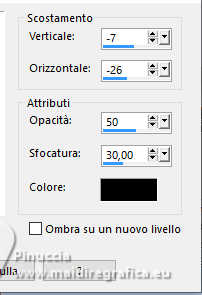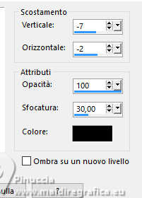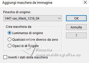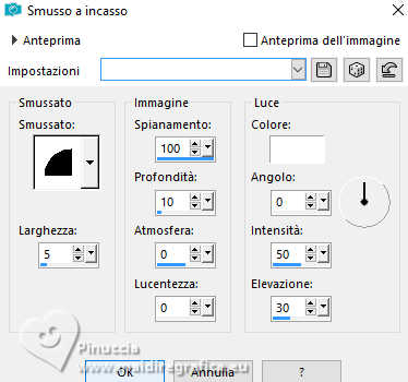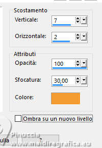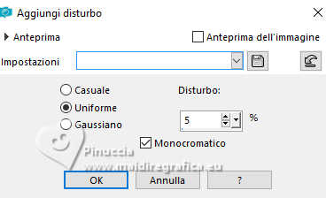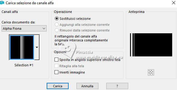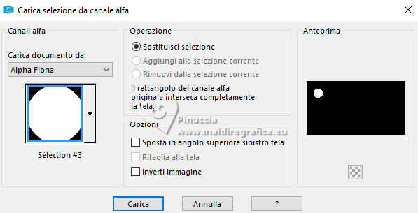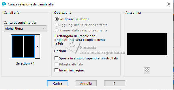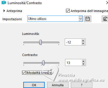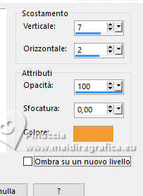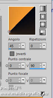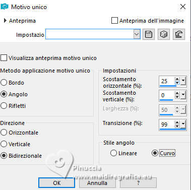 qui puoi trovare qualche risposta ai tuoi dubbi. Se l'argomento che ti interessa non è presente, ti prego di segnalarmelo. Questo tutorial è stato tradotto con PSPX7, ma può essere realizzato con le versioni più antiche. Dalla versione X4, il comando Immagine>Rifletti è stato sostituito con Immagine>Capovolgi in orizzontale, e il comando Immagine>Capovolgi con Immagine>Capovolgi in verticale. Nelle versioni X5 e X6, le funzioni sono state migliorate rendendo disponibile il menu Oggetti. Con la nuova versione X7, sono tornati Rifletti>Capovolgi, ma con nuove varianti. Vedi la scheda sull'argomento qui Traduzione inglese qui Le vostre versioni qui![]() Occorrente: ![]() Per la maschera grazie Casio. Il resto del materiale è di Colybrix. (in questa pagina trovi i links ai siti dei creatori di tubes) Filtri: in caso di dubbi, ricorda di consultare la mia sezione filtri qui Filters Unlimited 2.0 qui VM Instant Art Three Corners qui Graphics Plus - Cross Shadow qui AAA Frames - Foto Frame qui I filtri VM Instant Art e Graphics Plus si possono usare da soli o importati in Filters Unlimited (come fare vedi qui) Se un filtro fornito appare con questa icona ![]() non esitare a cambiare modalità di miscelatura e opacità secondo i colori utilizzati. Nelle ultime versioni di PSP non c'è il gradiente di primo piano/sfondo (Corel_06_029) Puoi usare i gradienti delle versioni precedenti. Trovi qui i gradienti Corel X. ![]() Metti il preset Emboss 3 nella cartella Impostazioni predefinite. Apri la maschera in PSP e minimizzala con il resto del materiale. Imposta il colore di primo piano con #050811, e il colore di sfondo con #f69b32. ![]() colore 3: #334559. 1. Apri Alpha Fiona Finestra>Duplica o sulla tastiera maiuscola+D per fare una copia. ![]() Chiudi l'originale. La copia, che sarà la base del tuo lavoro, non è vuota, ma contiene le selezioni salvate sul canale alfa. Riempi l'immagine trasparente con il colore di primo piano.Regola>Aggiungi/Rimuovi disturbo>Aggiungi disturbo. ![]() 2. Livelli>Duplica. Effetti>Plugins>VM Instant Art - Three Corners, con i settaggi standard. ![]() Cambia la modalità di miscelatura di questo livello in Luce diffusa. 3. Livelli>Nuovo livello raster. Riempi il livello con il colore di sfondo.Livelli>Nuovo livello maschera>Da immagine. Apri il menu sotto la finestra di origine e vedrai la lista dei files aperti. Seleziona la maschera 1447-cas_Mask_1216_04 ![]() Effetti>Effetti di bordo>Aumenta. Livelli>Duplica. Livelli>Unisci>Unisci gruppo. 4. Livelli>Duplica. Immagine>Rifletti>Rifletti orizzontalmente (Immagine>Rifletti). Immagine>Rifletti>Rifletti verticalmente (Immagine>Capovolgi). Livelli>Unisci>Unisci giù 5. Livelli>Nuovo livello raster. Selezione>Carica/Salva selezione>Carica selezione da canale alfa. La selezione sélection #1 è subito disponibile. Devi soltanto cliccare Carica. ![]() Imposta il colore di primo piano con il colore 3 #334559. ![]() Riempi la selezione con il colore di primo piano.Selezione>Deseleziona. Effetti>Effetti 3D>Sfalsa ombra, colore nero. ![]() 6. Livelli>Nuovo livello raster. Selezione>Carica/Salva selezione>Carica selezione da canale alfa. Apri il menu delle selezioni e carica la selezione sélection #2 ![]() Riempi la selezione con il colore di primo piano.Regola>Aggiungi/Rimuovi disturbo>Aggiungi disturbo. ![]() 7. Regola>Luminosità e Contrasto>Luminosità e Contrasto. ![]() Selezione>Deseleziona. Effetti>Effetti 3D>Sfalsa ombra, colore nero. ![]() 8. Livelli>Nuovo livello raster. Selezione>Carica/Salva selezione>Carica selezione da canale alfa. Apri il menu delle selezioni e carica la selezione sélection 3 ![]() Riempi la selezione con il colore di sfondo.Effetti>Effetti 3D>Smusso a incasso. ![]() Selezione>Deseleziona. Effetti>Effetti 3D>Sfalsa ombra, con i settaggi precedenti. ![]() 9. Livelli>Nuovo livello raster. Selezione>Carica/Salva selezione>Carica selezione da canale alfa. Apri il menu delle selezioni e carica la selezione sélection 4 ![]() Riempi la selezione con il colore di primo piano (colore 3).Regola>Luminosità e contrasto>Luminosità e contrasto, con i settaggi precedenti. Selezione>Deseleziona. Effetti>Effetti 3D>Sfalsa ombra, con i settaggi precedenti. ![]() 10. Livelli>Nuovo livello raster. Selezione>Carica/Salva selezione>Carica selezione da canale alfa. Apri il menu delle selezioni e carica la selezione sélection 5 ![]() Riempi la selezione con il colore di sfondo.11. Effetti>Plugins>Graphics Plus - Cross Shadow. ![]() Selezione>Deseleziona. Effetti>Effetti 3D>Sfalsa ombra, con i settaggi precedenti. ![]() Livelli>Disponi>Sposta giù. 12. Livelli>Duplica. Effetti>Effetti di immagine>Motivo unico. ![]() Immagine>Rifletti>Rifletti orizzontalmente (Immagine>Rifletti). 13. Livelli>Nuovo livello raster. Selezione>Carica/Salva selezione>Carica selezione da canale alfa. Apri il menu delle selezioni e carica la selezione sélection 6 ![]() Riempi la selezione con il colore di sfondo.Effetti>Effetti 3D>Sfalsa ombra, colore di sfondo. ![]() Selezione>Deseleziona. Cambia la modalità di miscelatura di questo livello in Filtra, e abbassa l'opacità all'80%. 14. Effetti>Effetti di immagine>Motivo unico, con i settaggi precedenti. ![]() Livelli>Disponi>Porta in alto. 15. Apri il misted mist floral-Coly ![]() Modifica>Copia. Torna al tuo lavoro e vai a Modifica>Incolla come nuovo livello. Immagine>Ridimensiona, al 75%, tutti i livelli non selezionato. Effetti>Filtro definito dall'utente, seleziona il preset Emboss 3 e ok. ![]() Strumento Puntatore (K) ![]() Posizione X: 596,00 - Posizione Y: -16,00. ![]() 16. Per i bordi: Imposta nuovamente il colore di primo piano con #050811, e lascia il colore di sfondo con #f69b32. ![]() Passa il colore di primo piano a Gradiente di primo piano/sfondo, stile Radiale. ![]() Immagine>Aggiungi bordatura, 1 pixel, simmetriche, colore di primo piano. Selezione>Seleziona tutto. 17. Immagine>Aggiungi bordatura, 50 pixels, simmetriche, colore di primo piano. Selezione>Inverti. Riem