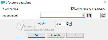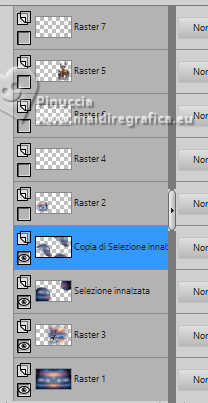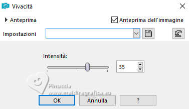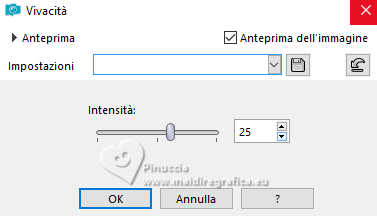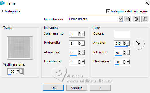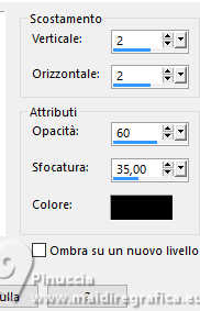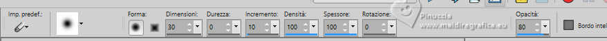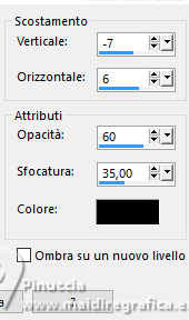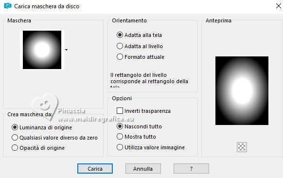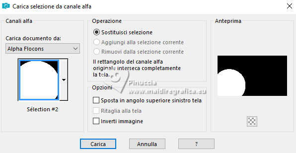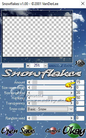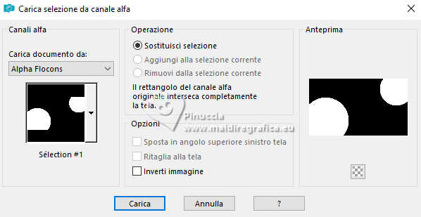 qui puoi trovare qualche risposta ai tuoi dubbi. Se l'argomento che ti interessa non è presente, ti prego di segnalarmelo. Questo tutorial è stato tradotto con PSPX7, ma può essere realizzato con le versioni più antiche. Dalla versione X4, il comando Immagine>Rifletti è stato sostituito con Immagine>Capovolgi in orizzontale, e il comando Immagine>Capovolgi con Immagine>Capovolgi in verticale. Nelle versioni X5 e X6, le funzioni sono state migliorate rendendo disponibile il menu Oggetti. Con la nuova versione X7, sono tornati Rifletti>Capovolgi, ma con nuove varianti. Vedi la scheda sull'argomento qui Traduzione inglese qui Le vostre versioni quiOccorrente: ![]() (in questa pagina trovi i links ai siti dei creatori di tubes) Filtri: in caso di dubbi, ricorda di consultare la mia sezione filtri qui Filters Unlimited 2.0 qui VM Natural - Sparkles qui Alien Skin Eye Candy 5 Nature - Snow Drift qui VDL Adrenaline - Snowflakes qui Graphics Plus - Cross Shadow qui I filtri VM Natural e Graphics Plus si possono usare da soli o importati in Filters Unlimited (come fare vedi qui) Se un filtro fornito appare con questa icona ![]() non esitare a cambiare modalità di miscelatura e opacità secondo i colori utilizzati. ![]() Metti la maschera 20-20 nella cartella Maschere. Metti la trama @nn_250410 TXT 031_tdstudio nella cartella Trame. Imposta il colore di primo piano con il colore bianco #ffffff, e il colore di sfondo con il colore #762c48. ![]() 1. Apri Alpha flocons Finestra>Duplica o sulla tastiera maiuscola+D per fare una copia. ![]() Chiudi l'originale. La copia, che sarà la base del tuo lavoro, non é vuota, ma contiene le selezioni salvate sul canale alfa. 2. Selezione>Seleziona tutto. Apri l'immagine in jpg cerf ![]() Modifica>Copia. Torna al tuo lavoro e vai a Modifica>Incolla nella selezione. Selezione>Deseleziona. Regola>Sfocatura>Sfocatura gaussiana - raggio 25. ![]() 3. Effetti>Effetti di riflesso>Specchio rotante. ![]() Effetti>Effetti di trama>Trama - seleziona la trama @nn_250410 TXT 031_tdstudio ![]() 4. Selezione>Carica/Salva selezione>Carica selezione da canale alfa. La selezione sélection 1 è subito disponibile. Devi soltanto cliccare Carica. ![]() Selezione>Innalza selezione a livello. Effetti>Effetti 3D>Sfalsa ombra, colore nero. ![]() 5. Selezione>Modifica>Contrai - 10 pixels. Effetti>Effetti 3D>Sfalsa ombra, con i settaggi precedenti. Selezione>Deseleziona. ![]() 6. Livelli>Duplica. Effetti>Effetti di immagine>Motivo unico, con i settaggi standard. ![]() ***** 7. Se hai usato l'immagine fornita, vai al punto 8. Continua qui se hai usato un'altra immagine. Prima di applicare la maschera, ho ritagliato la mia immagine leggermente in alto e in basso. Livelli>Carica/Salva maschera>Carica maschera da disco. Cerca e carica la maschera 20-20. ![]() Livelli>Duplica (per sfumare un po' di più i bordi). Livelli>Unisci>Unisci gruppo. ***** 8. Apri il misted mist cerfs ![]() Modifica>Copia. Torna al tuo lavoro e vai a Modifica>Incolla come nuovo livello. Immagine>Ridimensiona, al 40%, tutti i livelli non selezionato. Sposta il tube nel cerchio a sinistra.![]() 9. Selezione>Carica/Salva selezione>Carica selezione da canale alfa. Apri il menu delle selezioni e carica la selezione sélection 2 ![]() Selezione>Inverti. Premi sulla tastiera il tasto CANC ![]() Selezione>Deseleziona. 10. Attiva il livello Raster 1. Apri il tube mist fond Coly ![]() Modifica>Copia. Torna al tuo lavoro e vai a Modifica>Incolla come nuovo livello. Immagine>Ridimensiona, al 75%, tutti i livelli non selezionato. Tasto K per attivare lo strumento Puntatore ![]() e imposta Posizione X: 233,00 e Posizione Y: -55,00. ![]() O sposta il tube a tuo piacimento. Abbassa l'opacità di questo livello al 56%. 11. Attiva nuovamente il livello superiore. Livelli>Nuovo livello raster. Selezione>Carica/Salva selezione>Carica selezione da canale alfa. Apri il menu delle selezioni e carica la selezione sélection 3 ![]() Riempi la selezione con il colore bianco, 2 clicsSelezione>Deseleziona. 12. Livelli>Duplica. Immagine>Rifletti. Immagine>Capovolgi. Livelli>Unisci>Unisci giù. 13. Attiva nuovamente il livello Raster 1. Selezione>Carica/Salva selezione>Carica selezione da canale alfa. Apri il menu delle selezioni e carica la selezione sélection 4 ![]() Effetti>Plugins>VM Natural - Sparkle ![]() Selezione>Deseleziona. 14. Attiva il livello superiore. Apri il tube Kersthert_DK_AI ![]() Modifica>Copia. Torna al tuo lavoro e vai a Modifica>Incolla come nuovo livello. Immagine>Ridimensiona, al 75%, tutti i livelli non selezionato. Sposta il tube a destra.Effetti>Effetti 3D>Sfalsa ombra, colore nero. ![]() 15. Livelli>Nuovo livello raster. Effetti>Plugins>Alien Skin Eye Candy 5 Nature - Snow Drift Settings: Small, Large Snow Pil Basic: Drift Height 35. ![]() Regola>Sfocatura>Sfocatura gaussiana - raggio 3. ![]() 16. Livelli>Disponi>Sposta giù. Attiva il livello superiore, i cervi. Attiva lo strumento Gomma con i seguenti settaggi:![]() Cancella leggermente il bordo delle zampe - cliccando più volte - per dare l'impressione che si trovino nella neve ![]() 17. Livelli>Nuovo livello raster. Effetti>Plugins>VDL Adrenaline - Snowflakes se stai usando la versione più recente (il risultato non cambia): Effetti>Plugins>VanDerLee - Snowflakes ![]() Attiva lo strumento Gomma con gli stessi settaggiIo ho cancellato 2-3 fiocchi di neve sulla testa dei cervi come sul misted nel cerchio a sinistra ![]() ![]() 18. Unisci i quattro livelli inferiori ![]() Sul livello Uniti: Regola>Tonalità e saturazione>Vivacità (adatta alla tua immagine, se necessario). ![]() 19. Attiva il livello soprastante (il misted dei cervi a sinistra). Ripeti Regola>Tonalità e saturazione>Vivacità e cambia 25 (adatta alla tua immagine, se necessario). ![]() Se vuoi, ripeti anche sul tube dei cervi a destra. 20. Attiva il livello superiore. Livelli>Nuovo livello raster. Selezione>Seleziona tutto. Riempi con il colore di sfondo.21. Effetti>Plugins>Graphics Plus - 