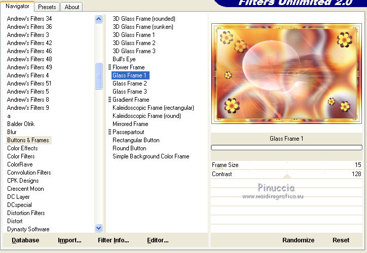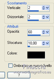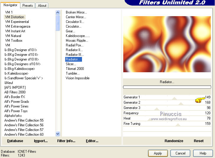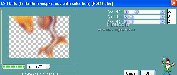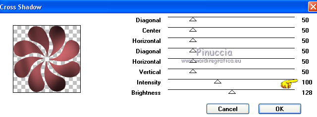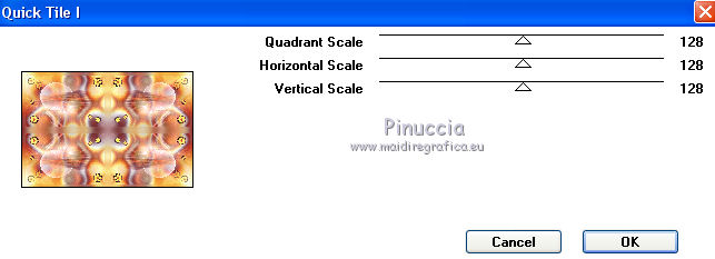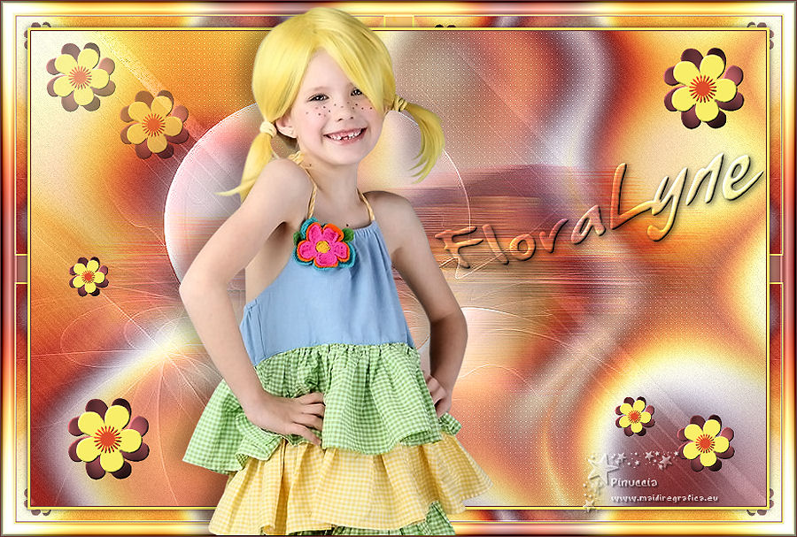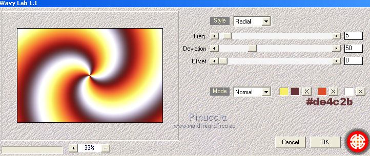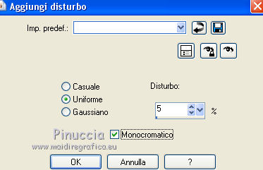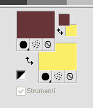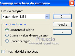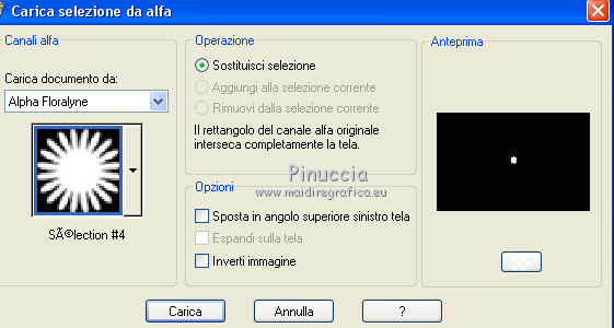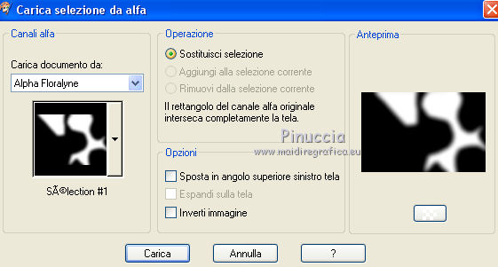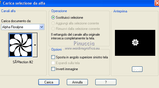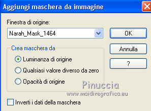 qui puoi trovare qualche risposta ai tuoi dubbi. Se l'argomento che ti interessa non è presente, ti prego di segnalarmelo. Questo tutorial è stato tradotto con PSPX, ma può essere realizzato anche con le altre versioni di PSP. Dalla versione X4, il comando Immagine>Rifletti è stato sostituito con Immagine>Capovolgi in orizzontale, e il comando Immagine>Capovolgi con Immagine>Capovolgi in verticale. Nelle versioni X5 e X6, le funzioni sono state migliorate rendendo disponibile il menu Oggetti. Con la nuova versione X7, sono tornati Rifletti>Capovolgi, ma con nuove varianti. Vedi la scheda sull'argomento qui Le vostre versioniOccorrente: Materiale qui Per le maschere grazie Narah. Il resto del materiale è di Colybrix. (in questa pagina trovi i links ai siti dei creatori di tubes) Filtri: se hai problemi con i filtri, consulta la mia sezione filtri qui Mehdi - Wavy Lab 1.1. qui VM Distortion - Radiator qui Carolaine and Sensibility - CS-LDots qui Graphics Plus - Cross Shadow qui I filtri VM Distortion e Graphics Plus si possono usare da soli o importati in Filters Unlimited (come fare vedi qui) Se un filtro fornito appare con questa icona ![]() non esitare a cambiare modalità di miscelatura e opacità secondo i colori utilizzati. Apri le maschere in PSP e minimizzale con il resto del materiale. Colori utilizzati ![]() 1. Imposta il colore di primo piano con #673437, e il colore di sfondo con #f9ee68. ![]() 1. Apri alpha_floralyne. Finestra>Duplica o sulla tastiera maiuscola+D per fare una copia. ![]() Chiudi l'originale. La copia, che sarà la base del tuo lavoro, non è vuota, ma contiene le selezioni salvate sul canale alfa. 2. Effetti>Plugins>Mehdi - Wavy Lab 1.1. Questo filtro crea gradienti con i colori della paletta; il primo è il colore di sfondo, il secondo quello di primo piano. Cambia gli ultimi due colori creati dal filtro: il terzo con #de4c2b e il quarto con il colore bianco. ![]() 3. Regola>Sfocatura>Sfocatura gaussiana - raggio 30. ![]() 4. Livelli>Duplica. Effetti>Plugins>VM Distortion - Radiator. ![]() 5. Abbassa l'opacità di questo livello al 70%. Livelli>Unisci>Unisci giù. 6. Regola>Aggiungi/Rimuovi disturbo>Aggiungi disturbo. ![]() 7. Selezione>Carica/Salva selezione>Carica selezione da canale alfa. La selezione #1 è subito disponibile. Devi soltanto cliccare Carica. ![]() Selezione>Innalza selezione a livello. 8. Effetti>Plugins>Carolaine and Sensibility - CS-LDots, con i settaggi standard. ![]() 9. Regola>Messa a fuoco>Metti a fuoco. Selezione>Deseleziona. Livelli>Unisci>Unisci giù. 10. Apri il tube del paesaggio, cancella la firma e vai a Modifica>Copia. Torna al tuo lavoro e vai a Modifica>Incolla come nuovo livello. Non spostarlo. E' correttamente posizionato. 11. Effetti>Effetti di distorsione>Vento - da destra, intensità 100. ![]() 12. Effetti>Effetti di bordo>Aumenta. Abbassa l'opacità al 56%. 13. Imposta il colore di primo piano con il colore bianco. Livelli>Nuovo livello raster. Riempi il livello con il colore bianco.14. Livelli>Nuovo livello maschera>Da immagine. Apri il menu sotto la finestra di origine e vedrai la lista dei files aperti. Seleziona la maschera Narah_mask_1464. ![]() Effetti>Effetti di bordo>Aumenta. Livelli>Unisci>Unisci gruppo. 15. Effetti>Effetti di immagine>Motivo unico, Fianco a fianco. ![]() Effetti>Effetti di bordo>Aumenta. 16. Cambia la modalità di miscelatura di questo livello in Luminanza (esistente). Livelli>Disponi>Sposta giù. 17. Attiva il livello superiore. Livelli>Nuovo livello raster. Riempi il livello con il colore bianco.18. Livelli>Nuovo livello maschera>Da immagine. Apri il menu sotto la finestra di origine e seleziona la maschera Narah_mask_1394. ![]() Effetti>Effetti di bordo>Aumenta. Livelli>Unisci>Unisci gruppo. 19. Cambia la modalità di miscelatura di questo livello in Luminanza (esistente). **** Per i passaggi successivi (da 20 a 25), il risultato è nel materiale. Se utilizzi i fiori forniti, passa direttamente al punto 26 20. Livelli>Nuovo livello raster. Selezione>Carica/Salva selezione>Carica selezione da canale alfa. Apri il menu delle selezioni e carica la selezione #2. ![]() Imposta nuovamente il colore di primo piano con il colore iniziale. Riempi la selezione con il colore di primo piano.21. Effetti>Plugins>Graphics Plus - Cross Shadow. ![]() Selezione>Deseleziona. 22. Effetti>Effetti 3D>Smusso a incasso. ![]() 23. Livelli>Nuovo livello raster. Selezione>Carica/Salva selezione>Carica selezione da canale alfa. Apri il menu delle selezioni e carica la selezione #3. ![]() Riempi la selezione con il colore di sfondo.Selezione>Deseleziona. Effetti>Effetti 3D>Smusso a incasso, con i settaggi precedenti. 24. Livelli>Nuovo livello raster. Selezione>Carica/Salva selezione>Carica selezione da canale alfa. Apri il menu delle selezioni e carica la selezione #4. ![]() Imposta il colore di primo piano con il colore 3 #de4c2b Riempi la selezione con il colore di primo piano #de4c2b.Selezione>Deseleziona. Effetti>Effetti 3D>Smusso a incasso, con i settaggi precedenti. 25. Livelli>Unisci>Unisci giù - 2 volte. ***** Riprendi da qui se utilizzi i fiori forniti (copia e incolla come nuovo livello Fleur 1). 26. Livelli>Duplica. Immagine>Ridimensiona, al 60%, tutti i livelli non selezionato. 27. Effetti>Effetti di immagine>Motivo unico - Intermittente diagonale. ![]() 28. Tasto K per attivare lo strumento Puntatore ![]() e imposta Posizione X: 17,00 e Posizione Y: 13,00. ![]() 29. Ridimensiona l'originale e posiziona a tuo piacimento.Io ho ridimensionato al 70% e posizionato in basso a sinistra. 30. (Se vuoi, ripeti questi passaggi con altri colori per decorare il tuo lavoro). Ho aggiunto un altro fiore nel materiale - l'ho ridimensionato al 70% e posizionato a destra. Ho duplicato, ridimensionato e posizionato i fiori 3 volte. 31. Attiva il livello di sfondo, Raster 1. Modifica>Copia. 32. Per i bordi, imposta nuovamente il color di primo piano con il colore iniziale #673437. ![]() Immagine>Aggiungi bordatura, 1 p