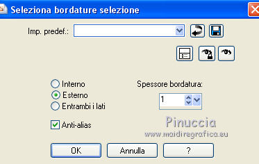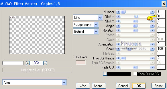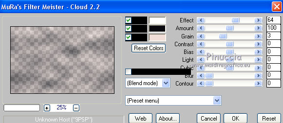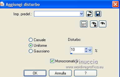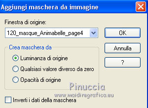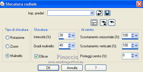 qui puoi trovare qualche risposta ai tuoi dubbi. Se l'argomento che ti interessa non è presente, ti prego di segnalarmelo. Questo tutorial è stato tradotto con PSPX, ma può essere realizzato anche con le altre versioni di PSP. Dalla versione X4, il comando Immagine>Rifletti è stato sostituito con Immagine>Capovolgi in orizzontale, e il comando Immagine>Capovolgi con Immagine>Capovolgi in verticale. Nelle versioni X5 e X6, le funzioni sono state migliorate rendendo disponibile il menu Oggetti. Con la nuova versione X7, sono tornati Rifletti>Capovolgi, ma con nuove varianti. Vedi la scheda sull'argomento qui Le vostre versioni Occorrente: Materiale qui Grazie: per il tube Gabry e per le maschere Animabelle e Narah. (in questa pagina trovi i links ai siti dei creatori di tubes) Filtri: se hai problemi con i filtri, consulta la mia sezione filtri qui Mura's Meister - Copies qui Mura's Meister - Cloud qui Graphics Plus - Cross Shadow qui Simple - Top Left Mirror qui Alien Skin Eye Candy 5 Impact - Glass qui Filters Unlimited 2.0 qui I filtri Graphics Plus e Simple si possono usare da soli o importati in Filters Unlimited (come fare vedi qui) Se un filtro fornito appare con questa icona ![]() non esitare a cambiare modalità di miscelatura e opacità secondo i colori utilizzati. Apri le maschere in PSP e minimizzale con il resto del materiale. 1. Imposta il colore di primo piano con il colore scuro #09080e, e il colore di sfondo con il colore chiaro #f1ddd7. ![]() Apri Alpha tuto Gabry. Finestra>Duplica, o sulla tastiera maiuscola+D, per fare una copia. Chiudi l'originale. La copia, che sarà la base del tuo lavoro, non è vuota, ma contiene le selezioni salvate sul canale alfa. Riempi l'immagine trasparente con il colore scuro.2. Livelli>Nuovo livello raster. Selezione>Seleziona tutto. Apri il tube della donna e vai a Modifica>Copia. Mininizza il tube. Torna al tuo lavoro e vai a Modifica>Incolla nella selezione. Selezione>Deseleziona. 3. Effetti>Effetti di immagine>Motivo unico, con i settaggi standard. ![]() 4. Regola>Sfocatura>Sfocatura gaussiana - raggio 50. ![]() 5. Regola>Sfocatura>Sfocatura radiale. ![]() Livelli>Unisci>Unisci giù. 6. Regola>Aggiungi/Rimuovi disturbo>Aggiungi disturbo. ![]() 7. Effetti>Effetti di riflesso>Fuga di specchi. ![]() 8. Effetti>Effetti di riflesso>Specchio rotante, con i settaggi standard. ![]() 9. Effetti>Effetti di immagine>Motivo unico, con i settaggi precedenti. ![]() 10. Selezione>Carica/Salva Selezione>Carica selezione da canale alfa. La selezione #1 è subito disponibile. Devi soltanto cliccare Carica. ![]() Selezione>Innalza selezione a livello. 11. Selezione>Modifica>Seleziona bordature selezione. ![]() 12. Riempi con il colore scuro.Selezione>Deseleziona. 13. Effetti>Effetti 3D>Sfalsa ombra, colore nero. ![]() 14. Livelli>Nuovo livello raster. Riempi con il colore chiaro.Livelli>Nuovo livello maschera>Da immagine. Apri il menu sotto la finestra di origine e vedrai la lista dei files aperti. Seleziona la maschera 120_masque_Animabelle_page4. ![]() Effetti>Effetti di bordo>Aumenta. Livelli>Unisci>Unisci gruppo. 15. Cambia la modalità di miscelatura di questo livello in Luminanza (esistente), e abbassa l'opacità al 50%. ![]() 16. Attiva il livello sottostante, Selezione innalzata. Selezione>Carica/Salva Selezione>Carica selezione da canale alfa. Apri il menu delle selezioni e carica la selezione #2. ![]() Selezione>Innalza selezione a livello. Livelli>Disponi>Porta in alto. 17. Selezione>Modifica>Seleziona bordature selezione. ![]() Riempi con il colore scuro.Selezione>Deseleziona. 18. Effetti>Effetti 3D>Sfalsa ombra, con i settaggi precedenti. ![]() 19. Livelli>Duplica. Immagine>Rifletti. Livelli>Unisci>Unisci giù. 20. Selezione>Carica/Salva Selezione>Carica selezione da canale alfa. Apri il menu delle selezioni e carica la selezione #3. ![]() Selezione>Innalza selezione a livello. 21. Selezione>Modifica>Seleziona bordature selezione. ![]() Riempi con il colore scuro (ingrandisci se necessario).Selezione>Deseleziona. 22. Effetti>Effetti 3D>Sfalsa ombra, con i settaggi precedenti. ![]() 23. Livelli>Duplica. Immagine>Rifletti. Livelli>Unisci>Unisci giù. 24. Attiva il livello inferiore. Effetti>Plugins>Graphics Plus - Cross Shadow ![]() 25. Livelli>Duplica. Livelli>Disponi>Porta in alto. 26. Effetti>Effetti geometrici>Cerchio. ![]() 27. Immagine>Ridimensiona, al 10%, tutti i livelli non selezionato. Modifica>Copia. Modifica>Incolla come nuova immagine, e minimizza. 28. Torna al tuo lavoro. Effetti>Plugins>Mura's Meister - Copies. ![]() 29. Oggetti>Allinea>Centra nella tela Se stai lavorando con una versione precedente che non rende disponibile il menu Oggetti: Modifica>Taglia. Modifica>Incolla come nuovo livello e l'immagine sarà perfettamente al centro. Livelli>Unisci>Unisci giù, per eliminare il livello rimasto vuoto. A questo punto, attivando lo strumento Puntatore ![]() avrai queste posizioni ![]() 30. Livelli>Duplica. Immagine>Ridimensiona, al 60%, tutti i livelli non selezionato. 31. Attiva lo strumento Puntatore ![]() ![]() 32. Effetti>Plugins>Simple - Top Left Mirror. ![]() 33. Effetti>Plugins>Alien Skin Eye Candy 5 Impact - Glass. seleziona il preset Clear e ok. ![]() 34. Attiva il livello sottostante (le tre palline al centro) Effetti>Plugins>Alien Skin Eye Candy 5 Impact - Glass, preset Clear. 35. Attiva il livello Selezione innalzata 2. ![]() 36. Imposta il colore di primo piano con il colore bianco. Livelli>Nuovo livello raster. Riempi con il colore bianco.Livelli>Nuovo livello maschera>Da immagine. Apri il menu sotto la finestra di origine e seleziona la maschera Narah_Mask_1479 ![]() Effetti>Effetti di bordo>Aumenta. Livelli>Unisci>Unisci gruppo. 37. Cambia la modalità di miscelatura di questo livello in Luminanza (esistente) e abbassa l'opacità al 50%. ![]() 38. Livelli>Duplica. Immagine>Capovolgi. Livelli>Unisci>Unisci visibile. 39. Imposta nuovamente il colore di primo piano con il colore scuro ![]() 40. Livelli>Nuovo live