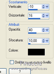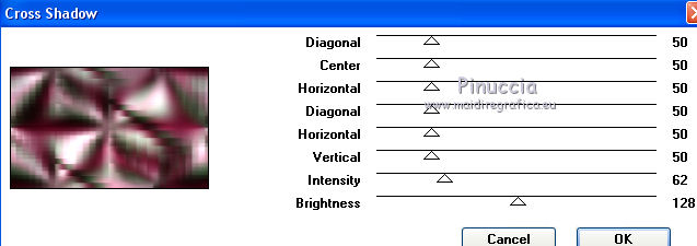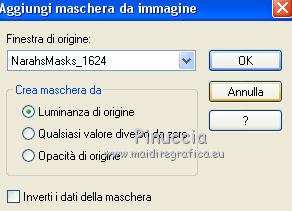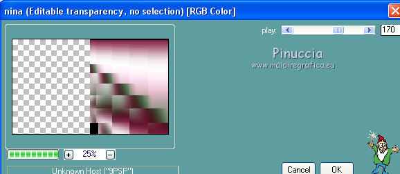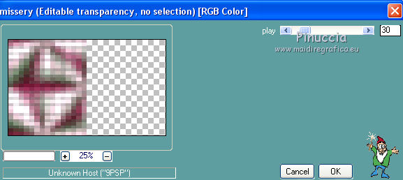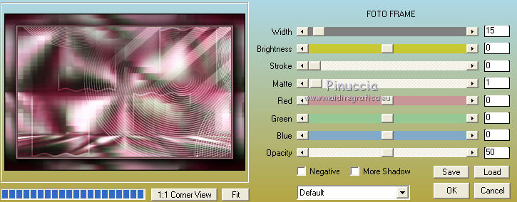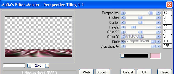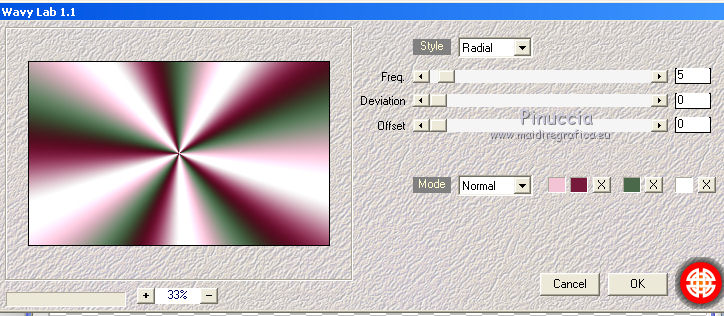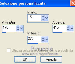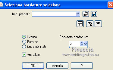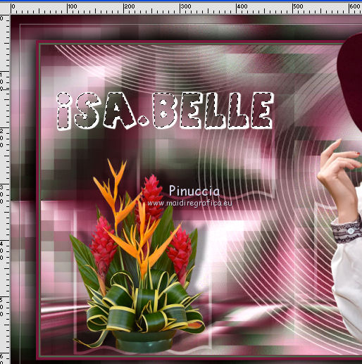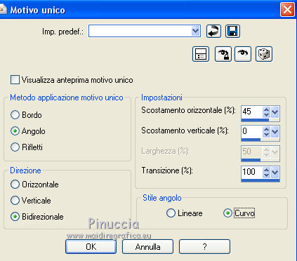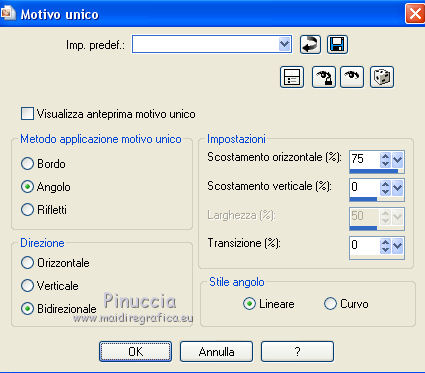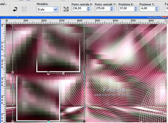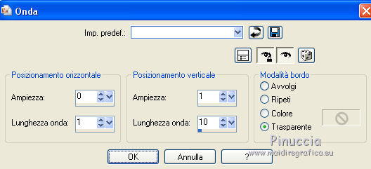 qui puoi trovare qualche risposta ai tuoi dubbi. Se l'argomento che ti interessa non è presente, ti prego di segnalarmelo. Questo tutorial è stato tradotto con PSPX, ma può essere realizzato anche con le altre versioni di PSP. Dalla versione X4, il comando Immagine>Rifletti è stato sostituito con Immagine>Capovolgi in orizzontale, e il comando Immagine>Capovolgi con Immagine>Capovolgi in verticale. Nelle versioni X5 e X6, le funzioni sono state migliorate rendendo disponibile il menu Oggetti. Con la nuova versione X7, sono tornati Rifletti>Capovolgi, ma con nuove varianti. Vedi la scheda sull'argomento qui Le vostre versioniOccorrente: Materiale qui Per il tube e la maschera grazie Krys e Narah Il resto del materiale è di Colybrix. (in questa pagina trovi i links ai siti dei creatori di tubes) Filtri: se hai problemi con i filtri, consulta la mia sezione filtri qui Filters Unlimited 2.0 qui Mehdi - Wavy Lab 1.1 qui Phpshares-hdj1 - nel materiale Mura's Meister qui Graphics Plus - Cross Shadow qui AAA Frames - Foto Frame qui I filtri Graphics Plus si possono usare da soli o importati in Filters Unlimited (come fare vedi qui) Se un filtro fornito appare con questa icona ![]() non esitare a cambiare modalità di miscelatura e opacità secondo i colori utilizzati. Nelle ultime versioni di PSP non c'è il gradiente di primo piano/sfondo (Corel_06_029) Puoi usare i gradienti delle versioni precedenti. Trovi qui i gradienti Corel X. ![]() Apri la maschera in PSP e minimizzala con il resto del materiale. 1. Imposta il colore di primo piano con #77193a e il colore di sfondo con #f3c3d6. ![]() 2. Apri una nuova immagine trasparente 900 x 550 pixels. Effetti>Plugins>Mehdi - Wavy Lab 1.1. questo filtro crea gradienti con i colori della tua paletta: il primo è il colore di sfondo, il secondo quello di primo piano. Cambia gli ultimi due colori creati dal filtro: il terzo con il colore #4a694a e il quarto con il colore bianco #ffffff ![]() 2. Regola>Sfocatura>Sfocatura gaussiana - raggio 15. ![]() Effetti>Effetti di immagine>Motivo unico. ![]() 3. Effetti>Effetti di riflesso>Specchio rotante. ![]() Effetti>Effetti di bordo>Aumenta - 2 volte. 4. Attiva lo strumento Selezione ![]() (non importa il tipo di selezione impostato, perchè con la selezione personalizzata si ottiene sempre un rettangolo) clicca sull'icona Selezione personalizzata ![]() e imposta i seguenti settaggi. ![]() Selezione>Innalza selezione a livello. Selezione>Deseleziona. 5. Livelli>Duplica. Immagine>Rifletti. Effetti>Plugins>Phpshares-hdj1 - Nina. ![]() 6. Attiva il livello centrale. Effetti>Plugins>Phpshares-hdj1 - Missery. ![]() 7. Attiva nuovamente il livello superiore. Livelli>Unisci>Unisci giù. Effetti>Effetti di immagine>Motivo unico, con i settaggi precedenti. Cambia la modalità di miscelatura di questo livello in Moltiplica. 8. Livelli>Unisci>Unisci giù. Effetti>Plugins>Graphics Plus - Cross Shadow. ![]() 9. Livelli>Duplica. Effetti>Plugins>Mura's Meister - Perspective Tiling. ![]() 10. Attiva lo strumento Bacchetta magica ![]() e clicca nella parte trasparente per selezionarla. Selezione>Modifica>Sfuma - 30 pixels. ![]() Premi 6 volte sulla tastiera il tasto CANC ![]() Selezione>Deseleziona. 11. Imposta il colore di primo piano con il colore bianco. Livelli>Nuovo livello raster. Riempi il livello con il colore bianco.Livelli>Nuovo livello maschera>Da immagine. Apri il menu sotto la finestra d'origine e vedrai la lista dei files aperti. Seleziona la maschera NarahsMasks_1624. ![]() Livelli>Unisci>Unisci gruppo. 12. Livelli>Duplica. Livelli>Unisci>Unisci giù. Cambia la modalità di miscelatura di questo livello in Luminanza (esistente). 13. Attiva il livello inferiore, Raster 1. Selezione personalizzata ![]() ![]() Selezione>Innalza selezione a livello. Livelli>Disponi>Porta in alto. 14. Selezione>Modifica>Seleziona bordature selezione. ![]() Riempi la selezione con il colore bianco.Selezione>Deseleziona. 15. Effetti>Effetti 3D>Sfalsa ombra, colore nero. ![]() Effetti>Effetti di immagine>Motivo unico. ![]() Tasto K sulla tastiera per attivare lo strumento Puntatore ![]() mantieni Posizione: 37,00 e imposta Posizione Y: -6,00 ![]() 16. Attiva il livello inferiore. Selezione>Seleziona tutto. Attiva il livello superiore. Immagine>Ritaglia la selezione. 17. Effetti>Effetti di distorsione>Onda. ![]() Cambia la modalità di miscelatura di questo livello in Luce diffusa (o secondo i tuoi colori). 18. Livelli>Duplica. Immagine>Rifletti. Immagine>Capovolgi. 19. Attiva il livello Gruppo-Raster 2. Livelli>Disponi>Porta in alto. Livelli>Duplica. Abbassa l'opacità di questo livello al 50%. 20. Attiva il livello inferiore, Raster 1. Modifica>Copia. 21. Imposta il colore di primo piano con il colore iniziale #77193a, e il colore di sfondo con #4a694a. ![]() Immagine>Aggiungi bordatura, 1 pixel, simmetriche, colore di primo piano #77193a. Immagine>Aggiungi bordatura, 3 pixels, simmetriche, colore di sfondo #4a694a. Immagine>Aggiungi bordatura, 5 pixels, simmetriche, colore di primo piano. 22. Selezione>Seleziona tutto. Immagine>Aggiungi bordatura, 45 pixels, simmetriche, colore di primo piano. 23. Selezione>Inverti. Modifica>Incolla nella selezione (lo sfondo in memoria). Selezione>Inverti. Effetti>Effetti 3D>Sfalsa ombra, colore nero. ![]() Modifica>Ripeti Sfalsa ombra. Selezione>Deseleziona. 24. Effetti>Plugins>AAA Frames - Foto Frame. ![]() 25. Apri il tube della donna, cancella la firma e vai a Modifica>Copia. Torna al tuo lavoro e vai a Modifica>Incolla come nuovo livello. Immagine>Ridimensiona, all'80%, tutti i livelli non selezionato. Sposta il tube a destra.Effetti>Effetti 3D>Sfalsa ombra, colore nero. ![]() 26. Apri il tube della pianta, cancella la firma e vai a Modifica>Copia. Torna al tuo lavoro e vai a Modifica>Incolla come nuovo livello. Immagine>Ridimensiona, al 65%, tutti i livelli non selezionato. Sposta il tube in basso a sinistra.Effetti>Effetti 3D>Sfalsa ombra, colore nero. ![]() 27. Apri il tube Titre en blanc