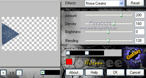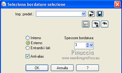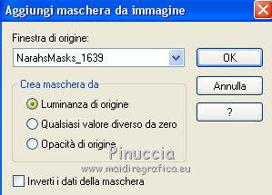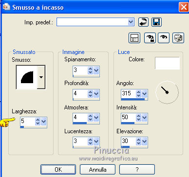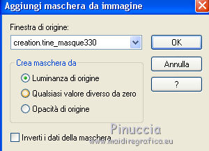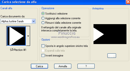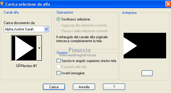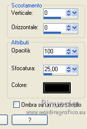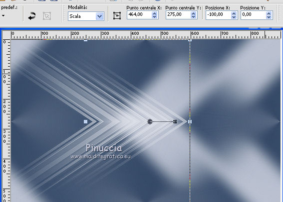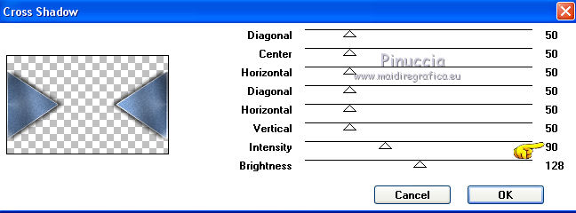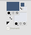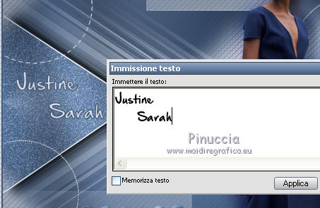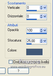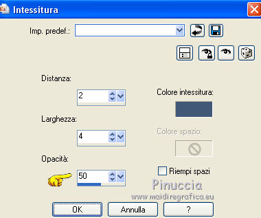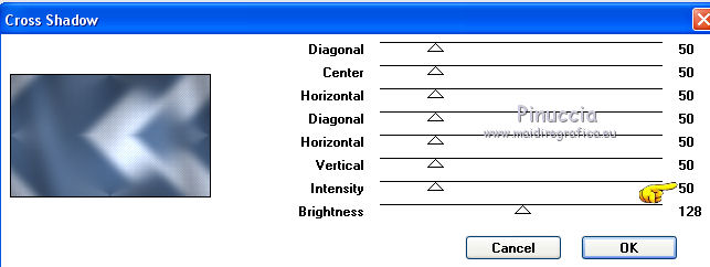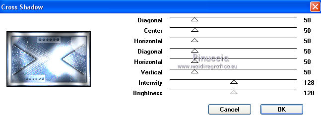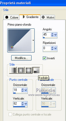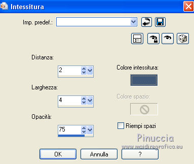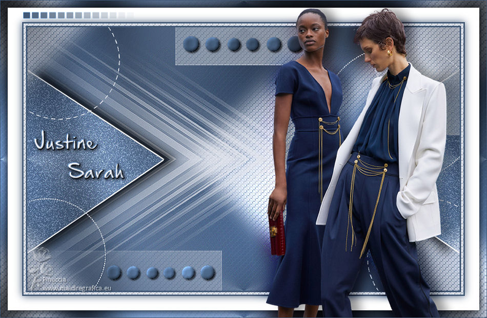 qui puoi trovare qualche risposta ai tuoi dubbi. Se l'argomento che ti interessa non è presente, ti prego di segnalarmelo. Questo tutorial è stato tradotto con PSPX, ma può essere realizzato anche con le altre versioni di PSP. Dalla versione X4, il comando Immagine>Rifletti è stato sostituito con Immagine>Capovolgi in orizzontale, e il comando Immagine>Capovolgi con Immagine>Capovolgi in verticale. Nelle versioni X5 e X6, le funzioni sono state migliorate rendendo disponibile il menu Oggetti. Con la nuova versione X7, sono tornati Rifletti>Capovolgi, ma con nuove varianti. Vedi la scheda sull'argomento qui Le vostre versioniOccorrente: Materiale qui Grazie per il tube Cady e per le maschere Tine e Narah. Il resto del materiale è di Colybrix. (in questa pagina trovi i links ai siti dei creatori di tubes) Filtri: se hai problemi con i filtri, consulta la mia sezione filtri qui Filters Unlimited 2.0 qui Graphics Plus qui Plugin Galaxy qui I filtri Graphics Plus si possono usare da soli o importati in Filters Unlimited (come fare vedi qui) Se un filtro fornito appare con questa icona ![]() non esitare a cambiare modalità di miscelatura e opacità secondo i colori utilizzati. Nelle ultime versioni di PSP non c'è il gradiente di primo piano/sfondo (Corel_06_029) Puoi usare i gradienti delle versioni precedenti. Trovi qui i gradienti Corel X. ![]() Apri le maschere in PSP e minimizzale con il resto del materiale. 1. Imposta il colore di primo piano con #425976 e il colore di sfondo con #e2e5ec. ![]() Passa il colore di primo piano a Gradiente di primo piano/sfondo, stile Radiale. ![]() 2. Apri Alpha_Justine Sarah. Finestra>Duplica o sulla tastiera maiuscola+D per fare una copia. ![]() Chiudi l'originale. La copia, che sarà la base del tuo lavoro, non è vuota, ma contiene le selezioni salvate sul canale alfa. Riempi l'immagine trasparente con il gradiente.Regola>Sfocatura>Sfocatura gaussiana - raggio 20. ![]() 3. Livelli>Duplica. Immagine>Rifletti Immagine>Capovolgi. Cambia la modalità di miscelatura di questo livello in Moltiplica. Livelli>Unisci>Unisci giù. 4. Effetti>Effetti di immagine>Motivo unico, con i settaggi standard. ![]() Effetti>Effetti di riflesso>Specchio rotante. ![]() Effetti>Effetti di bordo>Aumenta - 2 volte. Risultato ![]() 5. Livelli>Nuovo livello raster. Riempi con il colore chiaro di sfondo.Livelli>Nuovo livello maschera>Da immagine. Apri il menu sotto la finestra di origine e vedrai la lista dei files aperti. Seleziona la maschera creation.tine_masque330. ![]() Effetti>Effetti di bordo>Aumenta. Livelli>Unisci>Unisci gruppo. 6. Immagine>Rifletti. Tasto K per attivare lo strumento Puntatore ![]() e imposta Posizione x: -100,00 e Posizione Y: 0,00. ![]() 7. Attiva il livello inferiore. Effetti>Effetti di trama>Intessitura. Colore intessitura: colore scuro di primo piano ![]() 8. Rimani posizionato sul livello di sfondo. Selezione>Carica/Salva selezione>Carica selezione da canale alfa. La selezione #1 è subito disponibile. Devi soltanto cliccare Carica. ![]() Selezione>Innalza selezione a livello. Effetti>Plugins>Plugin Galaxy - Noiseee ![]() 9. Selezione>Modifica>Seleziona bordature selezione. ![]() Riempi la selezione con il colore chiaro.Selezione>Deseleziona. Effetti>Effetti 3D>Sfalsa ombra, colore nero. ![]() 10. Livelli>Disponi>Porta in alto. Livelli>Duplica. Imamgine>Rifletti. Livelli>Unisci>Unisci giù. 11. Effetti>Plugins>Graphics Plus - Cross Shadow. ![]() 12. Attiva il livello Raster 1. Ripeti l'Effetto Cross Shadow con i seguenti settaggi ![]() 13. Attiva il livello superiore. Livelli>Nuovo livello raster. Riempi il livello con il colore chiaro.Livelli>Nuovo livello maschera>Da immagine. Apri il menu sotto la finestra di origine e seleziona la maschera NarahsMasks_1639. ![]() Effetti>Effetti di bordo>Aumenta. Livelli>Unisci>Unisci gruppo. 14. Effetti>Effetti di trama>Intessitura - opacità 50. ![]() 15. Livelli>Nuovo livello raster. Selezione>Carica/Salva selezione>Carica selezione da canale alfa. Apri il menu delle selezioni e carica la selezione #2. ![]() Passa il colore di primo piano a Colore. Riempi la selezione con il colore scuro di primo piano.Effetti>Plugins>Graphics Plus - Cross Shadow. ![]() 16. Effetti>Effetti 3D>Smusso a incasso. ![]() Effetti>Effetti 3D>Sfalsa ombra, colore nero. ![]() Selezione>Deseleziona. 17. Livelli>Duplica. Immagine>Ridimensiona, al 90%, tutti i livelli non selezionato. Tasto K per attivare lo strumento Puntatore ![]() e imposta Posizione x: 163,00 e Posizione Y: 495,00. ![]() Livelli>Unisci>Unisci giù. Effetti>Plugins>Graphics Plus - Cross Shadow ![]() 18. Attiva il livello inferiore. Modifica>Copia. 19. Immagine>Aggiungi bordatura, 3 pixels, simmetriche, colore scuro. Immagine>Aggiungi bordatura, 5 pixels, simmetriche, colore chiaro. Immagine>Aggiungi bordatura, 3 pixels, simmetriche, colore scuro. 20. Attiva lo struento Bacchetta magica , sfumatura e tolleranza 0,e clicca nel bordo da 5 pixels per selezionarlo. Effetti>Effetti di trama>Intessitura, con i settaggi precedenti. 21. Selezione>Seleziona tutto. Immagine>Aggiungi bordatura, 30 pixels, simmetriche, colore bianco. Effetti>Effetti 3D>Sfalsa ombra, colore scuro. ![]() 22. Selezione>Seleziona tutto. Immagine>Aggiungi bordatura, 15 pixels, simmetriche, colore bianco. Selezione>Inverti. Modifica>Incolla nella selezione. 23. Effetti>Plugins>Graphics Plus - Cross Shadow, con i settaggi standard. ![]() 24. Selezione>Inverti. Effetti>Effetti 3D>Sfalsa ombra, con i settaggi precedenti, ma con il colore nero. ![]() Selezione>Deseleziona. 25. Apri il tube principale e vai a Modifica>Copia. Torna al tuo lavoro e vai a Modifica>Incolla come nuovo livello. Immagine>Ridimensiona, all'85%, tutti i livelli non selezionato. Sposta il tube a destra.Livelli>Duplica. Attiva il livello sottostante dell'originale: Regola>Sfocatura>Sfocatura gaussiana - raggio 20. ![]() Cambia la modalità di miscelatura di questo livello in Sovrapponi. Attiva il livello superiore della copia. Ef