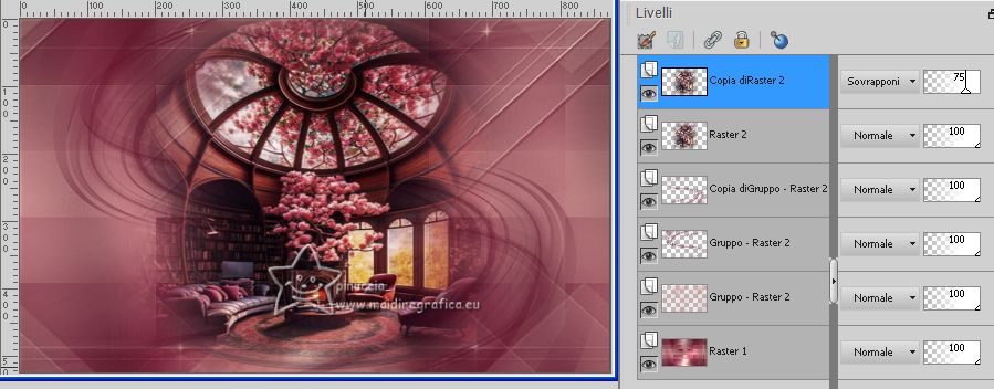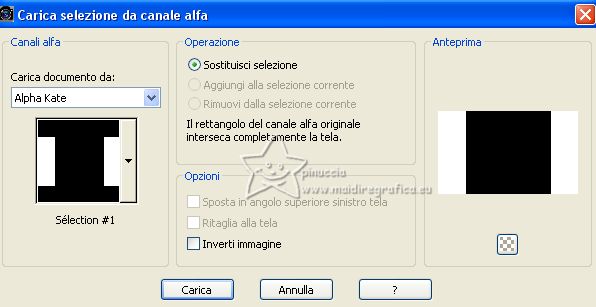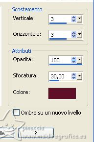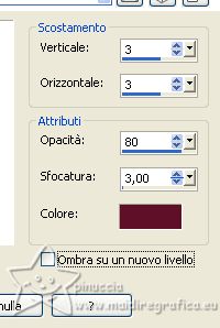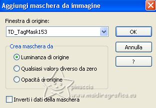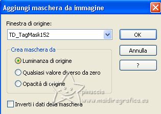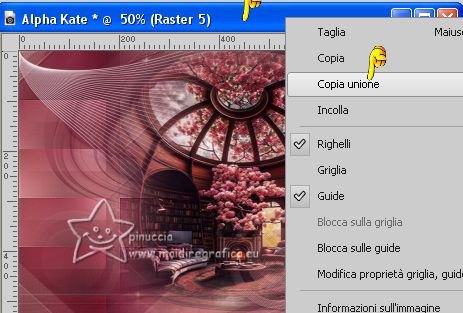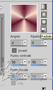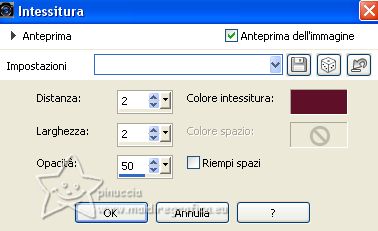 qui puoi trovare qualche risposta ai tuoi dubbi. Se l'argomento che ti interessa non è presente, ti prego di segnalarmelo. Questo tutorial è stato tradotto con PSPX7, ma può essere realizzato con le versioni più antiche. Dalla versione X4, il comando Immagine>Rifletti è stato sostituito con Immagine>Capovolgi in orizzontale, e il comando Immagine>Capovolgi con Immagine>Capovolgi in verticale. Nelle versioni X5 e X6, le funzioni sono state migliorate rendendo disponibile il menu Oggetti. Con la nuova versione X7, sono tornati Rifletti>Capovolgi, ma con nuove varianti. Vedi la scheda sull'argomento qui Traduzione inglese qui Le vostre versioni quiOccorrente: ![]() Per le maschere grazie Tati. Il resto del materiale è di Colybrix (in questa pagina trovi i links ai siti dei creatori di tubes) Filtri: in caso di dubbi, ricorda di consultare la mia sezione filtri qui Filters Unlimited 2.0 qui Toadies - Weaver qui Graphics Plus - Cross shadow qui AAA Frames - Foto Frame qui I filtri Toadies e Graphics Plus si possono usare da soli o importati in Filters Unlimited (come fare vedi qui) Se un filtro fornito appare con questa icona ![]() non esitare a cambiare modalità di miscelatura e opacità secondo i colori utilizzati. Nelle ultime versioni di PSP non c'é il gradiente di primo piano/sfondo (Corel_06_029) Puoi usare i gradienti delle versioni precedenti. Trovi qui i gradienti Corel X. ![]() Apri le maschere in PSP e minimizzale con il resto del materiale. 1. Imposta il colore di primo piano con #5f1028, e il colore di sfondo con #fcdecb. ![]() Passa il colore di primo piano a Gradiente di primo piano/sfondo, stile Radiale. ![]() Apri Alpha Kate. Finestra>Duplica o sulla tastiera maiuscola+D per fare una copia. ![]() Chiudi l'originale. La copia, che sarà la base del tuo lavoro, non é vuota, ma contiene le selezioni salvate sul canale alfa. Riempi l'immagine trasparente con il gradiente.Regola>Sfocatura>Sfocatura gaussiana - raggio 25. ![]() Effetti>Effetti di riflesso>Specchio rotante. ![]() 2. Effetti>Plugins>Toadies - Weaver, con i settaggi standard. ![]() Effetti>Effetti di bordo>Aumenta. Effetti>Plugins>Graphics Plus - Cross Shadow. ![]() 3. Livelli>Nuovo livello raster. Riempi il livello con il colore chiaro di sfondo.Livelli>Nuovo livello maschera>Da immagine. Apri il menu sotto la finestra di origine e vedrai la lista dei files aperti. Seleziona la maschera TD_TagMask153 ![]() Effetti>Effetti di bordo>Aumenta. Livelli>Unisci>Unisci gruppo. Livelli>Duplica. Livelli>Unisci>Unisci giù. Effetti>Effetti 3D>Sfalsa ombra, colore di primo piano ![]() 4. Livelli>Nuovo livello raster. Passa il colore di primo piano a Colore. Riempi il livello con il colore scuro di primo piano.Livelli>Nuovo livello maschera>Da immagine. Apri il menu sotto la finestra di origine e seleziona la maschera TD_TagMask152 ![]() Effetti>Effetti di bordo>Aumenta. Livelli>Unisci>Unisci gruppo. 5. Livelli>Duplica. Immagine>Rifletti. Immagine>Capovolgi. 6. Apri il mist intérieur 17-coly copie ![]() Cancella il watermark e vai a Modifica>Copia. Torna al tuo lavoro e vai a Modifica>Incolla come nuovo livello. Immagine>Ridimensiona, all'88%, tutti i livelli non selezionato. Tasto K per attivare lo strumento Puntatore ![]() e imposta Fattore di scala X (%) a 120,00, per ingrandire un po' l'immagine verso destra ![]() ![]() adatta secondo il tuo tube 7. Oggetti>Allinea>Centra orizzontale nella tela (per le vecchie versioni, posiziona il tube al centro dell'immagine) ![]() ![]() Livelli>Duplica. Cambia la modalità di miscelatura di questo livello in Sovrapponi, e abbassa l'opacità al 75% adatta secondo il tuo lavoro ![]() 8. Attiva il livello Raster 1. Selezione>Carica/Salva selezione>Carica selezione da canale alfa. La selezione #1 é subito disponibile. Devi soltanto cliccare Carica. ![]() Selezione>Innalza selezione a livello. Selezione>Deseleziona. 9. Effetti>Plugins>Toadies - Weaver, con i settaggi standard. ![]() Effetti>Effetti 3D>Sfalsa ombra, colore nero. ![]() Cambia la modalità di miscelatura di questo livello in Luce diffusa. Effetti>Effetti di riflesso>Specchio rotante. ![]() Effetti>Effetti di bordo>Aumenta. 10. Ripeti Effetti>Plugins>Toadies - Weaver, con i settaggi standard. ![]() Effetti>Effetti 3D>Sfalsa ombra, con i settaggi precedenti. 11. Attiva il livello superiore. Livelli>Nuovo livello raster. Selezione>Carica/Salva selezione>Carica selezione da canale alfa. Apri il menu delle selezioni e carica la selezione #2. ![]() Riempi il livello con il colore chiaro di sfondo (2 clic).Selezione>Deseleziona. 12. Effetti>Effetti di trama>Intessitura colore intessitura: colore di primo piano ![]() Effetti>Effetti di immagine>Motivo unico, fianco a fianco ![]() 13. Immagine>Rifletti. Immagine>Capovolgi. Effetti>Effetti 3D>Sfalsa ombra, colore scuro di primo piano. ![]() 14. Apri deco 1 ![]() Modifica>Copia. Torna al tuo lavoro e vai a Modifica>Incolla come nuovo livello. E' al suo posto. Effetti>Effetti 3D>Sfalsa ombra, con i settaggi precedenti. 15. Apri il tube Texte Beauty ![]() Modifica>Copia. Torna al tuo lavoro e vai a Modifica>Incolla come nuovo livello. Immagine>Immagine negativa. Immagine>Ruota per gradi - 90 gradi a destra. ![]() Sposta il testo a destra.![]() Effetti>Effetti 3D>Sfalsa ombra, con i settaggi precedenti. 16. Modifica>Copia Speciale>Copia Unione o tasto destro sulla barra blu del tuo lavoro e dal menu clicca su Copia Unione ![]() 17. Immagine>Aggiungi bordatura, 2 pixels, simmetriche, colore scuro. Immagine>Aggiungi bordatura, 3 pixels, simmetriche, colore chiaro. Immagine>Aggiungi bordatura, 2 pixels, simmetriche, colore scuro. 18. Selezione>Seleziona tutto. Immagine>Aggiungi bordatura, 30 pixels, simmetriche, con un colore qualsiasi. Selezione>Inverti. Modifica>Incolla nella selezione. Regola>Sfocatura>Sfocatura gaussiana - raggio 10. ![]() 19. Effetti>Plugins>Graphics Plus - Cross Shadow, con i settaggi standard. ![]() Regola>Aggiungi/Rimuovi disturbo>Aggiungi disturbo. ![]() Selez