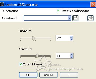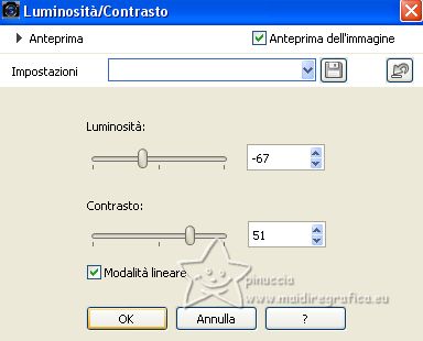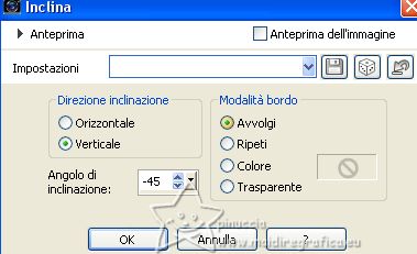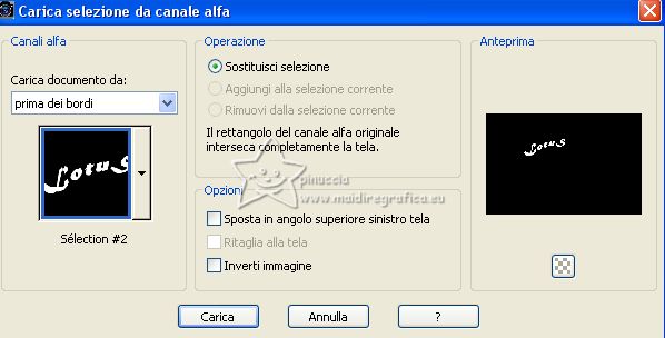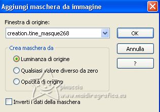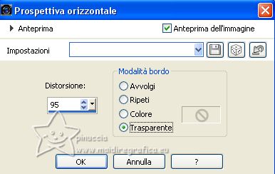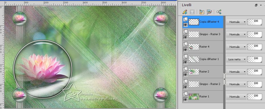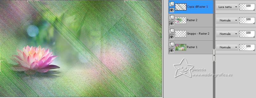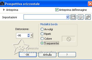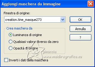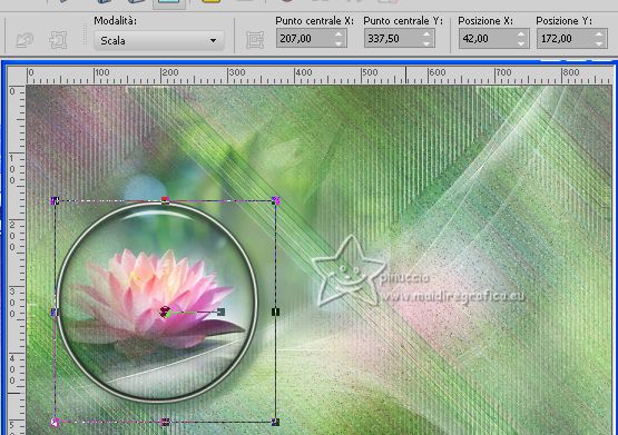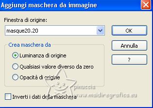 qui puoi trovare qualche risposta ai tuoi dubbi. Se l'argomento che ti interessa non è presente, ti prego di segnalarmelo. Questo tutorial è stato tradotto con PSPX7, ma può essere realizzato con le versioni più antiche. Dalla versione X4, il comando Immagine>Rifletti è stato sostituito con Immagine>Capovolgi in orizzontale, e il comando Immagine>Capovolgi con Immagine>Capovolgi in verticale. Nelle versioni X5 e X6, le funzioni sono state migliorate rendendo disponibile il menu Oggetti. Con la nuova versione X7, sono tornati Rifletti>Capovolgi, ma con nuove varianti. Vedi la scheda sull'argomento qui Traduzione inglese qui Le vostre versioni quiOccorrente: ![]() Grazie per il tube Lady Bird e per la maschera Tine. Il resto del materiale è di Colybrix (in questa pagina trovi i links ai siti dei creatori di tubes) Se cerchi immagini per lo sfondo, digita "Fleurs de lotus" o "fiori di loto" su Google ![]() in caso di dubbi, ricorda di consultare la mia sezione filtri qui Filters Unlimited 2.0 qui Graphics Plus - Cross Shadow qui Birgit Chaos - Psychosis qui Simple - Top Left Mirror qui Toadies - What are you, Weaver qui Alien Skin Eye Candy 5 Impact - Glass qui AAA Filters - Custom qui I filtri Graphics Plus, Simple e Toadies si possono usare da soli o importati in Filters Unlimited (come fare vedi qui) Se un filtro fornito appare con questa icona ![]() non esitare a cambiare modalità di miscelatura e opacità secondo i colori utilizzati. ![]() Apri le maschere in PSP e minimizzale con il resto del materiale. Imposta il colore di primo piano con il colore scuro #3c5e42, e il colore di sfondo con il colore chiaro #ffe6f0. ![]() 1. Apri Alpha Lotus. Finestra>Duplica o sulla tastiera maiuscola+D per fare una copia. ![]() Chiudi l'originale. La copia, che sarà la base del tuo lavoro, non é vuota, ma contiene le selezioni salvate sul canale alfa. Selezione>Seleziona tutto. Apri l'immagine di sfondo fleur_lotus_rose-1 ![]() Modifica>Copia. Torna al tuo lavoro e vai a Modifica>Incolla nella selezione. Selezione>Deseleziona. 2. Regola>Sfocatura>Sfocatura gaussiana - raggio 50. ![]() Effetti>Effetti di immagine>Motivo unico, con i settaggi standard. ![]() Ripeti Regola>Sfocatura>Sfocatura gaussiana - raggio 50. ![]() 3. Regola>Aggiungi/Rimuovi disturbo>Aggiungi disturbo. ![]() Effetti>Plugins>Graphics Plus - Cross Shadow. ![]() 4. Livelli>Duplica. Effetti>Plugins>Birgits Chaos - Psychosis, con i settaggi standard. ![]() Cambia la modalità di miscelatura di questo livello in Sovrapponi, e abbassa l'opacità al 30%. ![]() Livelli>Unisci>Unisci giù. 5. Imposta il colore di primo piano con il colore bianco. Livelli>Nuovo livello raster. Riempi il livello con il colore bianco.Livelli>Nuovo livello maschera>Da immagine. Apri il menu sotto la finestra di origine e vedrai la lista dei files aperti. Seleziona la maschera creation.tine_masque268 ![]() Regola>Messa a fuoco>Metti a fuoco. Livelli>Unisci>Unisci gruppo. 6. Effetti>Effetti 3D>Sfalsa ombra, colore scuro #3c5e42. ![]() 7. Attiva l'immagine di sfondo Lotus Livelli>Carica/Salva maschera>Carica maschera da disco. Cerca e carica la maschera 20-20. ![]() Se non hai la maschera sul disco, puoi anche usarla su PSP: Livelli>Nuovo livello maschera>Da immagine ![]() Livelli>Duplica. Livelli>Unisci>Unisci gruppo. 8. Modifica>Copia. Torna al tuo lavoro e vai a Modifica>Incolla come nuovo livello. Immagine>Rifletti. Sposta il tube un po' più a sinistrao tasto K per attivare lo strumento Puntatore ![]() Posizione X: -80,00 e Posizione Y: -43,00 ![]() 9. Attiva il livello Raster 1. Livelli>Duplica. Livelli>Disponi>Porta in alto. 10. Effetti>Effetti geometrici>Prospettiva orizzontale. ![]() Ripeti Effetti>Effetti geometrici>Prospettiva orizzontale - 95. ![]() ![]() Effetti>Effetti geometrici>Inclina. ![]() 11. Effetti>Plugins>Toadies - What are you. ![]() Effetti>Effetti di bordo>Aumenta. Effetti>Effetti 3D>Sfalsa ombra, colore scuro, ancora in memoria ![]() Livelli>Duplica. Livelli>Unisci>Unisci giù. Cambia la modalità di miscelatura di questo livello in Luce netta. ![]() Effetti>Effetti 3D>Sfalsa ombra, colore scuro, ancora in memoria. ![]() 12. Livelli>Nuovo livello raster. Riempi il livello con il colore bianco.Livelli>Nuovo livello maschera>Da immagine. Apri il menu sotto la finestra di origine e vedrai la lista dei files aperti. Seleziona la maschera creation.tine_masque273 ![]() Effetti>Effetti di bordo>Aumenta. Livelli>Unisci>Unisci gruppo. 13. Selezione>Carica/Salva selezione>Carica selezione da canale alfa. La selezione Sélection #1 é subito disponibile. Devi soltanto cliccare Carica. ![]() Se vuoi spostare leggermente la selezione per riprendere meglio il fiore o il paesaggio (a seconda dell'immagine di partenza), attiva lo strumento Selezione o lo strumento Spostamento e sposta la selezione, tenendo premuto il tasto destro del mouse. ![]() 14. Modifica>Copia Speciale>Copia Unione. Livelli>Nuovo livello raster. Modifica>Incolla nella selezione. Effetti>Plugins>Alien Skin Eye Candy 5 Impact - Glass. Seleziona il preset Clear e ok. ![]() 15. Imposta nuovamente il colore di primo piano con il colore scuro #3c5e42 ![]() Selezione>Modifica>Espandi - 9 pixels. Livelli>Nuovo livello raster. Riempi con il colore scuro.Selezione>Modifica>Contrai - 3 pixels. Riempi con il colore chiaro.Selezione>Modifica>Contrai - 3 pixels. Riempi con il colore scuro.Selezione>Modifica>Contrai - 5 pixels. Premi sulla tastiera il tasto CANC ![]() Selezione>Deseleziona. 16. Livelli>Disponi>Sposta giù. Attiva nuovamente il livello superiore, Raster 3. Livelli>Unisci>Unisci giù. 17. Effetti>Effetti 3D>Sfalsa ombra, colore scuro. ![]() se al punto 13 hai spostato la selezione, puoi rimettere il cerchio al suo posto: Tasto K per attivare lo strumento Puntatore ![]() e imposta Posizione X: 42,00 e Posizione Y: 172,00. ![]() Livelli>Disponi>Sposta giù. 18. Livelli>Duplica. Livelli>Disponi>Porta in alto. Immagine>Ridimensiona, al 25%, tutti i livelli non selezionato. Man