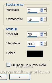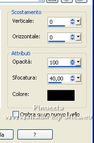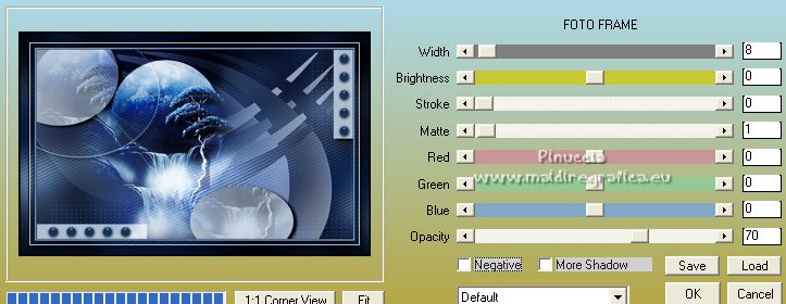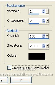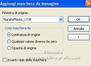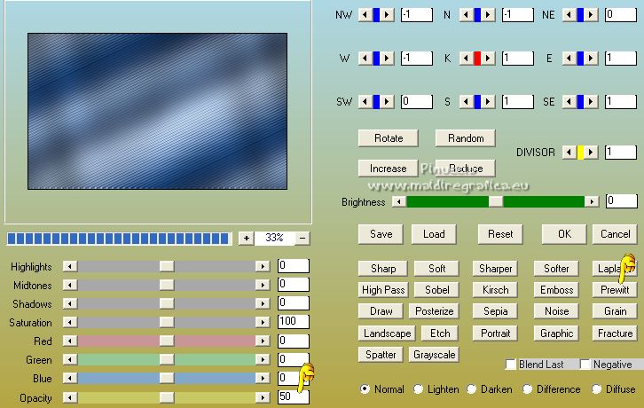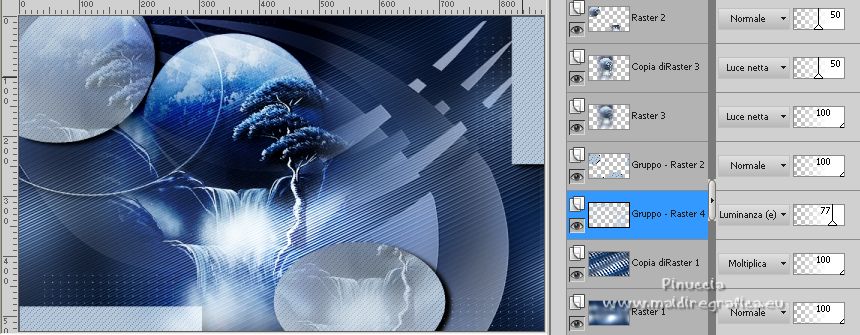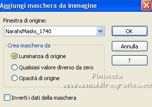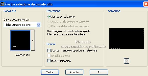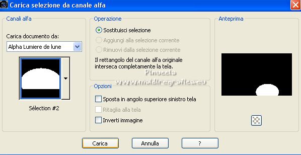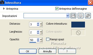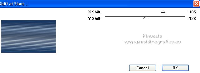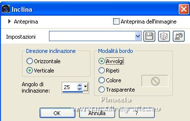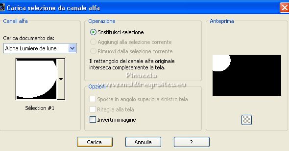 qui puoi trovare qualche risposta ai tuoi dubbi. Se l'argomento che ti interessa non è presente, ti prego di segnalarmelo. Questo tutorial è stato tradotto con PSPX, ma può essere realizzato anche con le altre versioni di PSP. Dalla versione X4, il comando Immagine>Rifletti è stato sostituito con Immagine>Capovolgi in orizzontale, e il comando Immagine>Capovolgi con Immagine>Capovolgi in verticale. Nelle versioni X5 e X6, le funzioni sono state migliorate rendendo disponibile il menu Oggetti. Con la nuova versione X7, sono tornati Rifletti>Capovolgi, ma con nuove varianti. Vedi la scheda sull'argomento qui Occorrente: Materiale qui Per le maschere grazie Narah. Il resto del materiale è di Colybrix (in questa pagina trovi i links ai siti dei creatori di tubes) Filtri: se hai problemi con i filtri, consulta la mia sezione filtri qui Filters Unlimited 2.0 qui Mura's Seamless - Shift at Slant qui AAA Filters - Custom / AAA Frames - Foto Frame qui Graphics Plus - Cross Shadow qui Alien Skin Eye Candy 5 Impact - Glass qui I filtri Mura's Seamless si possono usare da soli o importati in Filters Unlimited (come fare vedi qui) Se un filtro fornito appare con questa icona ![]() non esitare a cambiare modalità di miscelatura e opacità secondo i colori utilizzati. ![]() Apri le maschere e minimizzale con il resto del materiale. Imposta il colore di primo piano con #173863, e il colore di sfondo con #bccddd. ![]() 1. Apri Alpha Lumière de lune. Finestra>Duplica o sulla tastiera maiuscola+D per fare una copia. ![]() Chiudi l'originale. La copia, che sarà la base del tuo lavoro, non é vuota, ma contiene le selezioni salvate sul canale alfa. Riempi il livello con il colore di primo piano.Selezione>Seleziona tutto. Apri il misted del paesaggio e vai a Modifica>Copia. Torna al tuo lavoro e vai a Modifica>Incolla nella selezione. Selezione>Deseleziona. 2. Regola>Sfocatura>Sfocatura gaussiana - raggio 35. ![]() Effetti>Effetti di immagine>Motivo unico - fianco a fianco. ![]() 3. Livelli>Duplica. Effetti>Plugins>Mura's Seamless - Shift at Slant. ![]() Effetti>Effetti geometrici>Inclina. ![]() Cambia la modalità di miscelatura di questo livello in Moltiplica (per la mia seconda versione ho messo Sovrapponi). 4. Attiva il livello Raster 1. Effetti>Plugins>Graphics Plus - Cross Shadow. ![]() Attiva il livello Copia di Raster 1. Ripeti Effetti>Plugins>Graphics Plus - Cross Shadow, con i settaggi precedenti. 5. Livelli>Nuovo livello raster. Riempi il livello con il colore chiaro di sfondo.Livelli>Nuovo livello maschera>Da immagine. Apri il menu sotto la finestra di origine e vedrai la lista dei files aperti. Seleziona la maschera NarahsMasks_1738. ![]() Effetti>Effetti di bordo>Aumenta. Livelli>Unisci>Unisci gruppo. 6. Modifica>Incolla come nuovo livello (il misted del paesaggio è sempre in memoria). Immagine>Ridimensiona, al 70%, tutti i livelli non selezionato. Livelli>Duplica. Tasto K per attivare lo strumento Puntatore ![]() e imposta Posizione X: -100,00 e Posizione Y: -123,00. ![]() Selezione>Carica/Salva selezione>Carica selezione da canale alfa. La selezione #1 é subito disponibile. Devi soltanto cliccare Carica. ![]() Selezione>Inverti. Premi sulla tastiera il tasto CANC ![]() Selezione>Deseleziona. 7. Attiva il livello sottostante del paesaggio. Strumento Puntatore ![]() e imposta Posizione X: 348,00 e Posizione Y: 126,00. ![]() Selezione>Carica/Salva selezione>Carica selezione da canale alfa. Apri il menu delle selezioni e carica la selezione #2. ![]() Selezione>Inverti. Premi sulla tastiera il tasto CANC. Selezione>Deseleziona. Attiva nuovamente il livello superiore (Copia di Raster 2). Livelli>Unisci>Unisci giù. Abbassa l'opacità di questo livello al 50%. 8. Attiva il livello della maschera (Gruppo-Raster 2). Effetti>Effetti di trama>Intessitura. ![]() Effetti>Effetti 3D>Sfalsa ombra, colore nero. ![]() 9. Di nuovo Modifica>Incolla come nuovo livello (il misted del paesaggio è sempre in memoria). Immagine>Ridimensiona, all'85%, tutti i livelli non selezionato. Tasto K per attivare lo strumento Puntatore ![]() e imposta Posizione X: 100,00 e Posizione Y: -89,00. ![]() 10. Cambia la modalità di miscelatura di questo livello in Luce netta. Livelli>Duplica. Abbassa l'opacità di questo livello al 50%. 11. Attiva il livello Copia di Raster 1. Effetti>Plugins>AAA Filters - Custom - clicca su Prewitt, opacity a 50 ![]() 12. Livelli>Nuovo livello raster. Riempi il livello con il colore chiaro di sfondo.Livelli>Nuovo livello maschera>Da immagine. Apri il menu sotto la finestra di origine e seleziona la maschera NarahsMasks_1740. ![]() Effetti>Effetti di bordo>Aumenta. Livelli>Unisci>Unisci gruppo. Cambia la modalità di miscelatura di questo livello in Luminanza (esistente) e abbassa l'opacità al 77%. ![]() 14. Attiva il livello Copia di Raster 1. Livelli>Unisci>Unisci giù. Modifica>Copia. Modifica>Incolla come nuova immagine, e minimizza questa immagine. Torna al tuo lavoro. Livelli>Unisci>Unsici visibile. 15. Selezione>Carica/Salva selezione>Carica selezione da canale alfa. Apri il menu delle selezioni e carica la selezione #3. ![]() Livelli>Nuovo livello raster. Riempi il livello con il colore scuro di primo piano.Effetti>Plugins>Alien Skin Eye Candy 5 Impact - Glass. ![]() 16. Effetti>Effetti 3D>Sfalsa ombra, colore nero. ![]() Selezione>Deseleziona. 17. Immagine>Aggiungi bordatura, 2 pixels, simmetriche, colore di primo piano. Immagine>Aggiungi bordatura, 2 pixels, simmetriche, colore di sfondo. Immagine>Aggiungi bordatura, 2 pixels, simmetriche, colore di primo piano. 18. Selezione>Seleziona tutto. Immagine>Aggiungi bordatura, 40 pixels, simmetriche, con un colore qualsiasi. Selezione>Inverti. Modifica>Incolla nella selezione (l'immagine di sfondo del punto 14 è ancora in memoria). 19. Effetti>Plugins>Graphics Plus - Cross Shadow, con i settaggi precedenti. Selezione>Inverti. Effetti>Effetti 3D>Sfalsa ombra, colore scuro, o nero. ![]() Selezione>Deseleziona. 20. Effetti>Plugins>AAA F