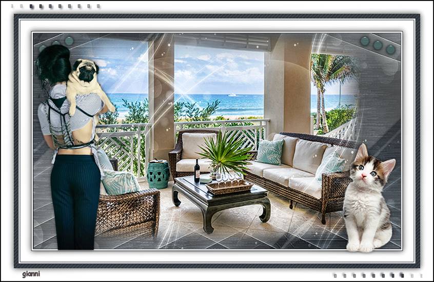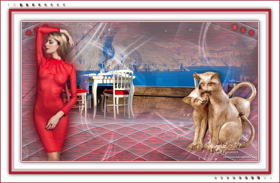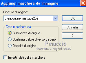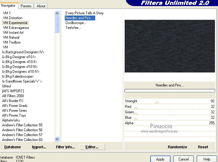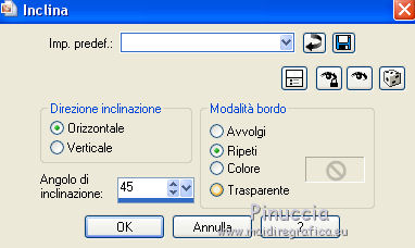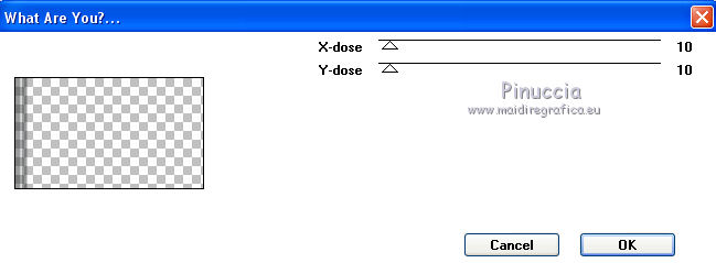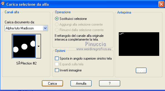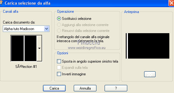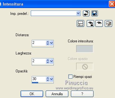 qui puoi trovare qualche risposta ai tuoi dubbi. Se l'argomento che ti interessa non è presente, ti prego di segnalarmelo. Questo tutorial è stato tradotto con PSPX, ma può essere realizzato anche con le altre versioni di PSP. Dalla versione X4, il comando Immagine>Rifletti è stato sostituito con Immagine>Capovolgi in orizzontale, e il comando Immagine>Capovolgi con Immagine>Capovolgi in verticale. Nelle versioni X5 e X6, le funzioni sono state migliorate rendendo disponibile il menu Oggetti. Con la nuova versione X7, sono tornati Rifletti>Capovolgi, ma con nuove varianti. Vedi la scheda sull'argomento qui Le vostre versioni Occorrente: Materiale qui Grazie per il tube del gatto e per le maschere Tine. Il resto del materiale è di Colybrix (in questa pagina trovi i links ai siti dei creatori di tubes) Filtri: se hai problemi con i filtri, consulta la mia sezione filtri qui VM Experimental - Needle and Pins qui Toadies - What are you qui Filters Unlimited 2.0 qui Alien Skin Eye Candy 5 Impact - Glass qui Graphics Plus - Cross Shadow qui I filtri Graphics Plus, VM Experimental e Toadies si possono usare da soli o importati in Filters Unlimited (come fare vedi qui) Se un filtro fornito appare con questa icona ![]() non esitare a cambiare modalità di miscelatura e opacità secondo i colori utilizzati. Metti lo script nella cartella Script sicuri. Apri le maschere in PSP e minimizzale con il resto del materiale. 1. Imposta il colore di primo piano con il colore scuro #2e343c, e il colore di sfondo con il colore chiaro #cbd1d1. ![]() 2. Apri Alpha_Madison. Finestra>Duplica, o sulla tastiera maiuscola+D, per fare una copia. Chiudi l'originale. La copia, che sarà la base del tuo lavoro non è vuota, ma contiene le selezioni salvate sul canale alfa. Riempi l'immagine trasparente con il colore scuro.3. Effetti>Effetti di trama>Intessitura colore intessitura: colore chiaro. ![]() 4. Effetti>Plugins>Filters Unlimited 2.0 - VM Experimental – Needle and Pins, con i settaggi standard. ![]() 5. Effetti>Plugins>Graphics Plus - Cross Shadow, con i settaggi standard. ![]() 6. Livelli>Nuovo livello raster, Raster 3. Riempi il livello con il colore chiaro.Livelli>Nuovo livello maschera>Da immagine. Apri il menu sotto la finestra di origine e vedrai la lista dei files aperti. Seleziona la maschera Tine 252 ![]() Effetti>Effetti di bordo>Aumenta. Livelli>Unisci>Unisci gruppo. 7. Apri il mist SvB intérieur 75, cancella la firma e vai a Modifica>Copia. Torna al tuo lavoro e vai a Modifica>Incolla come nuovo livello. 8. Attiva lo strumento Puntatore ![]() e imposta Posizione X: 55,00 e Posizione Y: -21,00. ![]() (se stai usando un tuo tube, adatta la dimensione e l'opacità). Livelli>Unisci>Unisci visibile. 9. Selezione>Carica/Salva selezione>Carica selezione da canale alfa. La selezione #1 è subito disponibile. Devi soltanto cliccare Carica. ![]() Selezione>Innalza selezione a livello. Effetti>Effetti 3D>Sfalsa ombra. ![]() 10. Effetti>Effetti di bordo>Aumenta. Selezione>Deseleziona. 11. Effetti>Plugins>Toadies - What are you. ![]() 12. Livelli>Duplica. Immagine>Rifletti. Livelli>Unisci>Unisci giù. 13. Effetti>Effetti geometrici>Inclina. ![]() 14. Cambia la modalità di miscelatura di questo livello in Sovrapponi. Livelli>Unisci>Unisci visibile. 15. Selezione>Carica/Salva selezione>Carica selezione da canale alfa. Apri il menu delle selezioni e carica la selezione #2. ![]() Selezione>Innalza selezione a livello. 16. Effetti>Plugins>Alien Skin Eye Candy 5 Impact - Glass. ![]() Selezione>Deseleziona. 17. Effetti>Effetti 3D>Sfalsa ombra. ![]() 18. Livelli>Duplica. Immagine>Rifletti. Livelli>Unisci>Unisci giù. 19. Attiva nuovamente il livello di sfondo. Imposta il colore di primo piano con il colore bianco. Livelli>Nuovo livello raster. Riempi il livello con il colore bianco.Livelli>Nuovo livello maschera>Da immagine. Apri il menu sotto la finestra di origine e seleziona la maschera Tine 213 ![]() Effetti>Effetti di bordo>Aumenta. Livelli>Unisci>Unisci gruppo. 21. Effetti>Effetti di immagine>Motivo unico, con i settaggi standard. ![]() 22. Cambia la modalità di miscelatura di questo livello in Sovrapponi, e abbassa l'opacità al 75%. 23. Apri il tube del gatto e vai a Modifica>Copia. Torna al tuo lavoro e vai a Modifica>Incolla come nuovo livello. Immagine>Ridimensiona, 2 volte al 75%, tutti i livelli non selezionato. Sposta il tube in basso a destra.24. Effetti>Effetti 3D>Sfalsa ombra. ![]() 25. Attiva il livello superiore. Apri il tube della donna, cancella la firma e vai a Modifica>Copia. Torna al tuo lavoro e vai a Modifica>Incolla come nuovo livello. Immagine>Rifletti. 26. Immagine>Ridimensiona, al 63%, tutti i livelli non selezionato. Spostalo / a sinistra.![]() 27. Livelli>Duplica. Attiva il livello sottostante dell'originale. Regola>Sfocatura>Sfocatura gaussiana - raggio 20. ![]() Cambia la modalità di miscelatura di questo livello in Moltiplica. 28. Salva il tuo lavoro prima di continuare, per precauzione. Se non la visualizzi, attiva la paletta degli script: Visualizza>Paletta strumenti>Script. Apri il menu e seleziona lo script madisson ![]() Seleziona la modalità di esecuzione se vuoi cambiare i colori. Se non la selezioni, lo script si eseguirà senza interruzioni. ![]() Clicca sulla freccia nera (blu nelle versioni più recenti) per eseguire lo script. Se stai usando una versione precedente a quella con la quale è stato creato lo script, ti apparirà questo messaggio ![]() Clicca ok e continua. Vai al punto 34, se tutto è andato bene con lo script **** Se hai problemi con lo script, questi sono i passi che lo compongono. (non dimenticare di impostare nuovamente il colore di primo piano con il tuo colore scuro) 29. Immagine>Aggiungi bordatura, 1 pixel, simmetriche, colore scuro. Immagine>Aggiungi bordatura, 3 pixels, simmetriche, colore bianco. Immagine>Aggiungi bordatura, 1 pixel, simmetriche, colore scuro. 30. Selezione>Seleziona tutto. Immagine>Aggiungi bordatura, 25 pixels, simmetri