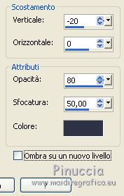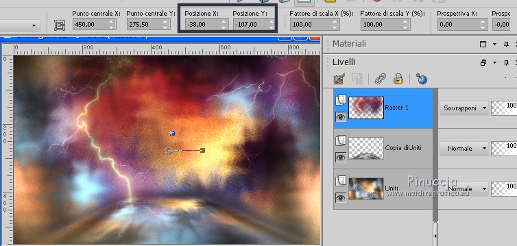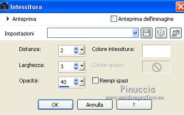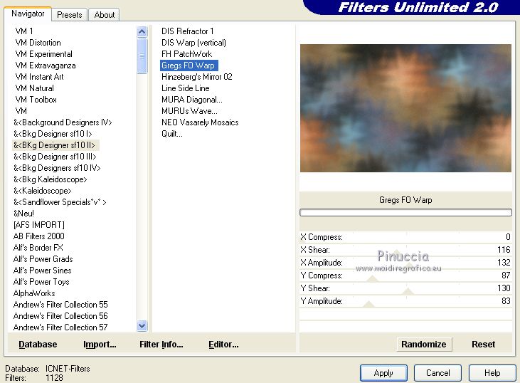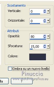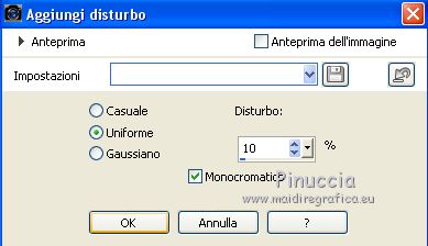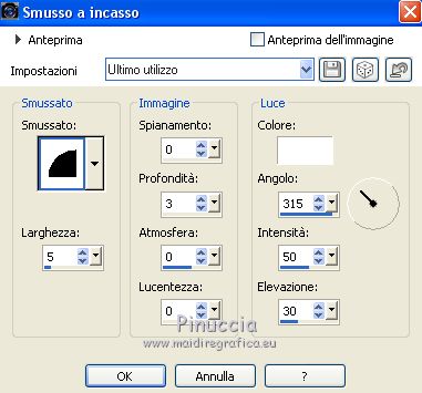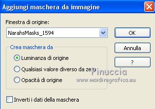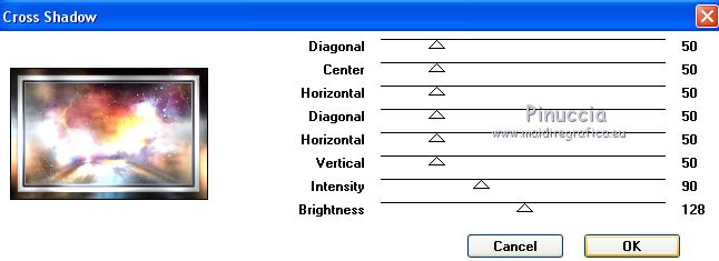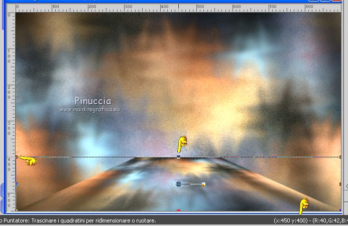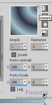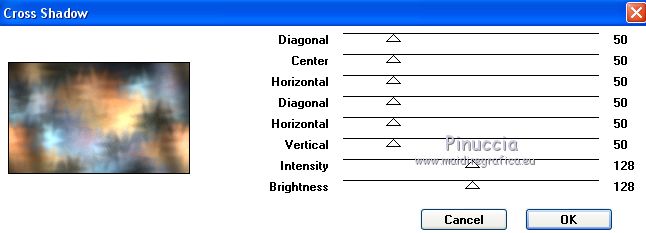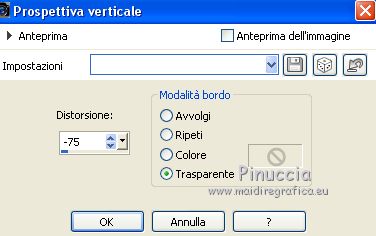 qui puoi trovare qualche risposta ai tuoi dubbi. Se l'argomento che ti interessa non è presente, ti prego di segnalarmelo. Questo tutorial è stato tradotto con PSPX, ma può essere realizzato anche con le altre versioni di PSP. Dalla versione X4, il comando Immagine>Rifletti è stato sostituito con Immagine>Capovolgi in orizzontale, e il comando Immagine>Capovolgi con Immagine>Capovolgi in verticale. Nelle versioni X5 e X6, le funzioni sono state migliorate rendendo disponibile il menu Oggetti. Con la nuova versione X7, sono tornati Rifletti>Capovolgi, ma con nuove varianti. Vedi la scheda sull'argomento qui Le vostre versioniOccorrente: Materiale qui Per la maschera grazie Narah Il resto del materiale è di Colybrix. (in questa pagina trovi i links ai siti dei creatori di tubes) Filtri: se hai problemi con i filtri, consulta la mia sezione filtri qui Filters Unlimited 2.0 qui &<Bkg Designer sf10II> - Gregs F0 Warp (da importare in Unlimited) qui Graphics Plus - Cross Shadow qui I filtri Graphics Plus si possono usare da soli o importati in Filters Unlimited (come fare vedi qui) Se un filtro fornito appare con questa icona ![]() non esitare a cambiare modalità di miscelatura e opacità secondo i colori utilizzati. Nelle ultime versioni di PSP non c'è il gradiente di primo piano/sfondo (Corel_06_029) Puoi usare i gradienti delle versioni precedenti. Trovi qui i gradienti Corel X. ![]() Apri la maschera in PSP e minimizzala con il resto del materiale. 1. Imposta il colore di primo piano con #2e3346 e il colore di sfondo con #a3c3cd. ![]() Passa il colore di primo piano a Gradiente di primo piano/sfondo, stile Sprazzo di luce. ![]() 2. Apri una nuova immagine trasparente 900 x 550 pixels. Riempi l'immagine trasparente con il gradiente.Regola>Sfocatura>Sfocatura gaussiana - raggio 15. ![]() 3. Livelli>Duplica. Immagine>Rifletti. Cambia la modalità di miscelatura di questo livello in Sovrapponi. 4. Livelli>Nuovo livello raster. Selezione>Seleziona tutto. Apri il tube della donna e vai a Modifica>Copia. Torna al tuo lavoro e vai a Modifica>Incolla nella selezione. Selezione>Deseleziona. Effetti>Effetti di immagine>Motivo unico, con i settaggi standard. ![]() Regola>Sfocatura>Sfocatura gaussiana - raggio 30. ![]() 5. Regola>Aggiungi/Rimuovi disturbo>Aggiungi disturbo. ![]() Livelli>Unisci>Unisci visibile. 6. Effetti>Plugings>Filters Unlimited 2.0 - &<Bkg Designer sf10II> - Gregs F0 Warp ![]() 7. Effetti>Plugins>Graphics Plus - Cross Shadow, con i settaggi standard. ![]() Livelli>Duplica. Effetti>Effetti geometrici>Prospettiva verticale. ![]() 8. Tasto K sulla tastiera per attivare lo strumento Puntatore ,in modalità Scala ![]() spingi il nodo superiore centrale verso il basso, fino a 400 pixels (se non vedi i righelli, vai a Visualizza>Righelli) ![]() 9. Attiva lo strumento Bacchetta magica , sfumatura e tolleranza 0,e clicca nella parte trasparente per selezionarla. ![]() Selezione>Modifica>Sfuma - 35 pixels. ![]() 10. Premi 5-6 volte CANC sulla tastiera ![]() ![]() Selezione>Deseleziona. 11. Effetti>Effetti 3D>Sfalsa ombra, colore scuro. ![]() 12. Apri il tube Orage-Coly e vai a Modifica>Copia. Torna al tuo lavoro e vai a Modifica>Incolla come nuovo livello. Tasto K per attivare lo strumento Puntatore ![]() e imposta Posizione X: -38,00 e Posizione Y: -107,00. Cambia la modalità di miscelatura di questo livello in Sovrapponi, o altro. ![]() 13. Imposta il colore di sfondo con il colore bianco. Livelli>Nuovo livello raster. Riempi il livello con il colore bianco.Livelli>Nuovo livello maschera>Da immagine. Apri il menu sotto la finestra di origine e vedrai la lista dei files aperti. Seleziona la maschera NarahsMask_1594. ![]() Effetti>Effetti di bordo>Aumenta. Livelli>Unisci>Unisci gruppo. 14. Livelli>Unisci>Unisci visibile. Modifica>Copia. 15. Immagine>Aggiungi bordatura, 2 pixels, simmetriche, colore scuro. Immagine>Aggiungi bordatura, 3 pixels, simmetriche, colore bianco. Immagine>Aggiungi bordatura, 10 pixels, simmetriche, colore scuro. 16. Seleziona il bordo da 10 pixels con la bacchetta magica ![]() Effetti>Plugins>Graphics Plus - Cross Shadow, con i settaggi standard. ![]() Ripeti l'Effetto Cross Shadow una seconda volta. 17. Effetti>Effetti di trama>Intessitura colore intessitura: bianco ![]() 18. Effetti>Effetti 3D>Smusso a incasso. ![]() 19. Selezione>Seleziona tutto. Immagine>Aggiungi bordatura, 15 pixels, simmetriche, colore bianco. Effetti>Effetti 3D>Sfalsa ombra. ![]() Selezione>Deseleziona. 20. Immagine>Aggiungi bordatura, 1 pixel, simmetriche, colore scuro. Immagine>Aggiungi bordatura, 5 pixels, simmetriche, colore bianco. Immagine>Aggiungi bordatura, 1 pixel, simmetriche, colore scuro. Immagine>Aggiungi bordatura, 5 pixels, simmetriche, colore bianco. Immagine>Aggiungi bordatura, 1 pixel, simmetriche, colore scuro. 21. Selezione>Seleziona tutto. Immagine>Aggiungi bordatura, 35 pixels, simmetriche, colore bianco. 22. Selezione>Inverti. Modifica>Incolla nella selezione (lo sfondo in memoria). Regola>Sfocatura>Sfocatura gaussiana - raggio 5. ![]() 23. Selezione>Innalza selezione a livello. Cambia la modalità di miscelatura di questo livello in Moltiplica. Livelli>Unisci>Unisci giù. 24. Effetti>Plugins>Graphics Plus - Cross Shadow, Intensity 90 ![]() Regola>Aggiungi/Rimuovi disturbo>Aggiungi disturbo. ![]() Effetti>Effetti 3D>Smusso a incasso, con i settaggi precedenti. Selezione>Deseleziona. 25. Apri il tube della donna e vai a Modifica>Copia. Torna al tuo lavoro e vai a Modifica>Incolla come nuovo livello. Immagine>Rifletti. Immagine>Ridimensiona, all'85%, tutti i livelli non selezionato. Sposta il tube a destra.Effetti>Effetti 3D>Sfalsa ombra. ![]() 26. Apri texte Orage e vai a Modifica>Copia. Torna al tuo lavoro e vai a Modifica>Incolla come nuovo livello. Strumento Puntatore ![]() e imposta Posizione X: 88,00 e Posizione Y: 89,00. ![]() Immagine>Immagine negativa. Effetti>Effetti 3D>Sfalsa ombra, colore scuro (o nero) ![]() 27. Apri il tube flèche déco e vai a Modif