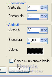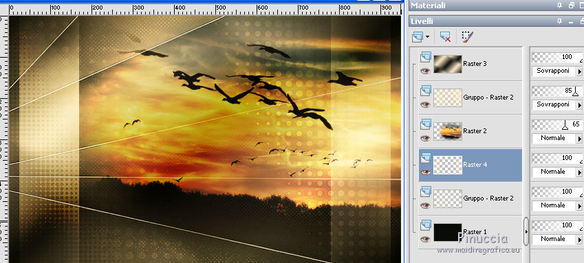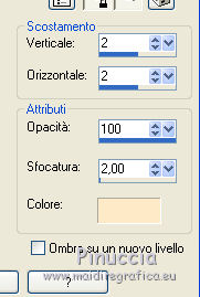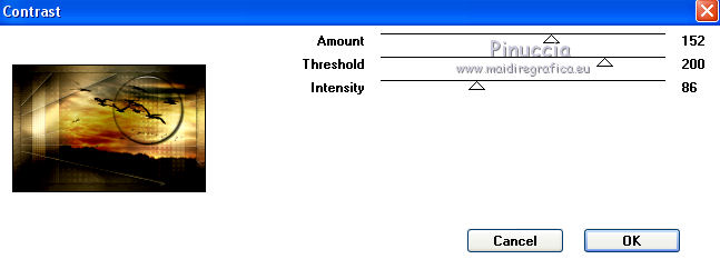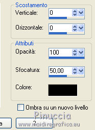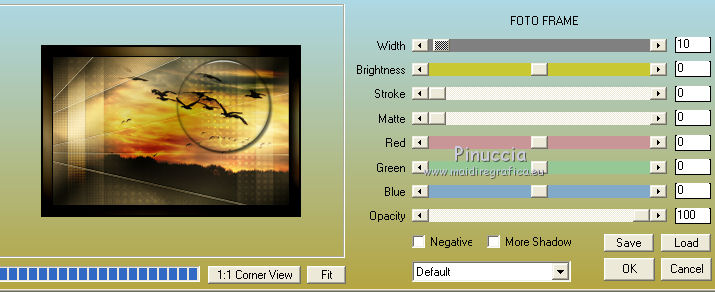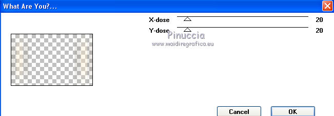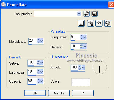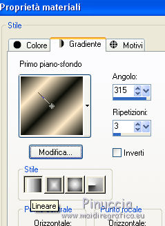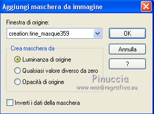 qui puoi trovare qualche risposta ai tuoi dubbi. Se l'argomento che ti interessa non è presente, ti prego di segnalarmelo. Questo tutorial è stato tradotto con PSPX, ma può essere realizzato anche con le altre versioni di PSP. Dalla versione X4, il comando Immagine>Rifletti è stato sostituito con Immagine>Capovolgi in orizzontale, e il comando Immagine>Capovolgi con Immagine>Capovolgi in verticale. Nelle versioni X5 e X6, le funzioni sono state migliorate rendendo disponibile il menu Oggetti. Con la nuova versione X7, sono tornati Rifletti>Capovolgi, ma con nuove varianti. Vedi la scheda sull'argomento qui Le vostre versioniOccorrente: Materiale qui Grazie per i tubes CibiBijoux e Mentali e per le maschere Tine. (in questa pagina trovi i links ai siti dei creatori di tubes) Filtri: se hai problemi con i filtri, consulta la mia sezione filtri qui Filters Unlimited 2.0 qui Alien Skin Eye Candy 5 Impact - Glass qui Toadies - What are you qui Graphics Plus - Contrast qui AAA Frames - Foto Frame qui I filtri Graphics Plus e Toadies si possono usare da soli o importati in Filters Unlimited (come fare vedi qui) Se un filtro fornito appare con questa icona ![]() non esitare a cambiare modalità di miscelatura e opacità secondo i colori utilizzati. Nelle ultime versioni di PSP non c'è il gradiente di primo piano/sfondo (Corel_06_029) Puoi usare i gradienti delle versioni precedenti. Trovi qui i gradienti Corel X. ![]() Metti la selezione nella cartella Selezioni. Apri le maschere in PSP e minimizzale con il resto del materiale. Imposta il colore di primo piano con #0b0d07 e il colore di sfondo con #ffeac7. ![]() 1. Apri una nuova immagine trasparente 950 x 600 pixels, e riempila con il colore scuro di sfondo.Livelli>Nuovo livello raster. Riempi il livello con il colore chiaro di primo piano.2. Livelli>Nuovo livello maschera>Da immagine. Apri il menu sotto la finestra di origine e vedrai la lista dei files aperti. Seleziona la maschera creation.tine_masque359. ![]() Effetti>Effetti di bordo>Aumenta. Livelli>Unisci>Unisci gruppo. 3. Livelli>Nuovo livello raster. Riempi il livello con il colore chiaro di primo piano.4. Livelli>Nuovo livello maschera>Da immagine. Apri il menu sotto la finestra di origine e seleziona la maschera creation.tine_masque358. ![]() Effetti>Effetti di bordo>Aumenta. Livelli>Unisci>Unisci gruppo. Cambia la modalità di miscelatura di questo livello in Sovrapponi, e abbassa l'opacità all'85%. 5. Apri il tube del paesaggio di Mentali e vai a Modifica>Copia. Torna al tuo lavoro e vai a Modifica>Incolla come nuovo livello. Sposta il tube in alto a destra.Con lo strumento Puntatore ![]() Posizione X: 119,00 e Posizione Y: -54,00. ![]() Livelli>Disponi>Sposta giù. Abbassa l'opacità di questo livello al 65%. 6. Passa il colore di primo piano a Gradiente di primo piano/sfondo, stile Lineare. ![]() Attiva il livello superiore. Livelli>Nuovo livello raster. Riempi il livello con il gradiente.7. Regola>Sfocatura>Sfocatura gaussiana - raggio 20. ![]() Effetti>Effetti di immagine>Motivo unico, con i settaggi standard. ![]() Cambia la modalità di miscelatura di questo livello in Sovrapponi. ![]() 8. Apri il tube deco2 e vai a Modifica>Copia. Torna al tuo lavoro e vai a Modifica>Incolla come nuovo livello. Livelli>Disponi>Sposta giù - 3 volte. ![]() Effetti>Plugins>Toadies - What are you. ![]() Effetti>Effetti di bordo>Aumenta. 9. Livelli>Unisci>Unisci visibile. Selezione>Carica/Salva selezione>Carica selezione da disco. Cerca e carica la selezione cercle tuto musique ![]() Selezione>Innalza selezione a livello. 10. Effetti>Plugins>Alien Skin Eye Candy 5 Impact - Glass. Seleziona il preset Clear ![]() 11. Effetti>Effetti 3D>Sfalsa ombra, colore nero. ![]() Selezione>Deseleziona. 12. Livelli>Unisci>Unisci tutto. Modifica>Copia. 13. Immagine>Aggiungi bordatura, 1 pixel, simmetriche, colore di primo piano. Selezione>Seleziona tutto. Immagine>Aggiungi bordatura, 40 pixels, simmetriche, colore di primo piano. Selezione>Inverti. Modifica>Incolla nella selezione. 14. Regola>Sfocatura>Sfocatura gaussiana - raggio 20. ![]() Effetti>Effetti tecniche di disegno>Pennellate. ![]() 15. Effetti>Plugins>Graphics Plus - Contrast. ![]() Selezione>Inverti. 16. Effetti>Effetti 3D>Sfalsa ombra, colore nero ![]() Facoltativo, secondo i tuoi colori e a tuo piacimento: Modifica>Ripeti Sfalsa ombra. Selezione>Deseleziona. 17. Effetti>Plugins>AAA Frames - Foto Frame. ![]() 18. Apri il tube della donna di CibiBijoux e vai a Modifica>Copia. Torna al tuo lavoro e vai a Modifica>Incolla come nuovo livello. Immagine>Rifletti. Sposta il tube a sinistra.Effetti>Effetti 3D>Sfalsa ombra, colore nero. ![]() 19. Apri il tube Note Musique e vai a Modifica>Copia. Torna al tuo lavoro e vai a Modifica>Incolla come nuovo livello. Strumento Puntatore ![]() e imposta Posizione X: 428,00 e Posizione Y: 278,00. ![]() Livelli>Duplica. Imposta Posizione x: 693,00 e Posizione Y: 43,00. ![]() 20. Apri il tube deco Musique e vai a Modifica>Copia. Torna al tuo lavoro e vai a Modifica>Incolla come nuovo livello. Immagine>Immagine negativa. Livelli>Duplica. Livelli>Unisci>Unisci giù. Imposta Posizione x: 359,00 e Posizione Y: 547. ![]() Sposta questo livello sopra il livello del tube della donna 21. Attiva il livello superiore. Apri il tube WA La Musique de la Nature, cancella il watermark e vai a Modifica>Copia. Torna al tuo lavoro e vai a Modifica>Incolla come nuovo livello. Imposta Posizione x: 584,00 e Posizione Y: 483.00. ![]() Effetti>Effetti 3D>Sfalsa ombra, colore chiaro. ![]() Modifica>Ripeti Sfalsa ombra. 22. Ancora Effetti>Effetti 3D>Sfalsa ombra, colore nero. ![]() 23. Firma il tuo lavoro su un nuovo livello. Immagine>Aggiungi bordatura, 1 pixel, simmetriche, colore di primo piano. 24. Immagine>Ridimensiona, 950 pixels di larghezza, tutti i livelli selezionato. Salva in formato jpg. Il paesaggio è mio; il tube non è firmato ![]() Versione con tube di Chinni, e quadri di mio zio Nino ![]() ![]() ![]() Le vostre version