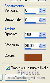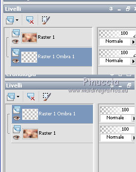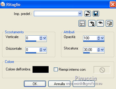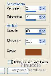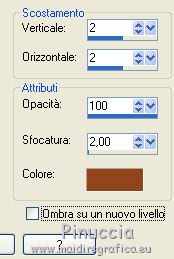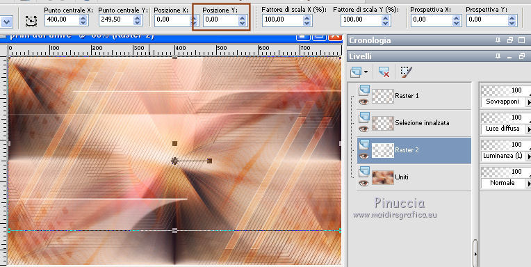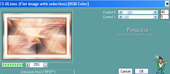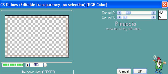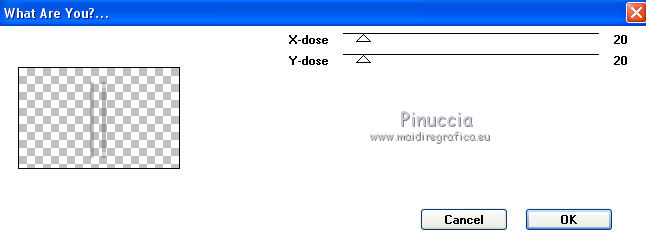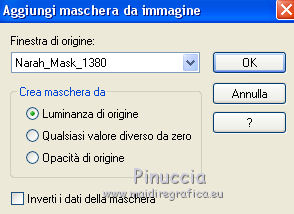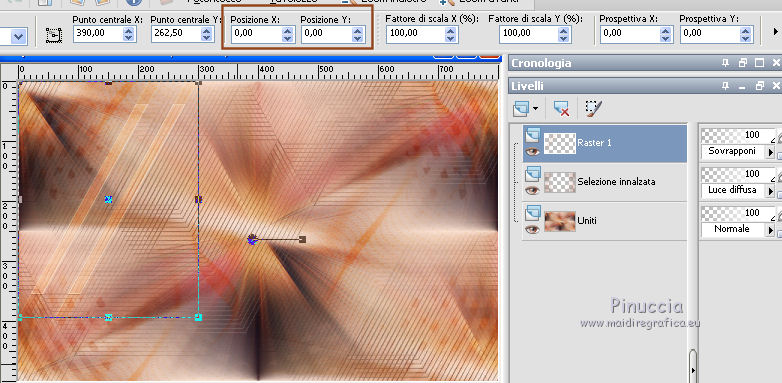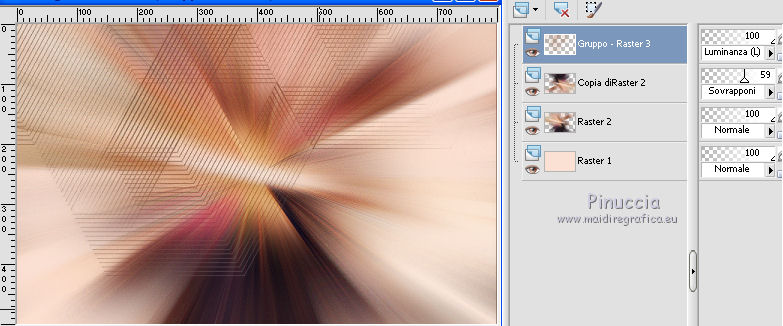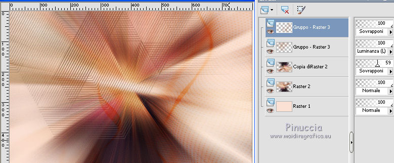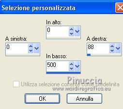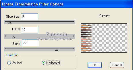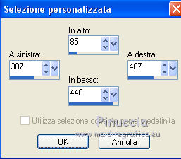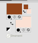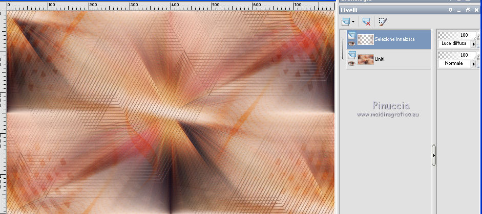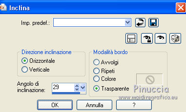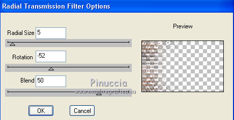 qui puoi trovare qualche risposta ai tuoi dubbi. Se l'argomento che ti interessa non è presente, ti prego di segnalarmelo. Questo tutorial è stato tradotto con PSPX, ma può essere realizzato anche con le altre versioni di PSP. Dalla versione X4, il comando Immagine>Rifletti è stato sostituito con Immagine>Capovolgi in orizzontale, e il comando Immagine>Capovolgi con Immagine>Capovolgi in verticale. Nelle versioni X5 e X6, le funzioni sono state migliorate rendendo disponibile il menu Oggetti. Con la nuova versione X7, sono tornati Rifletti>Capovolgi, ma con nuove varianti. Vedi la scheda sull'argomento qui Le vostre versioni Occorrente: Materiale qui Grazie: per il tube dei fiori Maryse, per il wordart Kahlan e per la maschera Narah Il resto del materiale è di Colybrix. (in questa pagina trovi i links ai siti dei creatori di tubes) Filtri: se hai problemi con i filtri, consulta la mia sezione filtri qui Toadies - What are you qui DSB Flux - Linear Transmission, Radial Transmission qui Carolaine and Sensibility - CS-DLines qui Graphics Plus qui Filters Unlimited 2.0 qui I filtri Toadies e Graphics Plus si possono usare da soli o importati in Filters Unlimited (come fare vedi qui) Se un filtro fornito appare con questa icona ![]() non esitare a cambiare modalità di miscelatura e opacità secondo i colori utilizzati. Apri le maschere in PSP e minimizzale con il resto del materiale. 1. Imposta il colore di primo piano con il colore scuro #92451c, e il colore di sfondo con il colore chiaro #fbe1d3. ![]() Apri una nuova immagine trasparente 800 x 500 pixels e riempila con il colore chiaro di sfondo.2. Livelli>Nuovo livello raster. Selezione>Seleziona tutto. Apri il tube della donna, cancella il watermark, e vai a Modifica>Copia. Minimizza il tube. Torna al tuo lavoro e vai a Modifica>Incolla nella selezione. Selezione>Deseleziona. Regola>Sfocatura>Sfocatura radiale. ![]() 3. Effetti>Effetti di bordo>Aumenta - 2 volte. Livelli>Duplica. Immagine>Rifletti. Immagine>Capovolgi. Cambia la modalità di miscelatura di questo livello in Sovrapponi, e abbassa l'opacità al 59%. 4. Livelli>Nuovo livello raster. Riempi il livello con il colore scuro di primo piano.Livelli>Nuovo livello maschera>Da immagine. Apri il menu sotto la finestra di origine e vedrai la lista dei files aperti. Seleziona la maschera Narah_Mask_1397 ![]() Effetti>Effetti di bordo>Aumenta Livelli>Unisci>Unisci gruppo. Cambia la modalità di miscelatura di questo livello in Luminanza (esistente). ![]() 5. Livelli>Nuovo livello raster. Riempi il livello con il colore scuro di primo piano.Livelli>Nuovo livello maschera>Da immagine. Apri il menu sotto la finestra di origine e seleziona la maschera Narah_Narah_1380 ![]() Livelli>Unisci>Unisci gruppo. Cambia la modalità di miscelatura di questo livello in Sovrapponi (o secondo i tuoi colori). (nella mia seconda versione ho messo Filtra). ![]() 6. Livelli>Unisci>Unisci visibile. 7. Effetti>Effetti di immagine>Motivo unico. ![]() 8. Attiva lo strumento Selezione ![]() (non importa il tipo di selezione impostato, perchè con la selezione personalizzata si ottiene sempre un rettangolo) clicca sull'icona Selezione personalizzata ![]() e imposta i seguenti settaggi. ![]() Selezione>Innalza selezione a livello. Selezione>Deseleziona. 9. Effetti>Plugins>DSB Flux - Linear Transmission. ![]() 10. Effetti>Plugins>Toadies - What are you ![]() 11. Effetti>Plugins>DSB Flux - Radial Transmission. Per applicare il settaggio con il segno negativo, dovrai usare il cursore, poi, se necessario, per correggere il settaggio, puoi usare la tastiera. ![]() 12. Livelli>Duplica. Immagine>Rifletti. Livelli>Unisci>Unisci giù. Cambia la modalità di miscelatura di questo livello in Luce diffusa. ![]() (se è poco visibile con i tuoi colori, duplica e abbassa l'opacità al 30%, - come ho fatto nella mia seconda versione). 13. Livelli>Nuovo livello raster. Selezione personalizzata ![]() ![]() Riempi la selezione con il colore chiaro.Selezione>Deseleziona. 14. Imposta il colore di sfondo con il colore scuro: il risultato cambia del filtro cambia secondo il colore impostato come colore di sfondo. Effetti>Plugins>Toadies - What are you, con i settaggi standard. ![]() Effetti>Effetti di bordo>Aumenta. 15. Effetti>Effetti geometrici>Inclina. ![]() Cambia la modalità di miscelatura di questo livello in Sovrapponi. 16. Tasto K sulla tastiera per attivare lo strumento Puntatore ![]() e imposta Posizione X e Posizione Y a 0 ![]() Livelli>Duplica. Immagine>Capovolgi. Immagine>Rifletti. Livelli>Unisci>Unisci giù. 17. Attiva il livello di sfondo, Uniti. Apri il tube déco 1 e vai a Modifica>Copia. Torna al tuo lavoro e vai a Modifica>Incolla come nuovo livello. Il tube è impostato in modalità Luminanza (esistente) Oggetti>Allinea>Superiore, o usa lo strumento Spostamento ![]() o, con lo strumento Puntatore ![]() imposta Posizione Y a 0. ![]() 18. Attiva il livello superiore, Raster 1. Apri déco 2 e vai a Modifica>Copia. Torna al tuo lavoro e vai a Modifica>Incolla come nuovo livello. Strumento Puntatore ![]() e imposta Posizione X: 20,00 e Posizione Y: 62,00 ![]() 19. Effetti>Effetti 3D>Sfalsa ombra, colore scuro. ![]() 20. Attiva il livello inferiore. Modifica>Copia. 21. Livelli>Unisci>Unisci visibile. 22. Livelli>Nuovo livello raster. Selezione>Seleziona tutto. Effetti>Effetti 3D>Ritaglio. ![]() Selezione>Deseleziona. 23. Immagine>Aggiungi bordatura, 2 pixels, simmetriche, colore scuro. Immagine>Aggiungi bordatura, 3 pixels, simmetriche, colore chiaro. Immagine>Aggiungi bordatura, 2 pixels, simmetriche, colore scuro. Selezione>Seleziona tutto. 24. Immagine>Aggiungi bordatura, 30 pixels, simmetriche, colore bianco. Effetti>Effetti 3D>Sfalsa ombra, colore scuro, ombra su nuovo livello selezionato. ![]() Selezione>Deseleziona. 25. Sposta il livello dell'ombra sopra il livello Raster 1. ![]() 26. Su questo livello: Effetti>Plugins>Carolaine and Sensibility - CS-DLines, con i settaggi standard. ![]() Immagine>Rifletti. Eff