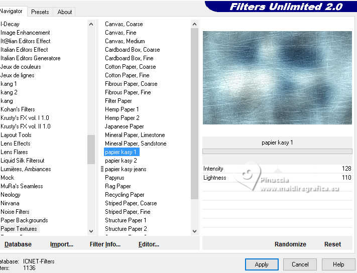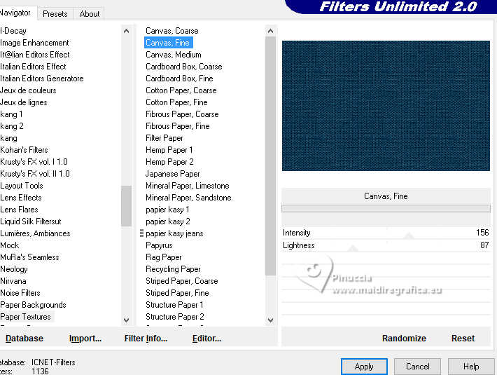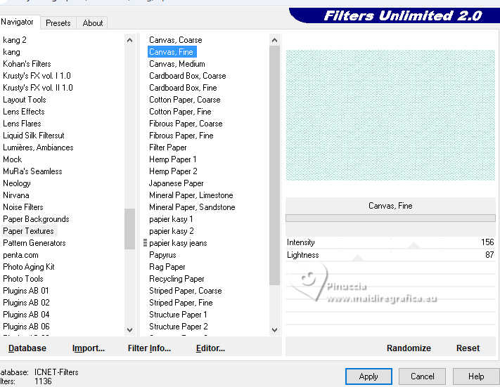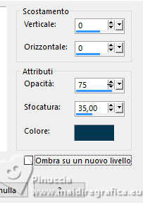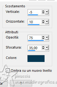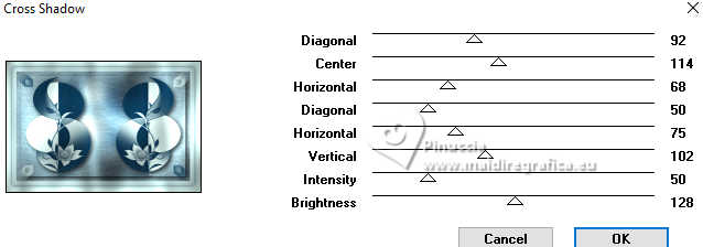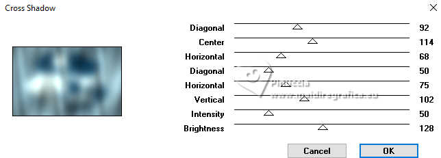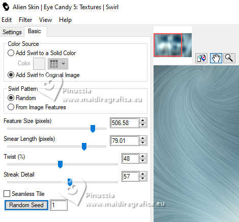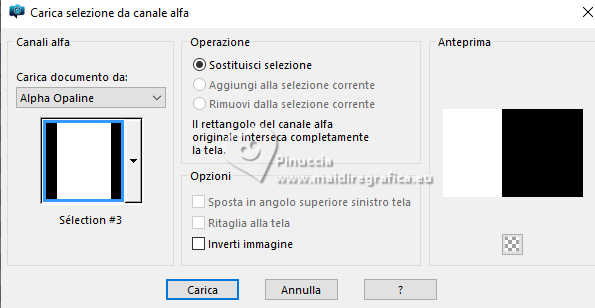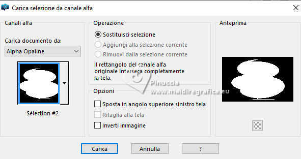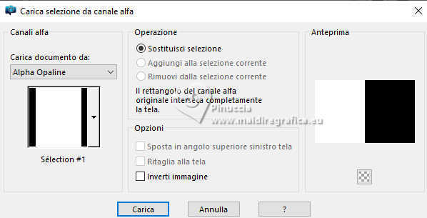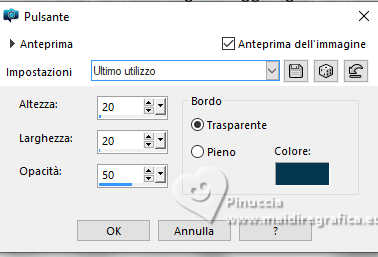 qui puoi trovare qualche risposta ai tuoi dubbi. Se l'argomento che ti interessa non è presente, ti prego di segnalarmelo. Questo tutorial è stato tradotto con PSPX9 e PSP2020, ma può essere realizzato con le versioni più antiche. Dalla versione X4, il comando Immagine>Rifletti è stato sostituito con Immagine>Capovolgi in orizzontale, e il comando Immagine>Capovolgi con Immagine>Capovolgi in verticale. Nelle versioni X5 e X6, le funzioni sono state migliorate rendendo disponibile il menu Oggetti. Con la nuova versione X7, sono tornati Rifletti>Capovolgi, ma con nuove varianti. Vedi la scheda sull'argomento qui Traduzione inglese qui Le vostre versioni qui![]() Occorrente: ![]() (in questa pagina trovi i links ai siti dei creatori di tubes) Filtri: in caso di dubbi, ricorda di consultare la mia sezione filtri qui Filters Unlimited 2.0 qui Graphics Plus - Cross Shadow qui Alien Skin Eye Candy 5 Textures - Swirl qui I filtri Graphics Plus si possono usare da soli o importati in Filters Unlimited (come fare vedi qui) Se un filtro fornito appare con questa icona ![]() non esitare a cambiare modalità di miscelatura e opacità secondo i colori utilizzati. ![]() Apri la maschera in PSP e minimizzala con il resto del materiale. Imposta il colore di primo piano con #dbf5ef, e il colore di sfondo con #093852. ![]() 1. Apri Alpha Opaline Finestra>Duplica o sulla tastiera maiuscola+D per fare una copia. ![]() Chiudi l'originale. La copia, che sarà la base del tuo lavoro, non è vuota, ma contiene le selezioni salvate sul canale alfa. Riempi l'immagine trasparente con il colore di primo piano.Effetti>Plugins>Filters Unlimited 2.0 - Paper Textures - Canvas,Fine, con i settaggi standard. ![]() Livelli>Nuovo livello raster. Riempi il livello con il colore di sfondo.Effetti>Plugins>Filters Unlimited 2.0 - Paper Textures - Canvas,Fine, con i settaggi standard. ![]() 2. Livelli>Nuovo livello maschera>Da immagine. Apri il menu sotto la finestra di origine e vedrai la lista dei files aperti. Seleziona la maschera Masque tuto ![]() Effetti>Effetti di bordo>Aumenta. Livelli>Unisci>Unisci gruppo. Livelli>Unisci>Unisci giù. 3. Livelli>Nuovo livello raster. Riempi il livello con il colore di sfondo.Effetti>Plugins>Filters Unlimited 2.0 - Paper Textures - Canvas,Fine, con i settaggi standard. ![]() Livelli>Nuovo livello raster. Riempi il livello con il colore di primo piano.Effetti>Plugins>Filters Unlimited 2.0 - Paper Textures - Canvas,Fine, con i settaggi standard. ![]() 4. Livelli>Nuovo livello maschera>Da immagine. Apri il menu sotto la finestra di origine e seleziona nuovamente la maschera Masque tuto ![]() Effetti>Effetti di bordo>Aumenta. Livelli>Unisci>Unisci gruppo. Livelli>Unisci>Unisci giù. 5. Selezione>Carica/Salva selezione>Carica selezione da canale alfa. La selezione sélection#1 è subito disponibile. Devi soltanto cliccare Carica. ![]() Premi sulla tastiera il tasto CANC ![]() ![]() Livelli>Unisci>Unisci giù. 6. Selezione>Carica/Salva selezione>Carica selezione da canale alfa. Apri il menu delle selezioni e carica la selezione sélection 2 ![]() La nuova selezione sostituirà la precedente. Modifica>Copia Livelli>Nuovo livello raster. Selezione>Carica/Salva selezione>Carica selezione da canale alfa. Apri il menu delle selezioni e carica la selezione sélection 3 ![]() 7. Modifica>Incolla nella selezione Selezione>Deseleziona. Livelli>Duplica. 8. Immagine>Rifletti>Rifletti orizzontalmente. Livelli>Unisci>Unisci giù. Immagine>Ridimensiona, al 90%, tutti i livelli non selezionato. Effetti>Effetti 3D>Sfalsa ombra, colore nero. ![]() 9. Attiva il livello Raster 1. Regola>Sfocatura>Sfocatura gaussiana - raggio 40. ![]() Effetti>Plugins>Graphics Plus - Cross Shadow. ![]() 10. Effetti>Plugins>Alien Skin Eye Candy 5 Textures - Swirl. ![]() 11. Effetti>Plugins>Filters Unlimited 2.0 - Paper Textures - Papier kasy 1, con i settaggi standard. ![]() se non trovi l'effetto nel tuo Unlimited, l'ho aggiunto nel materiale Selezione>Seleziona tutto. Selezione>Modifica>Contrai - 25 pixels. Effetti>Effetti 3D>Sfalsa ombra, con i settaggi precedenti. Selezione>Deseleziona. 12. Apri il tube coin ![]() Modifica>Copia. Torna al tuo lavoro e vai a Modifica>Incolla come nuovo livello. Il tube è al suo posto. Se usi altri colori, cambia la modalità di miscelatura in Luminanza (esistente). 13. Immagine>Aggiungi bordatura, 1 pixel, simmetriche, colore scuro. Immagine>Aggiungi bordatura, 10 pixels, simmetriche, colore chiaro (o bianco). Immagine>Aggiungi bordatura, 1 pixel, simmetriche, colore scuro. Immagine>Aggiungi bordatura, 5 pixels, simmetriche, colore chiaro (o bianco). Immagine>Aggiungi bordatura, 1 pixel, simmetriche, colore scuro. Immagine>Aggiungi bordatura, 5 pixels, simmetriche, colore chiaro (o bianco). Immagine>Aggiungi bordatura, 1 pixel, simmetriche, colore scuro. 14. Selezione>Seleziona tutto. Immagine>Aggiungi bordatura, 30 pixels, simmetriche, colore chiaro (o bianco). Effetti>Effetti 3D>Sfalsa ombra, colore di sfondo. ![]() Selezione>Deseleziona. 15. Selezione>Seleziona tutto. Selezione>Modifica>Contrai - 54 pixels. Selezione>Inverti. 16. Effetti>Plugins>Graphics Plus - Cross Shadow, con i settaggi precedenti. ![]() 17. Effetti>Effetti 3D>Pulsante - colore scuro. ![]() Selezione>Deseleziona. 18. Apri il tube della donna femme1065-coly ![]() Cancella il watermark e vai a Modifica>Copia. Torna al tuo lavoro e vai a Modifica>Incolla come nuovo livello. Immagine>Ridimensiona, al'88%, tutti i livelli non selezionato. Posiziona correttamente il tube nel quadro.Effetti>Effetti 3D>Sfalsa ombra, a scelta; per il mio esempio, con il colore di sfondo. ![]() Firma il tuo lavoro. 19. Immagine>Aggiungi bordatura, 1 pixel, simmetriche, colore scuro. Immagine>Ridimensiona, 950 pixels di larghezza, tutti i livelli selezionato. Regola>Messa a fuoco>Metti a fuoco. Salva in formato jpg. Per il tube di questo esempio grazie Colybrix ![]() ![]() ![]() Puoi scrivermi se hai problemi o dubbi, o trovi un link che non fu