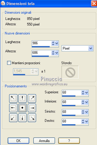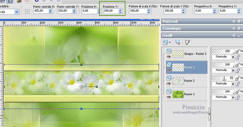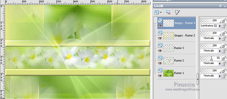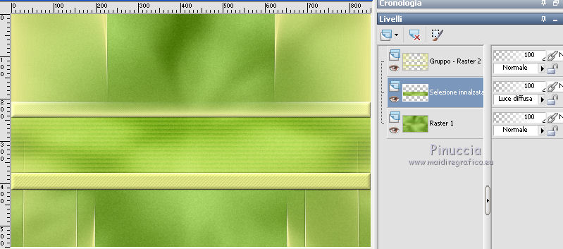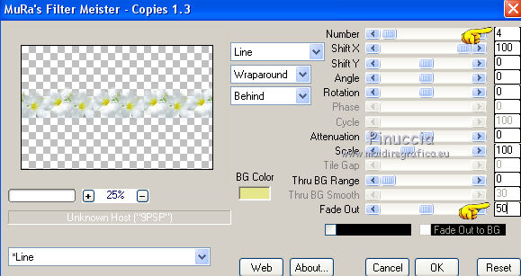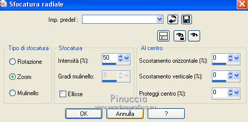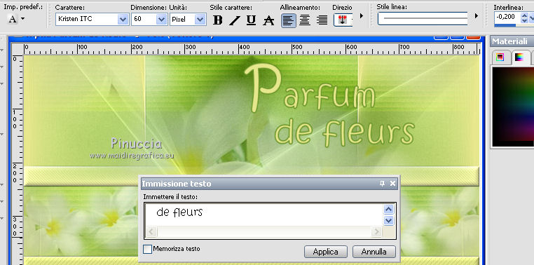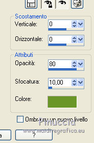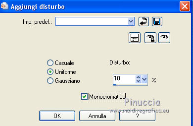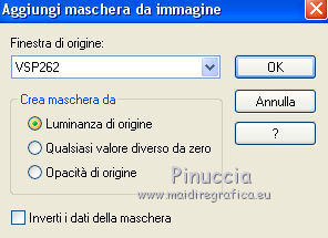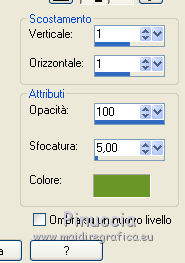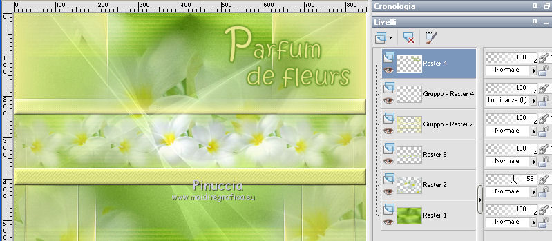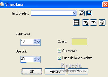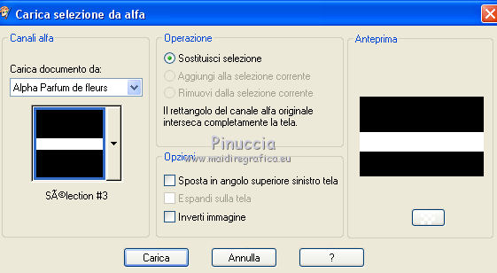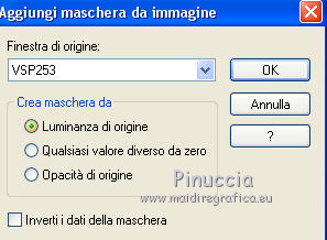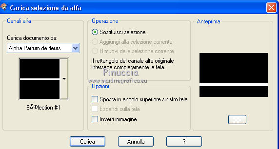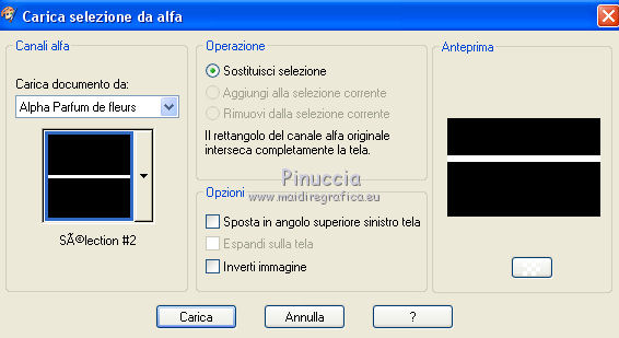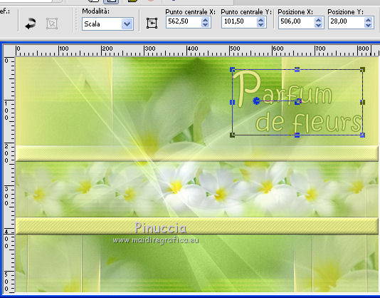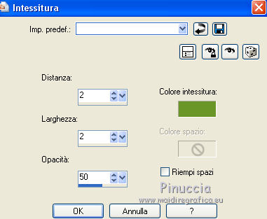qui puoi trovare qualche risposta ai tuoi dubbi. Se l'argomento che ti interessa non è presente, ti prego di segnalarmelo. Questo tutorial è stato tradotto con PSPX, ma può essere realizzato anche con le altre versioni di PSP. Dalla versione X4, il comando Immagine>Rifletti è stato sostituito con Immagine>Capovolgi in orizzontale, e il comando Immagine>Capovolgi con Immagine>Capovolgi in verticale. Nelle versioni X5 e X6, le funzioni sono state migliorate rendendo disponibile il menu Oggetti. Con la nuova versione X7, sono tornati Rifletti>Capovolgi, ma con nuove varianti. Vedi la scheda sull'argomento qui Le vostre versioni Occorrente: Materiale qui Per la maschera grazie Valy. Il resto del materiale è di Colybrix (in questa pagina trovi i links ai siti dei creatori di tubes) Filtri: se hai problemi con i filtri, consulta la mia sezione filtri qui Graphics Plus - Cross Shadow qui Carolaine and Sensibility - CS-DLines qui Mura's Meister - Copies qui Filters Unlimited 2.0 qui I filtri Graphics Plus si possono usare da soli o importati in Filters Unlimited (come fare vedi qui) Se un filtro fornito appare con questa icona ![]() non esitare a cambiare modalità di miscelatura e opacità secondo i colori utilizzati. Apri il font e minimizzalo. Lo troverai nella lista dei font disponibili quando ti servirà. Con i nuovi sistemi operativi questo non è più possibile. Per usare un font, occorre copiarlo nella cartella Font di Windows. Apri le maschere in PSP e minimizzale con il resto del materiale. 1. Imposta il colore di primo piano con #6a9628, e il colore di sfondo con #e6e68c. ![]() 2. Apri Alpha_Parfum de fleurs. Finestra>Duplica, o sulla tastiera maiuscola+D per fare una copia. Chiudi l'originale. La copia, che sarà la base del tuo lavoro, non è vuota ma contiene le selezioni salvate sul canale alfa. Riempi l'immagine trasparente con il colore scuro.3. Livelli>Nuovo livello raster. Selezione>Seleziona tutto. Apri il tube femme et fleurs, cancella la firma e vai a Modifica>Copia. Minimizza il tube. Torna al tuo lavoro e vai a Modifica>Incolla nella selezione. Selezione>Deseleziona. 4. Effetti>Effetti di immagine>Motivo unico, con i settaggi standard. ![]() 5. Regola>Sfocatura>Sfocatura radiale. ![]() 6. Effetti>Effetti di bordo>Aumenta - 2 volte. Cambia la modalità di miscelatura di questo livello in Luminanza (esistente) e abbassa l'opacità al 57%. Livelli>Unisci>Unisci giù. 7. Regola>Sfocatura>Sfocatura gaussiana - raggio 10. ![]() 8. Regola>Aggiungi/Rimuovi disturbo>Aggiungi disturbo. ![]() 9. Livelli>Nuovo livello raster. Riempi con il colore chiaro.Livelli>Nuovo livello maschera>Da immagine. Apri il menu sotto la finestra di origine e vedrai la lista dei files aperti. Seleziona la maschera VSP 262. ![]() Livelli>Duplica. Livelli>Unisci>Unisci gruppo. 10. Livelli>Duplica. Immagine>Rifletti. Livelli>Unisci>Unisci giù. Effetti>Effetti di bordo>Aumenta. 11. Selezione>Carica/Salva selezione>Carica selezione da canale alfa. La selezione #1 è subito disponibile. Devi soltanto cliccare Carica. ![]() 12. Effetti>Effetti di trama>Intessitura, colore scuro. ![]() 13. Effetti>Effetti 3D>Smusso a incasso. ![]() Selezione>Deseleziona. 14. Selezione>Carica/Salva selezione>Carica selezione da canale alfa. Apri il menu delle selezioni e carica la selezione #2. ![]() 15. Effetti>Plugins>Carolaine and Sensibility - CS-DLines, con i settaggi standard. ![]() 16. Effetti>Effetti 3D>Smusso a incasso, con i settaggi precedenti. Selezione>Deseleziona. 17. Attiva il livello inferiore, Raster 1. Selezione>Carica/Salva selezione>Carica selezione da canale alfa. Apri il menu delle selezioni e carica la selezione #3. ![]() Effetti>Effetti di trama>Veneziana, colore chiaro. ![]() 18. Selezione>Innalza selezione a livello. Selezione>Deseleziona. Cambia la modalità di miscelatura di questo livello in Luce diffusa, o altro. ![]() Livelli>Unisci>Unisci giù. 19. Effetti>Effetti di immagine>Motivo unico, con i settaggi standard. ![]() 20. Apri il tube fleur 70 mist, cancella la firma e vai a Modifica>Copia. Minimizza il tube. Torna al tuo lavoro e vai a Modifica>Incolla come nuovo livello. Immagine>Ridimensiona, al 125%, tutti i livelli non selezionato. 21. Effetti>Effetti di immagine>Motivo unico, con i settaggi standard. Abbassa l'opacità di questo livello al 55%. 22. Attiva il livello superiore. Modifica>Incolla come nuovo livello (il tube è sempre in memoria). Immagine>Ridimensiona, al 50%, tutti i livelli non selezionato. Se stai usando un altro tube, adatta la percentuale al tuo tube, in modo che abbia pressappoco l'altezza dello spazio tra le due maschere. 23. Effetti>Plugins>Mura's Meister - Copies. ![]() 24. Tasto K per attivare lo strumento Puntatore ![]() e imposta Posizione Y a 208,00 e mantieni Posizione X a 0,00 Livelli>Disponi>Sposta giù. ![]() 25. Attiva il livello superiore. Imposta il colore di primo piano con il colore bianco. Livelli>Nuovo livello raster. Riempi il livello con il colore bianco.Livelli>Nuovo livello maschera>Da immagine. Apri il menu sotto la finestra di origine e seleziona la maschera VSP253. ![]() Effetti>Effetti di bordo>Aumenta. Livelli>Unisci>Unisci gruppo. 26. Selezione>Carica/Salva selezione>Carica selezione da canale alfa. Carica nuovamente la selezione #1. ![]() Premi sulla tastiera il tasto CANC ![]() Selezione>Deseleziona. Cambia la modalità di miscelatura di questo livello in Luminanza (esistente). ![]() 27. Imposta nuovamente il colore di primo piano con il colore scuro. Attiva lo strumento Testo , font Kristen ITC![]() Scrivi la lettera P Cambia la dimensione a 60 pixels, interlinea -0,200, e scrivi il resto del testo. ![]() Livelli>Converti in livello raster. se hai problemi, puoi scrivere il testo su due livelli separati, e poi posizionare a tuo piacimento.Livelli>Unisci>Unisci giù (se hai scritto il testo su più livelli). 29. Immagine>Ridimensiona, al 95%, tutti i livelli non selezionato. Tasto K per attivare lo strumento Puntatore ![]() e imposta 