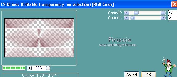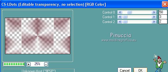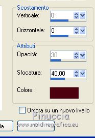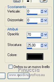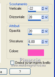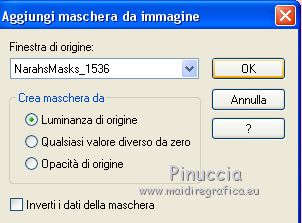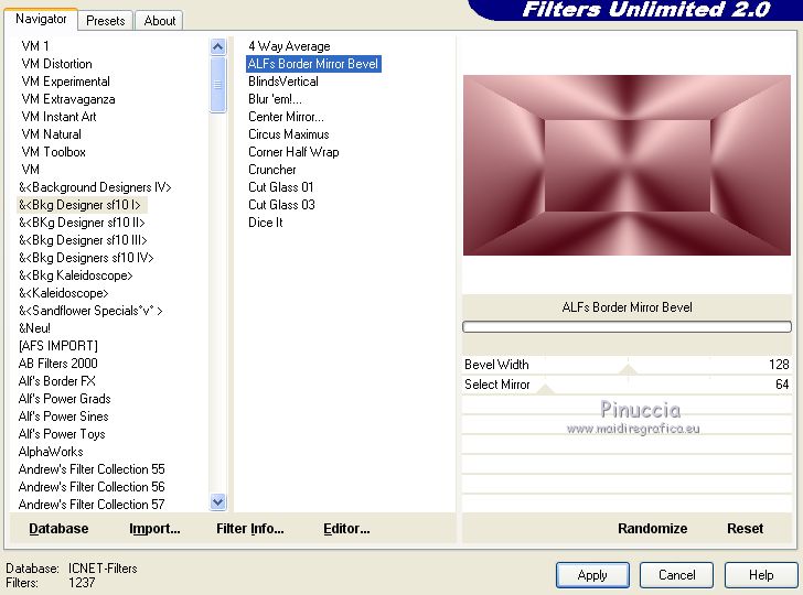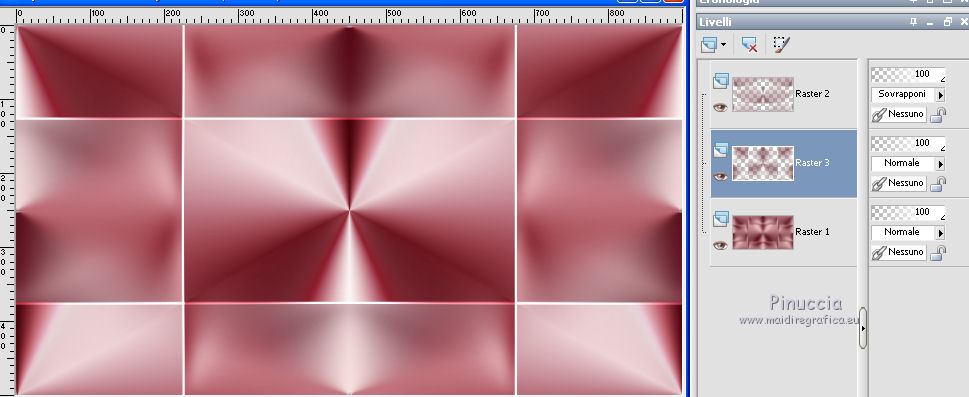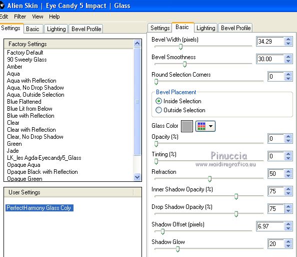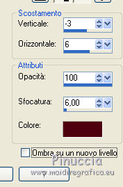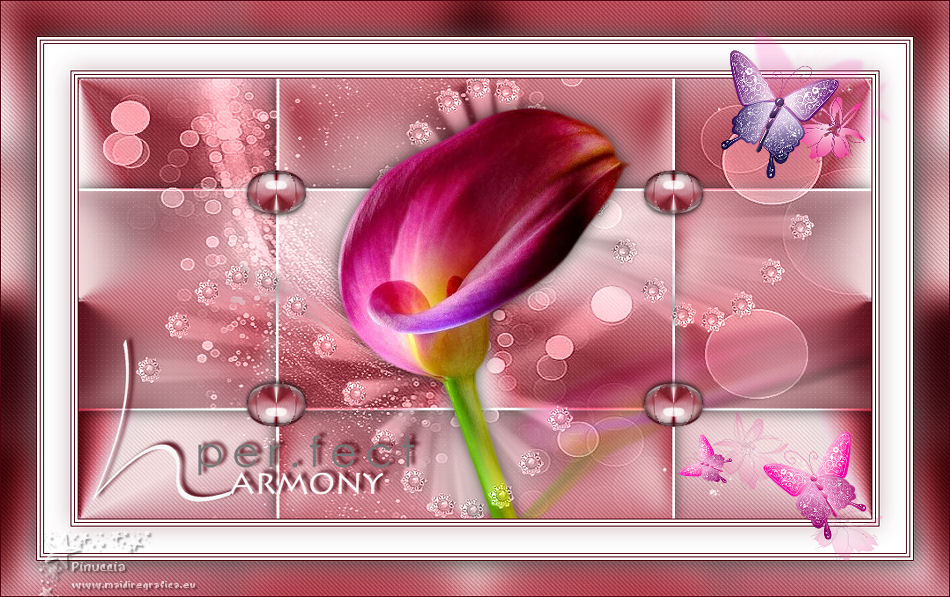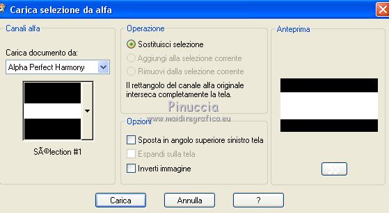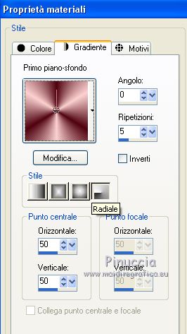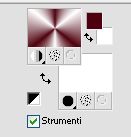 qui puoi trovare qualche risposta ai tuoi dubbi. Se l'argomento che ti interessa non è presente, ti prego di segnalarmelo. Questo tutorial è stato tradotto con PSPX, ma può essere realizzato anche con le altre versioni di PSP. Dalla versione X4, il comando Immagine>Rifletti è stato sostituito con Immagine>Capovolgi in orizzontale, e il comando Immagine>Capovolgi con Immagine>Capovolgi in verticale. Nelle versioni X5 e X6, le funzioni sono state migliorate rendendo disponibile il menu Oggetti. Con la nuova versione X7, sono tornati Rifletti>Capovolgi, ma con nuove varianti. Vedi la scheda sull'argomento qui Le vostre versioniOccorrente: Materiale qui (in questa pagina trovi i links ai siti dei creatori di tubes) Filtri: se hai problemi con i filtri, consulta la mia sezione filtri qui Filters Unlimited 2.0 qui &<Bkg Designer sf10I> - ALF's Border Mirror Bevel(da importare in Unlimited) qui Simple - Top Left Mirror qui Carolaine and Sensibility - CS-LDots, CS-DLines qui Alien Skin Eye Candy 5 Impact - Glass, Perspective Shadow qui I filtri Simple si possono usare da soli o importati in Filters Unlimited (come fare vedi qui) Se un filtro fornito appare con questa icona ![]() non esitare a cambiare modalità di miscelatura e opacità secondo i colori utilizzati. Nelle ultime versioni di PSP non c'è il gradiente di primo piano/sfondo (Corel_06_029) Puoi usare i gradienti delle versioni precedenti. Trovi qui i gradienti Corel X. Metti i preset Cliccando sul file una o due volte (a seconda delle tue impostazioni), automaticamente il preset si installerà nella cartella corretta. perchè uno o due clic vedi qui Apri la maschera in PSP e minimizzala con il resto del materiale. 1. Imposta il colore di primo piano con #4f0310, e il colore di sfondo con #fcd1d0. ![]() Passa il colore di primo piano a Gradiente di primo piano/sfondo, stile Radiale. ![]() 2. Apri Alpha_Perfectharmony. Finestra>Duplica o sulla tastiera maiuscola+D per fare una copia. ![]() Chiudi l'originale. La copia, che sarà la base del tuo lavoro, non è vuota, ma contiene le selezioni salvate sul canale alfa. Riempi l'immagine trasparente con il gradiente.3. Regola>Sfocatura>Sfocatura gaussiana - raggio 15. ![]() Livelli>Duplica. Effetti>Plugins>Filters Unlimited 2.0 - &<Bkg Designer sf10I> - Alf's Border Mirror Bevel, con i settaggi standard. ![]() 4. Effetti>Effetti di immagine>Motivo unico, con i settaggi standard. ![]() Abbassa l'opacità di questo livello all'85%. Livelli>Unisci>Unisci giù. 5. Selezione>Carica/Salva selezione>Carica selezione da canale alfa. La selezione #1 è subito disponibile. Devi soltanto cliccare Carica. ![]() Imposta il colore di sfondo con il colore bianco. Livelli>Nuovo livello raster. Riempi la selezione con il colore bianco.Selezione>Modifica>Contrai - 3 pixels. Premi sulla tastiera il tasto CANC ![]() 6. Abbassa l'opacità dello strumento Riempimento al 50%. Conserva il gradiente che si è formato quando hai impostato il colore di sfondo con il colore bianco. ![]() Riempi la selezione con il gradiente.Selezione>Deseleziona. 7. Effetti>Effetti di immagine>Motivo unico, con i settaggi standard. Cambia la modalità di miscelatura di questo livello in Sovrapponi. 8. Selezione>Carica/Salva selezione>Carica selezione da canale alfa. Apri il menu delle selezioni e carica la selezione #2. ![]() Riporta l'opacità dello strumento Riempimento a 100. Livelli>Nuovo livello raster. Riempi la selezione con il colore bianco.Selezione>Modifica>Contrai - 3 pixels. Premi sulla tastiera il tasto CANC. Imposta ancora l'opacità dello strumento riempimento al 50%, e riempi la selezione con il gradiente.Selezione>Deseleziona. 9. Effetti>Effetti di immagine>Motivo unico, con i settaggi standard. ![]() Livelli>Disponi>Sposta giù. ![]() Riporta l'opacità dello strumento Riempimento a 100. 10. Rimani posizionato sul livello centrale, Raster 3. Effetti>Plugins>Carolaine and Sensibility - CS-LDots, con i settaggi standard. ![]() 11. Attiva il livello superiore, Raster 2. Effetti>Plugins>Carolaine and Sensibility - CS-DLines, con i settaggi standard. ![]() Livelli>Unisci>Unisci visibile. 12. Selezione>Carica/Salva selezione>Carica selezione da canale alfa. Carica nuovamente la selezione #1. ![]() Effetti>Effetti 3D>Sfalsa ombra, colore nero. ![]() 13. Selezione>Carica/Salva selezione>Carica selezione da canale alfa. Carica nuovamente la selezione #2. ![]() Effetti>Effetti 3D>Sfalsa ombra, con i settaggi precedenti. Selezione>Deseleziona. 14. Livelli>Nuovo livello raster. Riempi la selezione con il colore bianco, (opacità 100).Livelli>Nuovo livello maschera>Da immagine. Apri il menu sotto la finestra di origine e vedrai la lista dei files aperti. Seleziona la maschera NarahsMasks_1536. ![]() Effetti>Effetti di bordo>Aumenta. Livelli>Unisci>Unisci gruppo. Cambia la modalità di miscelatura di questo livello in Luminanza (esistente) e abbassa l'opacità al 75%. 15. Apri il tube fleur, cancella la firma e vai a Modifica>Copia. Torna al tuo lavoro e vai a Modifica>Incolla come nuovo livello. Immagine>Rifletti. Immagine>Ridimensiona, al 70%, tutti i livelli non selezionato. 16. Tasto K sulla tastiera per attivare lo strumento Puntatore ![]() e imposta Posizione X: 293,00 e Posizione Y: 33,00. ![]() Effetti>Effetti 3D>Sfalsa ombra, con i settaggi precedenti. 17. Effetti>Plugins>Alien Skin Eye Candy 5 Impact - Perspective Shadow. Seleziona il preset Perfectharmony-coly e ok. Questi i settaggi, in caso di problemi con il preset. ![]() 18. Apri il tube Déco 1 e vai a Modifica>Copia. Torna al tuo lavoro e vai a Modifica>Incolla come nuovo livello. per la seconda versione ho modificato il colore con lo strumento Trasforma in destinazione ![]() Strumento Puntatore ![]() e imposta Posizione X: 64,00 e Posizione Y: 205,00 ![]() Cambia la modalità di miscelatura di questo livello in Luminanza (esistente). Regola>Messa a fuoco>Metti a fuoco. 19. Livelli>Duplica. Immagine>Rifletti. Immagine>Capovolgi. Livelli>Disponi>Sposta giù - 2