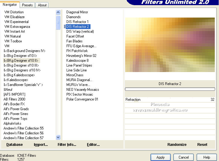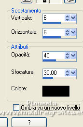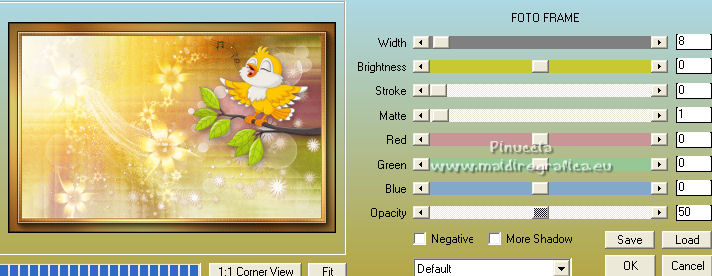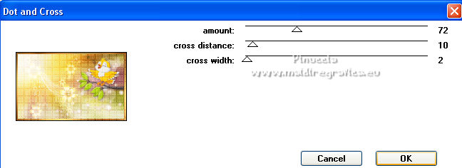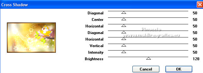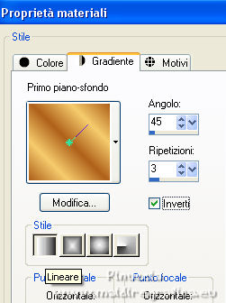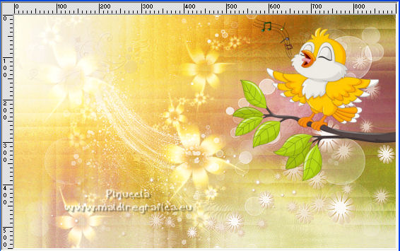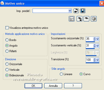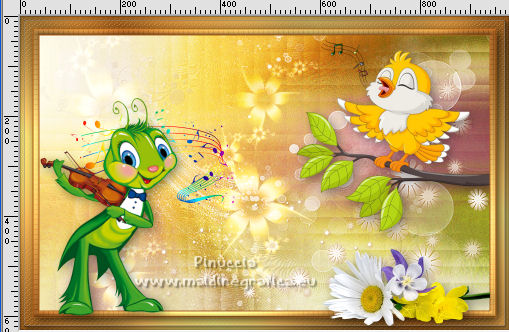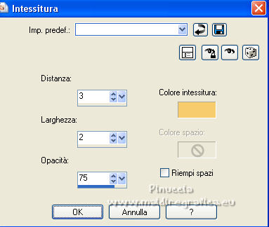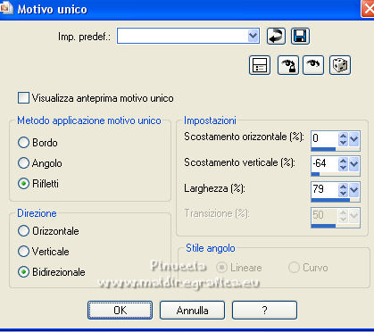 qui puoi trovare qualche risposta ai tuoi dubbi. Se l'argomento che ti interessa non è presente, ti prego di segnalarmelo. Questo tutorial è stato tradotto con PSPX, ma può essere realizzato anche con le altre versioni di PSP. Dalla versione X4, il comando Immagine>Rifletti è stato sostituito con Immagine>Capovolgi in orizzontale, e il comando Immagine>Capovolgi con Immagine>Capovolgi in verticale. Nelle versioni X5 e X6, le funzioni sono state migliorate rendendo disponibile il menu Oggetti. Con la nuova versione X7, sono tornati Rifletti>Capovolgi, ma con nuove varianti. Vedi la scheda sull'argomento qui Occorrente: Materiale qui Per le maschere grazie Narah. Il resto del materiale è di Colybrix (in questa pagina trovi i links ai siti dei creatori di tubes) Filtri: se hai problemi con i filtri, consulta la mia sezione filtri qui Filters Unlimited 2.0 qui &<Bkg Designer sf10II> - DIS Refractor 2 (da importare in Unlimited) qui Graphics Plus - Cross Shadow qui Penta.com - Dot and Cross qui AAA Frames - Foto Frame qui I filtri Graphics Plus e Penta.com si possono usare da soli o importati in Filters Unlimited (come fare vedi qui) Se un filtro fornito appare con questa icona ![]() non esitare a cambiare modalità di miscelatura e opacità secondo i colori utilizzati. ![]() Nelle ultime versioni di PSP non c'è il gradiente di primo piano/sfondo (Corel_06_029) Puoi usare i gradienti delle versioni precedenti. Trovi qui i gradienti Corel X. Apri le maschere in PSP e minimizzale con il resto del materiale. Imposta il colore di primo piano con #ffffff, e il colore di sfondo con #af601b. ![]() 1. Apri una nuova immagine trasparente 900 x 550 pixels. Selezione>Seleziona tutto. Apri l'immagine Printemps (o una vostra immagine) e vai a Modifica>Copia. Torna al tuo lavoro e vai a Modifica>Incolla nella selezione. Selezione>Deseleziona. 2. Regola>Sfocatura>Sfocatura gaussiana - raggio 20. ![]() Regola>Sfocatura>Sfocatura radiale. ![]() Effetti>Effetti di bordo>Aumenta - 2 volte. 3. Effetti>Plugins>Filters Unlimited 2.0 - &<Bkg Designer sf10II> - DIS Refractor 2, con i settaggi standard. ![]() Livelli>Duplica. Cambia la modalità di miscelatura di questo livello in Sovrapponi, e abbassa l'opacità al 75%, o secondo la tua immagine. Livelli>Unisci>Unisci giù. 4. Livelli>Nuovo livello raster. Riempi il livello con il colore bianco.Livelli>Nuovo livello maschera>Da immagine. Apri il menu sotto la finestra di origine e vedrai la lista dei files aperti. Seleziona la maschera NarahsMasks_1536. ![]() Effetti>Effetti di bordo>Aumenta. Livelli>Unisci>Unisci gruppo. 5. Effetti>Effetti di immagine>Motivo unico. ![]() 6. Livelli>Nuovo livello raster. Riempi il livello con il colore bianco.Livelli>Nuovo livello maschera>Da immagine. Apri il menu sotto la finestra di origine e seleziona la maschera NarahsMasks_1240. ![]() Effetti>Effetti di bordo>Aumenta. Livelli>Unisci>Unisci gruppo. 7. Livelli>Duplica. Livelli>Unisci>Unisci giù. Effetti>Effetti 3D>Sfalsa ombra, colore di sfondo #af601b. ![]() 8. Apri l'immagine con lo sfondo nero "image fleurs", e vai a Modifica>Copia. Torna al tuo lavoro e vai a Modifica>Incolla come nuovo livello. Immagine>Ridimensiona, al 60%, tutti i livelli non selezionato. Tasto K sulla tastiera per attivare lo strumento Puntatore ![]() e imposta Posizione X: 316,00 e Posizione Y: 43,00. ![]() Cambia la modalità di miscelatura di questo livello in Filtra. Effetti>Effetti di immagine>Motivo unico. ![]() 9. Apri il tube oiseau e vai a Modifica>Copia. Torna al tuo lavoro e vai a Modifica>Incolla come nuovo livello. Immagine>Ridimensiona, al 55%, tutti i livelli non selezionato. Spostalo in alto a destra.![]() Effetti>Effetti 3D>Sfalsa ombra, colore nero. ![]() 10. Imposta il colore di primo piano con il colore #f5cc6c. ![]() Passa il colore di primo piano a Gradiente di primo piano/sfondo, stile Lineare. ![]() 11. Immagine>Aggiungi bordatura, 2 pixels, simmetriche, colore di sfondo. Selezione>Seleziona tutto. Immagine>Aggiungi bordatura, 10 pixels, simmetriche, colore di sfondo. Selezione>Inverti. Riempi la selezione con il gradiente.Effetti>Plugins>Graphics Plus - Cross Shadow. ![]() 12. Effetti>Plugins>Penta.com - Dot and Cross, con i settaggi standard. ![]() Effetti>Effetti 3D>Smusso a incasso. ![]() Selezione>Deseleziona. 13. Immagine>Aggiungi bordatura, 2 pixels, simmetriche, colore di sfondo. Selezione>Seleziona tutto. Immagine>Aggiungi bordatura, 25 pixels, simmetriche, colore di sfondo. 14. Selezione>Inverti. Riempi la selezione con il gradiente.Effetti>Plugins>Graphics Plus - Cross Shadow, con i settaggi precedenti. Effetti>Effetti di trama>Intessitura. colore intessitura: colore di primo piano ![]() 15. Selezione>Inverti. Effetti>Effetti 3D>Sfalsa ombra. ![]() Selezione>Deseleziona. 16. Effetti>Plugins>AAA Frames - Foto Frame. ![]() 17. Apri il tube della cicala e vai a Modifica>Copia. Torna al tuo lavoro e vai a Modifica>Incolla come nuovo livello. Immagine>Rifletti. Immagine>Ridimensiona, al 60%, tutti i livelli non selezionato. Sposta il tube in basso a sinistra.Effetti>Effetti 3D>Sfalsa ombra, colore nero. ![]() 18. Apri il tube Fleurs e vai a Modifica>Copia. Torna al tuo lavoro e vai a Modifica>Incolla come nuovo livello. Immagine>Rifletti. Immagine>Ridimensiona, al 50%, tutti i livelli non selezionato. Sposta il tube in basso a destra.Effetti>Effetti 3D>Sfalsa ombra, con i settaggi precedenti. 19. Apri il tube note de musique, e vai a Modifica>Copia. Torna al tuo lavoro e vai a Modifica>Incolla come nuovo livello. Immagine>Ridimensiona, al 50%, tutti i livelli non selezionato. Sposta il livello sotto quello della cicala e posiziona il tube dietro la cicala, o dove preferisci.![]() Effetti>Effetti 3D>Sfalsa ombra, colore nero. ![]() 20. Scrivi il testo con il font fornito o con un font a scelta, o copia/incolla come nuovo livello il file di testo che trovi nel materiale. I miei settaggi per il testo: ![]() 21. Immagine>Ruota per gradi - 15 gradi a sinistra ![]() Sposta 