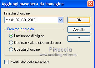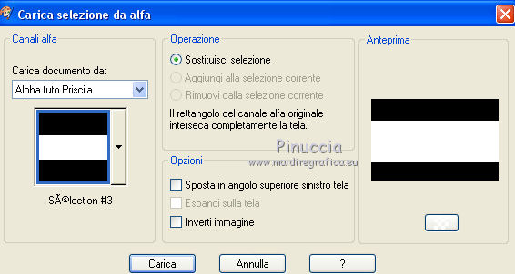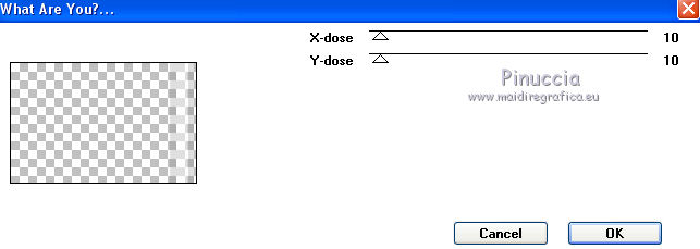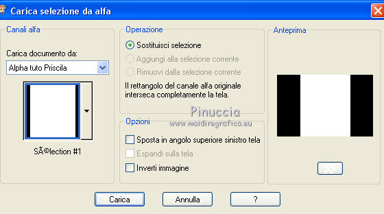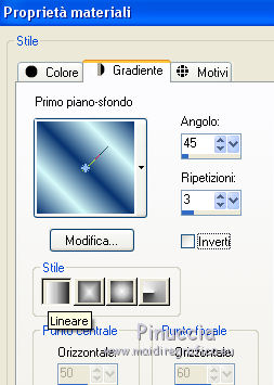 qui puoi trovare qualche risposta ai tuoi dubbi. Se l'argomento che ti interessa non è presente, ti prego di segnalarmelo. Questo tutorial è stato tradotto con PSPX, ma può essere realizzato anche con le altre versioni di PSP. Dalla versione X4, il comando Immagine>Rifletti è stato sostituito con Immagine>Capovolgi in orizzontale, e il comando Immagine>Capovolgi con Immagine>Capovolgi in verticale. Nelle versioni X5 e X6, le funzioni sono state migliorate rendendo disponibile il menu Oggetti. Con la nuova versione X7, sono tornati Rifletti>Capovolgi, ma con nuove varianti. Vedi la scheda sull'argomento qui Le vostre versioniOccorrente: Il tube della donna femme_749 di Lily non è fornito, ma puoi trovaro su questa pagina: http://ma-galerie-paintshop-pro.eklablog.com/femmes-bustes-c29256934 Il resto del materiale qui Il misted abstrait è di Tine. (in questa pagina trovi i links ai siti dei creatori di tubes) Filtri: se hai problemi con i filtri, consulta la mia sezione filtri qui Filters Unlimited 2.0 qui Toadies - What are you qui I filtri Toadies si possono usare da soli o importati in Filters Unlimited (come fare vedi qui) Se un filtro fornito appare con questa icona ![]() non esitare a cambiare modalità di miscelatura e opacità secondo i colori utilizzati. Nelle ultime versioni di PSP non c'è il gradiente di primo piano/sfondo (Corel_06_029) Puoi usare i gradienti delle versioni precedenti. Trovi qui i gradienti Corel X. Apri la maschera in PSP e minimizzala con il resto del materiale. 1. Imposta il colore di primo piano con il colore scuro #083370, e il colore di sfondo con il colore chiaro #d7fbfa. ![]() Passa il colore di primo piano a Gradiente di primo piano/sfondo, stile Lineare. ![]() 2. Apri Alpha_tuto_priscila. Finestra>Duplica o sulla tastiera maiuscola+D per fare una copia. ![]() Chiudi l'originale. La copia, che sarà la base del tuo lavoro, non è vuota, ma contiene le selezioni salvate sul canale alfa. Riempi l'immagine trasparente con il gradiente.Regola>Sfocatura>Sfocatura gaussiana - raggio 15. ![]() 3. Livelli>Duplica. Immagine>Rifletti. Cambia la modalità di miscelatura di questo livello in Moltiplica. Livelli>Unisci>Unisci giù. 4. Livelli>Nuovo livello raster. Selezione>Seleziona tutto. Apri il misted di Tine, cancella la firma, e vai a Modifica>Copia. Torna al tuo lavoro e vai a Modifica>Incolla nella selezione. Selezione>Deseleziona. 5. Effetti>Effetti di immagine>Motivo unico, con i settaggi standard. ![]() Regola>Sfocatura>Sfocatura gaussiana - raggio 30. ![]() 6. Regola>Aggiungi/Rimuovi disturbo>Aggiungi disturbo. ![]() 7. Livelli>Unisci>Unisci visibile. 8. Livelli>Duplica. Cambia la modalità di miscelatura di questo livello in Sovrapponi, e abbassa l'opacità al 50%. Livelli>Unisci>Unisci giù. 9. Effetti>Effetti di immagine>Motivo unico, Fianco a fianco. ![]() 10. Regola>Luminosità e contrasto>Luminosità e contrasto ![]() adatta in base ai tuoi colori; io volevo uno sfondo più scuro 11. Imposta il colore di sfondo con il colore bianco. Livelli>Nuovo livello raster. Riempi il livello con il colore bianco.Livelli>Nuovo livello maschera>Da immagine. Apri il menu sotto la finestra di origine e vedrai la lista dei files aperti. Seleziona la maschera Mask 07 GB 2019 ![]() Livelli>Unisci>Unisci gruppo. 12. Attiva lo strumento Gomma ![]() e cancella la firma in basso a destra ![]() Cambia la modalità di miscelatura di questo livello in Sovrapponi, e abbassa l'opacità al 65%. 13. Selezione>Carica/Salva selezione>Carica selezione da canale alfa. La selezione #1 è subito disponibile. Devi soltanto cliccare Carica. ![]() Effetti>Effetti 3D>Sfalsa ombra. ![]() 14. Selezione>Carica/Salva selezione>Carica selezione da canale alfa. Apri il menu delle selezioni e carica la selezione #2. ![]() Selezione>Inverti. Effetti>Effetti 3D>Sfalsa ombra, con i settaggi precedenti. 15. Selezione>Carica/Salva selezione>Carica selezione da canale alfa. Apri il menu delle selezioni e carica la selezione #3. ![]() Effetti>Effetti 3D>Sfalsa ombra, con i settaggi precedenti. Selezione>Deseleziona. 16. Modifica>Incolla come nuovo livello (il misted di Tine è sempre in memoria). Immagine>Ridimensiona, al 50%, tutti i livelli non selezionato. Abbassa l'opacità di questo livello all'85%. Regola>Messa a fuoco>Metti a fuoco. 17. Livelli>Nuovo livello raster. Selezione>Carica/Salva selezione>Carica selezione da canale alfa. Apri il menu delle selezioni e carica la selezione #4. ![]() Abbassa l'opacità dello strumento Riempimento al 50%. Riempi la selezione con il colore bianco di sfondo.Selezione>Deseleziona. (Non dimenticare di riportare l'opacità dello strumento Riempimento a 100). Effetti>Plugins>Toadies - What are you. ![]() Effetti>Effetti di bordo>Aumenta. Cambia la modalità di miscelatura di questo livello in Luminanza (esistente). 18. Livelli>Duplica. Immagine>Rifletti. 19. Attiva il livello di sfondo. Modifica>Copia. 20. Immagine>Aggiungi bordatura, 1 pixel, simmetriche, colore scuro di primo piano. 21. Selezione>Seleziona tutto. Immagine>Aggiungi bordatura, 10 pixels, simmetriche, colore bianco. Effetti>Effetti 3D>Sfalsa ombra. ![]() Selezione>Deseleziona. 22. Immagine>Aggiungi bordatura, 1 pixel, simmetriche, colore scuro di primo piano. Immagine>Aggiungi bordatura, 5 pixels, simmetriche, colore bianco. Immagine>Aggiungi bordatura, 1 pixel, simmetriche, colore scuro di primo piano. Immagine>Aggiungi bordatura, 5 pixels, simmetriche, colore bianco. 23. Selezione>Seleziona tutto. Immagine>Aggiungi bordatura, 15 pixels, simmetriche, colore scuro di primo piano. Selezione>Inverti. 24. Livelli>Nuovo livello raster. Modifica>Incolla nella selezione (lo sfondo in memoria). Cambia la modalità di miscelatura di questo livello in Luce netta. Livelli>Unisci>Unisci giù. Effetti>Effetti di trama>Intessitura colore intessitura: colore chiaro ![]() 25. Effetti>Effetti 3D>Smusso a incasso. ![]() 26. Selezione>Seleziona tutto. Immagine>Aggiungi bordatura, 25 pixels, simmetriche, co
