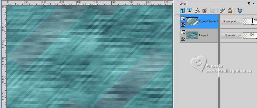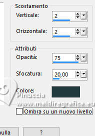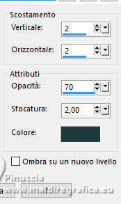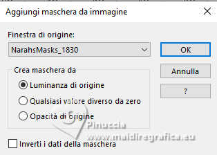 qui puoi trovare qualche risposta ai tuoi dubbi. Se l'argomento che ti interessa non è presente, ti prego di segnalarmelo. Questo tutorial è stato tradotto con PSPX7, ma può essere realizzato con le versioni più antiche. Dalla versione X4, il comando Immagine>Rifletti è stato sostituito con Immagine>Capovolgi in orizzontale, e il comando Immagine>Capovolgi con Immagine>Capovolgi in verticale. Nelle versioni X5 e X6, le funzioni sono state migliorate rendendo disponibile il menu Oggetti. Con la nuova versione X7, sono tornati Rifletti>Capovolgi, ma con nuove varianti. Vedi la scheda sull'argomento qui Traduzione inglese qui Le vostre versioni qui![]() Occorrente: ![]() Per il tube grazie Tshaka. (in questa pagina trovi i links ai siti dei creatori di tubes) Filtri: in caso di dubbi, ricorda di consultare la mia sezione filtri qui Filters Unlimited 2.0 qui Mura's Meister - Cloud qui Dsb Flux - Linear Transmission qui Graphics Plus - Cross Shadow qui I filtri Graphics Plus si possono usare da soli o importati in Filters Unlimited (come fare vedi qui) Se un filtro fornito appare con questa icona ![]() non esitare a cambiare modalità di miscelatura e opacità secondo i colori utilizzati. ![]() Metti il preset nella cartella Impostazioni predefinite. Apri la maschera in PSP e minimizzala con il resto del materiale. Imposta il colore di primo piano con #213a3f, e il colore di sfondo con #a5ddde. ![]() 1. Apri una nuova immagine trasparente 950 x 600 pixels. Effetti>Plugins>Mura's Meister - Cloud, con i settaggi standard. ![]() ricorda che questo filtro lavora con i colori impostati nella paletta dei materiali, ma tiene in memoria il primo settaggio dall'apertura del programma. Quindi se hai già usato il filtro, per essere sicuro di avere impostati i colori corretti, premi il tasto Reset. Il risultato dell'effetto è casuale, per questo non sarà uguale al mio. Puoi cambiare l'aspetto delle nuvole cliccando sulla finestra di anteprima, finché non sei soddisfatto del risultato 2. Effetti>Plugins>Dsb Flux - Linear Transmission. ![]() Effetti>Effetti di bordo>Aumenta. 3. Livelli>Duplica. Effetti>Effetti di immagine>Motivo unico, con i settaggi standard. ![]() 4. Effetti>Effetti geometrici>Inclina. ![]() 5. Effetti>Effetti di immagine>Motivo unico, con i settaggi standard. ![]() Cambia la modalità di miscelatura di questo livello in Sovrapponi, e abbassa l'opacità al 65%. ![]() Livelli>Unisci>Unisci giù. 6. Effetti>Filtro definito dall'utente - seleziona il preset Emboss 3 e ok. ![]() 7. Effetti>Plugins>Graphics Plus - Cross Shadow. ![]() 8. Imposta il colore di sfondo con il colore bianco. ![]() Livelli>Nuovo livello raster. Riempi il livello con il colore bianco.Livelli>Nuovo livello maschera>Da immagine. Apri il menu sotto la finestra di origine e vedrai la lista dei files aperti. Seleziona la maschera NarahsMasks_1830 ![]() Effetti>Effetti di bordo>Aumenta. Livelli>Unisci>Unisci gruppo. Cambia la modalità di miscelatura di questo livello in Luminanza (esistente). 9. Apri deco 1 ![]() Modifica>Copia. Torna al tuo lavoro e vai a Modifica>Incolla come nuovo livello. Immagine>Ridimensiona, al 60%, tutti i livelli non selezionato. Strumento Puntatore (K) ![]() Posizione X: -32,00 - Posizione Y: -28,00. ![]() 10. Livelli>Duplica. Immagine>Rifletti>Rifletti orizzontalmente (Immagine>Rifletti) Immagine>Rifletti>Rifletti verticalmente (Immagine>Capovolgi). Immagine>Ridimensiona, al 75%, tutti i livelli non selezionato. Strumento Puntatore (K) ![]() Posizione X: 686,00 - Posizione Y: -36,00. ![]() 11. Apri deco 2 ![]() Modifica>Copia. Torna al tuo lavoro e vai a Modifica>Incolla come nuovo livello. Immagine>Ridimensiona, al 45%, tutti i livelli non selezionato. Strumento Puntatore (K) ![]() Posizione X: 182,00 - Posizione Y: 7,00. ![]() 12. Livelli>Duplica. Immagine>Rifletti>Rifletti orizzontalmente (Immagine>Rifletti) Immagine>Rifletti>Rifletti verticalmente (Immagine>Capovolgi). Immagine>Ridimensiona, all'80%, tutti i livelli non selezionato. Strumento Puntatore (K) ![]() Posizione X: 683,00 - Posizione Y: 251,00. ![]() 13. Livelli>Unisci>Unisci giù. Effetti>Effetti 3D>Sfalsa ombra, colore di primo piano. ![]() 14. Apri deco 3 ![]() Modifica>Copia. Torna al tuo lavoro e vai a Modifica>Incolla come nuovo livello. Effetti>Filtro definito dall'utente - preset Emboss 3. ![]() Cambia la modalità di miscelatura di questo livello in Luminanza (esistente) e abbassa l'opacità al 70%. 15. Attiva il livello Raster 1. Modifica>Copia 16. Immagine>Aggiungi bordatura, 2 pixels, simmetriche, colore scuro di primo piano. Selezione>Seleziona tutto. Immagine>Aggiungi bordatura, 20 pixels, simmetriche, colore bianco. Effetti>Effetti 3D>Sfalsa ombra, colore di primo piano. ![]() 17. Selezione>Seleziona tutto. Immagine>Aggiungi bordatura, 10 pixels, simmetriche, colore bianco. Selezione>Inverti. Modifica>Incolla nella selezione (lo sfondo in memoria). 18. Effetti>Effetti 3D>Smusso a incasso. ![]() 19. Selezione>Seleziona tutto. Immagine>Aggiungi bordatura, 10 pixels, simmetriche, colore bianco. Effetti>Effetti 3D>Sfalsa ombra, colore di primo piano. ![]() Selezione>Deseleziona. 20. Apri il tube principale 449-Orient21_Tsha ![]() Modifica>Copia. Torna al tuo lavoro e vai a Modifica>Incolla come nuovo livello. Per il tube fornito: Immagine>Ridimensiona, a 92%, tutti i livelli non selezionato. Strumento Puntatore (K) ![]() Posizione X: 395,00 - Posizione Y: 8,00. ![]() Effetti>Effetti 3D>Sfalsa ombra, a scelta. 21. Firma il tuo lavoro. Immagine>Aggiungi bordatura, 2 pixels, simmetriche, colore scuro di primo piano. Immagine>Ridimensiona, 1000 pixels di larghezza, o come preferisci, tutti i livelli selezionato. Salva in formato jpg. Per il tube di questo esempio grazie Silvie ![]() ![]() ![]() Puoi scrivermi se hai problemi o dubbi, o trovi un link che non funziona, o soltanto per un saluto. |