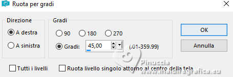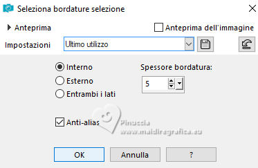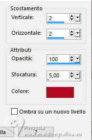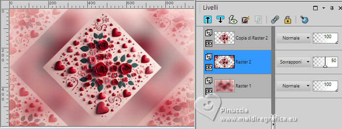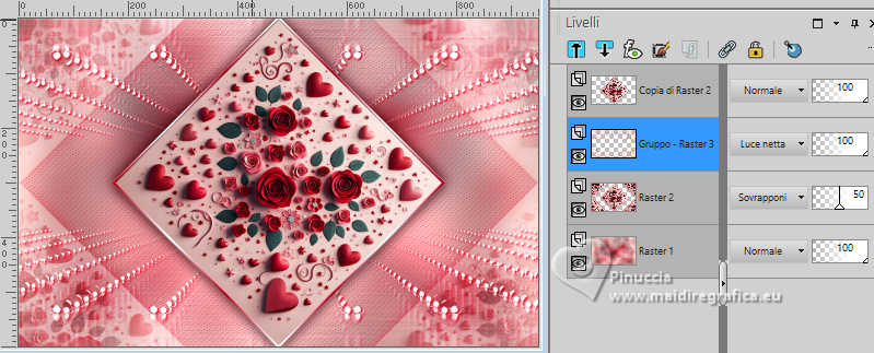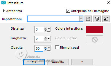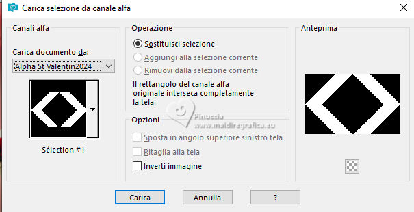 qui puoi trovare qualche risposta ai tuoi dubbi. Se l'argomento che ti interessa non è presente, ti prego di segnalarmelo. Questo tutorial è stato tradotto con PSPX7, ma può essere realizzato con le versioni più antiche. Dalla versione X4, il comando Immagine>Rifletti è stato sostituito con Immagine>Capovolgi in orizzontale, e il comando Immagine>Capovolgi con Immagine>Capovolgi in verticale. Nelle versioni X5 e X6, le funzioni sono state migliorate rendendo disponibile il menu Oggetti. Con la nuova versione X7, sono tornati Rifletti>Capovolgi, ma con nuove varianti. Vedi la scheda sull'argomento qui Traduzione inglese qui Le vostre versioni quiOccorrente: ![]() (in questa pagina trovi i links ai siti dei creatori di tubes) Ulteriori immagini di Knollings fornite Il Knolling è una tecnica fotografica che consiste nel disporre gli oggetti in modo ordinato e simmetrico su una superficie piana. Gli oggetti sono solitamente allineati ad angolo retto tra loro e ogni oggetto viene fotografato in modo che tutti gli oggetti siano chiaramente visibili. Questa tecnica viene spesso utilizzata per fotografare strumenti, forniture per ufficio, giocattoli e altri oggetti simili. Filtri: in caso di dubbi, ricorda di consultare la mia sezione filtri qui Filters Unlimited 2.0 qui Graphics Plus - Cross Shadow qui I filtri Graphics Plus si possono usare da soli o importati in Filters Unlimited (come fare vedi qui) Se un filtro fornito appare con questa icona ![]() non esitare a cambiare modalità di miscelatura e opacità secondo i colori utilizzati. Nelle ultime versioni di PSP non c'é il gradiente di primo piano/sfondo (Corel_06_029) Puoi usare i gradienti delle versioni precedenti. Trovi qui i gradienti Corel X. ![]() Apri la maschera in PSP e minimizzala con il resto del materiale. Imposta il colore di primo piano con #b00721, e il colore di sfondo con il colore bianco #ffffff. ![]() Passa il colore di primo piano a Gradiente di primo piano/sfondo, stile Lineare. ![]() 1. Apri Alpha SaintValentin24 Finestra>Duplica o sulla tastiera maiuscola+D per fare una copia. ![]() Chiudi l'originale. La copia, che sarà la base del tuo lavoro, non é vuota, ma contiene una selezione salvata sul canale alfa. Selezione>Seleziona tutto. Apri l'immagine in jpg Knolling IA ![]() Modifica>Copia. Torna al tuo lavoro e vai a Modifica>Incolla nella selezione. Selezione>Deseleziona. Regola>Sfocatura>Sfocatura gaussiana - raggio 35. ![]() 2. Modifica>Incolla come nuovo livello (l'immagine knolling è sempre in memoria). Immagine>Ridimensiona, al 42%, tutti i livelli non selezionato. Immagine>Ruota per gradi - 45 gradi a destra ![]() 3. Livelli>Duplica. Attiva il livello sottostante, Raster 2. Effetti>Effetti di immagine>Motivo unico, con i settaggi standard. ![]() Cambia la modalità di miscelatura di questo livello in Sovrapponi e abbassa l'opacità al 50% (o secondo i tuoi colori: nella mia seconda version ho lasciato l'opacità a 85%). ![]() 4. Attiva il livello inferiore, Raster 1. Selezione>Carica/Salva selezione>Carica selezione da canale alfa. La selezione sélection 1 è subito disponibile. Devi soltanto cliccare Carica. ![]() 5. Effetti>Effetti di trama>Intessitura colore intessitura: colore di primo piano ![]() Selezione>Deseleziona. Effetti>Plugins>Graphics Plus - Cross Shadow ![]() 6. Attiva nuovamente il livello Raster 2. Effetti>Effetti 3D>Sfalsa ombra, colore di primo piano. ![]() 7. Attiva il livello superiore, Copia di Raster 2. Selezione>Seleziona tutto. Selezione>Mobile. Selezione>Immobilizza. Selezione>Modifica>Seleziona bordature selezione. ![]() Riempi la selezione con il gradiente lineare.8. Effetti>Effetti 3D>Smusso a incasso. ![]() Selezione>Deseleziona. Effetti>Effetti 3D>Sfalsa ombra, colore nero. ![]() 9. Attiva nuovamente il livello Raster 2. Livelli>Nuovo livello raster. Riempi il livello con il colore bianco di sfondo.Livelli>Nuovo livello maschera>da immagine. Apri il menu sotto la finestra d'origine e vedrai la lista dei files aperti. Seleziona la maschera NarahsMasks_1727 ![]() Effetti>Effetti di bordo>Aumenta. Livelli>Unisci>Unisci gruppo. Effetti>Effetti 3D>Sfalsa ombra, colore di primo piano. ![]() Cambia la modalità di miscelatura di questo livello in Luce netta. ![]() 10. Apri l'immagine déco coeur ![]() Modifica>Copia. Torna al tuo lavoro e vai a Modifica>Incolla come nuovo livello. Livelli>Disponi>Sposta su. Immagine>Ridimensiona, al 60%, tutti i livelli non selezionato. Tasto K per attivare lo strumento Puntatore ![]() e imposta Posizione X e Y 0,00. ![]() 11. Livelli>Duplica. Immagine>Rifletti. Livelli>Unisci>Unisci giù. Effetti>Effetti 3D>Sfalsa ombra, con i settaggi precedenti. ![]() Livelli>Duplica. 12. Apri il tube Texte Love Shawnee ![]() Cancella la firma e vai a Modifica>Copia. Torna al tuo lavoro e vai a Modifica>Incolla come nuovo livello. Sposta il testo in basso a sinistra.Effetti>Effetti 3D>Sfalsa ombra, colore nero. ![]() 13. Apri il tube della donna aigenbycaz_valentine(19) ![]() Cancella la firma e vai a Modifica>Copia. Torna al tuo lavoro e vai a Modifica>Incolla come nuovo livello. Immagine>Rifletti>Rifletti orizzontalmente (Immagine>Rifletti). Immagine>Ridimensiona, al 55%, tutti i livelli non selezionato. Sposta il tube a destra.Effetti>Effetti 3D>Sfalsa ombra, colore nero. ![]() 14. Livelli>Nuovo livello raster. Selezione>Seleziona tutto. Passa il colore di primo piano a Colore. Riempi il livello con il colore di primo piano.Effetti>Plugins>Graphics Plus - Cross Shadow, con i settaggi precedenti. ![]() Regola>Aggiungi/Rimuovi disturbo>Aggiungi disturbo. ![]() 15. Selezione>Modifica>Contrai - 3 pixels. Riempi il livello con il colore bianco di sfondo.Selezione>Modifica>Contrai - 3 pixels. Premi sulla tastiera il tasto CANC ![]() Selezione>Deseleziona. 16. Firma il tuo lavoro. Controlla che tutto sia a posto. Livelli>Unisci>Unisci tutto e salva in formato jpg. Per i tubes di questo esempio grazie Aigenbycaz e Saskia ![]() ![]() ![]() Puoi scrivermi se hai