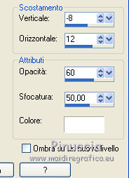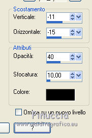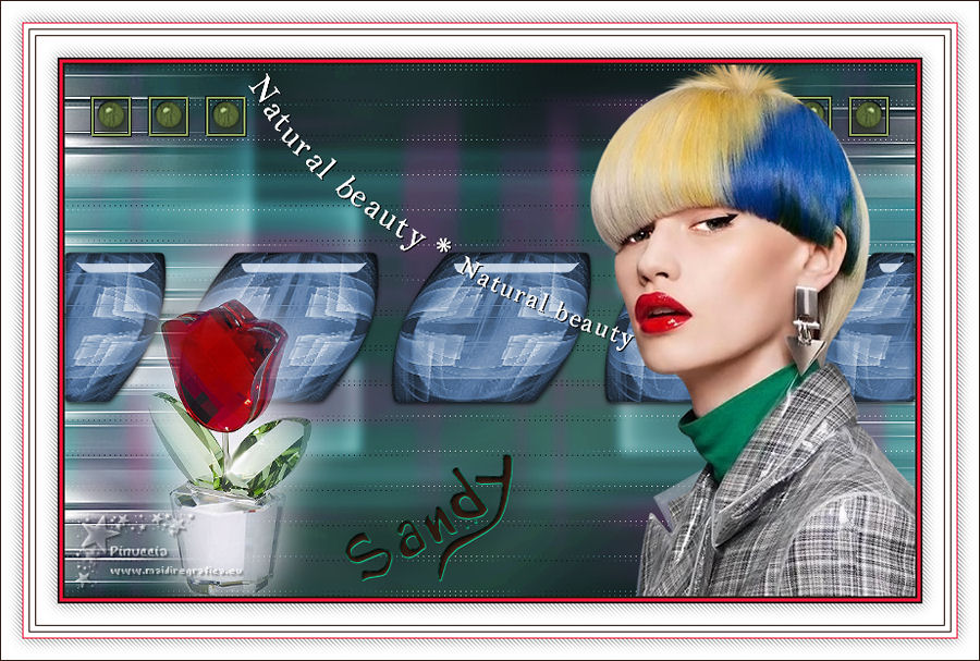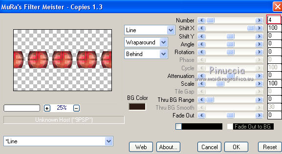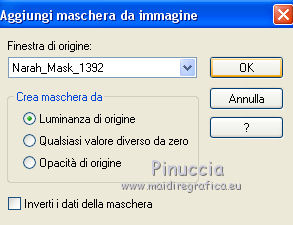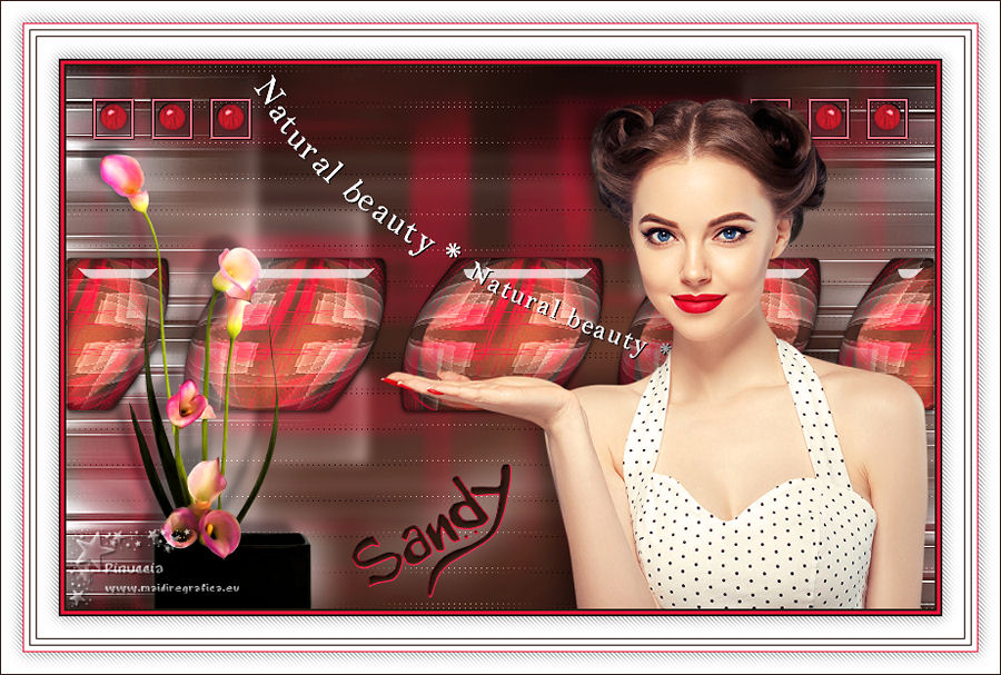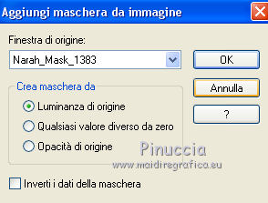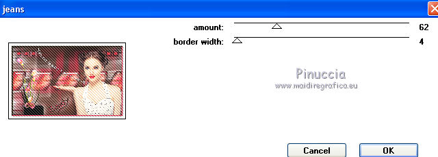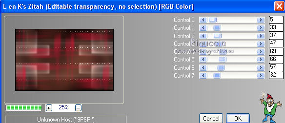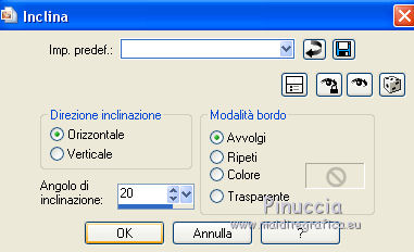 qui puoi trovare qualche risposta ai tuoi dubbi. Se l'argomento che ti interessa non è presente, ti prego di segnalarmelo. Questo tutorial è stato tradotto con PSPX, ma può essere realizzato anche con le altre versioni di PSP. Dalla versione X4, il comando Immagine>Rifletti è stato sostituito con Immagine>Capovolgi in orizzontale, e il comando Immagine>Capovolgi con Immagine>Capovolgi in verticale. Nelle versioni X5 e X6, le funzioni sono state migliorate rendendo disponibile il menu Oggetti. Con la nuova versione X7, sono tornati Rifletti>Capovolgi, ma con nuove varianti. Vedi la scheda sull'argomento qui Le vostre versioni Occorrente: Materiale qui Per il tube dei fiori grazie Tine. Il resto del materiale è di Coly (in questa pagina trovi i links ai siti dei creatori di tubes) Filtri: se hai problemi con i filtri, consulta la mia sezione filtri qui Graphics Plus - Cross Shadow qui Flaming Pear - Flexify 2 qui L&K's - L&K's Zitah qui Mura's Meister - Copies qui Alien Skin Eye Candy 5 Impact - Glass qui Penta.com - Jeans qui Filters Unlimited 2.0 qui I filtri Graphics Plus e Penta.com si possono usare da soli o importati in Filters Unlimited (come fare vedi qui) Se un filtro fornito appare con questa icona ![]() non esitare a cambiare modalità di miscelatura e opacità secondo i colori utilizzati. La trama Corel_2_017 è standard in PSP. Se non la trovi nel tuo PSP, metti quella fornita nella cartella Trame. Apri le maschere in PSP e minimizzale con il resto del materiale. Imposta il colore di primo piano piano con il colore #f31438, e il colore di sfondo con il colore scuro #2d1a12. ![]() 1. Apri una nuova immagine trasparente 800 x 500 pixels, e riempila con il colore scuro.2. Livelli>Nuovo livello raster. Riempi il livello con il colore chiaro.3. Livelli>Nuovo livello maschera>Da immagine. Apri il menu sotto la finestra di origine e vedrai la lista dei files aperti. Seleziona la maschera Narah_Mask_1391 ![]() Effetti>Effetti di bordo>Aumenta. Livelli>Unisci>Unisci gruppo. 4. Effetti>Effetti di immagine>Motivo unico, con i settaggi standard. ![]() Regola>Messa a fuoco>Metti a fuoco. 5. Attiva il livello inferiore. Effetti>Plugins>Graphics Plus - Cross Shadow, con i settaggi standard. ![]() Effetti>Effetti di trama>Trama - seleziona la trama Corel_02_017. ![]() 6. Imposta il colore di primo piano con il colore bianco. Livelli>Nuovo livello raster. Riempi il livello con il colore bianco.Livelli>Nuovo livello maschera>Da immagine. Apri il menu sotto la finestra di origine e seleziona la maschera Narah_Mask_1383 ![]() Effetti>Effetti di bordo>Aumenta. Livelli>Unisci>Unisci gruppo. 7. Cambia la modalità di miscelatura di questo livello in Luminanza (esistente). Livelli>Duplica. Immagine>Rifletti. Livelli>Unisci>Unisci giù. Abbassa l'opacità al 75%. 8. Livelli>Unisci>Unisci visibile. 9. Livelli>Duplica. Effetti>Effetti geometrici>Cerchio. ![]() 10. Effetti>Plugins>Flaming Pear - Flexify 2. ![]() Se hai problemi con il filtro, nel materiale trovi il livello da copiare/incollare come nuovo livello. 11. Immagine>Ridimensiona, al 28%, tutti i livelli non selezionato. Tasto K per attivare lo strumento Puntatore ![]() e imposta Posizione X: 315,00 e Posizione Y: 177,00. ![]() 12. Effetti>Plugins>Mura's Meister - Copies. ![]() 13. Effetti>Effetti 3D>Sfalsa ombra. ![]() 14. Effetti>Effetti geometrici>Inclina. ![]() 15. Effetti>Plugins>Alien Skin Eye Candy 5 Impact - Glass. ![]() 16. Attiva il livello inferiore, Uniti. Regola>Sfocatura>Sfocatura gaussiana - raggio 5. ![]() 17. Effetti>Plugins>L&K's - L&K's Zitah, con i settaggi standard. ![]() Immagine>Capovolgi. Ripeti Effetti>Plugins>L&K's - L&K's Zitah, con i settaggi standard. Immagine>Capovolgi. 18. Livelli>Nuovo livello raster. Riempi il livello con il colore bianco.Livelli>Nuovo livello maschera>Da immagine. Apri il menu sotto la finestra di origine e seleziona la maschera Narah_Mask_1392 ![]() Effetti>Effetti di bordo>Aumenta. Livelli>Unisci>Unisci gruppo. 19. Apri il tube déco e vai a Modifica>Copia. Torna al tuo lavoro e vai a Modifica>Incolla come nuovo livello. Tasto K per attivare lo strumento Puntatore ![]() e imposta Posizione X: 23,00 e Posizione Y: 27,00. ![]() 20. Effetti>Effetti 3D>Sfalsa ombra. ![]() Ripeti l'Effetto Salsa ombra, verticale e orizzontale -1. 21. Livelli>Duplica. Immagine>Rifletti. 22. Attiva il livello superiore. Apri il tube della donna, cancella la firma e vai a Modifica>Copia. Torna al tuo lavoro e vai a Modifica>Incolla come nuovo livello. Immagine>Ridimensiona, al 65%, tutti i livelli non selezionato. Spostalo a destra.Effetti>Effetti 3D>Sfalsa ombra. ![]() 23. Apri il tube Nature Fleurs 4 di Tine, cancella la firma e vai a Modifica>Copia. Torna al tuo lavoro e vai a Modifica>Incolla come nuovo livello. Immagine>Ridimensiona, al 55%, tutti i livelli non selezionato. Immagine>Rifletti. Spostalo a sinistra.24. Regola>Luminosità e contrasto>Luminosità e contrasto (facoltativo). ![]() 25. Effetti>Effetti 3D>Sfalsa ombra, colore bianco, ombra su nuovo livello selezionato. ![]() 26. Attiva il livello superiore, i fiori. Effetti>Effetti 3D>Sfalsa ombra, colore nero, ombra su nuovo livello non selezionato. ![]() 27. Apri il testo Natural beauty e vai a Modifica>Copia. Torna al tuo lavoro e vai a Modifica>Incolla come nuovo livello. Porta questo livello sotto il livello della donna. Tasto K per attivare lo strumento Puntatore ![]() e imposta Posizione X: 173,00 e Posizione Y: 8,00. ![]() 28. Effetti>Effetti 3D>Sfalsa ombra. ![]() 29. Attiva il livello superiore. Scrivi il testo Sandy, o copia/incolla come nuovo livello il testo fornito e passa al punto 33. Imposta il colore di primo piano con il colore rosso ![]() Font Anarchistic, dimensione 150, pennellata 1 ![]() Scrivi il testo. 30. Imagine>Ruota per gradi - 30 gradi a sinistra. ![]() Livelli>Converti in livello raster. 31. Effetti>Effetti 3D>Smusso a incasso. ![]() 32. Effetti>Effetti 3D>Sfalsa ombra. ![]() 33. Riprendi da qui se hai usato il testo for