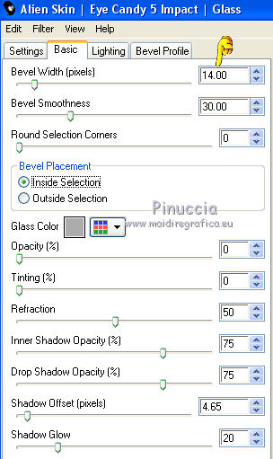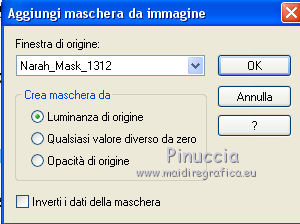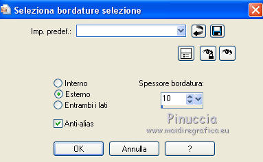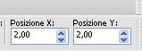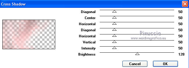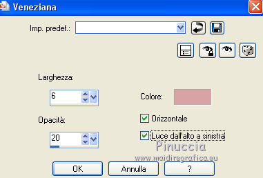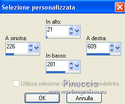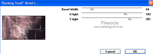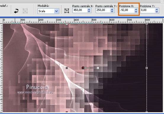 qui puoi trovare qualche risposta ai tuoi dubbi. Se l'argomento che ti interessa non è presente, ti prego di segnalarmelo. Questo tutorial è stato tradotto con PSPX, ma può essere realizzato anche con le altre versioni di PSP. Dalla versione X4, il comando Immagine>Rifletti è stato sostituito con Immagine>Capovolgi in orizzontale, e il comando Immagine>Capovolgi con Immagine>Capovolgi in verticale. Nelle versioni X5 e X6, le funzioni sono state migliorate rendendo disponibile il menu Oggetti. Con la nuova versione X7, sono tornati Rifletti>Capovolgi, ma con nuove varianti. Vedi la scheda sull'argomento qui Le vostre versioni Occorrente: Materiale qui Per le maschere grazie Nara e Mary LBDM. Il resto del materiale è di Colybrix. (in questa pagina trovi i links ai siti dei creatori di tubes) Filtri: se hai problemi con i filtri, consulta la mia sezione filtri qui Toadies - Sucking Toad Bevel I qui Alien Skin Eye Candy 5 Impact qui Filters Unlimited 2.0 qui Richard Rosenman - Solid Border qui Graphics Plus - Cross Shadow qui I filtri Graphics Plus e Toadies si possono usare da soli o importati in Filters Unlimited (come fare vedi qui) Se un filtro fornito appare con questa icona ![]() non esitare a cambiare modalità di miscelatura e opacità secondo i colori utilizzati. Nelle ultime versioni di PSP non c'è il gradiente di primo piano/sfondo (Corel_06_029) Puoi usare i gradienti delle versioni precedenti. Trovi qui i gradienti Corel X. Metti lo script nella cartella Script sicuri. Apri le maschere in PSP e minimizzale con il resto del materiale. 1. Imposta il colore di primo piano con il colore chiaro #d8a3a4, e il colore di sfondo con il colore scuro #0d0811. ![]() 2. Apri una nuova immagine trasparente 900 x 500 pixels e riempila con il colore scuro.3. Livelli>Nuovo livello raster. Riempi con il colore chiaro.Livelli>Nuovo livello maschera>Da immagine. Apri il menu sotto la finestra di origine e vedrai la lista dei files aperti. Seleziona la maschera lbdm-masque-155. ![]() Effetti>Effetti di bordo>Aumenta. Livelli>Unisci>Unisci gruppo. 4. Effetti>Plugins>Graphics Plus - Cross Shadow. ![]() 5. Vous positionner sur le calque du bas de la pile, Raster 1. Effetti>Effetti di trama>Veneziana, colore di primo piano. ![]() 6. Attiva il livello superiore. Imposta il colore di primo piano con il colore bianco. Livelli>Nuovo livello raster. Riempi con il colore bianco.Livelli>Nuovo livello maschera>Da immagine. Apri il menu sotto la finestra di origine e seleziona la maschera Narah-Mask1312. ![]() Effetti>Effetti di bordo>Aumenta. Livelli>Unisci>Unisci gruppo. Cambia la modalità di miscelatura di questo livello in Sovrapponi, o altro (per la mia seconda versione Luminanza (esistente)). 7. Attiva lo strumento Puntatore ![]() imposta Posizione X: -92,00 e mantieni Posizione Y a 0,00 ![]() 8. Livelli>Nuovo livello raster. Attiva lo strumento Selezione ![]() (non importa il tipo di selezione impostato, perchè con la selezione personalizzata si ottiene sempre un rettangolo) clicca sull'icona Selezione personalizzata ![]() e imposta i seguenti settaggi. ![]() 9. Riempi la selezione con il colore bianco.Selezione>Modifica>Contrai - 5 pixels. Premi sulla tastiera il tasto CANC ![]() Selezione>Deseleziona. 10. Effetti>Effetti di immagine>Motivo unico, con i settaggi standard. ![]() 11. Ripeti Effetti>Effetti di immagine>Motivo unico, Intermittente diagonale. ![]() 12. Cambia la modalità di miscelatura di questo livello in Luminanza (esistente). Livelli>Unisci>Unisci visibile. 13. Effetti>Plugins>Toadies - *Sucking Toad* Bevel I, con i settaggi standard. ![]() 14. Apri il tube coeur texte e vai a Modifica>Copia. Torna al tuo lavoro e vai a Modifica>Incolla come nuovo livello. Strumento Puntatore ![]() e imposta Posizione X: 2,00 e Posizione Y: 2,00 ![]() Regola>Messa a fuoco>Metti a fuoco. 15. Apri il tube della donna, cancella la firma e vai a Modifica>Copia. Torna al tuo lavoro e vai a Modifica>Incolla come nuovo livello. Immagine>Rifletti. Immagine>Ridimensiona, al 63%, tutti i livelli non selezionato. Spostalo a destra,o imposta Posizione X: 455,00 e Posizione Y: 5,00 ![]() Regola>Messa a fuoco>Metti a fuoco. 16. Livelli>Duplica. Imposta Posizione X: 288,00 e Posizione Y: 5,00. ![]() 17. Selezione personalizzata ![]() ![]() 18. Selezione>Inverti. Premi sulla tastiera il tasto CANC ![]() Selezione>Deseleziona. Abbassa l'opacità di questo livello al 37%. 19. Livelli>Disponi>Sposta giù. ![]() 20. Attiva il livello superiore. Effetti>Effetti 3D>Sfalsa ombra. ![]() 21. Attiva il livello di sfondo. Selezione personalizzata ![]() ![]() Selezione>Innalza selezione a livello. 22. Effetti>Plugins>Alien Skin Eye Candy 5 Impact - Glass Seleziona il preset Clear e cambia Bevel Width con 14 ![]() ![]() 23. Selezione>Modifica>Seleziona bordature selezione. ![]() Riempi la selezione con il colore bianco.Selezione>Deseleziona. 24. Livelli>Duplica. Immagine>Ridimensiona, all'85%, tutti i livelli non selezionato. Imposta Posizione X: 702,00 e Posizione Y: 107,00. ![]() Abbassa l'opacità di questo livello al 75%. 25. Attiva nuovamente il livello di sfondo. Selezione personalizzata ![]() ![]() 26. Selezione>Innalza selezione a livello. Effetti>Plugins>Alien Skin Eye Candy 5 Impact - Glass, con i settaggi precedenti. 27. Selezione>Modifica>Seleziona bordature selezione, con i settaggi precedenti. ![]() Riempi la selezione con il colore bianco.Selezione>Deseleziona. 28. Livelli>Duplica. Immagine>Ridimensiona, all'85%, tutti i livelli non selezionato. Imposta Posizione X: 121,00 e Posizione Y: 321,00. ![]() Abbassa l'opacità di questo livello al 75%. 29. Livelli>Duplica. Immagine>Ridimensiona, all'85%, tutti i livelli non selezionato. Imposta Posizione X: 168,00 e Posizione Y: 294,00. ![]() Mantieni l'opacità di questo livello al 75%. 30. Livelli>Unisci>Unisci tutto. Livelli>Nuovo livello raster. Riempi la selezione con il colore scuro.31. Selezione>Seleziona tutto. Selezione>Modifica>Contrai - 3 pixels. Premi sull