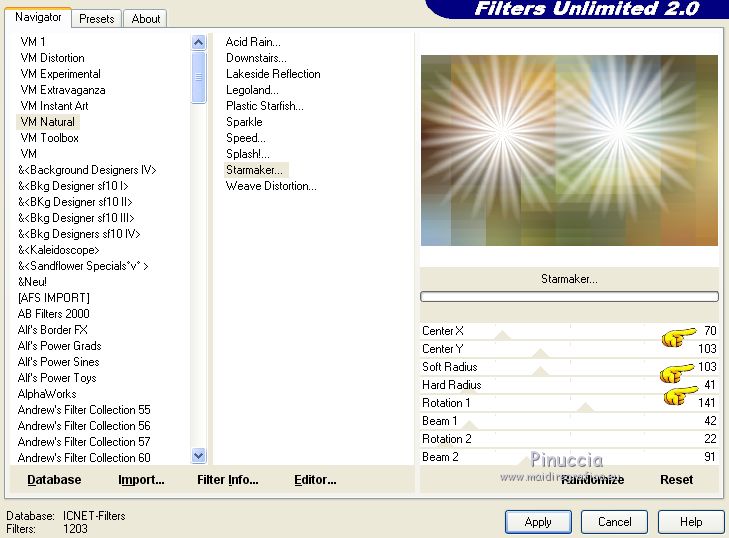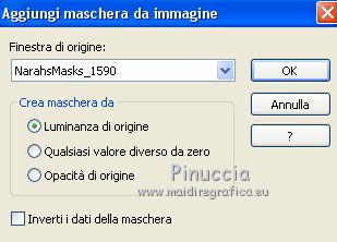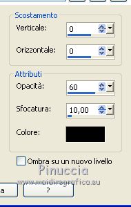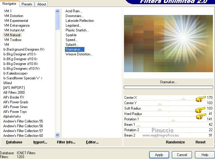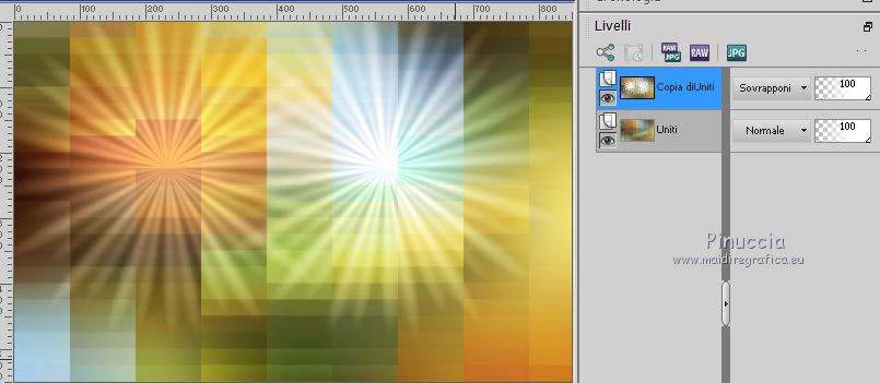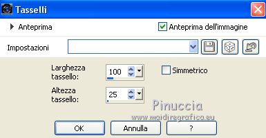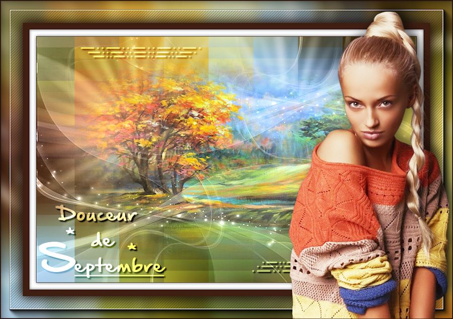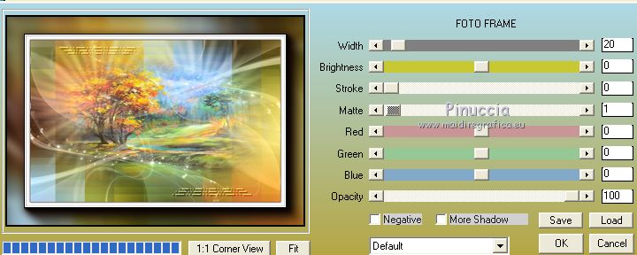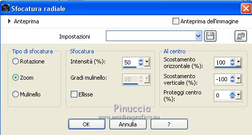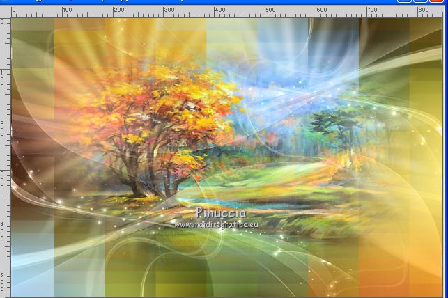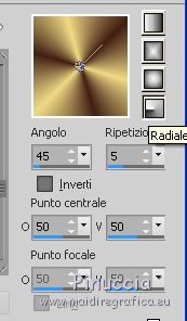 qui puoi trovare qualche risposta ai tuoi dubbi. Se l'argomento che ti interessa non è presente, ti prego di segnalarmelo. Questo tutorial è stato tradotto con PSPX, ma può essere realizzato anche con le altre versioni di PSP. Dalla versione X4, il comando Immagine>Rifletti è stato sostituito con Immagine>Capovolgi in orizzontale, e il comando Immagine>Capovolgi con Immagine>Capovolgi in verticale. Nelle versioni X5 e X6, le funzioni sono state migliorate rendendo disponibile il menu Oggetti. Con la nuova versione X7, sono tornati Rifletti>Capovolgi, ma con nuove varianti. Vedi la scheda sull'argomento qui Le vostre versioniOccorrente: Materiale qui Grazie per il tube del paesaggio Tine e per la maschera Narah. Il resto del materiale è di Colybrix. (in questa pagina trovi i links ai siti dei creatori di tubes) Filtri: se hai problemi con i filtri, consulta la mia sezione filtri qui Filters Unlimited 2.0 qui VM Natural - Starmaker qui AAA Frames - Foto Frame qui I filtri VM Natural si possono usare da soli o importati in Filters Unlimited (come fare vedi qui) Se un filtro fornito appare con questa icona ![]() non esitare a cambiare modalità di miscelatura e opacità secondo i colori utilizzati. Nelle ultime versioni di PSP non c'è il gradiente di primo piano/sfondo (Corel_06_029) Puoi usare i gradienti delle versioni precedenti. Trovi qui i gradienti Corel X. Apri la maschera in PSP e minimizzala con il resto del materiale. 1. Imposta il colore di primo piano con #3f1f12, e il colore di sfondo con #efda85. ![]() Passa il colore di primo piano a Gradiente di primo piano/sfondo, stile Radiale. ![]() 2. Apri una nuova immagine trasparente 850 x 550, e riempila con il gradiente.3. Regola>Sfocatura>Sfocatura gaussiana - raggio 30. ![]() 4. Apri il tube del paesaggio, cancella la firma e vai a Modifica>Copia. Torna al tuo lavoro e vai a Modifica>Incolla come nuovo livello. 5. Effetti>Effetti di immagine>Motivo unico. ![]() 6. Regola>Sfocatura>Sfocatura radiale. ![]() 7. Effetti>Effetti di bordo>Aumenta - 2 volte. 8. Effetti>Effetti di distorsione>Tasselli. ![]() 9. Attiva il livello Raster 1. Selezione>Seleziona tutto. Immagine>Ritaglia la selezione. 10. Livelli>Unisci>Unisci visibile. Livelli>Duplica. 11. Effetti>Plugins>Filters Unlimited 2.0 - VM Natural - Starmaker. ![]() 12. Ripeti Effetti>Plugins>Filters Unlimited 2.0 - VM Natural - Starmaker con altri settaggi. ![]() Cambia la modalità di miscelatura di questo livello in Sovrapponi. ![]() 13. Livelli>Nuovo livello raster. Selezione>Seleziona tutto. Modifica>Incolla nella selezione (il tube del paesaggio è sempre in memoria). Selezione>Deseleziona. 14. Imposta il colore di sfondo con il colore bianco #ffffff. Livelli>Nuovo livello raster. Riempi il livello con il colore bianco.Livelli>Nuovo livello maschera>Da immagine. Apri il menu sotto la finestra di origine e vedrai la lista dei files aperti. Seleziona la maschera NarahsMask_1590. ![]() Effetti>Effetti di bordo>Aumenta. Livelli>Unisci>Unisci gruppo. 15. Cambia la modalità di miscelatura di questo livello in Luminanza (esistente) Livelli>Duplica. Immagine>Rifletti. Immagine>Capovolgi. Livelli>Unisci>Unisci giù. 16. Attiva lo strumento Gomma , con i seguenti settaggi![]() e dai 4-5 piccoli colpi sulla parte superiore dell'albero, per sfumare leggermente la maschera sull'albero. ![]() 17. Apri il tube Déco lignes e vai a Modifica>Copia. Torna al tuo lavoro e vai a Modifica>Incolla come nuovo livello. Non spostarlo. Effetti>Effetti 3D>Sfalsa ombra. ![]() 18. Cambia la modalità di miscelatura di questo livello in Sovrapponi, e abbassa l'opacità all'85%. 19. Livelli>Unisci>Unisci visibile. Modifica>Copia. 20. Immagine>Aggiungi bordatura, 1 pixel, simmetriche, colore scuro di primo piano. Immagine>Aggiungi bordatura, 15 pixels, simmetriche, colore bianco. Immagine>Aggiungi bordatura, 15 pixels, simmetriche, colore scuro di primo piano. 21. Attiva lo strumento Bacchetta magica ![]() e clicca nel bordo bianco per selezionarlo. Selezione>Inverti. Effetti>Effetti 3D>Sfalsa ombra. ![]() Selezione>Deseleziona. 23. Immagine>Aggiungi bordatura, 50 pixels, simmetriche, colore bianco. Seleziona il bordo bianco con la bacchetta magica ![]() 24. Modifica>Incolla nella selezione (lo sfondo in memoria). Regola>Sfocatura>Sfocatura gaussiana - raggio 10. ![]() 25. Effetti>Effetti di trama>Intessitura - colore intessitura: colore scuro di primo piano ![]() 26. Selezione>Inverti. Effetti>Effetti 3D>Sfalsa ombra. ![]() Selezione>Deseleziona. 27. Effetti>Plugins>AAA Frames - Foto Frame. ![]() 28. Apri il tube della donna e vai a Modifica>Copia. Torna al tuo lavoro e vai a Modifica>Incolla come nuovo livello. Immagine>Ridimensiona, al 97%, tutti i livelli non selezionato. Sposta il tube a destra.Effetti>Effetti 3D>Sfalsa ombra. ![]() 29. Apri il tube texte, cancella la firma e vai a Modifica>Copia. Torna al tuo lavoro e vai a Modifica>Incolla come nuovo livello. Immagine>Immagine negativa (facoltativo, se vuoi rendere bianco il testo) Tasto K per attivare lo strumento Puntatore ![]() e imposta Posizione X: 86,00 e Posizione Y: 457,00. ![]() 30. Effetti>Effetti 3D>Sfalsa ombra. ![]() Cambia la modalità di miscelatura di questo livello in Sovrapponi. 31. Firma il tuo lavoro su un nuovo livello. Immagine>Aggiungi bordatura, 1 pixel, simmetriche, colore scuro. 32. Immagine>Ridimensiona, 900 pixels di larghezza, tutti i livelli selezionato. Salva in formato jpg. Versione con tube di Azalée (il paesaggio è mio) ![]() ![]() Le vostre versioniGrazie ![]() Olimpia ![]() Puoi scrivermi se hai problemi o dubbi, o trovi un link che non funziona, o soltanto per un saluto. 12 Settembre 2020 |