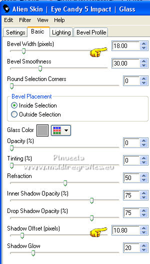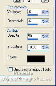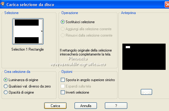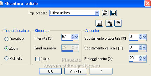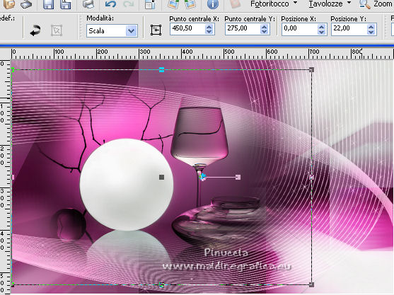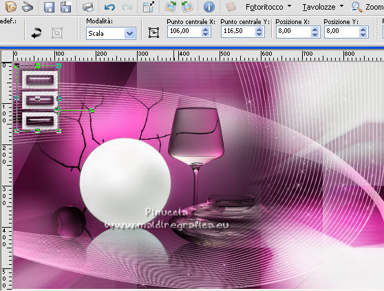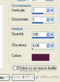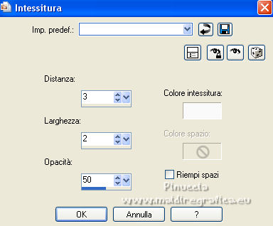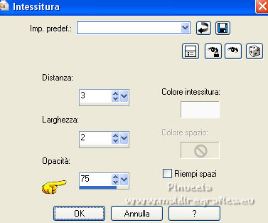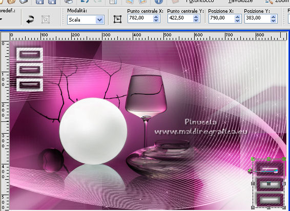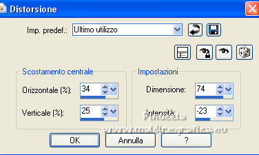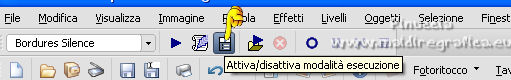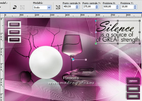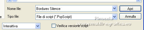 qui puoi trovare qualche risposta ai tuoi dubbi. Se l'argomento che ti interessa non è presente, ti prego di segnalarmelo. Questo tutorial è stato tradotto con PSPX, ma può essere realizzato anche con le altre versioni di PSP. Dalla versione X4, il comando Immagine>Rifletti è stato sostituito con Immagine>Capovolgi in orizzontale, e il comando Immagine>Capovolgi con Immagine>Capovolgi in verticale. Nelle versioni X5 e X6, le funzioni sono state migliorate rendendo disponibile il menu Oggetti. Con la nuova versione X7, sono tornati Rifletti>Capovolgi, ma con nuove varianti. Vedi la scheda sull'argomento qui Occorrente: Materiale qui Per il tube e la maschera grazie Mentali e Silvie (in questa pagina trovi i links ai siti dei creatori di tubes) Filtri: se hai problemi con i filtri, consulta la mia sezione filtri qui Filters Unlimited 2.0 qui Penta.com - Color Dot qui Mehdi - Sorting Tiles qui Alien Skin Eye Candy 5 Impact - Glass qui I filtri Penta.com si possono usare da soli o importati in Filters Unlimited (come fare vedi qui) Se un filtro fornito appare con questa icona ![]() non esitare a cambiare modalità di miscelatura e opacità secondo i colori utilizzati. Nelle ultime versioni di PSP non c'è il gradiente di primo piano/sfondo (Corel_06_029) Puoi usare i gradienti delle versioni precedenti. Trovi qui i gradienti Corel X. ![]() Metti lo script nella cartella Script sicuri, o lascialo nella cartella del materiale, dove lo cercherai quando ne avrai bisogno. Metti le selezioni nella cartella Selezioni, o lasciale nella cartella del materiale. In questo modo, non avrai bisogno di cercarle e potrai cancellare la cartella dai Percorsi, quando non ti serviranno più. ![]() Apri la maschera in PSP e minimizzala con il resto del materiale. Imposta il colore di primo piano con #fafafa, e il colore di sfondo con #561841. ![]() 1. Apri una nuova immagine trasparente 900 x 550 pixels. Riempi l'immagine trasparente con il colore scuro di sfondo.Selezione>Seleziona tutto. Apri il mist di Mentali e vai a Modifica>Copia. Torna al tuo lavoro e vai a Modifica>Incolla nella selezione. Selezione>Deseleziona. 2. Effetti>Effetti di immagine>Motivo unico, con i settaggi standard. ![]() 3. Regola>Sfocatura>Sfocatura radiale. ![]() 4. Effetti>Effetti di distorsione>Distorsione. ![]() Effetti>Effetti di bordo>Aumenta. 5. Livelli>Duplica. Cambia la modalità di miscelatura di questo livello in Luce diffusa (adatta, se necessario, ai tuoi colori). Effetti>Plugins>Penta.com - Color Dot, con i settaggi standard. ![]() 6. Effetti>Plugins>Mehdi - Sorting Tiles. ![]() Regola>Messa a fuoco>Metti a fuoco. 7. Livelli>Nuovo livello raster. Riempi il livello con il colore chiaro.Livelli>Nuovo livello maschera>da immagine Apri il menu sotto la finestra di origine e vedrai la lista dei files aperti. Seleziona la maschera Silvie_Mask_Deco42H ![]() Effetti>Effetti di bordo>Aumenta. Livelli>Unisci>Unisci gruppo. Cambia la modalità di miscelatura di questo livello in Luminanza (esistente) e abbassa l'opacità al 75%. ![]() 8. Modifica>Incolla come nuovo livello (il mist di Mentali è sempre in memoria). Immagine>Ridimensiona, al 75%, tutti i livelli non selezionato. Oggetti>Allinea a sinistra o tasto K per attivare lo strumento Puntatore ![]() e imposta Posizione X a 0,00 ![]() 9. Livelli>Nuovo livello raster. Selezione>Carica/Salva selezione>Carica selezione da disco. Cerca e carica la selezione Selection 1 Rectangle. ![]() Riempi la selezione con il colore chiaro.Selezione>Modifica>Contrai - 10 pixels. Premi sulla tastiera il tasto CANC ![]() 10. Effetti>Plugins>Alien Skin Eye Candy 5 Impact - Glass. Seleziona il preset Clear, con i seguenti settaggi (puoi adattarli a tuo piacimento) ![]() ![]() Selezione>Inverti. Effetti>Effetti di trama>Intessitura - colore scuro. ![]() Selezione>Deseleziona. 11. Livelli>Duplica. Tasto K per attivare lo strumento Puntatore ![]() e imposta Posizione Y: 101,00. ![]() Livelli>Duplica. Imposta Posizione Y: 151,00. ![]() Livelli>Unisci>Unisci giù - 2 volte. 12. Effetti>Effetti 3D>Sfalsa ombra, colore nero. ![]() Imposta Posizione X e Y 8,00 ![]() Attenzione, l'immagine non si mette sempre al posto giusto, in questo caso sposta leggermente con il mouse e poi imposta di nuovo i settaggi 13. Livelli>Nuovo livello raster. Selezione>Carica/Salva selezione>Carica selezione da disco. Cerca e carica la selezione Sélection 2 Rectangle bas ![]() Riempi la selezione con il colore scuro.Selezione>Modifica>Contrai - 10 pixels. Premi sulla tastiera il tasto CANC ![]() 14. Effett>Plugins>Alien Skin Eye Candy 5 Impact, con i settaggi precedenti. Selezione>Inverti. 15. Effetti>Effetti di trama>Intessitura - colore chiaro. ![]() Selezione>Deseleziona. 16. Livelli>Duplica. Tasto K per attivare lo strumento Puntatore ![]() e imposta Posizione Y: 407,00. ![]() Livelli>Duplica. Imposta Posizione Y: 357,00. ![]() Livelli>Unisci>Unisci giù - 2 volte. 17. Effetti>Effetti 3D>Sfalsa ombra, con i settaggi precedenti. ![]() Imposta Posizione x: 790,00 e Posizione Y: 383,00. ![]() Attenzione, l'immagine non si mette sempre al posto giusto, in questo caso sposta leggermente con il mouse e poi imposta di nuovo i settaggi 18. Apri il tube texte de Yoka e vai a Modifica>Copia. Torna al tuo lavoro e vai a Modifica>Incolla come nuovo livello. Immagine>Ridimensiona, al 75%, tutti i livelli non selezionato. Sposta il tube in alto a destra.O Tasto K per attivare lo strumento Puntatore ![]() e imposta Posizione X: 600,00 e Posizione Y: 18,00. ![]() Effetti>Effetti 3D>Sfalsa ombra, colore scuro. ![]() 19. Per precauzione, prima di eseguire lo script, salva il tuo lavoro. Se non vedi la barra degli script, vai a Visualizza>Barre degli strumenti>Script. Cerca e seleziona lo script Bordures Silence ![]() Se vuoi cambiare il colore dei bordi, clicca su Attiva/disattiva modalità esecuzione ![]() E poi clicca sulla freccia nera per avviare lo script. ![]() Se hai selezionato Attiva modalità esecuzione, lo script si fermerà ad 
