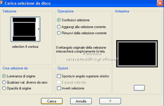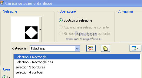 Dopo lo script: 20. Selezione>Carica/Salva selezione>Carica selezione da disco. Cerca e carica la selezione Selection 3 bordures ![]() Riempi la selezione con il colore scuro.Effetti>Effetti di trama>Intessitura - colore chiaro. ![]() 21. Selezione>Carica/Salva selezione>Carica selezione da disco. Cerca e carica la selezione Selection 4 contour ![]() Effetti>Effetti 3D>Smusso a incasso. ![]() Selezione>Deseleziona. 22. Firma il tuo lavoro su un nuovo livello. Livelli>Unisci>Unisci tutto. Immagine>Ridimensiona, 950 di larghezza, tutti i livelli selezionato. Salva in formato jpg. Il misted di questo esempio è mio ![]() ![]() Le vostre versioni. Grazie ![]() Antonietta ![]() ![]() Puoi scrivermi se hai problemi o dubbi, o trovi un link che non funziona, o soltanto per un saluto. |