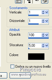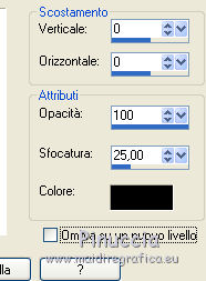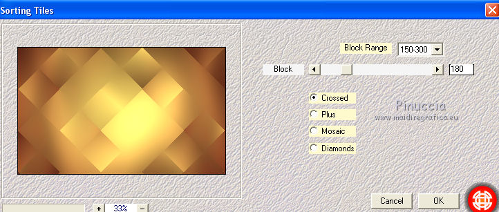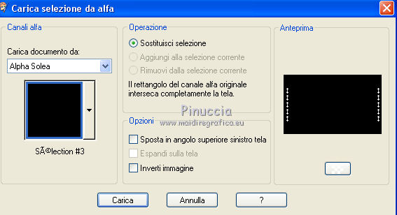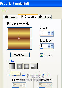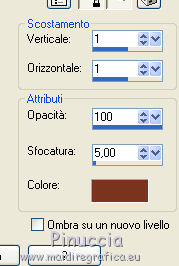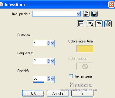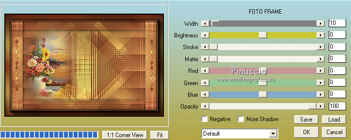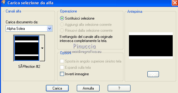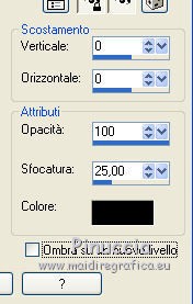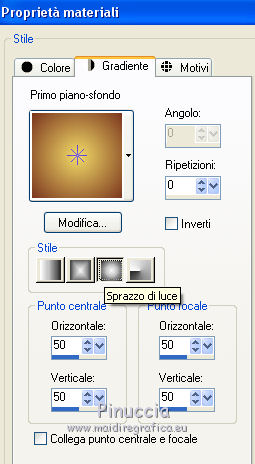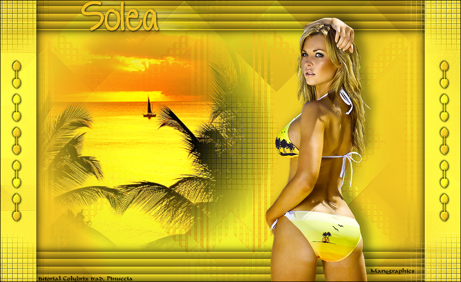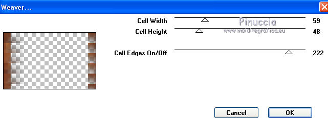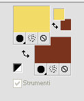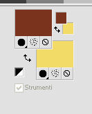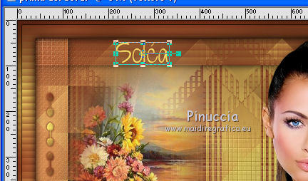 qui puoi trovare qualche risposta ai tuoi dubbi. Se l'argomento che ti interessa non è presente, ti prego di segnalarmelo. Questo tutorial è stato tradotto con PSPX, ma può essere realizzato anche con le altre versioni di PSP. Dalla versione X4, il comando Immagine>Rifletti è stato sostituito con Immagine>Capovolgi in orizzontale, e il comando Immagine>Capovolgi con Immagine>Capovolgi in verticale. Nelle versioni X5 e X6, le funzioni sono state migliorate rendendo disponibile il menu Oggetti. Con la nuova versione X7, sono tornati Rifletti>Capovolgi, ma con nuove varianti. Vedi la scheda sull'argomento qui Le vostre versioniOccorrente: Materiale qui (in questa pagina trovi i links ai siti dei creatori di tubes) Filtri: se hai problemi con i filtri, consulta la mia sezione filtri qui Filters Unlimited 2.0 qui Mehdi - Sorting Tiles qui FM Tile Tools - Blend Emboss qui Toadies - Weaver qui Graphics Plus - Cross Shadow qui AAA Frames - Foto Frame qui I filtri Graphics Plus e Toadies si possono usare da soli o importati in Filters Unlimited (come fare vedi qui) Se un filtro fornito appare con questa icona ![]() non esitare a cambiare modalità di miscelatura e opacità secondo i colori utilizzati. Nelle ultime versioni di PSP non c'è il gradiente di primo piano/sfondo (Corel_06_029) Puoi usare i gradienti delle versioni precedenti. Trovi qui i gradienti Corel X. ![]() Apri le maschere in PSP e minimizzale con il resto del materiale. 1. Imposta il colore di primo piano con #f2db68 e il colore di sfondo con #7a341e. ![]() Passa il colore di primo piano a Gradiente di primo piano/sfondo, stile Sprazzo di luce. ![]() 2. Apri alpha_Solea. Finestra>Duplica o sulla tastiera maiuscola+D per fare una copia. ![]() Chiudi l'originale. La copia, che sarà la base del tuo lavoro, non è vuota, ma contiene le selezioni salvate sul canale alfa. Riempi l'immagine trasparente con il gradiente.3. Effetti>Plugins>Graphics Plus - Cross Shadow. ![]() 4. Effetti>Plugins>Mehdi - Sorting Tiles. ![]() 5. Effetti>Plugins>FM Tile Tools - Blend Emboss, con i settaggi standard. ![]() 6. Livelli>Nuovo livello raster. Riempi il livello con il colore scuro.Livelli>Nuovo livello maschera>Da immagine. Apri il menu sotto la finestra di origine e vedrai la lista dei files aperti. Seleziona la maschera Coly-mask39. ![]() Regola>Messa a fuoco>Metti a fuoco. Livelli>Unisci>Unisci gruppo. 7. Livelli>Duplica. Livelli>Unisci>Unisci giù. Effetti>Effetti 3D>Sfalsa ombra, colore di sfondo. ![]() 8. Livelli>Unisci>Unisci visibile. Selezione>Carica/Salva selezione>Carica selezione da canale alfa. La selezione #1 è subito disponibile. Devi soltanto cliccare Carica. ![]() Selezione>Innalza selezione a livello. Selezione>Deseleziona. 9. Effetti>Plugins>Toadies - Weaver, con i settaggi standard. ![]() Effetti>Effetti di bordo>Aumenta. Effetti>Effetti 3D>Sfalsa ombra, colore nero. ![]() Cambia la modalità di miscelatura di questo livello in Filtra. 10. Effetti>Effetti di trama>Intessitura - colore di primo piano. ![]() 11. Attiva il livello inferiore, Uniti. Selezione>Carica/Salva selezione>Carica selezione da canale alfa. Apri il menu delle selezioni e carica la selezione #2. ![]() Selezione>Innalza selezione a livello. Effetti>Effetti di trama>Veneziana colore di sfondo. ![]() Selezione>Deseleziona. Effetti>Effetti 3D>Sfalsa ombra, con i settaggi precedenti. ![]() 12. Selezione>Carica/Salva selezione>Carica selezione da canale alfa. Carica nuovamente la selezione #1. ![]() Effetti>Effetti 3D>Sfalsa ombra, con i settaggi precedenti. Selezione>Deseleziona. 13. Attiva il livello superiore. Apri il tube Deco1-Solea e vai a Modifica>Copia. Torna al tuo lavoro e vai a Modifica>Incolla come nuovo livello. Cambia la modalità di miscelatura di questo livello in Luminanza (esistente). 14. Livelli>Nuovo livello raster. Selezione>Carica/Salva selezione>Carica selezione da canale alfa. Apri il menu delle selezioni e carica la selezione #3. ![]() Cambia i settaggi del gradiente, stile Lineare. ![]() Riempi la selezione con il gradiente.15. Effetti>Effetti 3D>Smusso a incasso. ![]() 16. Effetti>Effetti 3D>Sfalsa ombra, colore di sfondo. ![]() Ripeti l'Effetto Sfalsa ombra, verticale e orizzontale -1. Selezione>Deseleziona. 17. Apri il misted paysage140 e vai a Modifica>Copia. Torna al tuo lavoro e vai a Modifica>Incolla come nuovo livello. Immagine>Ridimensiona, al 70%, tutti i livelli non selezionato. Sposta il tube a sinistra.Regola>Messa a fuoco>Metti a fuoco. 18. Immagine>Aggiungi bordatura, 1 pixel, simmetriche, colore scuro. Selezione>Seleziona tutto. Immagine>Aggiungi bordatura, 40 pixels, simmetriche, colore scuro. 19. Selezione>Inverti. Riempi la selezione con il gradiente lineare.Regola>Sfocatura>Sfocatura gaussiana - raggio 20. ![]() Effetti>Plugins>Graphics Plus - Cross Shadow, con i settaggi precedenti. ![]() Effetti>Effetti di trama>Veneziana, con i settaggi precedenti. 20. Effetti>Effetti 3D>Sfalsa ombra, colore nero. ![]() Selezione>Inverti. Effetti>Effetti 3D>Sfalsa ombra, con i settaggi precedenti. Selezione>Deseleziona. 21. Effetti>Plugins>AAA Frames - Foto Frame. ![]() 22. Apri il tube della donna e vai a Modifica>Copia. Torna al tuo lavoro e vai a Modifica>Incolla come nuovo livello. Immagine>Ridimensiona, all'82%, tutti i livelli non selezionato. Regola>Messa a fuoco>Metti a fuoco. Sposta il tube a destra.Effetti>Effetti 3D>Sfalsa ombra, a scelta; io ho scelto: ![]() 23. Attiva lo strumento Testo , font fornito o a tua scelta,con i seguenti settaggi. ![]() Inverti i colori della paletta ![]() Scrivi il testo Soléa e spostalo in alto a sinistra. ![]() Livelli>Converti in livello raster. 24. Livelli>Duplica, e attiva il livello sottostante dell'originale. Effetti>Effetti di distorsione>Vento - a sinistra, intensità 100. ![]() Modifica>Ripeti Vento. Effetti>Effetti di bordo>Aumenta - 2 colte. Cambia la modalità di miscelatura di questo livello in Sovrapponi. 25. Attiva il livello superiore (la copia del testo). Effetti>Effett