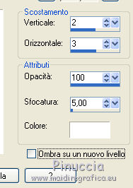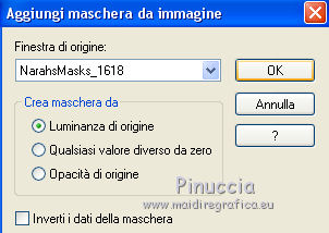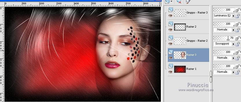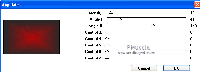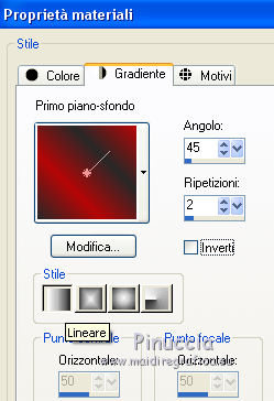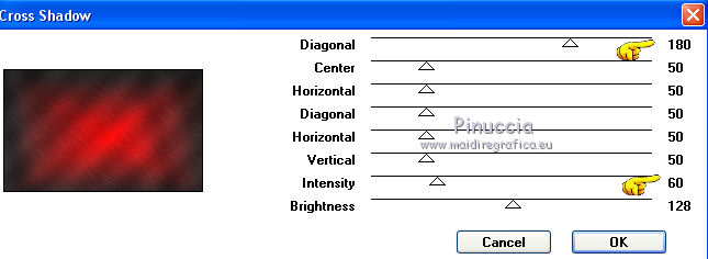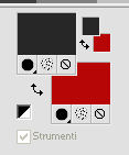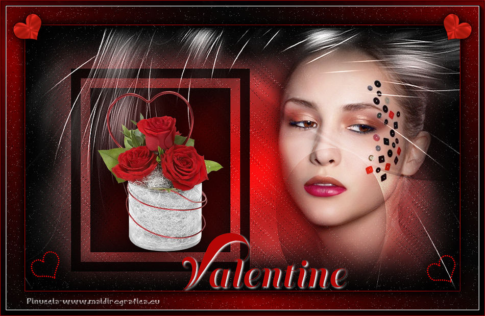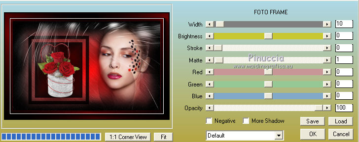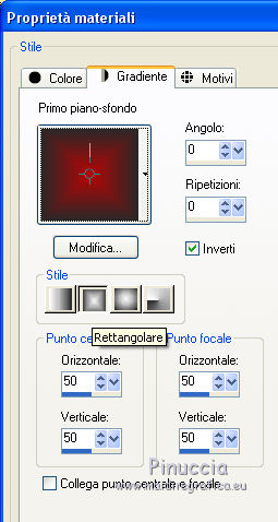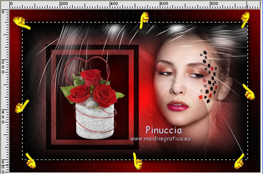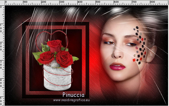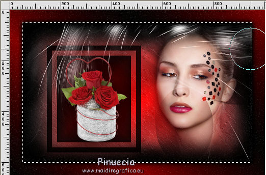 qui puoi trovare qualche risposta ai tuoi dubbi. Se l'argomento che ti interessa non è presente, ti prego di segnalarmelo. Questo tutorial è stato tradotto con PSPX, ma può essere realizzato anche con le altre versioni di PSP. Dalla versione X4, il comando Immagine>Rifletti è stato sostituito con Immagine>Capovolgi in orizzontale, e il comando Immagine>Capovolgi con Immagine>Capovolgi in verticale. Nelle versioni X5 e X6, le funzioni sono state migliorate rendendo disponibile il menu Oggetti. Con la nuova versione X7, sono tornati Rifletti>Capovolgi, ma con nuove varianti. Vedi la scheda sull'argomento qui Le vostre versioniOccorrente: Materiale qui Per il tube e le maschere grazie Maryse e Narah (in questa pagina trovi i links ai siti dei creatori di tubes) Filtri: se hai problemi con i filtri, consulta la mia sezione filtri qui Filters Unlimited 2.0 qui Funhouse - Angulate qui Graphics Plus - Cross Shadow qui AAA Frames - Foto Frame qui I filtri Funhouse e Graphics Plus si possono usare da soli o importati in Filters Unlimited (come fare vedi qui) Se un filtro fornito appare con questa icona ![]() non esitare a cambiare modalità di miscelatura e opacità secondo i colori utilizzati. Nelle ultime versioni di PSP non c'è il gradiente di primo piano/sfondo (Corel_06_029) Puoi usare i gradienti delle versioni precedenti. Trovi qui i gradienti Corel X. Apri le maschere in PSP e minimizzale con il resto del materiale. 1. Imposta il colore di primo piano con #282828 e il color di sfondo con #b60707. ![]() Passa il colore di primo piano a Gradiente di primo piano/sfondo, stile Rettangolare. ![]() Apri una nuova immagine trasparente 900 x 550 pixels. Riempi l'immagine trasparente con il gradiente.2. Regola>Aggiungi/Rimuovi disturbo>Aggiungi disturbo. ![]() 3. Effetti>Plugins>Funhouse - Angulate, con i settaggi standard. ![]() 4. Effetti>Plugins>Graphics Plus - Cross Shadow. ![]() 5. Imposta il colore di sfondo con il colore bianco. Livelli>Nuovo livello raster. Riempi il livello con il colore bianco.Livelli>Nuovo livello maschera>Da immagine. Apri il menu sotto la finestra di origine e vedrai la lista dei files aperti. Seleziona la maschera NarahsMask_1618. ![]() Effetti>Effetti di bordo>Aumenta. Livelli>Unisci>Unisci gruppo. Cambia la modalità di miscelatura di questo livello in Sovrapponi, e abbassa l'opacità al 70%. 6. Livelli>Nuovo livello raster. Selezione>Seleziona tutto. Effetti>Effetti 3D>Ritaglio. ![]() Selezione>Deseleziona. 7. Regola>Aggiungi/Rimuovi disturbo>Aggiungi disturbo, con i settaggi precedenti. ![]() Livelli>Duplica. Immagine>Rifletti. Immagine>Capovolgi. Livelli>Unisci>Unisci giù. 8. Livelli>Nuovo livello raster. Riempi il livello con il colore bianco.Livelli>Nuovo livello maschera>Da immagine. Apri il menu sotto la finestra di origine e seleziona la maschera NarahsMask_1620. ![]() Effetti>Effetti di bordo>Aumenta. Livelli>Duplica. Livelli>Unisci>Unisci gruppo. Cambia la modalità di miscelatura di questo livello in Luminanza (esistente). 9. Apri il tube del viso, cancella la firma e vai a Modifica>Copia. Torna al tuo lavoro e vai a Modifica>Incolla come nuovo livello. Immagine>Ridimensiona, al 75%, tutti i livelli non selezionato. Sposta il tube a destra.I miei settaggi con lo strumento Puntatore ![]() Posizione X: 457,00 e Posizione Y: -52,00. ![]() 10. Livelli>Disponi>Sposta giù - 3 volte (sopra il livello di sfondo) ![]() 11. Attiva il livello con l'effetto Ritaglio (Raster 2). Attiva lo strumento Selezione ![]() (non importa il tipo di selezione impostato, perchè con la selezione personalizzata si ottiene sempre un rettangolo) clicca sull'icona Selezione personalizzata ![]() e imposta i seguenti settaggi. ![]() Imposta il colore di sfondo con il colore iniziale #b60707, per riavere il gradiente Rettangolare ![]() Riempi la selezione con il gradiente.12. Selezione>Modifica>Contrai - 20 pixels. Premi sulla tastiera il tasto CANC ![]() Selezione>Modifica>Contrai - 20 pixels. Riempi con il gradiente.Selezione>Deseleziona. Cambia la modalità di miscelatura di questo livello in Moltiplica. 13. Attiva il livello superiore. Apri il tube del vaso, cancella la firma e vai a Modifica>Copia. Torna al tuo lavoro e vai a Modifica>Incolla come nuovo livello. Immagine>Ridimensiona, al 58%, tutti i livelli non selezionato. Immagine>Rifletti. Sposta il tube nella cornice.![]() 14. Effetti>Effetti 3D>Sfalsa ombra. ![]() 15. Immagine>Aggiungi bordatura, 1 pixel, simmetriche, colore rosso. Selezione>Seleziona tutto. Immagine>Aggiungi bordatura, 50 pixels, simmetriche, colore rosso. Selezione>Inverti. 16. Cambia i settaggi del gradiente, stile Lineare. ![]() Riempi la selezione con il gradiente.17. Selezione>Innalza selezione a livello. Cambia la modalità di miscelatura di questo livello in Moltiplica. Livelli>Unisci>Unisci giù. 18. Regola>Aggiungi/Rimuovi disturbo>Aggiungi disturbo, con i settaggi precedenti. ![]() 19. Selezione>Inverti. Effetti>Effetti 3D>Sfalsa ombra. ![]() Modifica>Ripeti Sfalsa ombra. 20. Mantieni selezionato. Facoltativo: se trovi che i bordi al centro dell'immagine sono un po' troppo grigi, e vuoi farli diventare neri, attiva lo strumento Pennello Schiarisci/Scurisci con i seguenti settaggi: ![]() Passa il pennello sui bordi dell'immagine centrale dove indicato dalle manine (tasto destro del mouse per scurire) Prima ![]() Dopo: ![]() Selezione>Deseleziona. 21. Effetti>Plugins>AAA Frames - Foto Frame. ![]() 22. Apri il tube dei piccoli cuori e seleziona uno dei cuori a tua scelta(io ho usato il cuore in alto a sinistra) Modifica>Copia. Torna al tuo lavoro e vai a Modifica>Incolla come nuovo livello. Immagine>Ridimensiona, al 45%, tutti i livelli non selezionato. Immagine>Ruota per gradi - 35 gradi a sinistra ![]() Sposta il tube in alto a sinistra.23. Livelli>Duplica. Immagine>Rifletti. Livelli>Unisci>Unisci giù. Effetti>Effetti 3D>Sfalsa ombra, con i settaggi precedenti. Se vuoi, aggiungi altri piccoli cuori. 24. Aggiungi il tube titre, o scrivi il tu