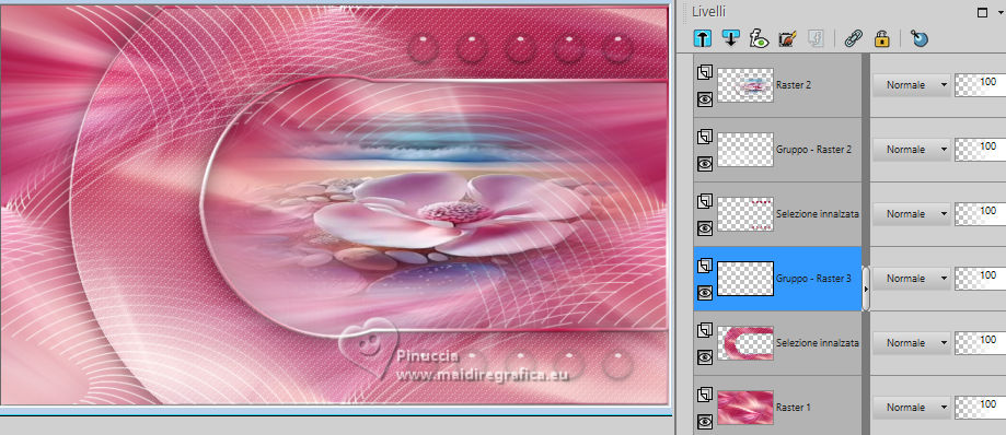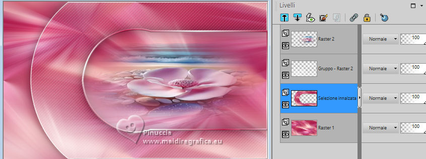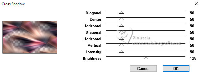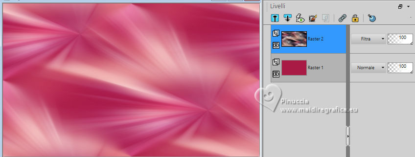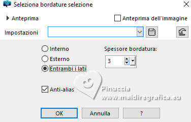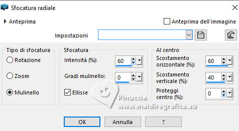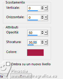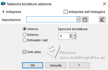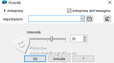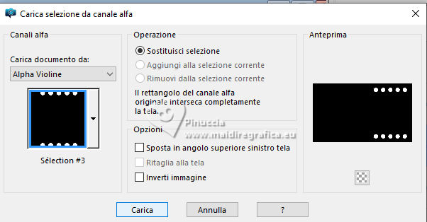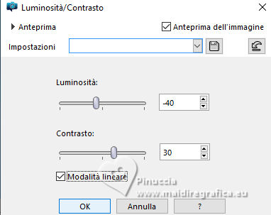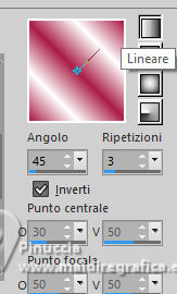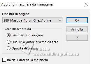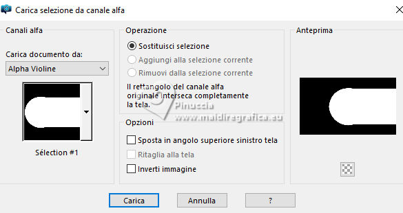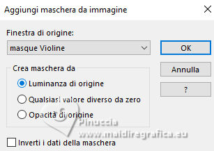 qui puoi trovare qualche risposta ai tuoi dubbi. Se l'argomento che ti interessa non è presente, ti prego di segnalarmelo. Questo tutorial è stato tradotto con PSPX7, ma può essere realizzato con le versioni più antiche. Dalla versione X4, il comando Immagine>Rifletti è stato sostituito con Immagine>Capovolgi in orizzontale, e il comando Immagine>Capovolgi con Immagine>Capovolgi in verticale. Nelle versioni X5 e X6, le funzioni sono state migliorate rendendo disponibile il menu Oggetti. Con la nuova versione X7, sono tornati Rifletti>Capovolgi, ma con nuove varianti. Vedi la scheda sull'argomento qui Traduzione inglese qui Le vostre versioni qui![]() Occorrente: ![]() (in questa pagina trovi i links ai siti dei creatori di tubes) Filtri: in caso di dubbi, ricorda di consultare la mia sezione filtri qui Filters Unlimited 2.0 qui Graphics Plus - Cross Shadow qui Alien Skin Eye Candy 5 Impact - qui I filtri Graphics Plus si possono usare da soli o importati in Filters Unlimited (come fare vedi qui) Se un filtro fornito appare con questa icona ![]() non esitare a cambiare modalità di miscelatura e opacità secondo i colori utilizzati. Nelle ultime versioni di PSP non c'è il gradiente di primo piano/sfondo (Corel_06_029) Puoi usare i gradienti delle versioni precedenti. Trovi qui i gradienti Corel X. ![]() Apri le maschere in PSP e minimizzale con il resto del materiale. Imposta il colore di primo con il colore bianco #ffffff, e il colore di sfondo con #a91c45. ![]() Apri Alpha violine Finestra>Duplica o sulla tastiera maiuscola+D per fare una copia. ![]() Chiudi l'originale. La copia, che sarà la base del tuo lavoro, non é vuota, ma contiene una selezione salvata sul canale alfa. Riempi l'immagine trasparente con il colore di sfondo.Livelli>Nuovo livello raster. Selezione>Seleziona tutto. Apri il tube principale 458-Tube232_deVioline_050624 ![]() Cancella il watermark e vai a Modifica>Copia. Minimizza il tube. Torna al tuo lavoro e vai a Modifica>Incolla nella selezione. Selezione>Deseleziona. 2. Regola>Sfocatura>Sfocatura radiale. ![]() 3. Effetti>Effetti di immagine>Motivo unico, con i settaggi standard. ![]() Cambia la modalità di miscelatura di questo livello in Filtra. ![]() 4. Effetti>Plugins>Graphics Plus - Cross Shadow. ![]() Effetti>Effetti di bordo>Aumenta. Livelli>Unisci>Unisci giù. 5. Livelli>Nuovo livello raster. Riempi il livello con il colore bianco di primo piano #ffffff.Livelli>Nuovo livello maschera>Da immagine. Apri il menu sotto la finestra di origine e vedrai la lista dei files aperti. e seleziona la maschera 280_Masque_ForumChezVioline ![]() Effetti>Effetti di bordo>Aumenta. Regola>Luminosità e contrasto>Luminosità e contrasto ![]() Livelli>Unisci>Unisci gruppo. 6. Livelli>Nuovo livello raster. Selezione>Carica/Salva selezione>Carica selezione da canale alfa. La selezione Sélection #1 è subito disponibile. Devi soltanto cliccare Carica. ![]() Apri il misted dei fiori MerCreachouVioline_01 ![]() Cancella il watermark e vai a Modifica>Copia. Torna al tuo lavoro e vai a Modifica>Incolla nella selezione. Mantieni selezionato. 7. Effetti>Effetti 3D>Sfalsa ombra, colore nero. ![]() 8. Selezione>Modifica>Seleziona bordature selezione. ![]() Passa il colore di primo piano a Gradiente di primo piano/sfondo, stile Lineare. ![]() Riempi la selezione con il gradiente.Effetti>Effetti 3D>Smusso a incasso. ![]() Selezione>Deseleziona. 9. Attiva il livello Raster 1. ![]() Selezione>Carica/Salva selezione>Carica selezione da canale alfa. Apri il menu delle selezioni e carica la selezione Sélection 2 ![]() Selezione>Innalza selezione a livello. 10. Effetti>Effetti di trama>Intessitura - colore intessitura bianco. ![]() Effetti>Effetti 3D>Sfalsa ombra, con i settaggi precedenti. ![]() 11. Selezione>Modifica>Seleziona bordature selezione, Interno selezionato. ![]() Riempi la selezione con il gradiente.Effetti>Effetti 3D>Smusso a incasso, con i settaggi precedenti. ![]() Selezione>Deseleziona. 12. Rimani su questo livello (Selezione innalzata). ![]() Selezione>Carica/Salva selezione>Carica selezione da canale alfa. Apri il menu delle selezioni e carica la selezione Sélection 3 ![]() Selezione>Innalza selezione a livello. Effetti>Plugins>Alien Skin Eye Candy 5 Impact - Glass. ![]() Selezione>Deseleziona. 13. Livelli>Nuovo livello raster. Riporta il colore di primo piano a Colore. Riempi il livello con il colore bianco di primo piano #ffffff.Livelli>Nuovo livello maschera>Da immagine. Apri il menu sotto la finestra di origine e seleziona la maschera Masque Violine ![]() Livelli>Unisci>Unisci gruppo. 14. Livelli>Disponi>Sposta giù. I tuoi livelli ![]() 15. Facoltativo: attiva il livello superiore. Regola>Tonalità e Saturazione>Vivacità, a 25, o secondo la tua immagine ![]() 16. Attiva il livello Raster 1. Modifica>Copia 17. Immagine>Aggiungi bordatura, 2 pixels, simmetriche, colore di sfondo. 18. Selezione>Seleziona tutto. Immagine>Aggiungi bordatura, 15 pixels, simmetriche, colore bianco. Effetti>Effetti 3D>Sfalsa ombra, colore di sfondo. ![]() Selezione>Deseleziona. 19. Immagine>Aggiungi bordatura, 1 pixel, simmetriche, colore di sfondo. Selezione>Seleziona tutto. Immagine>Aggiungi bordatura, 15 pixels, simmetriche, con un colore qualsiasi. Selezione>Inverti. Modifica>Incolla nella selezione. Selezione>Inverti. Effetti>Effetti 3D>Sfalsa ombra, colore nero. ![]() Selezione>Deseleziona. 20. Immagine>Aggiungi bordatura, 2 pixels, simmetriche, colore di sfondo. Immagine>Aggiungi bordatura, 2 pixels, simmetriche, colore bianco. 21. Attiva nuovamente il tube principale 458-Tube232_deVioline_050624 e vai a Modifica>Copia. Torna al tuo lavoro e vai a Modifica>incolla come nuovo livello. Immagine>Rifletti>Rifletti orizzontalmente. Immagine>Ridimensiona, all'80%, tutti i livelli non selezionato. Sposta il tube a sinistra.Effetti>Effetti 3D>Sfalsa ombra, a scelta. 22. Firma il tuo lavoro. Immagine>Aggiungi bordatura, 1 pixel, simmetriche, colore di sfondo. Salva in formato jpg. Per 