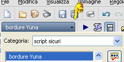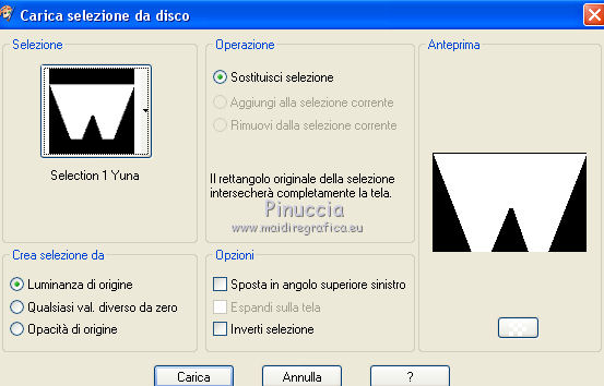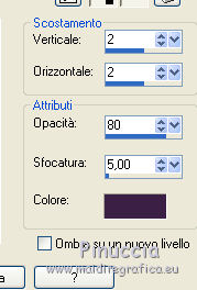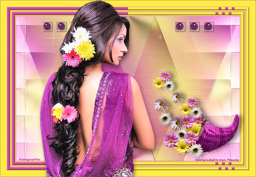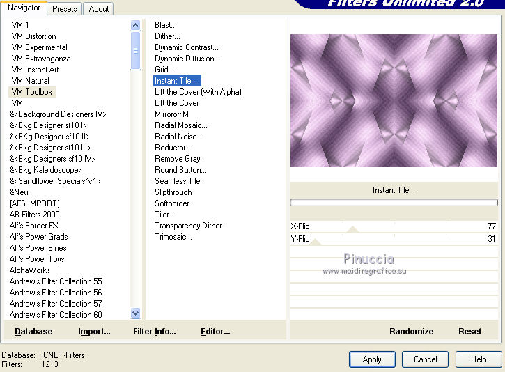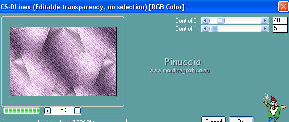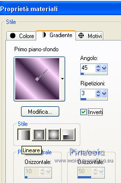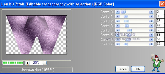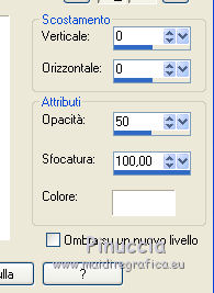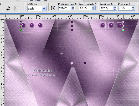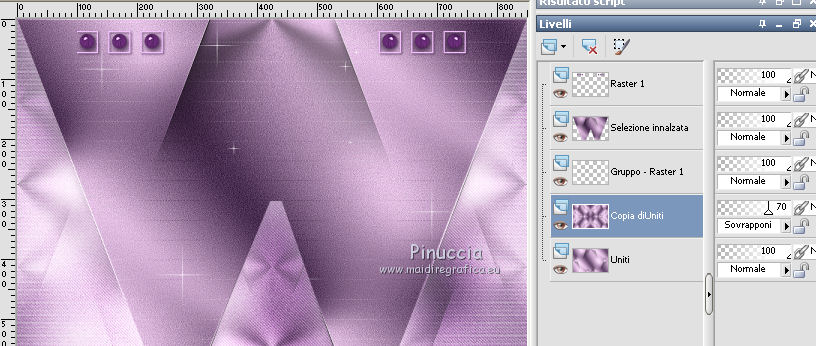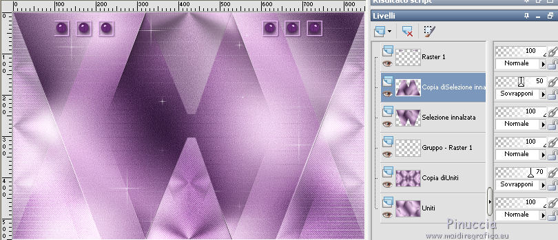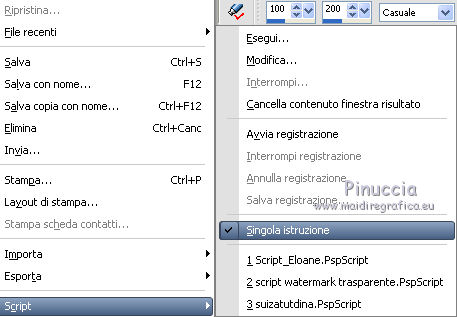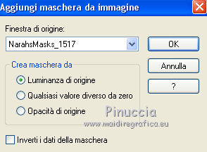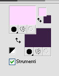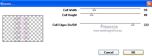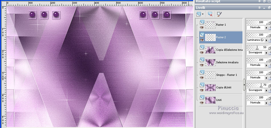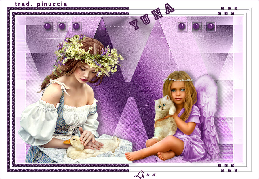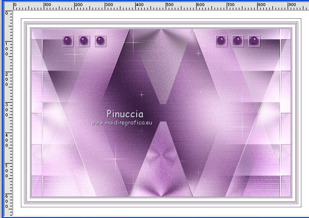 qui puoi trovare qualche risposta ai tuoi dubbi. Se l'argomento che ti interessa non è presente, ti prego di segnalarmelo. Questo tutorial è stato tradotto con PSPX, ma può essere realizzato anche con le altre versioni di PSP. Dalla versione X4, il comando Immagine>Rifletti è stato sostituito con Immagine>Capovolgi in orizzontale, e il comando Immagine>Capovolgi con Immagine>Capovolgi in verticale. Nelle versioni X5 e X6, le funzioni sono state migliorate rendendo disponibile il menu Oggetti. Con la nuova versione X7, sono tornati Rifletti>Capovolgi, ma con nuove varianti. Vedi la scheda sull'argomento qui Le vostre versioni Occorrente: Materiale qui Per la maschera grazie Narah. Il resto del materiale è di Colybrix (in questa pagina trovi i links ai siti dei creatori di tubes) Filtri: se hai problemi con i filtri, consulta la mia sezione filtri qui L&K's - L&K's - Zitah qui Carolaine and Sensibility - CS-DLines qui Toadies - Weaver qui Simple - Half Wrap qui VM Natural - Sparkle qui VM Toolbox - Instant Tile qui Filters Unlimited 2.0 qui I filtri Toadies, VM Natural, VM Toolbox e Simple si possono usare da soli o importati in Filters Unlimited (come fare vedi qui) Se un filtro fornito appare con questa icona ![]() non esitare a cambiare modalità di miscelatura e opacità secondo i colori utilizzati. Nelle ultime versioni di PSP non c'è il gradiente di primo piano/sfondo (Corel_06_029) Puoi usare i gradienti delle versioni precedenti. Trovi qui i gradienti Corel X. Metti lo script nella cartella Script. Metti le selezioni nella cartella Selezioni. Apri la maschera in PSP e minimizzala con il resto del materiale. 1. Imposta il colore di primo piano con il colore chiaro #ffd8ff, e il colore di sfondo con il colore scuro #3c2044. ![]() Passa il colore di primo piano a Gradiente di primo piano/sfondo, stile Lineare. ![]() 2. Apri una nuova immagine trasparente 850 x 550 pixels. Riempi l'immagine trasparente con il gradiente.3. Regola>Sfocatura>Sfocatura gaussiana - raggio 30. ![]() 4. Regola>Aggiungi/Rimuovi disturbo>Aggiungi disturbo ![]() 5. Livelli>Duplica. Effetti>Effetti geometrici>Prospettiva verticale. ![]() 6. Effetti>Effetti di immagine>Motivo univo, con i settaggi standard. ![]() Effetti>Effetti di bordo>Aumenta. 7. Effetti>Effetti 3D>Sfalsa ombra, colore nero. ![]() 8. Di nuovo Effetti>Effetti 3D>Sfalsa ombra, colore nero. ![]() 9. Livelli>Unisci>Unisci visibile. 10. Selezione>Carica/Salva selezione>Carica selezione da disco. Cerca e carica la selezione Selection 1 Yuna. ![]() Selezione>Innalza selezione a livello. 11. Effetti>Plugins>L&K's - L&K's Zitah, con i settaggi standard. ![]() 12. Effetti>Plugins>Filters Unlimited 2.0 - VM Natural - Sparkle, con i settaggi standard. ![]() Selezione>Deseleziona. 13. Attiva il livello inferiore. Effetti>Plugins>Carolaine and Sensibility - CS-DLines, con i settaggi standard. ![]() 14. Attiva nuovamente il livello superiore. Effetti>Effetti 3D>Sfalsa ombra, colore bianco. ![]() 15. Imposta il colore di primo piano con il colore bianco. Livelli>Nuovo livello raster. Riempi il livello con il colore bianco.Livelli>Nuovo livello maschera>Da immagine. Apri il menu sotto la finestra di origine e vedrai la lista dei files aperti. Seleziona la maschera NarahsMasks_1517 ![]() Regola>Messa a fuoco>Metti a fuoco. Livelli>Unisci>Unisci gruppo. Livelli>Disponi>Sposta giù. 16. Attiva ancora il livello superiore. Apri il tube déco 1 e vai a Modifica>Copia. Torna al tuo lavoro e vai a Modifica>Incolla come nuovo livello. Strumento Puntatore ![]() e imposta Posizione Y: 17,00 (mantieni Posizione X: 100,00) ![]() 17. Effetti>Effetti 3D>Sfalsa ombra, colore scuro. ![]() 18. Attiva il livello di sfondo. Livelli>Duplica. Effetti>Plugins>Filters Unlimited 2.0 - VM Toolbox - Instant Tile, con i settaggi standard. ![]() 19. Cambia la modalità di miscelatura di questo livello in Sovrapponi, e abbassa l'opacità al 70%. ![]() 20. Attiva il livello Selezione innalzata (il secondo livello dall'alto). Livelli>Duplica. Immagine>Capovolgi. Cambia la modalità di miscelatura di questo livello in Sovrapponi, e abbassa l'opacità al 50%. ![]() 21. Livelli>Nuovo livello raster. Selezione>Carica/Salva selezione>Carica selezione da disco. Cerca e carica la selezione Selection 2 Yuna. ![]() Riempi la selezione con il colore bianco.Selezione>Modifica>Contrai - 3 pixels. Premi sulla tastiera il tasto CANC ![]() Abbassa l'opacità dello strumento Riempimento a 50 Imposta nuovamente il colore di primo piano con il colore chiaro Riempi la selezione con il colore chiaro di primo piano.Selezione>Deseleziona. Riporta l'opacità dello strumento Riempimento a 100. 22. Importante: imposta il colore di sfondo con il colore bianco. Effetti>Plugins>Toadies - Weaver, con i settaggi standard. ![]() 23. Effetti>Plugins>Simple - Half Wrap. Cambia la modalità di miscelatura di questo livello in Luminanza (esistente). Effetti>Effetti di bordo>Aumenta. ![]() 24. Prima di avviare lo script, salva il tuo lavoro per precauzione. Imposta nuovamente il colore di sfondo con il colore scuro 25. Se non visualizzi la barra degli scripts: Visualizza>Barre strumenti>Script. Apri il menu e seleziona lo script . ![]() Se vuoi cambiare i colori dei bordi, attiva la modalità di esecuzione; in questo modo potrai cambiarli. ![]() oppure, puoi anche attivare la funzione da File>Script>Singola istruzione ![]() Clicca sulla freccia nera (blu nelle versioni più recenti) per avviare lo script. ![]() Se stai usando una versione precedente a quella con la quale è stato creato lo script, avrai questo messaggio ![]() Trattandosi di semplici bordi, non avrai problemi; clicca ok per continuare e avrai questo ![]() ***************** Questi i passaggi dello script: Immagine>Aggiungi bordatura, 1 pixel, simmetriche, colore scuro. Immagine>Aggiungi bordatura, 3 pixels, simmetriche, colore bianco. Immagine>Aggiungi bordatura, 1 pixel, simmetriche, colore scuro. Immagine>Aggiungi bordatura, 10 pixels, simmetriche, color