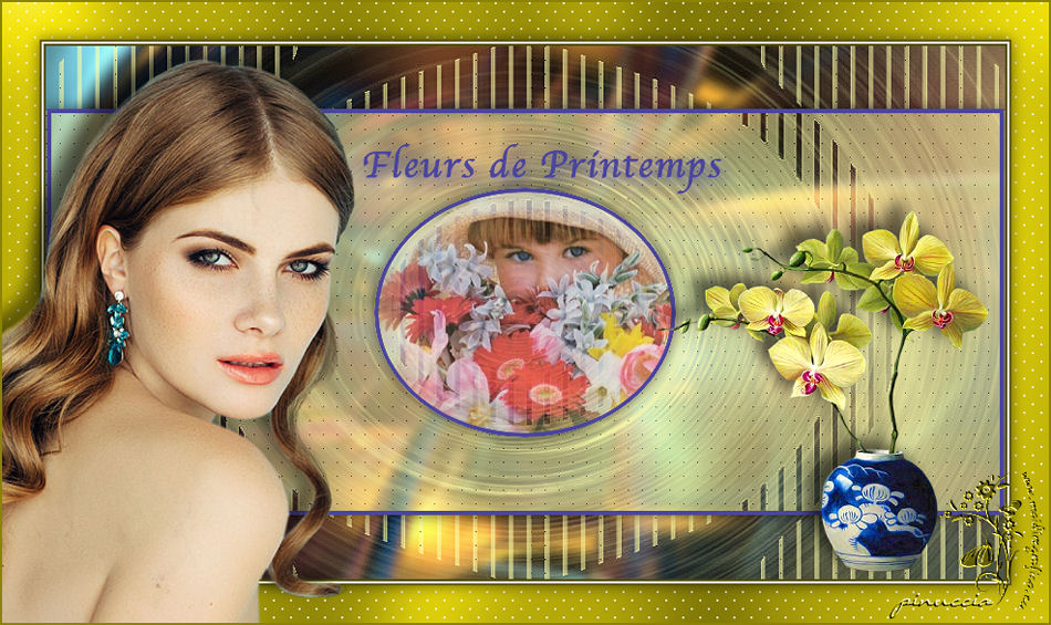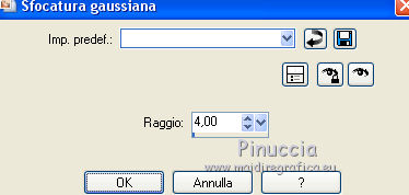 qui puoi trovare qualche risposta ai tuoi dubbi. Se l'argomento che ti interessa non è presente, ti prego di segnalarmelo. Questo tutorial è stato realizzato con Corel19 e tradotto con Corel X, ma può essere realizzato anche con le altre versioni di PSP. Dalla versione X4, il comando Immagine>Rifletti è stato sostituito con Immagine>Capovolgi in orizzontale, e il comando Immagine>Capovolgi con Immagine>Capovolgi in verticale. Nelle versioni X5 e X6, le funzioni sono state migliorate rendendo disponibile il menu Oggetti. Con la nuova versione X7, sono tornati Rifletti>Capovolgi, ma con nuove varianti. Vedi la scheda sull'argomento qui Occorrente: Materiale qui Filtri: se hai problemi con i filtri, consulta la mia sezione filtri qui AP 01 Innovations - Lines SilverLining qui ![]() non esitare a cambiare modalità di miscelatura e opacità secondo i colori utilizzati. Nelle ultime versioni di PSP non c'è il gradiente di primo piano/sfondo (Corel_06_029) Puoi usare i gradienti delle versioni precedenti. Trovi qui i gradienti Corel X. Apri le maschere e il motivo "point" in PSP e minimizzali con il resto del materiale. Imposta il colore di primo piano con #ffffff, e il colore di sfondo con #66422b. ![]() 1. Apri Alpha fleursdeprintemps. Finestra>Duplica, o sulla tastiera maiuscola+D, per fare una copia. ![]() Chiudi l'originale. La copia, che sarà la base del tuo lavoro, non è vuota, ma contiene le selezioni salvate sul canale alfa. 2. Selezione>Seleziona tutto. Apri l'immagine di sfondo "créa fleurs de printemps" e vai a Modifica>Copia. Torna al tuo lavoro e vai a Modifica>Incolla nella selezione. Selezione>Deseleziona. Regola>Sfocatura>Sfocatura gaussiana - raggio 4. ![]() 3. Imposta il colore di primo piano con il colore bianco. Livelli>Nuovo livello raster. Riempi il livello con il colore bianco.4. Livelli>Nuovo livello maschera>Da immagine. Apri il menu sotto la finestra di origine e vedrai la lista dei files aperti. Seleziona la maschera Coly-mask33. ![]() Effetti>Effetti di bordo>Aumenta. Livelli>Unisci>Unisci gruppo. 5. Livelli>Nuovo livello raster. Riempi il livello con il colore bianco.6. Livelli>Nuovo livello maschera>Da immagine. Apri il menu sotto la finestra di origine e seleziona la maschera NarahMask1032. ![]() Effetti>Effetti di bordo>Aumenta. Livelli>Unisci>Unisci gruppo. 7. Effetti>Plugins>AP 01 Innovations - Lines SilverLining. ![]() Abbassa l'opacità di questo livello all'80%. ![]() 8. Selezione>Carica/Salva selezione>Carica selezione da canale alfa. La selezione sélection#1 è subito disponibile. Devi soltanto cliccare Carica. ![]() Livelli>Nuovo livello raster. Riempi la selezione con il colore scuro di sfondo.9. Selezione>Modifica>Contrai - 4 pixels. Premi sulla tastiera il tasto CANC ![]() 10. Selezione>Carica/Salva selezione>Carica selezione da canale alfa. Carica nuovamente la selezione sélection#1. ![]() Effetti>Effetti 3D>Sfalsa ombra. ![]() Selezione>Deseleziona. 11. Livelli>Unisci>Unisci visibile. 12. Selezione>Carica/Salva selezione>Carica selezione da canale alfa. Apri il menu delle selezioni e carica sélection#2. ![]() Selezione>Innalza selezione a livello. Effetti>Effetti 3D>Sfalsa ombra, con i settaggi precedenti. 13. Livelli>Nuovo livello raster. Riempi con il colore scuro.Selezione>Modifica>Contrai - 4 pixels. Premi sulla tastiera il tasto CANC. Selezione>Deseleziona. 14. Apri il misted dei fiori e vai a Modifica>Copia. Torna al tuo lavoro e vai a Modifica>Incolla come nuovo livello. Immagine>Ridimensiona, al 65%, tutti i livelli non selezionato. 15. Selezione>Carica/Salva selezione>Carica selezione da canale alfa. Apri il menu delle selezioni e carica nuovamente sélection#2. ![]() Posiziona correttamente il tube sulla selezione.Selezione>Inverti. Premi sulla tastiera il tasto CANC. Selezione>Deseleziona. 16. Livelli>Disponi>Sposta giù. Abbassa l'opacità di questo livello all'80%. ![]() 17. Livelli>Unisci>Unisci tutto. Modifica>Copia. 18. Imposta il colore di primo piano con il colore chiaro #fffdaa. ![]() Immagine>Aggiungi bordatura, 2 pixels, simmetriche, colore scuro. Immagine>Aggiungi bordatura, 2 pixels, simmetriche, colore chiaro. Immagine>Aggiungi bordatura, 2 pixels, simmetriche, colore scuro. 19. Immagine>Aggiungi bordatura, 35 pixels, simmetriche, colore chiaro. Attiva lo strumento Bacchetta magica ![]() e clicca nel bordo per selezionarlo. Modifica>Incolla nella selezione. 20. Regola>Sfocatura>Sfocatura gaussiana - raggio 30. ![]() 21. Se non lo hai fatto prima di iniziare, apri il motivo "point" e minimizzalo. Passa il colore di primo piano a Motivi e, sotto la categoria Immagini aperte, seleziona il motivo "point" con i seguenti settaggi. ![]() 22. Livelli>Nuovo livello raster. Riempi la selezione con il motivo.Abbassa l'opacità di questo livello al 70%. ![]() 23. Selezione>Inverti. Effetti>Effetti 3D>Sfalsa ombra. ![]() Selezione>Deseleziona. 24. Apri il tube della donna, cancella la firma e vai a Modifica>Copia. Torna al tuo lavoro e vai a Modifica>Incolla come nuovo livello. Immagine>Ridimensiona, all'80%, tutti i livelli non selezionato. 25. Per posizionare il tube: tasto K per attivare lo strumento Puntatore ![]() e imposta Posizione X: 21,00 e Posizione Y: 15.00. ![]() 26. Effetti>Effetti 3D>Sfalsa ombra. ![]() 27. Apri il tube del vaso di fiori di Maryse, cancella la firma e vai a Modifica>Copia. Torna al tuo lavoro e vai a Modifica>Incolla come nuovo livello. Immagine>Ridimensiona, al 75%, tutti i livelli non selezionato. Spostalo a destra.Effetti>Effetti 3D>Sfalsa ombra, con i settaggi precedenti. 28. Apri il tube texte (o scrivi un tuo testo) e vai a Modifica>Copia. Torna al tuo lavoro e vai a Modifica>Incolla come nuovo livello. Posiziona il testo dove preferisci.La mia posizione: ![]() 29. Effetti>Effetti 3D>Sfalsa ombra, colore scuro. ![]() 30. Firma il tuo lavoro. 31. Immagine>Aggiungi bordatura, 2 pixels, simmetriche, colore scuro. 32. Immagine>Ridimensiona, 900 pixels di larghezza, o come preferisci, tutti i li