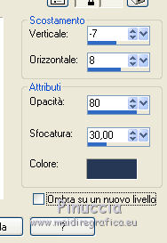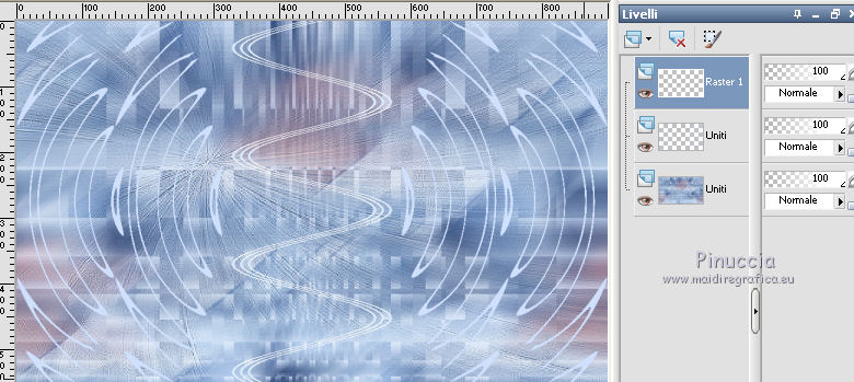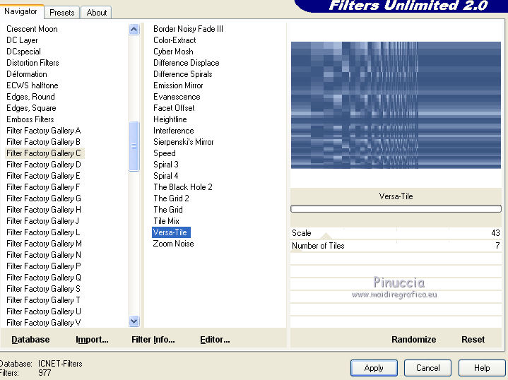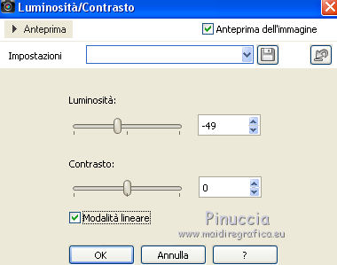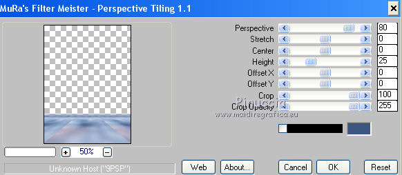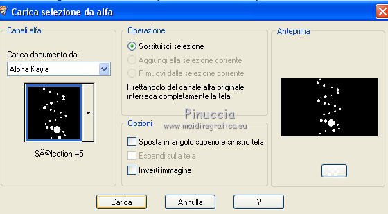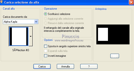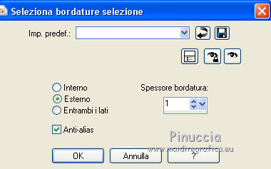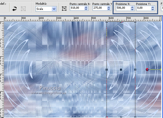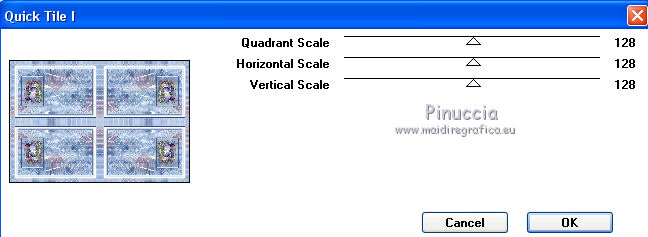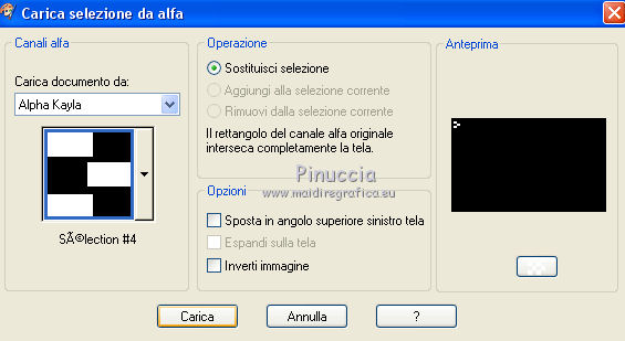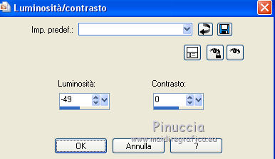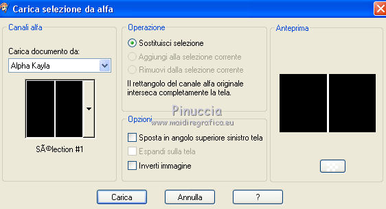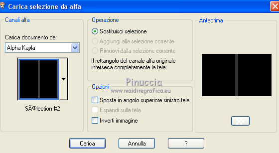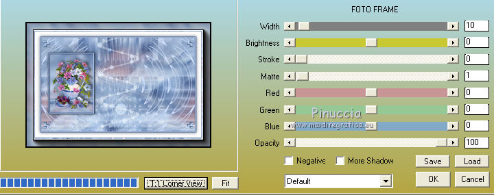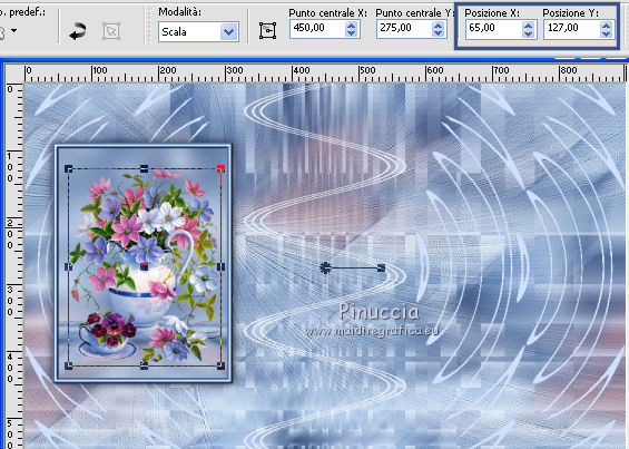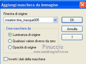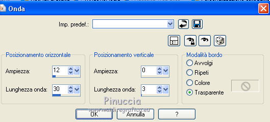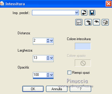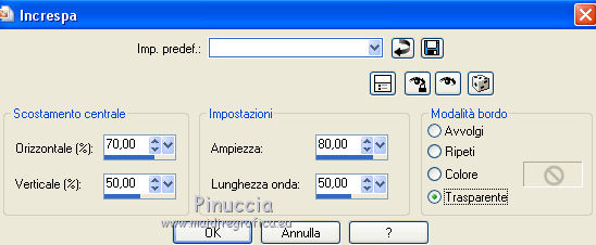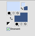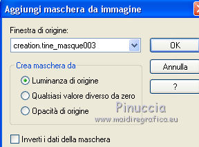 qui puoi trovare qualche risposta ai tuoi dubbi. Se l'argomento che ti interessa non è presente, ti prego di segnalarmelo. Questo tutorial è stato tradotto con Corel X, ma può essere realizzato anche con le altre versioni di PSP. Dalla versione X4, il comando Immagine>Rifletti è stato sostituito con Immagine>Capovolgi in orizzontale, e il comando Immagine>Capovolgi con Immagine>Capovolgi in verticale. Nelle versioni X5 e X6, le funzioni sono state migliorate rendendo disponibile il menu Oggetti. Con la nuova versione X7, sono tornati Rifletti>Capovolgi, ma con nuove varianti. Vedi la scheda sull'argomento qui Occorrente: Materiale qui Grazie: per il tube dei fiori Cal e per le maschere Tine. Il resto del materiale è di Colybrix. (in questa pagina trovi i links ai siti dei creatori di tubes) Filtri: se hai problemi con i filtri, consulta la mia sezione filtri qui Mura's Meister qui Graphics Plus - Quick Tile I qui Filters Unlimited 2.0 qui Filter Factory Gallery C - Versa Tile qui Simple - Top Left Mirror qui AAA Frames - Foto Frame qui I filtri Graphics Plus, Factory Gallery e Simple si possono usare da soli o importati in Filters Unlimited (come fare vedi qui) Se un filtro fornito appare con questa icona ![]() non esitare a cambiare modalità di miscelatura e opacità secondo i colori utilizzati. Apri le maschere in PSP e minimizzale con il resto del materiale. 1. Imposta il colore di primo piano con il colore chiaro #cfe0fc, e il colore di sfondo con il colore scuro #3b5583. ![]() Apri Alpha kayla. Finestra>Duplica, o sulla tastiera maiuscola+D per fare una copia. ![]() Chiudi l'originale. La copia, che sarà la base del tuo lavoro, non è vuota, ma contiene le selezioni salvate sul canale alfa. Riempi l'immagine trasparente con il colore scuro.2. Livelli>Nuovo livello raster. Riempi il livello con il colore chiaro.3. Livelli>Nuovo livello maschera>Da immagine Apri il menu sottola finestra di origine e vedrai la lista dei files aperti. Seleziona la maschera creation.tine_masque003. ![]() Effetti>Effetti di bordo>Aumenta. Livelli>Unisci>Unisci gruppo. 4. Livelli>Duplica. 5. Livelli>Unisci>Unisci visibile. 6. Effetti>Plugins>Filter Factory Gallery C - Versa Tile, con i settaggi standard. ![]() 7. Effetti>Effetti di riflesso>Specchio rotante. ![]() 8. Livelli>Nuovo livello raster. Selezione>Seleziona tutto. 9. Apri il tube della donna, cancella la firma, e vai a Modifica>Copia. Torna al tuo lavoro e vai a Modifica>Incolla nella selezione. Selezione>Deseleziona. 10. Effetti>Effetti di immagine>Motivo unico. ![]() 11. Regola>Sfocatura>Sfocatura da movimento. ![]() 12. Livelli>Nuovo livello maschera>Da immagine Apri il menu sottola finestra di origine e seleziona la maschera creation.tine_masque005. ![]() Regola>Luminosità e contrasto>Luminosità e contrasto. ![]() nelle versioni meno recenti: ![]() Livelli>Unisci>Unisci gruppo. 13. Effetti>Effetti di bordo>Aumenta - 2 volte. Cambia la modalità di miscelatura di questo livello in Filtra. 14. Livelli>Unisci>Unisci visibile. 15. Livelli>Nuovo livello raster. Selezione>Carica/Salva selezione>Carica selezione da canale alfa. La selezione Sélection#1 è subito disponibile. Devi soltanto cliccare Carica. ![]() Riempi la selezione con il colore chiaro.Selezione>Deseleziona. 16. Effetti>Effetti di distorsione>Increspa. ![]() 17. Oggetti>Allinea>Sinistra. Se stai usando una versione precedente che non dispone del menu Oggetti, usa lo strumento Spostamento ![]() per spostare l'immagine contro il bordo sinistro. ![]() 18. Livelli>Duplica. Immagine>Rifletti. 19. Di nuovo Livelli>Duplica. Tasto K per attivare lo strumento Puntatore ![]() e imposta Posizione X: 586,00 e Posizione Y: 0. ![]() 20. Ancora Livelli>Duplica. Immagine>Rifletti. Chiudi il livello inferiore. Livelli>Unisci>Unisci visibile. Riapri il livello inferiore e rimani posizionato sul livello Uniti. 21. Livelli>Nuovo livello raster. Selezione>Carica/Salva selezione>Carica selezione da canale alfa. Apri il menu delle selezioni e carica Sélection#2 ![]() Riempi la selezione con il colore chiaro.Selezione>Deseleziona. 22. Effetti>Effetti di distorsione>Onda. ![]() Regola>Messa a fuoco>Metti a fuoco. 23. In questo momento dovresti avere questo ![]() 24. Attiva il livello di sfondo. Selezione>Carica/Salva selezione>Carica selezione da canale alfa. Apri il menu delle selezioni e carica Sélection#3 ![]() Selezione>Innalza selezione a livello. Livelli>Disponi>Porta in alto. 25. Regola>Sfocatura>Sfocatura gaussiana - raggio 10. ![]() Mantieni selezionato. 26. Livelli>Nuovo livello raster. Riempi con il colore scuro.Selezione>Modifica>Contrai - 3 pixels. Riempi con il colore chiaro.27. Selezione>Modifica>Contrai - 3 pixels. Riempi con il colore scuro.28. Selezione>Modifica>Contrai - 3 pixels. Premi sulla tastiera il tasto CANC ![]() Mantieni sempre selezionato. 29. Attiva il livello sottostante. Livelli>Duplica. Effetti>Plugins>Mura's Meister - Perspective Tiling. ![]() Selezione>Deseleziona. 30. Attiva nuovamente il livello superiore del bordo. Effetti>Effetti 3D>Smusso a incasso. ![]() 31. Livelli>Unisci>Unisci giù - 2 volte. Effetti>Effetti 3D>Sfalsa ombra, colore nero. ![]() 32. Apri il tube del vaso di Cal, cancella la firma, e vai a Modifica>Copia. Torna al tuo lavoro e vai a Modifica>Incolla come nuovo livello. Immagine>Ridimensiona, al 35%, tutti i livelli non selezionato. Posiziona il tube al centro.La mia posizione ![]() Regola>Messa a fuoco>Metti a fuoco. 33. Effetti>Effetti 3D>Sfalsa ombra, colore nero. ![]() 34. Attiva il livello di sfondo. Selezione>Carica/Salva selezione>Carica selezione da canale alfa. Apri il menu delle selezioni e carica Sélection#4 ![]() Selezione>Innalza selezione a livello. Livelli>Disponi>Porta in alto. Effetti>Effetti 3D>Smusso a incasso, con i settaggi precedenti. 35. Selezione>Modifica>Seleziona bordature selezione. ![]() Riempi la selezione con il colore scuro.Selezione>Deseleziona. 36. Effetti>Plugins>Simple - Top Left Mirror. 37. Livelli>Nuovo 