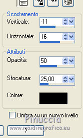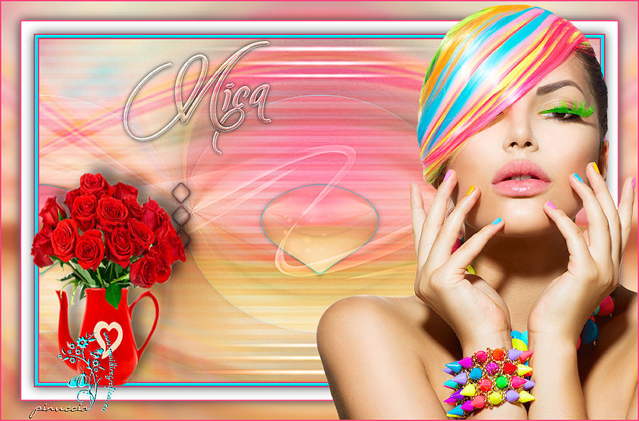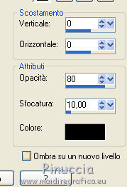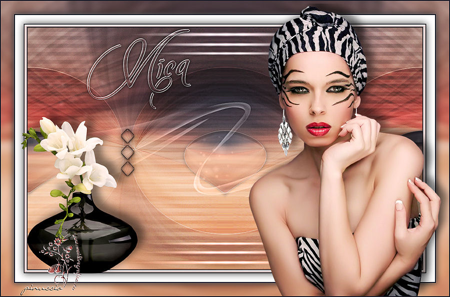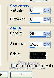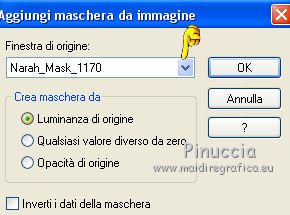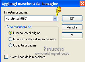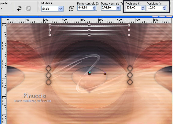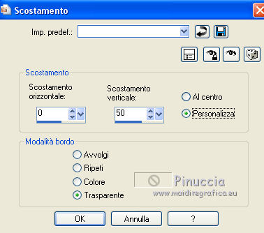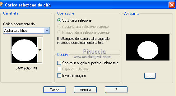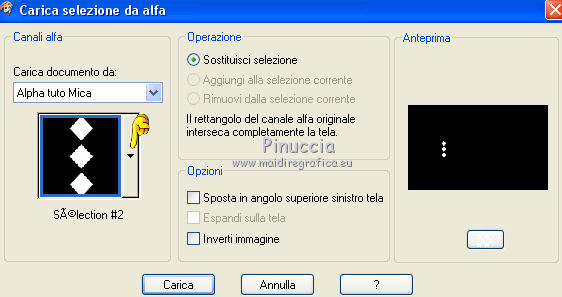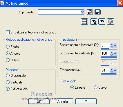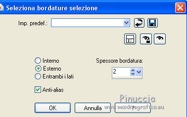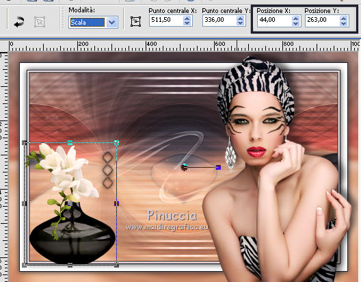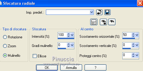 qui puoi trovare qualche risposta ai tuoi dubbi. Se l'argomento che ti interessa non è presente, ti prego di segnalarmelo. Questo tutorial è stato realizzato con Corel19 e tradotto con Corel X, ma può essere realizzato anche con le altre versioni di PSP. Dalla versione X4, il comando Immagine>Rifletti è stato sostituito con Immagine>Capovolgi in orizzontale, e il comando Immagine>Capovolgi con Immagine>Capovolgi in verticale. Nelle versioni X5 e X6, le funzioni sono state migliorate rendendo disponibile il menu Oggetti. Con la nuova versione X7, sono tornati Rifletti>Capovolgi, ma con nuove varianti. Vedi la scheda sull'argomento qui Occorrente: Tubes a scelta. Il resto del materiale qui I tubes usati, e non forniti, sono di Mica. Trovi il tube della donna qui Il tube del vaso qui Filtri: se hai problemi con i filtri, consulta la mia sezione filtri qui Filters Unlimited 2.0 qui AFS IMPORT - Splitdis qui Flaming Pear - Flexify 2 qui Carolaine and Sensibility qui Alien skin Eye Candy 5 Impact - Glass qui I filtri AFS IMPORT si possono usare da soli o importati in Filters Unlimited (come fare vedi qui) Se un filtro fornito appare con questa icona ![]() non esitare a cambiare modalità di miscelatura e opacità secondo i colori utilizzati. Apri la maschera in PSP e minimizzala con il resto del materiale. 1. Imposta il colore di primo piano con il colore scuro #1c1e2b, e il colore di sfondo con il colore chiaro #edd9d8. ![]() Apri Alpha tuto Mica. Finestra>Duplica, o sulla tastiera maiuscola+D, per fare una copia ![]() Chiudi l'originale. La copia, che sarà la base del tuo lavoro, non è vuota, ma contiene le selezioni salvate sul canale alfa. Riempi l'immagine trasparente con il colore scuro di primo piano.2. Livelli>Nuovo livello raster. Selezione>Seleziona tutto. Apri il tube della donna e vai a Modifica>Copia. Minimizza il tube. Torna al tuo lavoro e vai a Modifica>Incolla nella selezione. Selezione>Deseleziona. 4. Regola>Sfocatura>Sfocatura radiale. ![]() 5. Effetti>Effetti di bordo>Aumenta. 6. Livelli>Duplica. Immagine>Rifletti. Cambia la modalità di miscelatura di questo livello in Sovrapponi (o secondo i tuoi colori). 7. Livelli>Unisci>Unisci tutto. Secondo la tua immagine e i tuoi colori, dovresti avere pressappoco questo ![]() 8. Effetti>Plugins>Filters Unlimited 2.0 - AFS IMPORT - Splitdis. ![]() 9. Selezione>Carica/Salva selezione>Carica selezione da canale alfa. La selezione sélection#1 è subito disponibile. Devi soltanto cliccare Carica. ![]() Selezione>Innalza selezione a livello. 10. Selezione>Modifica>Seleziona bordature selezione. ![]() Riempi la selezione con il colore chiaro.Selezione>Deseleziona. 11. Effetti>Effetti 3D>Sfalsa ombra. ![]() 12. Livelli>Duplica. Chiudi questo livello e attiva il livello sottostante dell'originale. 13. Effetti>Effetti di immagine>Motivo unico. ![]() 14. Effetti>Effetti di immagine>Scostamento. ![]() 15. Effetti>Plugins>Carolaine and Sensibility - CS-DLines, con i settaggi standard. ![]() 16. Cambia la modalità di miscelatura di questo livello in Sovrapponi, e abbassa l'opacità al 50%. ![]() 17. Riapri e attiva il livello superiore della copia. Effetti>Plugins>Flaming Pear - Flexify 2. ![]() 18. Effetti>Effetti di immagine>Motivo unico, con i settaggi precedenti. 19. Attiva il livello inferiore. Livelli>Nuovo livello raster. Riempi con il colore chiaro di sfondo.20. Livelli>Nuovo livello maschera>Da immagine. Apri il menu sotto la finestra di origine e vedrai la lista dei files aperti. Seleziona la maschera NarahMask0951. ![]() Livelli>Unisci>Unisci gruppo. Abbassa l'opacità di questo livello al 50%. ![]() 21. Effetti>Effetti di immagine>Motivo unico, con i settaggi precedenti. 22. Livelli>Duplica. Immagine>Rifletti. 23. Livelli>Unisci>Unisci giù. Cambia la modalità di miscelatura di questo livello in Sovrapponi. 24. Attiva nuovamente il livello superiore. Imposta il colore di sfondo con il colore bianco. Livelli>Nuovo livello raster. Riempi il livello con il colore bianco.25. Livelli>Nuovo livello maschera>Da immagine. Apri il menu sotto la finestra di origine e seleziona la maschera Narah_Mask_1170. ![]() Livelli>Unisci>Unisci gruppo. Cambia la modalità di miscelatura di questo livello in Luminanza (esistente). 26. Attiva ancora il livello di sfondo. Selezione>Carica/Salva selezione>Carica selezione da canale alfa. Apri il menu delle selezioni e carica sélection#2. ![]() Selezione>Innalza selezione a livello. Livelli>Disponi>Porta in alto. 27. Selezione>Modifica>Seleziona bordature selezione. ![]() Riempi con il colore scuro di primo piano.Selezione>Deseleziona. 28. Effetti>Plugins>Alien Skin Eye Candy 5 Impact - Glass. Seleziona il preset Clear e ok. ![]() 29. Livelli>Duplica. Immagine>Rifletti. Livelli>Unisci>Unisci giù. 30. Effetti>Effetti 3D>Sfalsa ombra, con i settaggi precedenti. 31. Apri il tube deco1 Mica e vai a Modifica>Copia. Torna al tuo lavoro e vai a Modifica>Incolla come nuovo livello. Per posizionarlo: tasto K per attivare lo strumento Puntatore ![]() e imposta Posizione X: 233,00 e Posizione Y: 10,00. ![]() 32. Cambia la modalità di miscelatura di questo livello in Luminanza (esistente). 33. Livelli>Duplica. Immagine>Capovolgi. Livelli>Unisci>Unisci giù. 34. Effetti>Effetti 3D>Sfalsa ombra, con i settaggi precedenti. 35. Attiva il livello di sfondo e vai a Modifica>Copia. 36. Immagine>Aggiungi bordatura, 2 pixels, simmetriche, colore scuro di primo piano. Immagine>Aggiungi bordatura, 5 pixels, simmetriche, colore chiaro #edd9d8. Immagine>Aggiungi bordatura, 2 pixels, simmetriche, colore scuro. 37. Attiva lo strumento Bacchetta magica ![]() e clicca nel bordo da 5 pixels per selezionarlo. 38. Effetti>Effetti 3D>Smusso a incasso. ![]() Selezione>Deseleziona. 38. Immagine>Aggiungi bordatura, 20 pixels, simmetriche, colore bianco. Seleziona questo bordo con la bacchetta magica ![]() Selezione>Inverti. Effetti>Effetti 3D>Sfalsa ombra. ![]() Selezione>Deseleziona. 39. Immagine>Aggiungi bordatura, 2 pixels, simmet