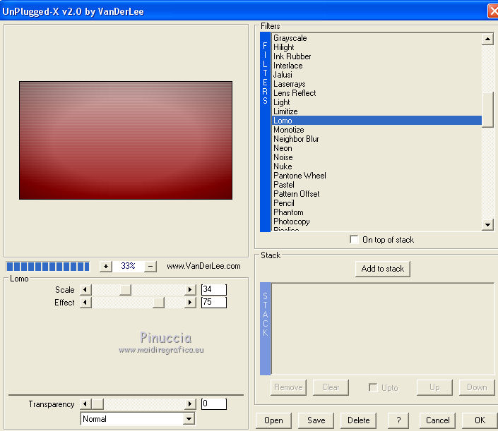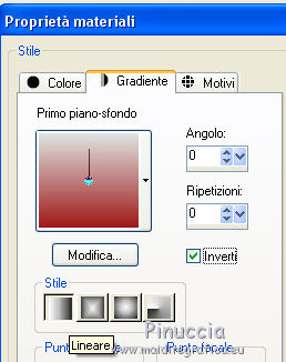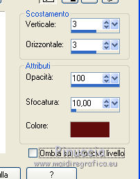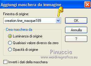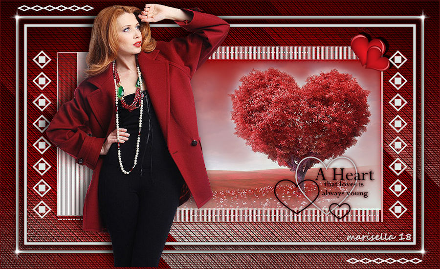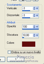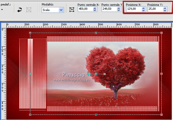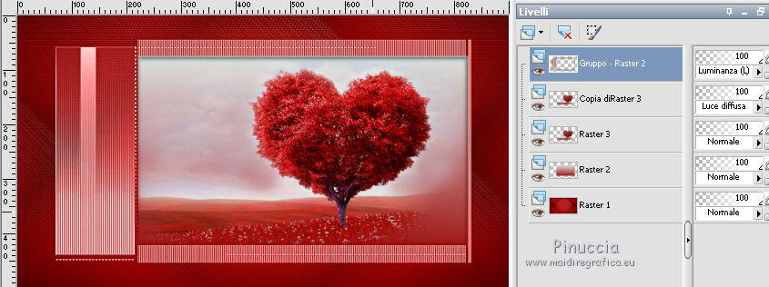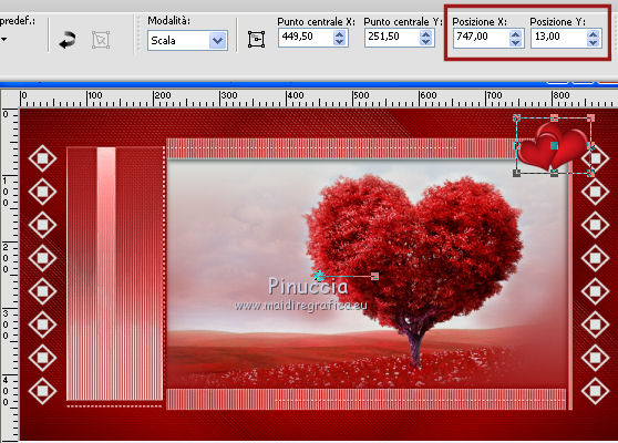 qui puoi trovare qualche risposta ai tuoi dubbi. Se l'argomento che ti interessa non è presente, ti prego di segnalarmelo. Questo tutorial è stato realizzato con Corel19 e tradotto con Corel X, ma può essere realizzato anche con le altre versioni di PSP. Dalla versione X4, il comando Immagine>Rifletti è stato sostituito con Immagine>Capovolgi in orizzontale, e il comando Immagine>Capovolgi con Immagine>Capovolgi in verticale. Nelle versioni X5 e X6, le funzioni sono state migliorate rendendo disponibile il menu Oggetti. Con la nuova versione X7, sono tornati Rifletti>Capovolgi, ma con nuove varianti. Vedi la scheda sull'argomento qui Occorrente: Materiale qui Tube, déco e misted sono di Colybrix. testo QB LoveWordArt6 maschera di Tina Filtri: se hai problemi con i filtri, consulta la mia sezione filtri qui Filters Unlimited 2.0 qui Simple - Diamonds qui VanDerLee - Unplugged-X qui I filtri Simple si possono usare da soli o importati in Filters Unlimited (come fare vedi qui) Se un filtro fornito appare con questa icona ![]() non esitare a cambiare modalità di miscelatura e opacità secondo i colori utilizzati. Nelle ultime versioni di PSP non c'è il gradiente di primo piano/sfondo (Corel_06_029) Puoi usare i gradienti delle versioni precedenti. Trovi qui i gradienti Corel X. Apri la maschera in PSP e minimizzala con il resto del materiale. Colori utilizzati ![]() 1. Imposta il colore di primo piano con il colore chiaro - 1 - #dce4e1, e il colore di sfondo con il colore scuro - 2 - #a01919. ![]() Passa il colore di primo piano a Gradiente di primo piano/sfondo, stile Lineare. ![]() 2. Apri Alpha_Saint Valentin. Finestra>Duplica o, sulla tastiera, maiuscola+D per fare una copia. Chiudi l'originale. La copia, che sarà la base del tuo lavoro, non è vuota, ma contiene una selezione salvata sul canale alfa. Riempi l'immagine trasparente con il gradiente.3. Effetti>Effetti di trama>Veneziana - colore di sfondo #a01919. ![]() 4. Effetti>Plugins>VanDerLee - Unplugged-X - Lomo ![]() 5. Livelli>Duplica. Immagine>Capovolgi. Cambia la modalità di miscelatura di questo livello in Sovrapponi. Livelli>Unisci>Unisci giù. 6. Livelli>Duplica. 7. Effetti>Plugins>Simple - Diamonds. Cambia la modalità di miscelatura di questo livello in Moltiplica. 8. Effetti>Effetti di bordo>Aumenta. 9. Livelli>Unisci>Unisci giù (sulla mia seconda versione ho fatto Regola>Luminosità e contrasto e diminuito la luminosità a -24, contrasto 0) 10. Livelli>Nuovo livello raster. Riporta il colore di primo piano a Colore. Riempi il livello con il colore chiaro di primo piano.11. Livelli>Nuovo livello maschera>Da immagine. Apri il menu sotto la finestra di origine e vedrai la lista dei files aperti. Seleziona la maschera creation.tine_masque189. ![]() Effetti>Effetti di bordo>Aumenta. Livelli>Unisci>Unisci gruppo. 12. Oggetti>Allinea>Centra nella tela. se stai usando una versione precedente che non ha disponibile il menu Oggetti: per centrare un livello: Modifica>Taglia e Modifica>Incolla come nuovo livello. Non dimenticare di eliminare il livello rimasto vuoto. 13. Effetti>Effetti 3D>Sfalsa ombra, colore 3 #630f0f. ![]() Ripeti l'Effetto Sfalsa ombra, cambiando verticale e orizzontale con -3. 14. Cambia la modalità di miscelatura di questo livello in Luminanza (esistente). 15. Selezione>Carica/Salva selezione>Carica selezione da canale alfa. La selezione sélection#1 è subito disponibile. Devi soltanto cliccare Carica. ![]() 16. Riporta il colore di primo piano a Gradiente. Livelli>Nuovo livello raster. Riempi la selezione con il gradiente.Selezione>Deseleziona. 17. Apri l misted del paesaggio SVal14 - cancella la firma e vai a Modifica>Copia. Torna al tuo lavoro e vai a Modifica>Incolla come nuovo livello. Immagine>Ridimensiona, all'85%, tutti i livelli non selezionato. 18. Per posiziona il tube, premi sulla tastiera il tasto K per attivare lo strumento Puntatore ![]() e imposta Posizione X: 129,00 e Posizione Y: 25,00 ![]() 19. Selezione>Carica/Salva selezione>Carica selezione da canale alfa. Carica nuovamente sélection#1. ![]() 20. Selezione>Inverti. Premi sulla tastiera il tasto CANC ![]() Selezione>Deseleziona. 21. Livelli>Duplica. Cambia la modalità di miscelatura di questo livello in Luce diffusa (facoltativo, secondo il tube). 22. Attiva il livello della maschera (gruppo Raster 2). Livelli>Disponi>Porta in alto. ![]() 23. Apri il tube déco 1 Saint Valentin e vai a Modifica>Copia. Torna al tuo lavoro e vai a Modifica>Incolla come nuovo livello. Lascialo come sta: è al suo posto. 24. Effetti>Effetti 3D>Sfalsa ombra, colore 3 #630f0f. ![]() 25. Apri il tube SVal9 e vai a Modifica>Copia. Torna al tuo lavoro e vai a Modifica>Incolla come nuovo livello. Immagine>Ridimensiona, 1 volta al 50% e 1 volta al 60%, tutti i livelli non selezionato. 26. Immagine>Rifletti. Tasto K per attivare lo strumento Puntatore ![]() e imposta Posizione X: 747,00 e Posizione Y: 13,00 ![]() 27. Immagine>Ruota per gradi - 30 gradi a destra. ![]() 28. Effetti>Effetti 3D>Sfalsa ombra, colore nero. ![]() 29. Attiva il livello di sfondo. Modifica>Copia. 30. Immagine>Aggiungi bordatura, 2 pixels, simmetriche, colore 3 #630f0f. Immagine>Aggiungi bordatura, 5 pixels, simmetriche, colore 1 #dce4e1. Immagine>Aggiungi bordatura, 2 pixels, simmetriche, colore 3 #630f0f. 31. Immagine>Aggiungi bordatura, 10 pixels, simmetriche, colore 1 #dce4e1. Attiva lo strumento Bacchetta magica ![]() e clicca nel bordo per selezionarlo. 32. Modifica>Incolla nella selezione. 33. Selezione>Inverti. Effetti>Effetti 3D>Sfalsa ombra, colore nero. ![]() Modifica>Ripeti Sfalsa ombra. Selezione>Deseleziona. 34. Immagine>Aggiungi bordatura, 2 pixels, simmetriche, colore 3 #630f0f. Immagine>Aggiungi bordatura, 5 pixels, simmetriche, colore 1 #dce4e1. Seleziona questo bordo con la bacchetta magica ![]() Selezione>Inverti. 35. Effetti Selezione>Deseleziona. 36. Immagine>Aggiungi bordatura, 2 pixels, simmetriche, colore 3 #630f0f. Immagine>Aggiungi bordatura, 35 pixels, s
