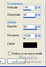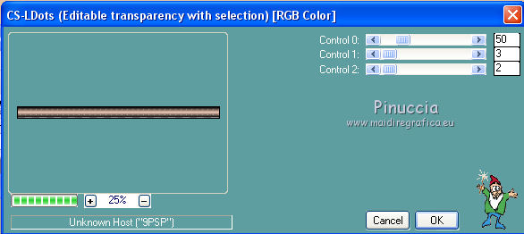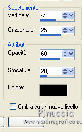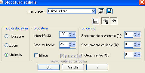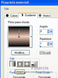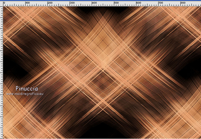 qui puoi trovare qualche risposta ai tuoi dubbi. Se l'argomento che ti interessa non è presente, ti prego di segnalarmelo. Questo tutorial è stato realizzato con Corel19 e tradotto con Corel X, ma può essere realizzato anche con le altre versioni di PSP. Dalla versione X4, il comando Immagine>Rifletti è stato sostituito con Immagine>Capovolgi in orizzontale, e il comando Immagine>Capovolgi con Immagine>Capovolgi in verticale. Nelle versioni X5 e X6, le funzioni sono state migliorate rendendo disponibile il menu Oggetti. Con la nuova versione X7, sono tornati Rifletti>Capovolgi, ma con nuove varianti. Vedi la scheda sull'argomento qui Occorrente: Materiale qui (in questa pagina trovi i links ai siti dei creatori di tubes) Filtri: se hai problemi con i filtri, consulta la mia sezione filtri qui Filters Unlimited 2.0 qui Carolaine and Sensibility qui Graphics Plus - Cross Shadow qui I filtri Graphics Plus si possono usare da soli o importati in Filters Unlimited (come fare vedi qui) Se un filtro fornito appare con questa icona ![]() non esitare a cambiare modalità di miscelatura e opacità secondo i colori utilizzati. Apri le maschere in PSP e minimizzale con il resto del materiale. Colori utilizzati ![]() Imposta il colore di primo piano con il colore chiaro #e6c5a4, e il colore di sfondo con il colore scuro #221b1d. ![]() 1. Apri una nuova immagine trasparente 900 x 600 pixels. Riempi l'immagine trasparente con il colore scuro.2. Livelli>Nuovo livello raster. Riempi il livello con il colore chiaro.3. Livelli>Nuovo livello maschera>Da immagine. Apri il menu sotto la finestra di origine e vedrai la lista dei files aperti. Seleziona la maschera 021_masque_animabelle. ![]() Effetti>Effetti di bordo>Aumenta. Livelli>Unisci>Unisci gruppo. 4. Regola>Correzione fotografica in un passaggio (da decidere in base ai tuoi colori e alla versione di PSP che stai usando (il risultato può essere differente). Se il risultato non ti piace, salta questo passaggio; vedi al punto 11 la differenza tra le versioni CorelX e CorelX3). 5. Livelli>Nuovo livello raster. Selezione>Seleziona tutto. 6. Apri il tube della donna, cancella il watermark e vai a Modifica>Copia. Minimizza il tube. Torna al tuo lavoro e vai a Modifica>Incolla nella selezione. Selezione>Deseleziona. 7. Effetti>Effetti di immagine>Motivo unico, con i settaggi standard. ![]() 8. Regola>Sfocatura>Sfocatura radiale. ![]() 9. Cambia la modalità di miscelatura di questo livello in Sovrapponi, e attiva il livello sottostante della maschera. ![]() 10.Livelli>Duplica. Immagine>Rifletti. Livelli>Unisci>Unisci giù. Effetti>Effetti di immagine>Motivo unico, con i settaggi standard. ![]() 11. Livelli>Unisci>Unisci visibile. Questo è stato il mio risultato usando Corel X ![]() E questo il risultato usando CorelX13 ![]() 12. Livelli>Nuovo livello raster. Attiva lo strumento Selezione ![]() (non importa il tipo di selezione impostato, perchè con la selezione personalizzata si ottiene sempre un rettangolo) clicca sull'icona Selezione personalizzata ![]() e imposta i seguenti settaggi. ![]() 13. Passa il colore di primo piano a Gradiente di primo piano/sfondo, stile Lineare. ![]() Riempi la selezione con il gradiente.Cambia la modalità di miscelatura di questo livello in Luce netta. 14. Effetti>Plugins>Carolaine and Sensibility - CS-Dots, con i settaggi standard. ![]() Selezione>Deseleziona. 15. Livelli>Duplica. Immagine>Capovolgi. Livelli>Unisci>Unisci giù. 16. Effetti>Effetti 3D>Sfalsa ombra. ![]() 17. Imposta il colore di primo piano con il colore bianco. ![]() Livelli>Nuovo livello raster. Riempi con il colore bianco.18. Livelli>Nuovo livello maschera>Da immagine. Apri il menu sotto la finestra di origine e seleziona la maschera di Narah_Mask_1231. ![]() Effetti>Effetti di bordo>Aumenta. Livelli>Unisci>Unisci gruppo. Cambia la modalità di miscelatura di questo livello in Sovrapponi. Con Corel X: ![]() con Corel X3 ![]() 19. Apri il tube deco 1 e vai a Modifica>Copia. Torna al tuo lavoro e vai a Modifica>Incolla come nuovo livello. Cambia la modalità di miscelatura di questo livello in Sovrapponi. 20. Apri il tube deco 2 e vai a Modifica>Copia. Torna al tuo lavoro e vai a Modifica>Incolla come nuovo livello. 21. Effetti>Effetti 3D>Sfalsa ombra, con i settaggi precedenti. ![]() 22. Apri il tube del fiore di Coly, cancella il watermark, e vai a Modifica>Copia. Torna al tuo lavoro e vai a Modifica>Incolla come nuovo livello. Non spostarlo. 23. Inverti i colori della paletta e imposta il colore di sfondo con il colore chiaro #e6c5a4. ![]() Attiva lo strumento Testo ![]() usa il font fornito o scegli, se vuoi, un altro font. I miei settaggi: ![]() Scrivi Sofia e posiziona il testo in alto a sinistra. Livelli>Converti in livello raster. 24. Effetti>Effetti 3D>Sfalsa ombra ![]() 25. Attiva il livello di sfondo. Modifica>Copia. 26. Immagine>Aggiungi bordatura, 2 pixels, simmetriche, colore bianco. Immagine>Aggiungi bordatura, 5 pixels, simmetriche, colore scuro. Immagine>Aggiungi bordatura, 2 pixels, simmetriche, colore bianco. Immagine>Aggiungi bordatura, 20 pixels simmetriche, colore chiaro. 27. Attiva lo strumento Bacchetta magica ![]() e clicca nel bordo da 20 pixels per selezionarlo. Modifica>Incolla nella selezione. 28. Regola>Sfocatura>Sfocatura gaussiana - raggio 20. ![]() 29. Effetti>Plugins>Carolaine and Sensibility - CS-LDots con i settaggi standard. Effetti>Effetti di bordo>Aumenta. Selezione>Inverti. 30. Effetti>Effetti 3D>Sfalsa ombra. ![]() Modifica>Ripeti Sfalsa ombra. Selezione>Deseleziona. 31. Immagine>Aggiungi bordatura, 2 pixels, simmetriche, colore scuro. Immagine>Aggiungi bordatura, 35 pixels, simmetriche, colore bianco. Seleziona il bordo bianco con la bacchetta magica ![]() Selezione>Inverti. 32. Effetti>Effetti 3D>Sfalsa ombra, con i settaggi precedenti. Selezione>Deseleziona. 33. Immagine>Aggiungi bordatura, 2 pixels, simmetriche, colore scuro. Immagine>Aggiungi bordatura, 10 pixels, simmetriche, colore bianco. Seleziona il bor