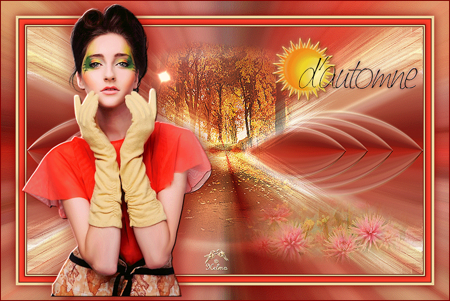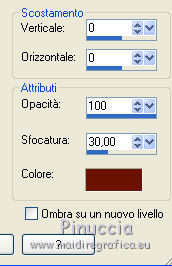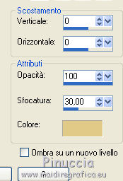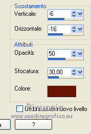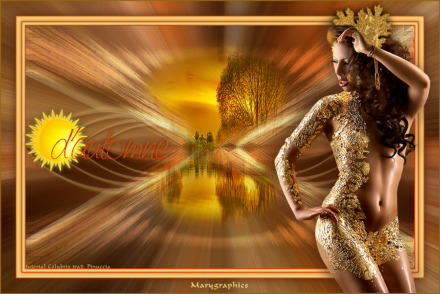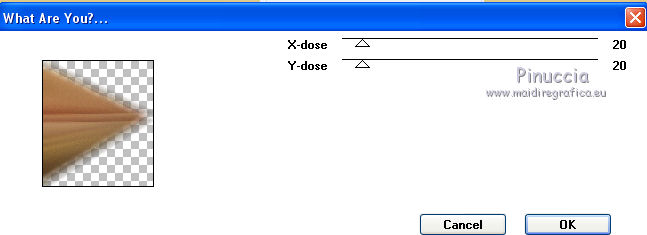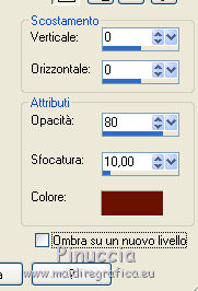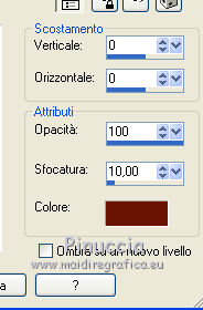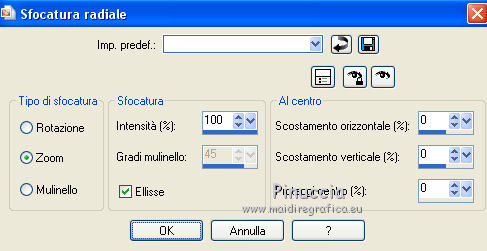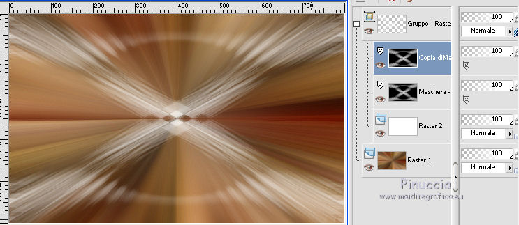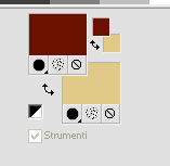 qui puoi trovare qualche risposta ai tuoi dubbi. Se l'argomento che ti interessa non è presente, ti prego di segnalarmelo. Questo tutorial è stato realizzato con Corel19 e tradotto con Corel X, ma può essere realizzato anche con le altre versioni di PSP. Dalla versione X4, il comando Immagine>Rifletti è stato sostituito con Immagine>Capovolgi in orizzontale, e il comando Immagine>Capovolgi con Immagine>Capovolgi in verticale. Nelle versioni X5 e X6, le funzioni sono state migliorate rendendo disponibile il menu Oggetti. Con la nuova versione X7, sono tornati Rifletti>Capovolgi, ma con nuove varianti. Vedi la scheda sull'argomento qui Occorrente: Materiale qui Per i tubes grazie Guismo e Thafs. (in questa pagina trovi i links ai siti dei creatori del materiale utilizzato nei tutorial). Filtri: se hai problemi con i filtri, consulta la mia sezione filtri qui Filters Unlimited 2.0 qui Flaming Pear - Flexify 2 qui Toadies - What are you qui I filtri Toadies si possono usare da soli o importati in Filters Unlimited (come fare vedi qui) Se un filtro fornito appare con questa icona ![]() non esitare a cambiare modalità di miscelatura e opacità secondo i colori utilizzati. Apri la maschera in PSP e minimizzala con il resto del materiale. 1. Imposta il colore di primo piano con #6b1300, e il colore di sfondo con #e1ca87. ![]() Apri Alpha Soleil… Finestra>Duplica, o sulla tastiera maiuscola+D, per fare una copia ![]() Chiudi l'originale. La copia, che sarà la base del tuo lavoro, non è vuota, ma contiene le selezioni salvate sul canale alfa. 2. Riempi l'immagine trasparente con il colore di primo piano.3. Livelli>Nuovo livello raster. Selezione>Seleziona tutto. Apri il tube di Guismo, cancella la firma e vai a Modifica>Copia. Minimizza il tube. Torna al tuo lavoro e vai a Modifica>Incolla nella selezione. Selezione>Deseleziona. 4. Effetti>Effetti di immagine>Motivo unico, con i settaggi standard. ![]() 5. Regola>Sfocatura>Sfocatura radiale. ![]() 6. Livelli>Duplica. Livelli>Unisci>Unisci giù. Regola>Messa a fuoco>Metti a fuoco. Effetti>Effetti di bordo>Aumenta. 7. Livelli>Unisci>Unisci giù. 8. Livelli>Nuovo livello raster. Imposta il colore di primo piano con il colore bianco. Riempi il livello con il colore bianco.9. Livelli>Nuovo livello maschera>Da immagine. Apri il menu sotto la finestra di origine e vedrai la lista dei files aperti. Seleziona la maschera masque. ![]() Livelli>Duplica. ![]() Livelli>Unisci>Unisci gruppo. 10. Cambia la modalità di miscelatura di questo livello in Sovrapponi. 11. Regola>Messa a fuoco>Metti a fuoco - 2 volte. 12. Attiva il livello di sfondo. Selezione>Carica/Salva selezione>Carica selezione da canale alfa. La selezione sélection#1 è subito disponibile. Devi soltanto cliccare Carica. ![]() Selezione>Innalza selezione a livello. 13. Effetti>Plugins>Toadies - What are you, con i settaggi standard. ![]() 14. Effetti>Effetti 3D>Sfalsa ombra, colore chiaro di sfondo. ![]() Selezione>Deseleziona. 15. Livelli>Duplica. Immagine>Rifletti. Livelli>Unisci>Unisci giù. 16. Livelli>Duplica. Effetti>Plugins>Flaming Pear - Flexify 2. ![]() 17. Livelli>Duplica. Immagine>Ridimensiona, all'85%, tutti i livelli non selezionato. Ripeti 2 volte: Livelli>Duplica. Immagine>Ridimensiona, all'85%, tutti i livelli non selezionato. Dovresti avere questo. ![]() 18. Attiva nuovamente il livello superiore. Livelli>Nuovo livello raster. Selezione>Carica/Salva selezione>Carica selezione da canale alfa. Apri il menu delle selezioni e carica sélection#2. ![]() 19. Apri il tube del paesaggio e vai a Modifica>Copia. Torna al tuo lavoro e vai a Modifica>Incolla nella selezione. Attenzione, cerca di trovare un paesaggio non troppo largo; eventualmente Incolla come nuovo livello, ridimensiona per posizionarlo bene, inverti la selezione e premi il tasto CANC. Selezione>Deseleziona. 20. Effetti>Effetti di bordo>Aumenta. Abbassa l'opacità di questo livello al 70%, o secondo il tuo tube. 21. Facoltativo: cancella eventuali parti del tube che disturbano l'armonia dell'immagine. 22. Attiva lo strumento Gomma con questi settaggi:![]() Dai dei piccoli colpi di gomma a sinistra al centro, e a destra. ![]() per avere questo ![]() 23. Attiva il livello di sfondo. Modifica>Copia. 24. Per i bordi, riporta il colore di primo piano al colore scuro iniziale. ![]() Immagine>Aggiungi bordatura, 2 pixels, simmetriche, colore scuro. Immagine>Aggiungi bordatura, 5 pixels, simmetriche, colore chiaro. Immagine>Aggiungi bordatura, 2 pixels, simmetriche, colore scuro. Immagine>Aggiungi bordatura, 10 pixels, simmetriche, colore chiaro. 25. Attiva lo strumento Bacchetta magica ![]() e clicca nel bordo da 10 pixels per selezionarlo. 26. Selezione>Inverti. Effetti>Effetti 3D>Sfalsa ombra, colore scuro di primo piano. ![]() Selezione>Deseleziona. 27. Immagine>Aggiungi bordatura, 2 pixels, simmetriche, colore scuro. Immagine>Aggiungi bordatura, 30 pixels, simmetriche, colore chiaro. 28. Seleziona il bordo da 30 pixels con la bacchetta magica ![]() Modifica>Incolla nella selezione. Regola>Messa a fuoco>Metti a fuoco. 29. Selezione>Inverti. Effetti>Effetti 3D>Sfalsa ombra, colore scuro. ![]() Selezione>Deseleziona. 30. Attiva nuovamente il tube della donna di Guismo, sul quale hai già cancellato la firma, e vai a Modifica>Copia. Torna al tuo lavoro e vai a Modifica>Incolla come nuovo livello. Immagine>Ridimensiona, al 71%, tutti i livelli non selezionato. Regola>Messa a fuoco>Metti a fuoco. 31. Immagine>Rifletti. Sposta il tube a destra.Effetti>Effetti 3D>Sfalsa ombra, colore scuro. ![]() Ripeti Effetti>Effetti 3D>Sfalsa ombra, verticale e orizzontale in positivo e opacità a 30. ![]() 32. Apri il testo e vai a Modifica>Copia. Torna al tuo lavoro e vai a Modifica>Incolla come nuovo livello. Immagine>Ridimensiona, 1 volta al 35% e una volta al 75%, tutti i livelli non selezionato. Sposta il testo a sinistra.33. Effetti>Effetti 3D>Sfalsa ombra. ![]() 34. Firma il tuo lavoro su un nuovo livello. 35. Immagine>Aggiungi bo