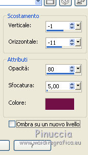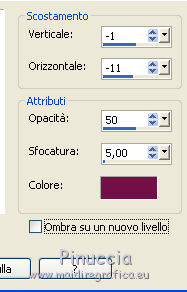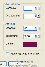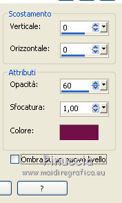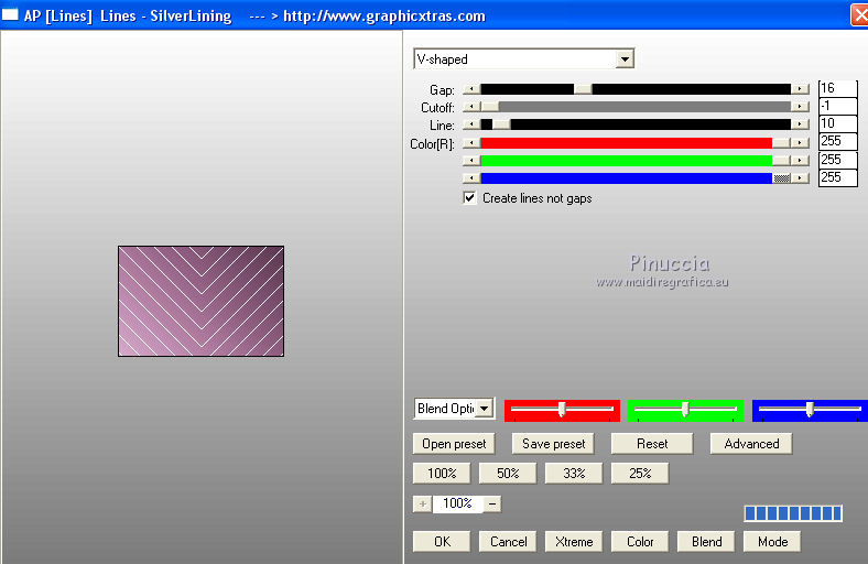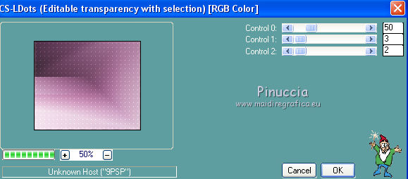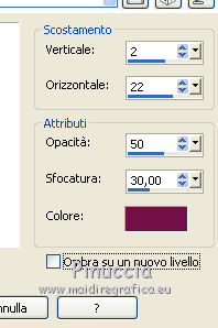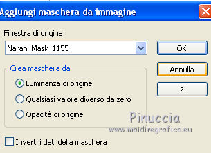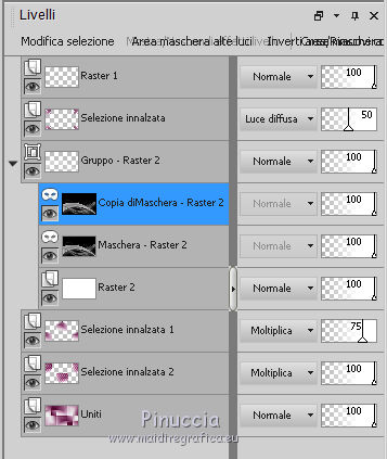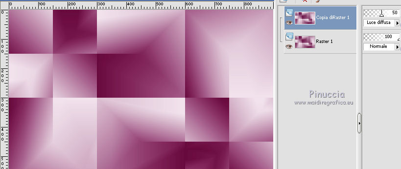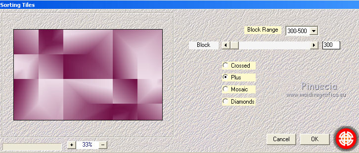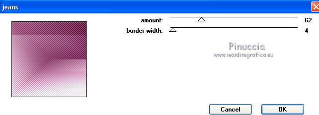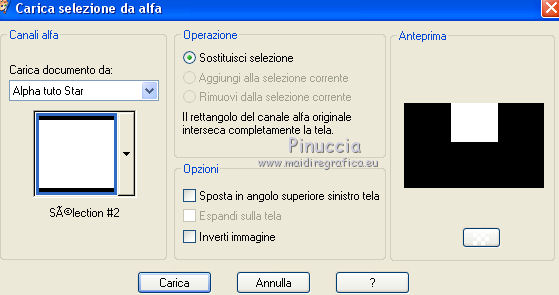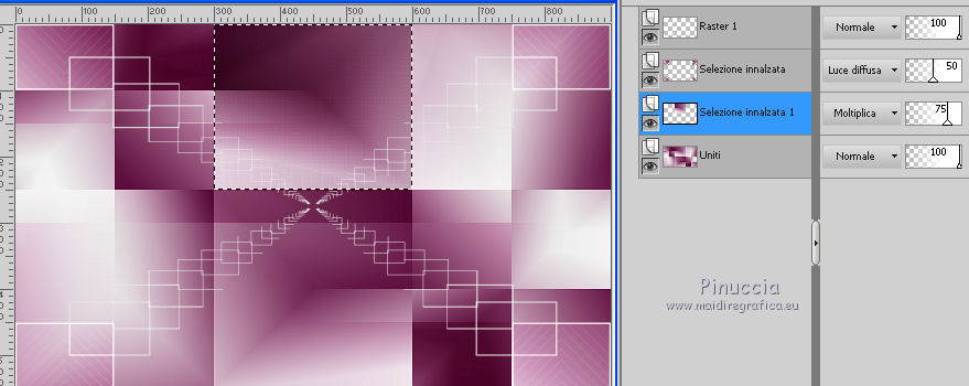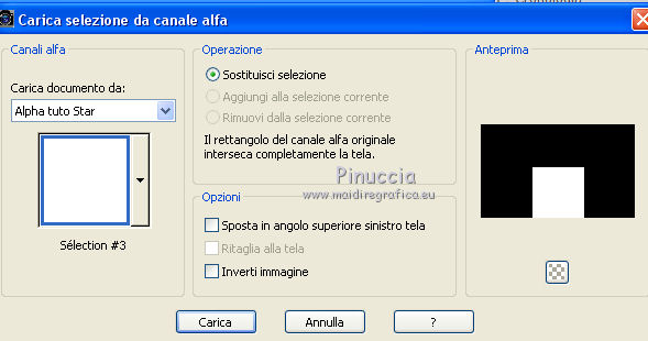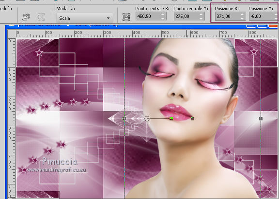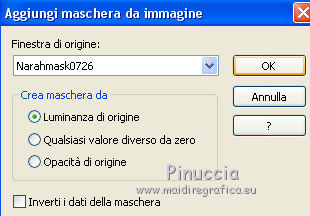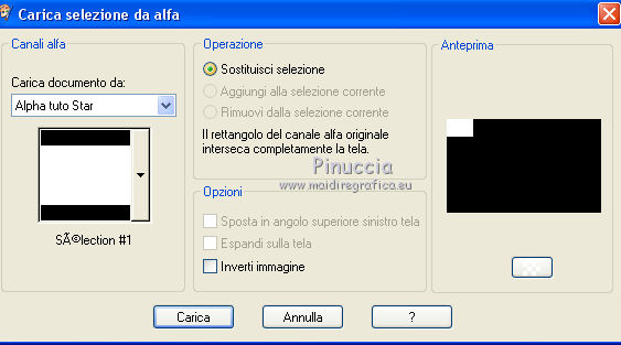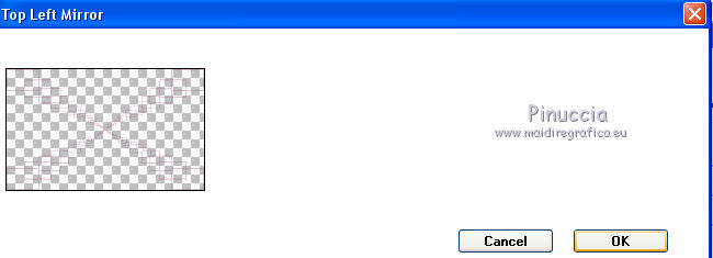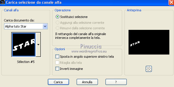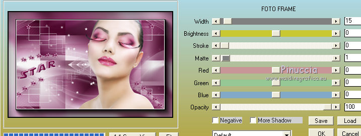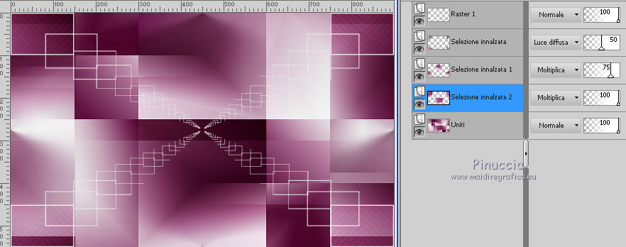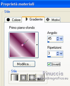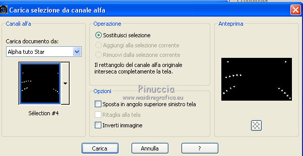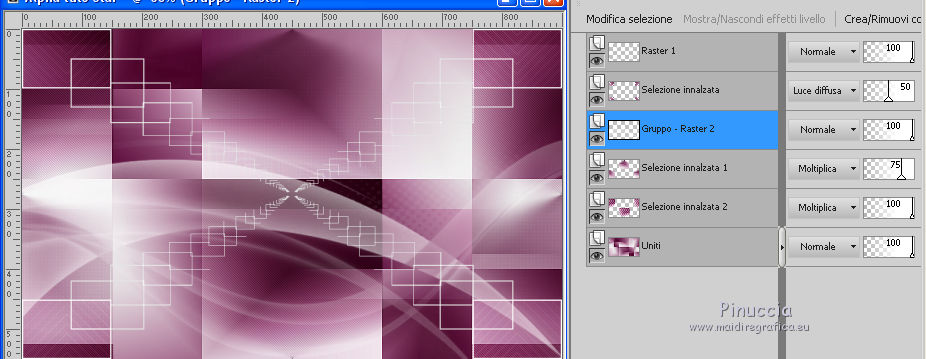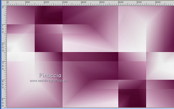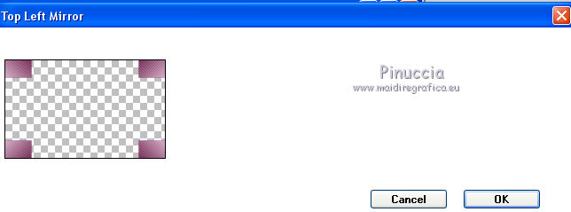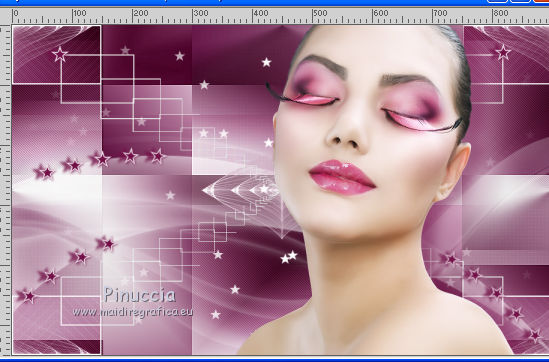 qui puoi trovare qualche risposta ai tuoi dubbi. Se l'argomento che ti interessa non è presente, ti prego di segnalarmelo. Questo tutorial è stato realizzato con Corel19 e tradotto con Corel X, ma può essere realizzato anche con le altre versioni di PSP. Dalla versione X4, il comando Immagine>Rifletti è stato sostituito con Immagine>Capovolgi in orizzontale, e il comando Immagine>Capovolgi con Immagine>Capovolgi in verticale. Nelle versioni X5 e X6, le funzioni sono state migliorate rendendo disponibile il menu Oggetti. Con la nuova versione X7, sono tornati Rifletti>Capovolgi, ma con nuove varianti. Vedi la scheda sull'argomento qui Occorrente: Materiale qui Filtri: se hai problemi con i filtri, consulta la mia sezione filtri qui Filters Unlimited 2.0 qui Ap Lines - Lines SilverLining qui Penta.com - Jeans qui Graphics Plus - Cross shadow qui Carolaine and Sensibility - CS-LDots qui Mehdi - Sorting Tiles qui Simple - Top Left Mirror qui AAA Frames - Foto Frame qui I filtri Penta.com, Graphics Plus e Simple si possono usare da soli o importati in Filters Unlimited (come fare vedi qui) Se un filtro fornito appare con questa icona ![]() non esitare a cambiare modalità di miscelatura e opacità secondo i colori utilizzati. Nelle ultime versioni di PSP non c'è il gradiente di primo piano/sfondo (Corel_06_029) Puoi usare i gradienti delle versioni precedenti. Trovi qui i gradienti Corel X. Apri le maschere in PSP e minimizzale con il resto del materiale. 1. Imposta il colore di primo piano con #eedfea, e il colore di sfondo con #6e134a. ![]() Passa il colore di primo piano a Gradiente di primo piano/sfondo, stile Lineare. ![]() 2. Apri Alpha_tuto_star. Finestra>Duplica, o sulla tastiera maiuscola+D, per fare una copia. ![]() Chiudi l'originale. La copia, che sarà la base del tuo lavoro, non è vuota, ma contiene le selezioni salvate sul canale alfa. Riempi l'immagine trasparente con il gradiente.3. Effetti>Plugins>Mehdi - Sorting Tiles. ![]() 4. Livelli>Duplica. Cambia la modalità di miscelatura di questo livello in Luce diffusa, e abbassa l'opacità al 50%. ![]() 5. Attiva nuovamente il livello sottostante. Immagine>Rifletti. Immagine>Capovolgi. 6. Livelli>Unisci>Unisci visibile. 7. Regola>Correzione fotografica in un passaggio (per accentuare il contrasto, ma il risultato può variare in base ai colori e alla versione di PSP utilizzata. Ecco il risultato ottenuto con Corel17 ![]() E questo il risultato con CorelX ![]() A te decidere cosa fare, secondo il tuo risultato) 8. Selezione>Carica/Salva selezione>Carica selezione da canale alfa. La selezione sélection#1 è subito disponibile. Devi soltanto cliccare Carica. ![]() Selezione>Innalza selezione a livello. Effetti>Plugins>AP Lines - Lines SilverLining. ![]() Mantieni selezionato. 9. Imposta il colore di primo piano con il colore bianco. ![]() Livelli>Nuovo livello raster. Riempi con il colore bianco.Selezione>Modifica>Contrai - 2 pixels. Premi sulla tastiera il tasto CANC ![]() Selezione>Deseleziona. 10. Effetti>Effetti di riflesso>Fuga di specchi. ![]() 11. Effetti>Plugins>Simple - Top Left Mirror. ![]() 12. Attiva il livello centrale - Selezione innalzata 13. Effetti>Plugins>Simple - Top Left Mirror. ![]() 14. Cambia la modalità di miscelatura di questo livello in Luce diffusa, e abbassa l'opacità al 50%. ![]() 15. Attiva il livello di sfondo. Selezione>Carica/Salva selezione>Carica selezione da canale alfa. Apri il menu delle selezioni e carica Sélection#2. ![]() Selezione>Innalza selezione a livello. 16. Effetti>Plugins>Carolaine and Sensibility - CS-LDots, con i settaggi standard. ![]() 17. Cambia la modalità di miscelatura di questo livello in Moltiplica, e abbassa l'opacità al 75%. ![]() Selezione>Deseleziona. 18. Effetti>Effetti di immagine>Motivo unico, con i settaggi standard. ![]() 19. Attiva nuovamente il livello di sfondo. Selezione>Carica/Salva selezione>Carica selezione da canale alfa. Apri il menu delle selezioni e carica Sélection#3. ![]() Selezione>Innalza selezione a livello. 20. Effetti>Plugins>Penta.com - Jeans, con i settaggi standard. ![]() Selezione>Deseleziona. 21. Effetti>Effetti di immagine>Motivo unico, con i settaggi precedenti. Cambia la modalità di miscelatura di questo livello in Moltiplica. ![]() 22. Attiva il livello immediatamente sopra, Selezione innalzata 1. Livelli>Nuovo livello raster. Riempi il livello con il colore bianco.23. Livelli>Nuovo livello maschera>Da immagine. Apri il menu sotto la finestra di origine e vedrai la lista dei files aperti. Seleziona la maschera Narah Mask1155. ![]() Livelli>Duplica. ![]() Livelli>Unisci>Unisci gruppo. Rimani posizionato su questo livello ![]() 24. Livelli>Nuovo livello raster. Riempi con il colore bianco.Livelli>Nuovo livello maschera>Da immagine Apri il menu sotto la finestra di origine e seleziona la maschera Narah_mask_0726. ![]() Effetti>Effetti di bordo>Aumenta. Livelli>Unisci>Unisci gruppo. 25. Immagine>Ridimensiona, al 30%, tutti i livelli non selezionato. 26. Livelli>Duplica. Livelli>Unisci>Unisci giù. 27. Effetti>Effetti 3D>Sfalsa ombra, con il colore scuro. ![]() 28. Livelli>Duplica. Effetti>Effetti di immagine>Motivo unico, con i settaggi standard. 29. Attiva il livello superiore. Livelli>Nuovo livello raster. Selezione>Carica/Salva selezione>Carica selezione da canale alfa. Apri il menu delle selezioni e carica Sélection#4. ![]() Riporta il colore di primo piano al colore iniziale #eedfea. ![]() Riempi la selezione con il colore chiaro.30. Selezione>Modifica>Contrai - 2 pixels. Riempi la selezione con il colore scuro.Selezione>Deseleziona. 31. Effetti>Effetti 3D>Sfalsa ombra, colore scuro. ![]() Ripeti l'Effetto Sfalsa ombra verticale e orizzontale -1/-11. ![]() 32. Livelli>Unisci>Unisci visibile. 33. Apri il tube della donna (se vuoi mettere un altro tube, puoi metterlo più tardi dopo aver aggiunto i bordi; sulla mia seconda versione, ho aggiunto il tube dopo il punto 48) Modifica>Copia. Torna al tuo lavoro e vai a Modifica>Inc