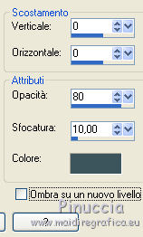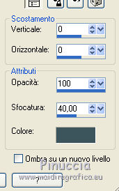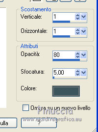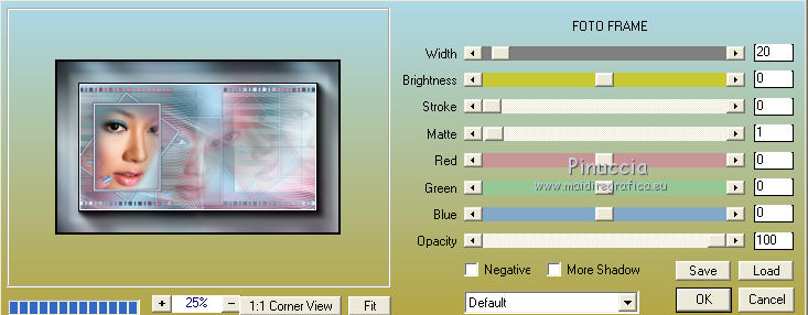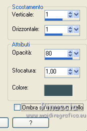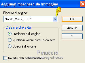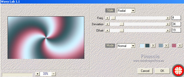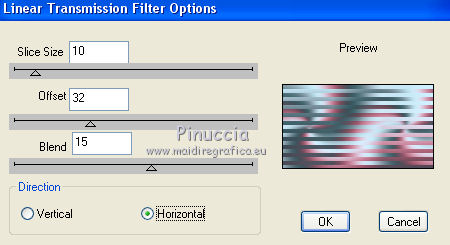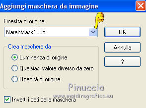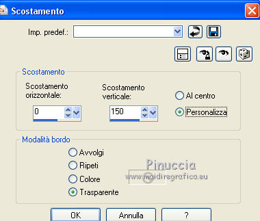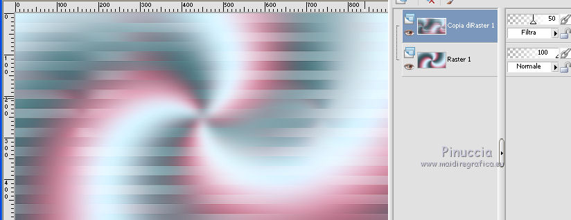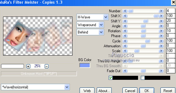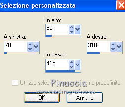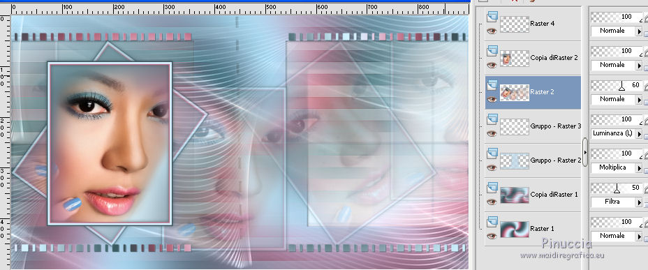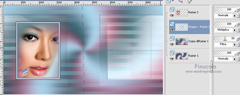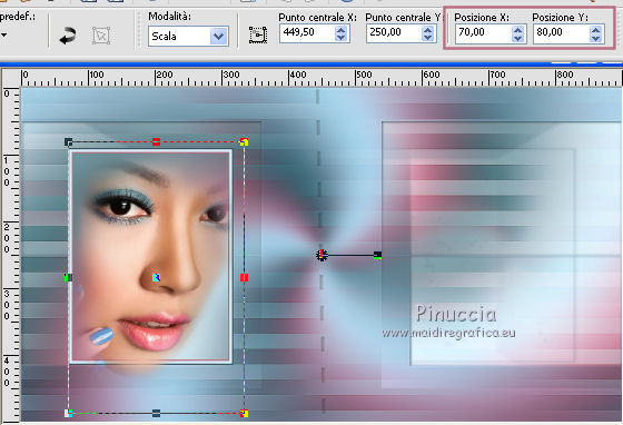 qui puoi trovare qualche risposta ai tuoi dubbi. Se l'argomento che ti interessa non è presente, ti prego di segnalarmelo. Questo tutorial è stato realizzato con Corel19 e tradotto con Corel X, ma può essere realizzato anche con le altre versioni di PSP. Dalla versione X4, il comando Immagine>Rifletti è stato sostituito con Immagine>Capovolgi in orizzontale, e il comando Immagine>Capovolgi con Immagine>Capovolgi in verticale. Nelle versioni X5 e X6, le funzioni sono state migliorate rendendo disponibile il menu Oggetti. Con la nuova versione X7, sono tornati Rifletti>Capovolgi, ma con nuove varianti. Vedi la scheda sull'argomento qui Occorrente: Materiale qui Filtri: se hai problemi con i filtri, consulta la mia sezione filtri qui Mehdi - Wavy Lab 1.1 qui DSB Flux - Linear Transmission qui AAA Frames - Foto Frame qui Mura's Meister - Copies qui ![]() non esitare a cambiare modalità di miscelatura e opacità secondo i colori utilizzati. Nelle ultime versioni di PSP non c'è il gradiente di primo piano/sfondo (Corel_06_029) Puoi usare i gradienti delle versioni precedenti. Trovi qui i gradienti Corel X. Apri le maschere in PSP e minimizzale. Imposta il colore di primo piano con #3c545c e il colore di sfondo con #d8efff. ![]() 1. Apri una nuova immagine trasparente 900 x 500 pixels. 2. Effetti>Plugins>Mehdi - Wavy Lab 1.1 questo filtro lavora con i colori della tua paletta: il primo è il colore di sfondo, il secondo quello di primo piano; gli ultimi due colori sono creati dal filtro; cambia l'ultimo colore con #b96d83. ![]() 3. Regola>Sfocatura>Sfocatura gaussiana - raggio 10. ![]() 4. Livelli>Duplica. Effetti>Plugins>DSB Flux - Linear Transmission. ![]() Cambia la modalità di miscelatura di questo livello in Filtra e abbassa l'opacità al 50%. Effetti>Effetti di bordo>Aumenta. ![]() 5. Livelli>Nuovo livello raster. Riempi con il colore di sfondo.6. Livelli>Nuovo livello maschera>Da immagine. Apri il menu sotto la finestra di origine e vedrai la lista dei files aperti. Seleziona la maschera Narah-Mask1065. ![]() Livelli>Unisci>Unisci gruppo. Cambia la modalità di miscelatura di questo livello in Moltiplica. 7. Effetti>Effetti 3D>Sfalsa ombra, colore di primo piano. ![]() 8. Attiva lo strumento Selezione ![]() (non importa il tipo di selezione impostato, perchè con la selezione personalizzata si ottiene sempre un rettangolo) clicca sull'icona Selezione personalizzata ![]() e imposta i seguenti settaggi. ![]() Modifica>Copia Unione. 9. Livelli>Nuovo livello raster. Modifica>Incolla nella selezione. Regola>Sfocatura>Sfocatura gaussiana - raggio 20. ![]() 10. Livelli>Nuovo livello raster. Riempi con il colore di primo piano.Selezione>Modifica>Contrai - 2 pixels. Riempi con il colore di sfondo.11. Selezione>Modifica>Contrai - 4 pixels. Imposta il colore di sfondo con il colore #b96d83. ![]() Riempi con il colore di primo piano.12. Selezione>Modifica>Contrai - 2 pixels. Premi sulla tastiera il tasto CANC ![]() Selezione>Deseleziona. 13. Apri il tube della donna, cancella la firma e vai a Modifica>Copia. Torna al tuo lavoro e vai a Modifica>Incolla come nuovo livello. 14. Immagine>Ridimensiona, al 55%, tutti i livelli non selezionato. Per posizionare il tube: tasto K per attivare lo strumento Puntatore ![]() e imposta Posizione X: 70,00 e Posizione Y: 80,00 ![]() 15. Selezione personalizzata , con i settaggi precedenti![]() Selezione>Modifica>Contrai - 8 pixels. 16. Selezione>Inverti. Premi sulla tastiera il tasto CANC. 17. Attiva il livello sottostante raster 3. Effetti>Effetti 3D>Sfalsa ombra, colore di primo piano #3c545c. ![]() Selezione>Deseleziona. 18. Attiva nuovamente il livello superiore. Livelli>Unisci>Unisci giù - 2 volte. Effetti>Effetti 3D>Sfalsa ombra, con i settaggi precedenti. 19. Attiva il livello della maschera Gruppo Raster 2. ![]() Imposta il colore di sfondo con il colore bianco. ![]() Livelli>Nuovo livello raster. Riempi con il colore bianco.Livelli>Nuovo livello maschera>Da immagine. Apri il menu sotto la finestra di origine e seleziona la maschera Narah_Mask_1092. ![]() Livelli>Unisci>Unisci gruppo. 20. Effetti>Effetti di immagine>Motivo unico, con i settaggi standard. ![]() Cambia la modalità di miscelatura di questo livello in Luminanza (esistente). 21. Attiva nuovamente il livello superiore, Raster 2. Apri il tube deco 1-sourire, e vai a Modifica>Copia. Torna al tuo lavoro e vai a Modifica>Incolla come nuovo livello. 22. Selezione>Seleziona tutto. Selezione>Mobile. Selezione>Immobilizza. 23. Livelli>Nuovo livello raster. Effetti>Plugins>Mehdi - Wavy lab 1.1, con i settaggi precedenti. ![]() Selezione>Deseleziona. 24. Elimina il livello originale del tube (raster 3) e ritorna sul livello Raster 4. Immagine>Rifletti. Immagine>Capovolgi. Effetti>Effetti 3D>Sfalsa ombra, colore di primo piano #3c545c. ![]() 25. Attiva il livello sottostante della cornice con il tube, Raster 2. Livelli>Duplica. Ritorna sul livello Raster 2. Effetti>Plugins>Mura's Meister - Copies. ![]() Abbassa l'opacità di questo livello al 60%. ![]() 26. Livelli>Unisci>Unisci tutto. Modifica>Copia. 27. Immagine>Aggiungi bordatura, 2 pixels, simmetriche, colore #3c545c. Immagine>Aggiungi bordatura, 20 pixels, simmetriche, colore bianco. 28. Attiva lo strumento Bacchetta magica ![]() e clicca nel bordo bianco per selezionarlo. Selezione>Inverti. Effetti>Effetti 3D>Sfalsa ombra, colore #3c545c. ![]() Selezione>Deseleziona. 29. Immagine>Aggiungi bordatura, 2 pixels, simmetriche, colore #3c545c. Immagine>Aggiungi bordatura, 40 pixels, simmetriche, colore bianco. Seleziona il bordo bianco con la Bacchetta magica ![]() Modifica>Incolla nella selezione. Regola>Sfocatura>Sfocatura gaussiana - raggio 20. Regola>Aggiungi/Rimuovi disturbo>Aggiungi disturbo. ![]() 30. Effetti>Plugins>Graphics Plus - Cross Shadow, con i settaggi standard. ![]() 31. Selezione>Inverti. Effetti>Effetti 3D>Sfalsa ombra, colore #3c545c. ![]() Modifica>Ripeti Sfalsa ombra. Selezione>Deseleziona. 32. Effetti>Plugins>AAA Frames - Fot
