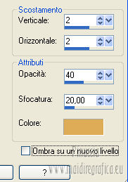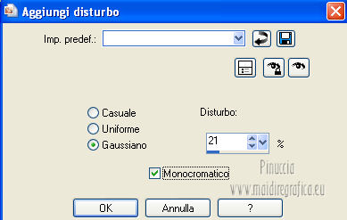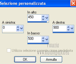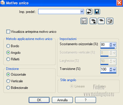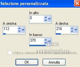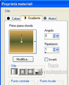 qui puoi trovare qualche risposta ai tuoi dubbi. Se l'argomento che ti interessa non è presente, ti prego di segnalarmelo. Questo tutorial è stato creato con PSP X2 e tradotto con PSP X, ma può essere eseguito anche con le altre versioni. Dalla versione X4, il comando Immagine>Rifletti è stato sostituito con Immagine>Capovolgi in orizzontale, e il comando Immagine>Capovolgi con Immagine>Capovolgi in verticale. Nelle versioni X5 e X6, le funzioni sono state migliorate rendendo disponibile il menu Oggetti. Con la versione X7 sono tornati i comandi Immagine>Rifletti e Immagine>Capovolgi, ma con nuove funzioni. Vedi la scheda sull'argomento qui traduzione in francese qui Le vostre versioni qui Occorrente: Materiale qui I tubes vengono da Tube-O-Mania-Gigi Créations - Design Corry. Il © appartiene all'artista originale. Mantieni il credito di chi ha creato il tube. Filtri in caso di dubbi, ricorda di consultare la mia sezione filtri qui Filters Unlimited 2.0 qui Toadies - What are you qui Carolaine and Sensibility qui I filtri Toadies si possono usare da soli o importati in Filters Unlimited (come fare vedi qui) Se un filtro fornito appare con questa icona Animation Shop qui ![]() non esitare a cambiare modalità di miscelatura e opacità secondo i colori utilizzati. Nelle ultime versioni di PSP non c'è il gradiente di primo piano/sfondo (Corel_06_029) Trovi i gradienti delle versioni precedenti qui 1. Imposta il colore di primo piano con #deab56, e il colore di sfondo con #525b31. ![]() Passa il colore di primo piano a Gradiente, stile lineare. ![]() 2. Apri una nuova immagine trasparente 900 x 500 pixels, e riempila con il gradiente.3. Livelli>Nuovo livello raster. Selezione>Seleziona tutto. Apri il tube "ananas" e vai a Modifica>Copia. Torna al tuo lavoro e vai a Modifica>Incolla nella selezione. Selezione>Deseleziona. 4. Effetti>Effetti di immagine>Motivo unico. ![]() 5. Regola>Sfocatura>Sfocatura radiale. ![]() 6. Livelli>Duplica. Immagine>Rifletti. Abbassa l'opacità di questo livello al 50%. Livelli>Unisci>Unisci visibile. 7. Apri il tube Gigi mist-3 e vai a Modifica>Copia. Torna al tuo lavoro e vai a Modifica>Incolla come nuovo livello. Immagine>Ridimensiona, al 125%, tutti i livelli non selezionato. Sposta il tube a destra.Livelli>Duplica. Immagine>Rifletti. Livelli>Unisci>Unisci visibile. 8. Se non visualizzi i righelli, vai a Visualizza>Righelli. Attiva lo strumento Selezione a mano libera ![]() e seleziona l'angolo a sinistra fino a 350 pixels. ![]() Selezione>Innalza selezione a livello. Selezione>Deseleziona. 9. Effetti>Plugins>Toadies - What are you. ![]() 10. Effetti>Plugins>Carolaine and Sensibility - CS-Ldots. ![]() 11. Immagine>Rifletti. 12. Livelli>Nuovo livello raster. Attiva lo strumento Selezione ,clicca sull'icona Selezione personalizzata ![]() e imposta i seguenti settaggi: ![]() Riempi la selezione con il gradiente.Selezione>Deseleziona. 13. Effetti>Plugins>Toadies - What are you, con i settaggi precedenti. Effetti>Plugins>Carolaine and Sensibility - CS-Ldots, con i settaggi precedenti. 14. Livelli>Nuovo livello raster. Selezione personalizzata ![]() ![]() Riempi con il gradiente.Selezione>Deseleziona. 15. Effetti>Plugins>Toadies - What are you. ![]() 16. Effetti>Plugins>Carolaine and Sensibility - CS-Ldots, con i settaggi precedenti. Controlla che tutto sia a posto. Livelli>Unisci>Unisci visibile. 16. Imposta il colore di primo piano con il colore bianco #ffffff. Attiva lo strumento Penna ![]() linea di stile Pieno - larghezza 2 pixels. ![]() Tenendo premuto il tasto della maiuscola per ottenere linee perfettamente diritte, traccia quattro linee verticali come nell'esempio. ![]() Livelli>Converti in livello raster. 17. Apri il tube Vaas les 98, attiva il livello "vaas" e vai a Modifica>Copia. Torna al tuo lavoro e vai a Modifica>Incolla come nuovo livello. Sposta il tube in basso a sinistra.Effetti>Effetti 3D>Sfalsa ombra. ![]() Attiva nuovamente il tube Vaas les 98 e copia il livello "driehokje". Torna al tuo lavoro e vai a Modifica>Incolla come nuovo livello. Livelli>Duplica - 3 volte, e posiziona gli elementi sulle righe bianche.![]() 18. Immagine>Aggiungi bordatura, 1 pixel, simmetriche, con il colore di primo piano #deab56. Immagine>Aggiungi bordatura, 1 pixel, simmetriche, con il colore #ffffff. Immagine>Aggiungi bordatura, 1 pixel, simmetriche, con il colore di primo piano #deab56. 19. Selezione>Seleziona tutto. Immagine>Aggiungi bordatura, 20 pixels, simmetriche, con il colore bianco. Effetti>Effetti 3D>Sfalsa ombra, con il colore di primo piano #deab56. ![]() Ripeti l'Effetto Sfalsa ombra, cambiando verticale e orizzontale con -2. Selezione>Deseleziona. 20. Aggiungi il tuo nome e/o il tuo watermark su un nuovo livello. 21. Apri il tube della donna e vai a Modifica>Copia. Torna al tuo lavoro e vai a Modifica>Incolla come nuovo livello. Immagine>Ridimensiona, una volta al 75% e una volta all'80%, tutti i livelli non selezionato. Sposta il tube un po' più a destra.22. Immagine>Aggiungi bordatura, 1 pixel, simmetriche, con il colore di primo piano #deab56. 23. Attiva lo strumento Selezione a mano libera , da punto a punto,e seleziona il diadema, le labbra e le palpebre della donna. ![]() 24. Regola>Aggiungi/Rimuovi disturbo>Aggiungi disturbo. ![]() Selezione>Deseleziona. 25. Modifica>Copia Unione. Apri Animation Shop e vai a Modifica>Incolla>Incolla come nuova animazione. 26. Torna in PSP. Modifica>Annulla azione Deseleziona. Modifica>Annulla azione Aggiungi disturbo. 27. Regola>Aggiungi/Rimuovi disturbo>Aggiungi disturbo, cambia il disturbo con 21 e ok. ![]() Selezione>Deseleziona. 28. Modifica>Copia Unione. Torna in Animation Shop e vai a Modifica>Incolla>Incolla dopo il fotogramma corrente. 29. Di nuovo in PSP. Modifica>Annulla azione Deseleziona. Modifica>Annulla azione Aggiungi disturbo. 30. Regola>Aggiungi/Rimuovi disturbo>Aggiungi disturbo, porta il disturbo a 24 e ok. Selezione>Deseleziona. 31. Modifica>Copia Unione. In Animation Shop: Modifica>