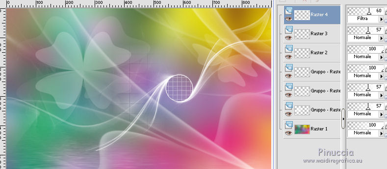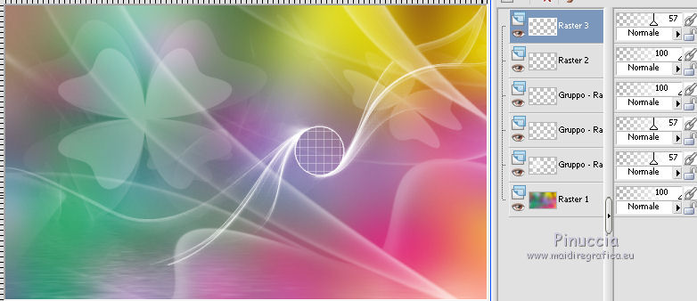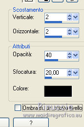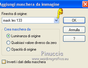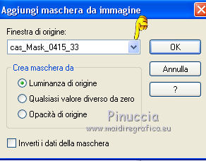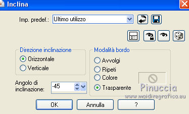 Occorrente: Materiale qui Tubes di Maryse. Maschere Narah e Cas. Il resto del materiale è di Corry. Filtri in caso di dubbi, ricorda di consultare la mia sezione filtri qui Alien Skin Eye Candy 5 Impact - Perspective Shadow qui VanDerLee Unplugged-X qui Flaming Pear - Flood qui ![]() Se utilizzi altri colori, non esitare a cambiare modalità di miscelatura e opacità dei livelli Apri le maschere e la selezione (che contiene una selezione salvata sul canale alfa) in PSP e minimizzale con il resto del materiale. 1. Imposta il colore di primo piano con #ffffff, e il colore di sfondo con #f1959d. ![]() 2. Apri una nuova immagine trasparente 900 x 550 pixels. 3. Selezione>Seleziona tutto. Apri l'immagine con i fiori e vai a Modifica>Copia. Torna al tuo lavoro e vai a Modifica>Incolla nella selezione. Selezione>Deseleziona. 4. Regola>Sfocatura>Sfocatura gaussiana - raggio 40. ![]() 5. Livelli>Nuovo livello raster. Riempi con il colore bianco di primo piano #ffffff.Livelli>Nuovo livello maschera>Da immagine. Apri il menu sotto la finestra di origine e vedrai la lista dei files aperti. Seleziona la maschera mask les 133. ![]() Livelli>Unisci>Unisci gruppo. 6. Abbassa l'opacità di questo livello al 57%. 7. Livelli>Nuovo livello raster. Riempi con il colore bianco di primo piano #ffffff.Livelli>Nuovo livello maschera>Da immagine. Apri il menu sotto la finestra di origine e seleziona la maschera Narah_mask_0508. ![]() Livelli>Unisci>Unisci gruppo. 8. Immagine>Rifletti. Abbassa l'opacità di questo livello al 57%. ![]() 9. Livelli>Nuovo livello raster. Riempi con il colore bianco di primo piano #ffffff.Livelli>Nuovo livello maschera>Da immagine. Apri il menu sotto la finestra di origine e seleziona la maschera cas_mask_1415. ![]() Livelli>Unisci>Unisci gruppo. 10. Effetti>Effetti di immagine>Scostamento. ![]() 11. Attiva lo strumento Selezione a mano libera , da punto a punto,e seleziona le linee come nell'esempio. ![]() Premi sulla tastiera il tasto CANC. Selezione>Deseleziona. Risultato ![]() 12. Se non lo hai fatto prima di iniziare, apri la selezione Selectie les 133 e minimizzala (l'immagine contiene una selezione salvata sul canale alfa). Torna al tuo lavoro. Selezione>Carica/Salva selezione>Carica selezione da canale alfa. La selezione selectie 1 è subito disponibile. Devi soltanto cliccare Carica. ![]() Premi sulla tastiera il tasto CANC ![]() Mantieni selezionato. 13. Livelli>Nuovo livello raster. Riempi con il colore bianco di primo piano #ffffff.Selezione>Modifica>Contrai - 2 pixels. Premi sulla tastiera il tasto CANC ![]() Mantieni ancora selezionato. 14. Livelli>Nuovo livello raster. Effetti>Plugins>VanDerLee - Unplugged-X - raster - custom color bianco #ffffff. ![]() Abbassa l'opacità di questo livello al 57%. ![]() Selezione>Deseleziona. 15. Apri element 1 les 133, e vai a Modifica>Copia. Torna al tuo lavoro e vai a Modifica>Incolla come nuovo livello. Spostalo in alto a sinistra.Cambia la modalità di miscelatura di questo livello in Filtra e abbassa l'opacità al 60%. ![]() 16. Apri il tube flower les 133 e vai a Modifica>Copia. Torna al tuo lavoro e vai a Modifica>Incolla come nuovo livello. Effetti>Plugins>Flaming Pear - Flood. ![]() 17. Effetti>Effetti di immagine>Scostamento. ![]() Abbassa l'opacità di questo livello al 60%. 18. Apri l'elemento 2 les 133 e vai a Modifica>Copia. Torna al tuo lavoro e vai a Modifica>Incolla come nuovo livello. Effetti>Effetti geometrici>Inclina. ![]() 19. Effetti>Effetti di immagine>Scostamento. ![]() 20. Livelli>Duplica. Spostalo in basso e un po' più a destra.![]() 21. Apri l'elemento 3 les 133 e vai a Modifica>Copia. Torna al tuo lavoro e vai a Modifica>Incolla come nuovo livello. Spostalo sotto il cerchio.![]() Cambia la modalità di miscelatura di questo livello in Filtra. 22. Apri tekst les 133 e vai a Modifica>Copia. Torna al tuo lavoro e vai a Modifica>Incolla come nuovo livello. Spostalo in basso a destra.23. Effetti>Plugins>Alien Skin Eye Candy 5 Impact - Perspective Shadow. Seleziona il preset Drop Shadow Low e ok. ![]() 24. Apri il tube bugs_les_133, composta da vari livelli. Copia e incolla sul tuo lavoro i livelli scelti e posiziona a tuo piacimento.Il mio esempio. ![]() 25. Immagine>Aggiungi bordatura, 1 pixel, simmetriche, colore di sfondo #f1959d. Immagine>Aggiungi bordatura, 22 pixels, simmetriche, colore bianco #ffffff. Immagine>Aggiungi bordatura, 1 pixel, simmetriche, colore di sfondo #f1959d. Selezione>Seleziona tutto. Immagine>Aggiungi bordatura, 34 pixels, simmetriche, colore bianco #ffffff. 26. Effetti>Effetti 3D>Sfalsa ombra, colore nero. ![]() Selezione>Deseleziona. 27. Apri il tube della donna, cancella il watermark e vai a Modifica>Copia. Torna al tuo lavoro e vai a Modifica>Incolla come nuovo livello. Spostalo un po' più a sinistra.28. Firma il tuo lavoro su un nuovo livello. 29. Immagine>Aggiungi bordatura, 1 pixel, simmetriche, colore di sfondo #f1959d. Immagine>Ridimensiona, a 900 pixels di larghezza, o come preferisci, tutti i livelli selezionato. Salva in formato jpf. ![]() Puoi scrivermi per qualsiasi problema, o dubbio se trovi un link che non funziona, o anche soltanto per dirmi se questo tutorial ti è piaciuto. 19 Aprile 2016 |