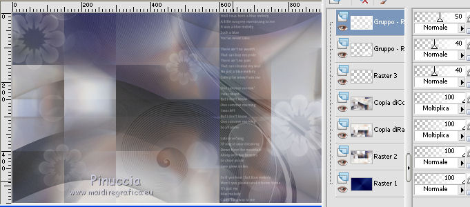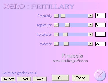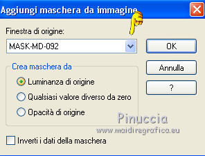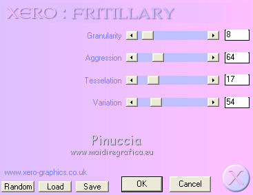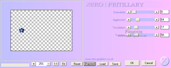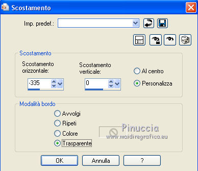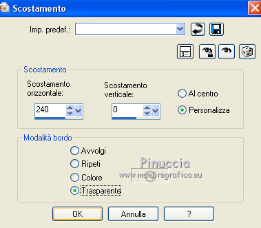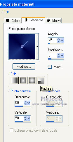 Occorrente: Materiale qui Grazie per il tube della donna J.vd.E-Jeanne. Il © appartiene all'artista originale. Mantieni il credito di chi ha creato il tube. Filtri in caso di dubbi, ricorda di consultare la mia sezione filtri qui Xero - Fritillary qui Mehdi - Sorting Tiles qui Animation Shop qui ![]() Apri le maschere in PSP e minimizzale con il resto del materiale. 1. Imposta il colore di primo piano con #1b307a, e il colore di sfondo con #000040. ![]() Passa il colore di primo piano a Gradiente di primo piano/sfondo, stile Radiale. ![]() 2. Apri una nuova immagine trasparente 900 x 550 pixels, e riempila con il gradiente.3. Livelli>Nuovo livello raster. Selezione>Seleziona tutto. 4. Apri il tube di Jeanne woman-jurri, e vai a Modifica>Copia. non chiuderlo perchè ti servirà ancora Torna al tuo lavoro e vai a Modifica>Incolla nella selezione. Selezione>Deseleziona. 5. Effetti>Effetti di immagine>Motivo unico. ![]() 6. Regola>Sfocatura>Sfocatura radiale. ![]() 7. Effetti>Plugins>Mehdi - Sorting Tiles. ![]() 8. Livelli>Duplica. Immagine>Capovolgi. Cambia la modalità di miscelatura di questo livello in Moltiplica. ![]() 9. Livelli>Duplica. Effetti>Effetti di distorsione>Onda. ![]() 10. Effetti>Effetti 3D>Sfalsa ombra, colore nero. ![]() 11. Apri "tekst les 125 Blue Melodie", e vai a Modifica>Copia. Torna al tuo lavoro e vai a Modifica>Incolla come nuovo livello. Effetti>Effetti di immagine>Scostamento. ![]() Abbassa l'opacità di questo livello al 40%. 12. Imposta il colore di primo piano con il colore bianco #ffffff. Livelli>Nuovo livello raster. Riempi con il colore bianco #ffffff.13. Livelli>Nuovo livello maschera>Da immagine. Apri il menu sotto la finestra di origine e vedrai la lista dei files aperti. Seleziona la maschera MD 092. ![]() Livelli>Unisci>Unisci gruppo. Abbassa l'opacità di questo livello al 40%. 14. Livelli>Nuovo livello raster. Riempi con il colore bianco #ffffff.15. Livelli>Nuovo livello maschera>Da immagine. Apri il menu sotto la finestra di origine e seleziona la maschera les125. ![]() Livelli>Unisci>Unisci gruppo. Abbassa l'opacità di questo livello al 50%. ![]() 16. Immagine>Aggiungi bordatura, 1 pixel, simmetriche, colore #1b307a. Immagine>Aggiungi bordatura, 1 pixel, simmetriche, colore bianco #ffffff. Immagine>Aggiungi bordatura, 1 pixel, simmetriche, colore #1b307a. Immagine>Aggiungi bordatura, 40 pixels, simmetriche, colore bianco #ffffff. 17. Immagine>Aggiungi bordatura, 1 pixel, simmetriche, #1b307a. Selezione>Seleziona tutto. Immagine>Aggiungi bordatura, 24 pixels, simmetriche, colore bianco #ffffff. Effetti>Effetti 3D>Sfalsa ombra, colore nero. ![]() Ripeti l'Effetto Sfalsa ombra, cambiando verticale e orizzontale con -4. Selezione>Deseleziona. 18. Attiva nuovamente il tube di Jeanne woman-jurri, e vai a Modifica>Copia. Torna al tuo lavoro e vai a Modifica>Incolla come nuovo livello. Immagine>Ridimensiona, al 90%, tutti i livelli non selezionato. Spostalo un po' più in basso e a sinistra.Effetti>Effetti 3D>Sfalsa ombra, colore nero. ![]() 19. Apri il tube tekst blue 125. Copia il livello Raster 2. Torna al tuo lavoro e vai a Modifica>Incolla come nuovo livello. Spostalo sul bordo in alto a destra.![]() 20. Firma il tuo lavoro su un nuovo livello. 21. Immagine>Aggiungi bordatura, 1 pixel, simmetriche, #1b307a. Se non vuoi realizzare l'animazione, salva in formato jpg. Se vuoi realizzare l'animazione continua. 22. Attiva nuovamente il tube tekst blue 125 e copia il livello "bloem". Torna al tuo lavoro e vai a Modifica>Incolla come nuovo livello. Mantieni l'opacità al 50%. 23. Effetti>Effetti di immagine>Scostamento. ![]() 24. Effetti>Plugins>Xero - Fritillary. ![]() 25. Modifica>Copia Unione. Apri Animation Shop e vai a Modifica>Incolla>Incolla come nuova animazione. 26. Torna in PSP. Modifica>Annulla azione Fritillary. Effetti>Plugins>Xero - Fritillary - cambia Variation con 52 e ok. ![]() Modifica>Copia Unione. Torna in Animation Shop e vai a Modifica>Incolla>Incolla dopo il fotogramma corrente. 27. Di nuovo in PSP. Modifica>Annulla azione Fritillary. Effetti>Plugins>Xero - Fritillary - cambia Variation con 54 e ok. ![]() Modifica>Copia Unione. In Animation Shop: Modifica>Incolla>Incolla dopo il fotogramma corrente. 28. Modifica>Seleziona tutto. Animazione>Proprietà fotogramma, e imposta la velocità a 30. ![]() Animazione>Ridimensiona animazione, a tuo piacimento. Controlla il risultato cliccando su Visualizza e salva in formato gif.Per questo esempio ho usato un tube di Alies. ![]() ![]() Le vostre versioni. Grazie ![]() Olimpia ![]() Mylène ![]() Trovi la mia mail nella barra superiore del menu. Puoi scrivermi per qualsiasi problema, o dubbio se trovi un link che non funziona, o anche soltanto per dirmi se questo tutorial ti è piaciuto. 28 Marzo 2015 |