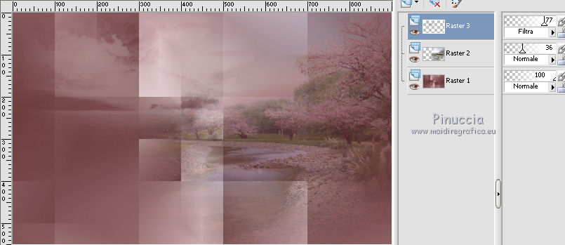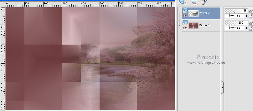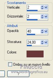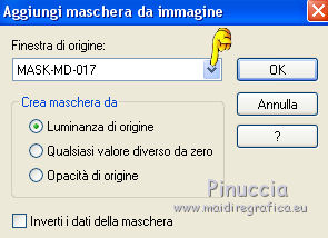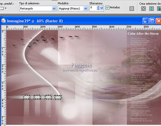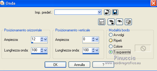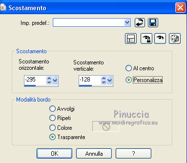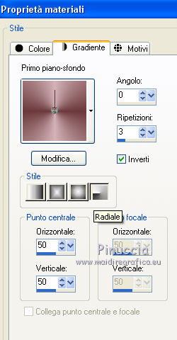 qui puoi trovare qualche risposta ai tuoi dubbi. Se l'argomento che ti interessa non è presente, ti prego di segnalarmelo. Questo tutorial è stato creato con PSP X2, ma può essere eseguito anche con le altre versioni. Dalla versione X4, il comando Immagine>Rifletti è stato sostituito con Immagine>Capovolgi in orizzontale, e il comando Immagine>Capovolgi con Immagine>Capovolgi in verticale. Nelle versioni X5 e X6, le funzioni sono state migliorate rendendo disponibile il menu Oggetti. Con la nuova versione X7 sono tornati Rifletti/Capovolgi, ma con nuove differenze. Vedi la scheda sull'argomento qui traduzione francese/traduction française qui/ici Le vostre versioni/vos versions qui/ici Occorrente: Materiale qui Per il tube grazie Beatriz. Il tube deco è di Corry. Il © appartiene all'artista originale. Mantieni il credito di chi ha creato il tube. Filtri in caso di dubbi, ricorda di consultare la mia sezione filtri qui Mehdi - Sorting Tiles qui Mura's Meister - Copies qui Flaming Pear - Flood qui Alien Skin Eye Candy 5 Impact - Perspective Shadow qui ![]() Se utilizzi altri colori, non esitare a cambiare modalità di miscelatura e opacità dei livelli Nelle ultime versioni di PSP non c'è il gradiente di primo piano/sfondo (Corel_06_029) Trovi i gradienti delle versioni precedenti qui Apri la maschera in PSP e minimizzala con il resto del materiale. 1. Imposta il colore di primo piano con #6b393b, e il colore di sfondo con #d3b3b8. ![]() Passa il colore di primo piano a Gradiente di primo piano/sfondo, stile Radiale. ![]() 2. Apri una nuova immagine trasparente 900 x 550 pixels, e riempila con il gradiente.3. Effetti>Plugins>Mehdi - Sorting Tiles. ![]() 4. Immagine>Rifletti. 5. Apri il tube "achtergrond" e vai a Modifica>Copia. Torna al tuo lavoro e vai a Modifica>Incolla come nuovo livello. Spostalo contro il bordo a destra.Abbassa l'opacità di questo livello al 36%. ![]() 6. Apri il tube "wolken", e vai a Modifica>Copia. Torna al tuo lavoro e vai a Modifica>Incolla come nuovo livello. Effetti>Effetti di immagine>Scostamento. ![]() Cambia la modalità di miscelatura di questo livello in Filtra e abbassa l'opacità al 77%. ![]() 7. Apri il tube tekst, composto da due livelli, Copia il livello Raster 2 e vai a Modifica>Copia. Torna al tuo lavoro e vai a Modifica>Incolla come nuovo livello. Spostalo a destra.Abbassa l'opacità di questo livello all'80%. Attiva nuovamente il tube tekst e copia il livello superiore del titolo. Torna al tuo lavoro e vai a Modifica>Incolla come nuovo livello. Posiziona il titolo sopra il testo.8. Imposta il colore di sfondo con il colore bianco #ffffff. Livelli>Nuovo livello raster. Riempi con il colore bianco #ffffff.Livelli>Nuovo livello maschera>Da immagine. Apri il menu sotto la finestra di origine e vedrai la lista dei files aperti. Seleziona la maschera MD 017. ![]() Livelli>Unisci>Unisci gruppo. Abbassa l'opacità di questo livello all'85%. 9. Apri il tube vogels les 127 e vai a Modifica>Copia. Torna al tuo lavoro e vai a Modifica>Incolla come nuovo livello. Spostalo in alto a sinistra.10. Livelli>Nuovo livello raster. Attiva lo strumento Selezione ![]() (non importa il tipo di selezione impostato, perchè con la selezione personalizzata si ottiene sempre un rettangolo) clicca sull'icona Selezione personalizzata ![]() e imposta i seguenti settaggi. ![]() Riempi con il colore bianco #ffffff.Selezione>Deseleziona. 11. Effetti>Plugins>Mura's Meister - Copies. ![]() 12. Effetti>Effetti di distorsione>Onda. ![]() 13. Effetti>Plugins>Alien Skin Eye Candy 5 Impact - Perspective Shadow. Seleziona il preset les 127 shadow, e ok. In caso di problemi con il preset, puoi copiare i settaggi della schermata. ![]() Abbassa l'opacità di questo livello all'85%. 14. Apri element 33, vai a Modifica>Copia. Torna al tuo lavoro e vai a Modifica>Incolla come nuovo livello. Effetti>Effetti di immagine>Scostamento. ![]() 15. Attiva lo strumento Selezione , rettangolo,modalità aggiungi e seleziona i quadretti. ![]() 16. Regola>Tonalità e saturazione>Viraggio. ![]() Selezione>Deseleziona. 17. Livelli>Duplica. Attiva il livello sottostante. Effetti>Plugins>Flaming Pear - Flood. ![]() Cambia la modalità di miscelatura di questo livello in Filtra. 18. Immagine>Aggiungi bordatura, 1 pixel, simmetriche, colore di primo piano #6b393b. Immagine>Aggiungi bordatura, 20 pixels, simmetriche, colore bianco #ffffff. Immagine>Aggiungi bordatura, 1 pixel, simmetriche, colore di primo piano #6b393b. Immagine>Aggiungi bordatura, 1 pixel, simmetriche, colore bianco #ffffff. Immagine>Aggiungi bordatura, 1 pixel, simmetriche, colore di primo piano #6b393b. Selezione>Seleziona tutto. Immagine>Aggiungi bordatura, 30 pixels, simmetriche, colore bianco #ffffff. Effetti>Effetti 3D>Sfalsa ombra, colore di primo piano #6b393b. ![]() Selezione>Deseleziona. 19. Firma il tuo lavoro su un nuovo livello. 20. Apri il tube della donna e vai a Modifica>Copia. Torna al tuo lavoro e vai a Modifica>Incolla come nuovo livello. Spostalo un po' più a destra.Effetti>Effetti 3D>Sfalsa ombra, colore nero. ![]() 21. Immagine>Aggiungi bordatura, 1 pixel, simmetriche, colore di primo piano #6b393b. 22. Ridimensiona, se vuoi, e salva in formato jpg. I tubes di questa versione sono di Gabry e Mentali ![]() ![]() Puoi scrivermi per qualsiasi problema, o dubbio se trovi un link che non funziona, o anche soltanto per dirmi se questo tutorial ti è piaciuto. 25 Giugno 2015 |