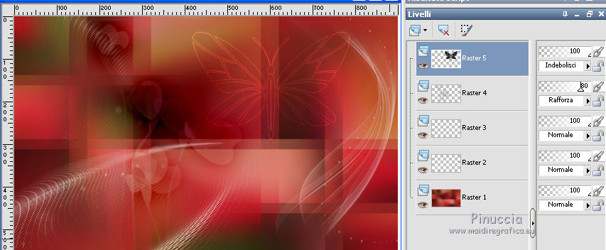 qui puoi trovare qualche risposta ai tuoi dubbi. Se l'argomento che ti interessa non è presente, ti prego di segnalarmelo. Questo tutorial è stato creato con CorelX9, ma può essere eseguito anche con le altre versioni. Dalla versione X4, il comando Immagine>Rifletti è stato sostituito con Immagine>Capovolgi in orizzontale, e il comando Immagine>Capovolgi con Immagine>Capovolgi in verticale. Nelle versioni X5 e X6, le funzioni sono state migliorate rendendo disponibile il menu Oggetti. Con la nuova versione X7 sono tornati Rifletti/Capovolgi, ma con nuove differenze. Vedi la scheda sull'argomento qui traduzione francese/traduction française qui/ici Vos versions quiOccorrente: Materiale qui Per il tube grazie Leny Il resto del materiale è di Corry. (in questa pagina trovi i links ai siti dei creatori di tubes) Filtri in caso di dubbi, ricorda di consultare la mia sezione filtri qui Filters Unlimited 2.0 qui Toadies - Weaver, Ommadawn qui Mehdi - Sorting Tiles qui Italian Editors Effect - Effetto Fantasma qui I filtri Toadies e Italian Editors si possono usare da soli o importati in Filters Unlimited (come fare vedi qui) Se un filtro fornito appare con questa icona ![]() Se utilizzi altri colori, non esitare a cambiare modalità di miscelatura e opacità dei livelli 1. Imposta il colore di primo piano con #7b1018, e il colore di sfondo con #ffffff. ![]() 2. Apri una nuova immagine trasparente 900 x 550 pixels. 3. Selezione>Seleziona tutto. Apri achtergrond les 156 e vai a Modifica>Copia. Torna al tuo lavoro e vai a Modifica>Incolla nella selezione. Selezione>Deseleziona. 4. Regola>Sfocatura>Sfocatura gaussiana - raggio 25. ![]() 5. Effetti>Plugins>Mehdi - Sorting Tiles. ![]() 6. Effetti>Plugins>Italian Editors Effect - Effetto Fantasma. ![]() 7. Apri element 1 e vai a Modifica>Copia. Torna al tuo lavoro e vai a Modifica>Incolla come nuovo livello. Non spostarlo; è al suo posto. 8. Apri element 2 e vai a Modifica>Copia. Torna al tuo lavoro e vai a Modifica>Incolla come nuovo livello. Spostalo a destra.Effetti>Effetti di bordo>Aumenta. 9. Apri element 3 e vai a Modifica>Copia. Torna al tuo lavoro e vai a Modifica>Incolla come nuovo livello. Tasto K per attivare lo strumento Puntatore ![]() e imposta Posizione X: 164,00 e Posizione Y: 10,00. ![]() Cambia la modalità di miscelatura di questo livello in Rafforza, e abbassa l'opacità all'80%. 10. Apri il tube butterfly vector e vai a Modifica>Copia. Torna al tuo lavoro e vai a Modifica>Incolla come nuovo livello. Imposta Posizione X: 417,00 e Posizione Y: 33,00. ![]() Cambia la modalità di miscelatura di questo livello in Indebolisci. ![]() 11. Apri il tube tekst e vai a Modifica>Copia. Torna al tuo lavoro e vai a Modifica>Incolla come nuovo livello. Imposta Posizione X: 2,00 e Posizione Y: 141,00. ![]() Abbassa l'opacità di questo livello al 60%. 12. Apri il tube tekst 2 e vai a Modifica>Copia. Torna al tuo lavoro e vai a Modifica>Incolla come nuovo livello. Imposta Posizione X: -48,00 e Posizione Y: 286,00. ![]() 13. Apri il tube flower e vai a Modifica>Copia. Torna al tuo lavoro e vai a Modifica>Incolla come nuovo livello. Imposta Posizione X: 474,00 e Posizione Y: 321,00. ![]() Tasto M per deselezionare lo strumento. 14. Effetti>Plugins>Toadies - Weaver, con i settaggi standard. ![]() 15. Effetti>Plugins>Toadies - Ommadawn, con i settaggi standard. ![]() 16. Modifica>Incolla come nuovo livello (il tube flowers del punto 13 è sempre in memoria). Tasto K per attivare lo strumento Puntatore ![]() e imposta Posizione X: 474,00 e Posizione Y: 321,00. ![]() 17. Effetti>Effetti 3D>Sfalsa ombra, colore nero. ![]() 18. Apri il tube dieren de vlinder, cancella il watermark e vai a Modifica>Copia. Torna al tuo lavoro e vai a Modifica>Incolla come nuovo livello. Immagine>Ridimensiona, al 60%, tutti i livelli non selezionato. Sposta il tube un po' più a sinistra.![]() 19. Effetti>Effetti 3D>Sfalsa ombra, con i settaggi precedenti. ![]() 20. Immagine>Aggiungi bordatura, 1 pixel, simmetriche, colore di primo piano #7b1018. Immagine>Aggiungi bordatura, 1 pixels, simmetriche, colore #ffffff. Immagine>Aggiungi bordatura, 1 pixel, simmetriche, colore di primo piano #7b1018. Immagine>Aggiungi bordatura, 30 pixels, simmetriche, colore #ffffff. Immagine>Aggiungi bordatura, 1 pixel, simmetriche, colore di primo piano #7b1018. Selezione>Seleziona tutto. Immagine>Aggiungi bordatura, 40 pixels, simmetriche, colore #ffffff. Effetti>Effetti 3D>Sfalsa ombra, colore nero. ![]() Selezione>Deseleziona. 21. Apri il tube rand butterflies e vai a Modifica>Copia. Torna al tuo lavoro e vai a Modifica>Incolla come nuovo livello. Spostalo in alto.Effetti>Effetti 3D>Sfalsa ombra, colore nero. ![]() 22. Firma il tuo lavoro su un nuovo livello. Immagine>Aggiungi bordatura, 1 pixel, simmetriche, colore di primo piano #7b1018. Salva in formato jpg. Versione con tube di Lizztish ![]() ![]() Puoi scrivermi per qualsiasi problema, o dubbio, se trovi un link che non funziona, o anche soltanto per un saluto. 15 Marzo 2021 |