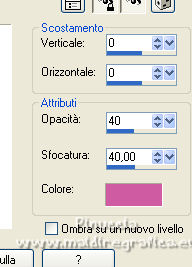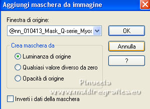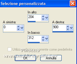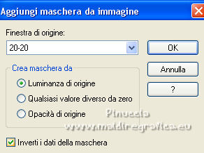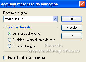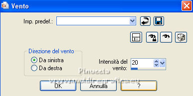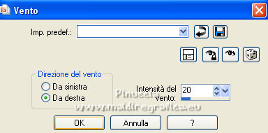 qui puoi trovare qualche risposta ai tuoi dubbi. Se l'argomento che ti interessa non è presente, ti prego di segnalarmelo. Questo tutorial è stato creato con CorelX9, ma può essere eseguito anche con le altre versioni. Dalla versione X4, il comando Immagine>Rifletti è stato sostituito con Immagine>Capovolgi in orizzontale, e il comando Immagine>Capovolgi con Immagine>Capovolgi in verticale. Nelle versioni X5 e X6, le funzioni sono state migliorate rendendo disponibile il menu Oggetti. Con la nuova versione X7 sono tornati Rifletti/Capovolgi, ma con nuove differenze. Vedi la scheda sull'argomento qui traduzione francese/traduction française qui/ici Vos versions quiOccorrente: Materiale qui Per il tube e una maschera grazie Gabry e @nn. Il resto del materiale è di Corry. (in questa pagina trovi i links ai siti dei creatori di tubes) Filtri in caso di dubbi, ricorda di consultare la mia sezione filtri qui Flaming Pear - Flood qui Alien Skin Eye Candy 5 Impact - Glass, Perspective Shadow qui ![]() Se utilizzi altri colori, non esitare a cambiare modalità di miscelatura e opacità dei livelli Metti i preset Cliccando sul file una o due volte (a seconda delle tue impostazioni), automaticamente il preset si installerà nella cartella corretta. perchè uno o due clic vedi qui Apri le maschere in PSP e minimizzale con il resto del materiale. 1. Imposta il colore di primo piano con #cf5ba3, e il colore di sfondo con #ffffff. ![]() 2. Apri una nuova immagine trasparente 900 x 550 pixels. Selezione>Seleziona tutto. 3. Apri l'immagine di sfondo Achtergrond les 159 e vai a Modifica>Copia. Torna al tuo lavoro e vai a Modifica>Incolla nella selezione. Selezione>Deseleziona. 4. Regola>Sfocatura>Sfocatura gaussiana - raggio 20. ![]() 5. Effetti>Effetti di distorsione>Coordinate polari. ![]() 6. Livelli>Nuovo livello raster. Riempi il livello con il colore bianco di sfondo #ffffff.Livelli>Nuovo livello maschera>Da immagine. Apri il menu sotto la finestra di origine e vedrai la lista dei files aperti. Seleziona la maschera Masker les 159. ![]() Livelli>Unisci>Unisci gruppo. 7. Livelli>Nuovo livello raster. Riempi il livello con il colore bianco di sfondo #ffffff.Livelli>Nuovo livello maschera>Da immagine. Apri il menu sotto la finestra di origine e seleziona la maschera @010413. ![]() Livelli>Unisci>Unisci gruppo. 8. Livelli>Nuovo livello maschera>Da immagine. Apri il menu sotto la finestra di origine e seleziona la maschera 20-20. ![]() Livelli>Unisci>Unisci gruppo. 9. Apri il tube element 1 les 159 e vai a Modifica>Copia. Torna al tuo lavoro e vai a Modifica>Incolla come nuovo livello. Spostalo a destra.Abbassa l'opacità di questo livello all'80%. ![]() 10. Apri il tube element 2 flower les 159 e vai a Modifica>Copia. Torna al tuo lavoro e vai a Modifica>Incolla come nuovo livello. 11. Tasto K sulla tastiera per attivare lo strumento Puntatore ![]() e imposta Posizione x: 180,00 e Posizione Y: 1,00. ![]() Tasto M per deselezionare lo strumento. Abbassa l'opacità di questo livello all'80%. ![]() 12. Effetti>Plugins>Alien Skin Eye Candy 5 Impact - Perspective Shadow. Seleziona il preset shadow les 159 e ok. ![]() 13. Livelli>Nuovo livello raster. Attiva lo strumento Selezione ![]() (non importa il tipo di selezione impostato, perchè con la selezione personalizzata si ottiene sempre un rettangolo) clicca sull'icona Selezione personalizzata ![]() e imposta i seguenti settaggi. ![]() Riempi la selezione con il colore bianco #ffffff.Selezione>Modifica>Contrai - 1 pixels. Premi sulla tastiera il tasto CANC ![]() Selezione>Deseleziona. 14. Effetti>Effetti di distorsione>Vento - da sinistra, intensità 20. ![]() Ripeti l'Effetto Vento, questa volta da destra. ![]() 15. Apri element 3 les 159 e vai a Modifica>Copia. Torna al tuo lavoro e vai a Modifica>Incolla come nuovo livello. 16. Tasto K per attivare lo strumento Puntatore ![]() e imposta Posizione X: 239,00 e Posizione Y: 205,00. ![]() ![]() Tasto M per deselezionare lo strumento. 17. Livelli>Unisci>Unisci giù. 18. Attiva lo strumento Bacchetta magica ![]() e clicca nel quadro al centro per selezionarlo. ![]() Attiva il livello inferiore. Selezione>Innalza selezione a livello. 19. Effetti>Plugins>Alien Skin Eye Candy 5 Impact - Glass. Seleziona il preset glass les 159 e ok. ![]() Selezione>Deseleziona. Abbassa l'opacità di questo livello all'80%. 20. Attiva nuovamente il livello inferiore. Attiva lo strumento Selezione , cerchio,e disegna un cerchio al centro del fiore ![]() Selezione>Innalza selezione a livello. Effetti>Plugins>Alien Skin Eye Candy 5 Impact - Glass, con i settaggi precedenti. Selezione>Deseleziona. Livelli>Disponi>Porta in alto. 21. Apri il tube birds e vai a Modifica>Copia. Torna al tuo lavoro e vai a Modifica>Incolla come nuovo livello. Spostalo in alto.22. Apri tekst 1 les 159 e vai a Modifica>Copia. Torna al tuo lavoro e vai a Modifica>Incolla come nuovo livello. Spostalo sotto il quadretto.Abbassa l'opacità di questo livello all'80%. ![]() 23. Apri tekst 2 les 159. e vai a Modifica>Copia. Torna al tuo lavoro e vai a Modifica>Incolla come nuovo livello. Spostalo a destra24. Effetti>Plugins>Alien Skin Eye Candy 5 Impact - Perspective Shadow, con i settaggi precedenti. 25. Apri il tube Gabry fiore e vai a Modifica>Copia. Torna al tuo lavoro e vai a Modifica>Incolla come nuovo livello. Immagine>Ridimensiona, al 70%, tutti i livelli non selezionato. Sposta il tube a sinistra.![]() 26. Effetti>Plugins>Flaming Pear - Flood ![]() 27. Immagine>Aggiungi bordatura, 1 pixel, simmetriche, colore #cf5ba3. Immagine>Aggiungi bordatura, 30 pixels, simmetriche, colore #ffffff. Immagine>Aggiungi bordatura, 1 pixel, simmetriche, colore #cf5ba3. Selezione>Seleziona tutto. Immagine>Aggiungi bordatura, 40 pixels, simmetriche, colore #ffffff. Effetti>Effetti 3D>Sfalsa ombra, colore #cf5ba3. ![]() Selezione>Deseleziona. 28. Firma il tuo lavoro su un nuovo livello. Immagine>Aggiungi bordatura, 1 pixel, simmetriche, colore #cf5ba3. Salva in formato jp