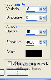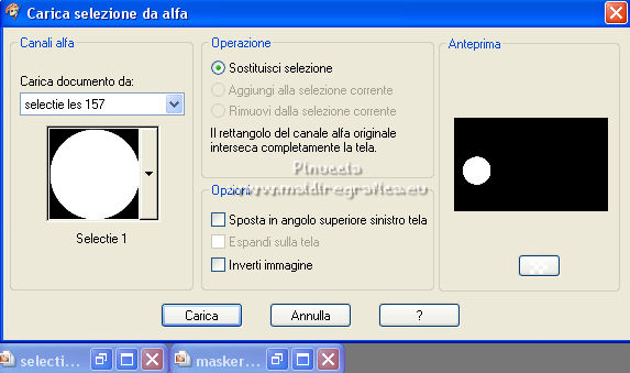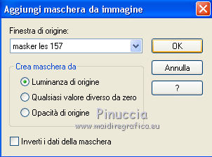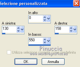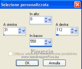 qui puoi trovare qualche risposta ai tuoi dubbi. Se l'argomento che ti interessa non è presente, ti prego di segnalarmelo. Questo tutorial è stato creato con CorelX9, ma può essere eseguito anche con le altre versioni. Dalla versione X4, il comando Immagine>Rifletti è stato sostituito con Immagine>Capovolgi in orizzontale, e il comando Immagine>Capovolgi con Immagine>Capovolgi in verticale. Nelle versioni X5 e X6, le funzioni sono state migliorate rendendo disponibile il menu Oggetti. Con la nuova versione X7 sono tornati Rifletti/Capovolgi, ma con nuove differenze. Vedi la scheda sull'argomento qui traduzione francese/traduction française qui/ici Vos versions quiOccorrente: Materiale qui Per il tube grazie Cickadesign Il resto del materiale è di Corry. (in questa pagina trovi i links ai siti dei creatori di tubes) Filtri in caso di dubbi, ricorda di consultare la mia sezione filtri qui AP 01 [Innovations] - Lines SilverLining qui Alien Skin Eye Candy 5 Impact - Glass qui ![]() Se utilizzi altri colori, non esitare a cambiare modalità di miscelatura e opacità dei livelli Metti il preset Cliccando sul file una o due volte (a seconda delle tue impostazioni), automaticamente il preset si installerà nella cartella corretta. perchè uno o due clic vedi qui Apri la maschera e la selezione in PSP e minimizzale con il resto del materiale. 1. Imposta il colore di primo piano con #d04171, e il colore di sfondo con #ffffff. ![]() 2. Apri una nuova immagine trasparente 900 x 550 pixels. 3. Selezione>Seleziona tutto. Apri achtergrond les 157 e vai a Modifica>Copia. Torna al tuo lavoro e vai a Modifica>Incolla nella selezione. Selezione>Deseleziona. (puoi anche creare uno sfondo con l'immagine di un fiore, a cui avrai applicato una sfocatura gaussiana). 4. Apri element 1 les 157 e vai a Modifica>Copia. Torna al tuo lavoro e vai a Modifica>Incolla come nuovo livello. Tasto K sulla tastiera per attivare lo strumento Puntatore ![]() e imposta Posizione X: 575,00 e Posizione Y: 0,00. ![]() 5. Apri element 2 les 157 e vai a Modifica>Copia. Torna al tuo lavoro e vai a Modifica>Incolla come nuovo livello. Imposta Posizione x: 154,00 e Posizione Y: -2. ![]() Tasto M per deselezionare lo strumento. Abbassa l'opacità di questo livello all'80%. 6. Livelli>Nuovo livello raster. Riempi il livello con il colore bianco #ffffff.Livelli>Nuovo livello maschera>Da immagine. Apri il menu sotto la finestra di origine e vedrai la lista dei files aperti. Seleziona la maschera Masker les 157. ![]() Livelli>Unisci>Unisci gruppo. 7. Livelli>Nuovo livello raster. Attiva lo strumento Selezione ![]() (non importa il tipo di selezione impostato, perchè con la selezione personalizzata si ottiene sempre un rettangolo) clicca sull'icona Selezione personalizzata ![]() e imposta i seguenti settaggi. ![]() Riempi la selezione con il colore bianco.8. Effetti>Plugins>AP 01 [Innovations] - Lines SilverLining. ![]() Abbassa l'opacità di questo livello al 20%. Selezione>Deseleziona. 9. Livelli>Nuovo livello raster. Selezione personalizzata ![]() ![]() Riempi la selezione con il colore bianco.10. Effetti>Plugins>AP 01 [Innovations] - Lines SilverLining, con i settaggi precedenti. ![]() Abbassa l'opacità di questo livello al 20%. Selezione>Deseleziona. 11. Livelli>Unisci>Unisci giù. 12. Se non lo hai fatto prima di cominciare, apri la selezione selectie les 157 e minimizzala nella tua area di lavoro. Questo renderà disponibile la selezione salvata sul canale alfa 13. Torna al tuo lavoro. Selezione>Carica/Salva selezione>Carica selezione da canale alfa. La selezione, salvata sul file minimizzato, è subito disponibile. Devi soltanto cliccare Carica. ![]() Premi sulla tastiera il tasto CANC ![]() 14. Selezione>Modifica>Contrai - 14 pixels. Riempi la selezione con il colore di primo piano #d04171.15. Selezione>Modifica>Contrai - 2 pixels. Riempi con il colore bianco.Selezione>Modifica>Contrai - 1 pixels. 16. Attiva nuovamente l'immagine di sfondo achtergrond les 157 e vai a Modifica>Copia. Torna al tuo lavoro e vai a Modifica>Incolla nella selezione. 17. Regola>Sfocatura>Sfocatura gaussiana - raggio 4. ![]() 18. Regola>Aggiungi/Rimuovi disturbo>Aggiungi disturbo. ![]() 19. Effetti>Plugins>Alien Skin Eye Candy 5 Impact - Glass. Seleziona il preset glass les 157 e ok. ![]() Selezione>Deseleziona. 20. Apri il tube Flowers e vai a Modifica>Copia. Torna al tuo lavoro e vai a Modifica>Incolla come nuovo livello. Tasto K sulla tastiera per attivare lo strumento Puntatore ![]() e imposta Posizione X: 11,00 e Posizione Y: 2,00. ![]() Livelli>Disponi>Sposta giù. 21. Apri il tube Butterflies e vai a Modifica>Copia. Torna al tuo lavoro e vai a Modifica>Incolla come nuovo livello. Imposta Posizione x: 630,00 e Posizione Y: 33,00. ![]() 22. Apri il tube tekst e vai a Modifica>Copia. Torna al tuo lavoro e vai a Modifica>Incolla come nuovo livello. Imposta Posizione x: 595,00 e Posizione Y: 324,00. ![]() Tasto M per deselezionare lo strumento. 23. Apri il tube della donna, cancella il watermark e vai a Modifica>Copia. Torna al tuo lavoro e vai a Modifica>Incolla come nuovo livello. Immagine>Ridimensiona, al 92%, tutti i livelli non selezionato. 24. Effetti>Effetti 3D>Sfalsa ombra, colore nero. ![]() 25. Imposta il colore di primo piano con il colore #4e748c. ![]() Immagine>Aggiungi bordatura, 1 pixels, simmetriche, colore #4e748c. Immagine>Aggiungi bordatura, 30 pixels, simmetriche, colore #ffffff. Immagine>Aggiungi bordatura, 1 pixel, simmetriche, colore #4e748c. Selezione>Seleziona tutto. Immagine>Aggiungi bordatura, 40 pixels, simmetriche, colore #ffffff. Effetti>Effetti 3D>Sfalsa ombra, colore #4e748c. ![]() Selezione>Deseleziona. 26. Apri il tube butterfly voor de rand e vai a Modifica>Copia. Torna al tuo lavoro e vai a Modifica>Incolla come nuovo livello. Posiziona correttamente il tube sul bordo, in alto a destra.![]() 27. Firma il tuo lavoro su un nuovo livello. Immagine>Aggiungi bordatura, 1 pixel, simmetriche, colore #4e748c. Salva in f