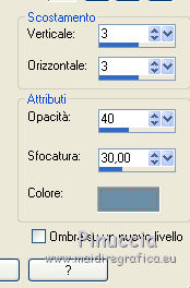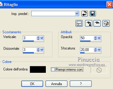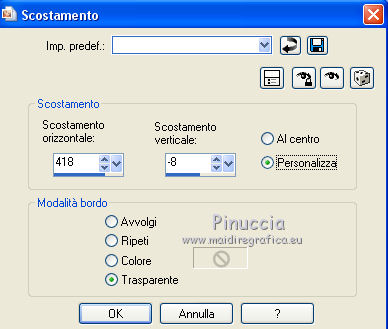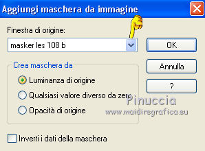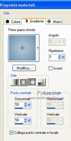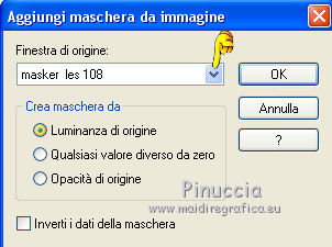 qui puoi trovare qualche risposta ai tuoi dubbi. Se l'argomento che ti interessa non è presente, ti prego di segnalarmelo. Questo tutorial è stato creato con PSP X2 e tradotto con CorelX, ma può essere eseguito anche con le altre versioni. Dalla versione X4, il comando Immagine>Rifletti è stato sostituito con Immagine>Capovolgi in orizzontale, e il comando Immagine>Capovolgi con Immagine>Capovolgi in verticale. Nelle versioni X5 e X6, le funzioni sono state migliorate rendendo disponibile il menu Oggetti. Con la versione X7 sono tornati i comandi Immagine>Rifletti e Immagine>Capovolgi, ma con nuove funzioni. Vedi la scheda sull'argomento qui traduzione francese qui Le vostre versioni qui Occorrente: Materiale qui Il tube del paesaggio è di Nicole. Il resto del materiale è di Corry. Il © appartiene all'artista originale. Mantieni il credito di chi ha creato il tube. Filtri in caso di dubbi, ricorda di consultare la mia sezione filtri qui Mura's Meister - Copies qui Carolaine and Sensibility - CS-LDots qui Flaming Pear - Flood qui ![]() Apri le maschere in PSP e minimizzale con il resto del materiale. 1. Imposta il colore di primo piano con #b9cfdd, e il colore di sfondo con #6c8fa8. ![]() Passa il colore di primo piano a Gradiente, stile Sprazzo di luce. ![]() 2. Apri una nuova immagine trasparente 900 x 600 pixels, e riempila con il gradiente.3. Apri il tube Nicole mistpaysage e vai a Modifica>Copia. Torna al tuo lavoro e vai a Modifica>Incolla come nuovo livello. Lascialo come sta. Livelli>Unisci>Unisci giù. 4. Effetti>Plugins>Flaming Pear - Flood. ![]() 5. Livelli>Nuovo livello raster. Riempi con il colore di sfondo.Livelli>Nuovo livello maschera>Da immagine. Apri il menu sotto la finestra di origine e vedrai la lista dei files aperti. Seleziona la maschera "les108", con i seguenti settaggi: ![]() Livelli>Unisci>Unisci gruppo. 6. Livelli>Nuovo livello raster. Riempi ancora con il colore di sfondo.Livelli>Nuovo livello maschera>Da immagine. Apri il menu sotto la finestra di origine e seleziona la maschera "les108b", con i seguenti settaggi: ![]() Livelli>Unisci>Unisci gruppo. 7. Apri l'elemento les108 e vai a Modifica>Copia. Torna al tuo lavoro e vai a Modifica>Incolla come nuovo livello. 8. Apri il tube les 108 tekst e vai a Modifica>Copia. Torna al tuo lavoro e vai a Modifica>Incolla come nuovo livello. Effetti>Effetti di immagine>Scostamento. ![]() 9. Attiva lo strumento Selezione , ellisse,e traccia una selezione a sinistra, come nel mio esempio. ![]() Livelli>Nuovo livello raster. Riempi con il colore di sfondo.10. Effetti>Plugins>Carolaine & Sensibility – CS-LDots. ![]() 11. Selezione>Modifica>Contrai - 12 pixels. 12. Effetti>Effetti 3D>Ritaglio. ![]() Selezione>Deseleziona. 13. Effetti>Plugins>Mura's Meister - Copies. ![]() Se necessario, posiziona correttamente l'ovale.14. Immagine>Aggiungi bordatura, 1 pixel, simmetriche, con il colore bianco. Immagine>Aggiungi bordatura, 2 pixels, simmetriche, con il colore di sfondo. Immagine>Aggiungi bordatura, 1 pixel, simmetriche, con il colore bianco. Immagine>Aggiungi bordatura, 2 pixels, simmetriche, con il colore di sfondo. 15. Selezione>Seleziona tutto. Immagine>Aggiungi bordatura, 30 pixels, simmetriche, con il colore bianco. 16. Effetti>Effetti 3D>Sfalsa ombra, colore #6c8fa8. ![]() Ripeti l'Effetto Sfalsa ombra, cambiando verticale e orizzontale con -3. Selezione>Deseleziona. 17. Effetti>Plugins>Flaming Pear - Flood, cambia soltanto horizon con 90 e ok. ![]() 18. Apri il tube "tekst cyclone" e vai a Modifica>Copia. Torna al tuo lavoro e vai a Modifica>Incolla come nuovo livello. Spostalo in basso a sinistra.![]() 19. Immagine>Aggiungi bordatura, 2 pixels, simmetriche, con il colore di sfondo. 20. Apri "deco les 108 pijl" e vai a Modifica>Copia. Torna al tuo lavoro e vai a Modifica>Incolla come nuovo livello. Spostalo in alto a destra.![]() 21. Apri il tube Yoka-Birds_LittleFlyingSwans3 e vai a Modifica>Copia. Torna al tuo lavoro e vai a Modifica>Incolla come nuovo livello. Immagine>Ridimensiona, al 110%, tutti i livelli non selezionato. Spostalo a sinistra.22. Effetti>Effetti 3D>Sfalsa ombra, colore nero. ![]() 23. Aggiungi il tuo nome e/o il tuo watermark su un nuovo livello. Livelli>Unisci>Unisci tutto e salva in formato jpg. ![]() Se hai problemi o dubbi, o trovi un link non funzionante, o anche soltanto per dirmi se questo tutorial ti è piaciuto, scrivimi. 30 Settembre 2013 |