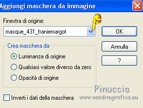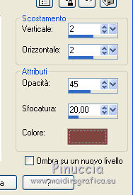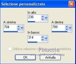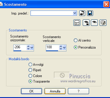Occorrente: Materiale qui Tubes – Drevers _Deco_ 49 –Animabelle Elementi – DesignCorry Testi – DesignCorry Maschera - 431 franiemargot Filtri in caso di dubbi, ricorda di consultare la mia sezione filtri qui Mehdi - Weaver qui Mehdi - Wavy Lab 1.1 qui Alien Skin Eye Candy 5 Impact - Glass qui ![]() Se utilizzi altri colori, non esitare a cambiare modalità di miscelatura e opacità dei livelli Metti il preset Cliccando sul file una o due volte (a seconda delle tue impostazioni), automaticamente il preset si installerà nella cartella corretta. perchè uno o due clic vedi qui Apri la maschera in PSP e minimizzala con il resto del materiale. Colori utilizzati ![]() 1. Imposta il colore di primo piano con #814640, e il colore di sfondo con #ddc5c3. ![]() 2. Apri una nuova immagine trasparente 900 x 550 pixels. 3. Effetti>Plugins>Mehdi - Wavy Lab 1.1. questo filtro lavora con i colori della paletta: il primo è il colore di sfondo, il secondo quello di primo piano. Mantieni gli ultimi due colori creati dal filtro. ![]() 4. Effetti>Plugins>Mehdi - Weaver. ![]() 5. Apri il tube Drevers_Deco_49 e vai a Modifica>Copia. Torna al tuo lavoro e vai a Modifica>Incolla come nuovo livello. 6. Effetti>Effetti di immagine>Scostamento. ![]() Abbassa l'opacità di questo livello al 74%. 7. Imposta il colore di sfondo con il colore bianco #ffffff. ![]() Livelli>Nuovo livello raster. Riempi il livello con il colore bianco #ffffff.Livelli>Nuovo livello maschera>Da immagine. Apri il menu sotto la finestra di origine e vedrai la lista dei files aperti. Seleziona la maschera masque_431 franiemargot. ![]() Livelli>Unisci>Unisci gruppo. 8. Apri element 1, e vai a Modifica>Copia. Torna al tuo lavoro e vai a Modifica>Incolla come nuovo livello. Spostalo nell'angolo in alto a destra.Cambia la modalità di miscelatura di questo livello in Filtra. 9. Apri element 2, e vai a Modifica>Copia. Torna al tuo lavoro e vai a Modifica>Incolla come nuovo livello. 10. Effetti>Effetti di immagine>Scostamento. ![]() Dovresti avere questo. ![]() 11. Apri element 3, e vai a Modifica>Copia. Torna al tuo lavoro e vai a Modifica>Incolla come nuovo livello. 12. Effetti>Effetti di immagine>Scostamento. ![]() 13. Effetti>Effetti 3D>Sfalsa ombra, colore nero. ![]() 14. Apri element 4, e vai a Modifica>Copia. Torna al tuo lavoro e vai a Modifica>Incolla come nuovo livello. 15. Effetti>Effetti di immagine>Scostamento. ![]() 16. Attiva il livello inferiore. Modifica>Copia. 17. Attiva il livello superiore. 18. Livelli>Nuovo livello raster. Attiva lo strumento Selezione ![]() (non importa il tipo di selezione impostato, perchè con la selezione personalizzata si ottiene sempre un rettangolo) clicca sull'icona Selezione personalizzata ![]() e imposta i seguenti settaggi. ![]() Riempi la selezione con il colore bianco #ffffff.Selezione>Modifica>Contrai - 14 pixels. Modifica>Incolla nella selezione. 19. Effetti>Plugins>Alien Skin Eye Candy 5 Impact - Glass. Seleziona il preset Glass les 136 e ok. ![]() Questi i settaggi, in caso di problemi con il preset. ![]() Selezione>Deseleziona. 20. Effetti>Effetti 3D>Sfalsa ombra, colore nero. ![]() Livelli>Unisci>Unisci visibile. 21. Apri tekst1 les 136, e vai a Modifica>Copia. Torna al tuo lavoro e vai a Modifica>Incolla come nuovo livello. Spostalo in alto a sinistra.Cambia la modalità di miscelatura di questo livello in Filtra. 22. Apri tekst 2 les 136, e vai a Modifica>Copia. Torna al tuo lavoro e vai a Modifica>Incolla come nuovo livello. Spostalo in basso a destra:![]() 23. Immagine>Aggiungi bordatura, 1 pixel, simmetriche, colore di primo piano #814640. Immagine>Aggiungi bordatura, 1 pixel, simmetriche, colore #ffffff. Immagine>Aggiungi bordatura, 1 pixel, simmetriche, colore di primo piano #814640. Immagine>Aggiungi bordatura, 20 pixels, simmetriche, colore #ffffff. Immagine>Aggiungi bordatura, 1 pixel, simmetriche, colore di primo piano #814640. Selezione>Seleziona tutto. Immagine>Aggiungi bordatura, 35 pixels, simmetriche, colore #ffffff. 24. Effetti>Effetti 3D>Sfalsa ombra, colore di primo piano #814640. ![]() Ripeti l'Effetto Sfalsa ombra, cambiando verticale e orizzontale con -2. Selezione>Deseleziona. 25. Apri il tube della donna, cancella il watermark, e vai a Modifica>Copia. Torna al tuo lavoro e vai a Modifica>Incolla come nuovo livello. Immagine>Ridimensiona, al 79%, tutti i livelli non selezionato. Posiziona correttamente il tube.26. Firma il tuo lavoro su un nuovo livello. 27. Immagine>Aggiungi bordatura, 1 pixel, simmetriche, colore di primo piano #814640. Immagine>Ridimensiona, 900 pixels di larghezza, o come preferisci, tutti i livelli selezionato. Salva in formato jpg. Il tube di questo esempio è di Min@ ![]() ![]() Puoi scrivermi per qualsiasi problema, o dubbio se trovi un link che non funziona, o anche soltanto per dirmi se questo tutorial ti è piaciuto. 18 Gennaio 2017 |