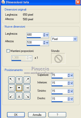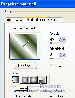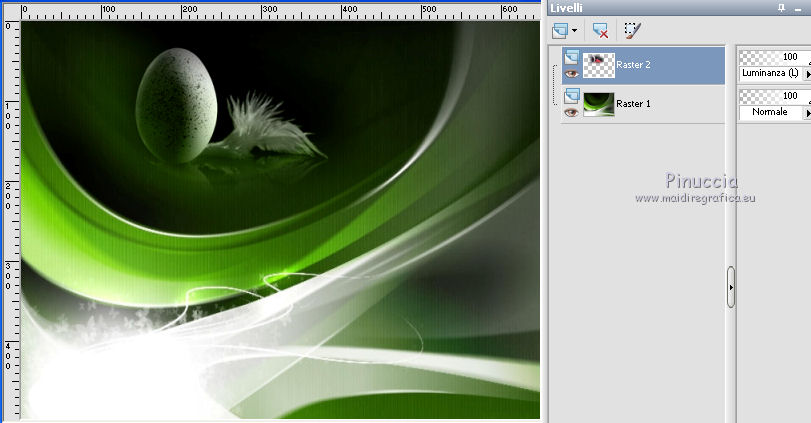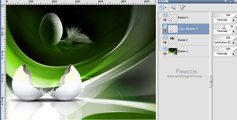 Occorrente: Materiale qui Grazie: per i tubes Guismo, Nikita e Corry. Filtri in caso di dubbi, ricorda di consultare la mia sezione filtri qui Penta.com - Color Dot qui Animation Shop qui ![]() Se utilizzi altri colori, non esitare a cambiare modalità di miscelatura e opacità dei livelli 1. Imposta il colore di primo piano con #ffffff, e il colore di sfondo con #2e4615. ![]() 2. Apri una nuova immagine trasparente 650 x 500 pixels. 3. Selezione>Seleziona tutto. Apri l'immagine di sfondo achtergrond les 83 e vai a Modifica>Copia. Torna al tuo lavoro e vai a Modifica>Incolla nella selezione. Selezione>Deseleziona. 4. Apri il tube calguismistoeuf e vai a Modifica>Copia. Torna al tuo lavoro e vai a Modifica>Incolla come nuovo livello. Spostalo in alto.Cambia la modalità di miscelatura di questo livello in Luminanza (esistente). ![]() 5. Apri il tube gebroken ei, e vai a Modifica>Copia. Torna al tuo lavoro e vai a Modifica>Incolla come nuovo livello. Spostalo in basso a sinistra.Livelli>Duplica. Immagine>Capovolgi. Posiziona il tube contro l'originale.Livelli>Disponi>Sposta giù. Abbassa l'opacità di questo livello al 50%. ![]() 6. Apri il tube della piuma e vai a Modifica>Copia. Torna al tuo lavoro e vai a Modifica>Incolla come nuovo livello. Immagine>Ridimensiona, 1 volta al 50% e una volta all'80%, tutti i livelli non selezionato. Spostalo in basso a sinistra, sopra l'uovo.7. Attiva il livello superiore. Immagine>Dimensioni tela - 680 x 530 pixels. ![]() Livelli>Nuovo livello raster. Selezione>Seleziona tutto. Riempi con il colore bianco di primo piano.Selezione>Modifica>Contrai - 2 pixels. Riempi con il colore di sfondo.Selezione>Modifica>Contrai - 16 pixels. Riempi con il colore bianco.Selezione>Modifica>Contrai - 2 pixels. Premi sulla tastiera il tasto CANC ![]() Selezione>Deseleziona. 8. Passa il colore di primo piano a Gradiente di primo piano/sfondo, stile Lineare. ![]() Attiva lo strumento Bacchetta magica ![]() e clicca nel bordo centrale per selezionarlo. Riempi la selezione con il gradiente.Effetti>Plugins>Penta.com - Color Dot, con i settaggi standard. ![]() 9. Effetti>Effetti 3D>Smusso a incasso. ![]() Selezione>Deseleziona. 10. Apri il tube utka 35 je, e vai a Modifica>Copia. Torna al tuo lavoro e vai a Modifica>Incolla come nuovo livello. Spostalo in basso a destra, sul bordo.![]() 11. Firma il tuo lavoro su un nuovo livello. 12. Animazione. Modifica>Copia Unione. Apri Animation Shop e vai a Modifica>Incolla>Incolla come nuova animazione. 13. Torna in PSP. Attiva il livello della piuma. Sposta la piuma un po' più in alto.Abbassa l'opacità di questo livello all'80%. ![]() Modifica>Copia Unione. Torna in Animation Shop e vai a Modifica>Incolla>Incolla dopo il fotogramma corrente. 14. Di nuovo in PSP. Sposta la piuma un po' più in alto e a sinistra (o a destra, come preferisci)![]() Modifica>Copia Unione. In Animation Shop Modifica>Incolla>Incolla dopo il fotogramma corrente. 15. In PSP. Sposta la piuma un po' più in alto e a sinistra (o a destra, come preferisci)![]() Modifica>Copia Unione. In Animation Shop Modifica>Incolla>Incolla dopo il fotogramma corrente. 16. Ripeti il punto precedente, finché la piuma non sarà quasi dal bordo superiore, e fino ad ottenere 8 fotogrammi. Per il mio esempio: ![]() ![]() ![]() ![]() 17. Modifica>Seleziona tutto. Animazione>Proprietà fotogramma e imposta la velocità 35. ![]() Clicca sul primo fotogramma per selezionarlo (soltanto questo deve essere selezionato) Animazione>Proprietà fotogramma, e imposta la velocità a 70. 18. Animazione>Ridimensiona animazione, 650 pixels di larghezza. Controlla il risultato cliccando su Visualizza ![]() e salva in formato gif. ![]() Puoi scrivermi per qualsiasi problema, o dubbio se trovi un link che non funziona, o anche soltanto per dirmi se questo tutorial ti è piaciuto. 25 Marzo 2017 |