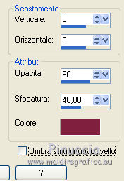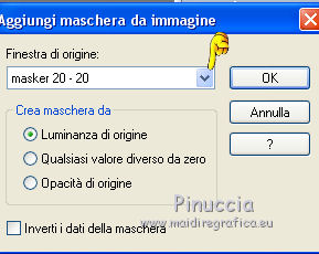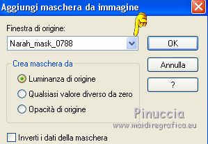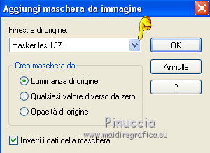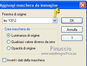 Occorrente: Materiale qui Grazie: per il tube della donna Drevers; per una maschera Narah. Il resto del materiale è di Corry. Filtri in caso di dubbi, ricorda di consultare la mia sezione filtri qui Mehdi - Weaver qui Mehdi - Wavy Lab 1.1 qui Ap Lines - Lines SilverLining qui Flaming Pear - Flexify 2 qui ![]() Se utilizzi altri colori, non esitare a cambiare modalità di miscelatura e opacità dei livelli Apri le maschere in PSP e minimizzale con il resto del materiale. Colori utilizzati ![]() 1. Imposta il colore di primo piano con #801f3e, e il colore di sfondo con #dfcbd1. ![]() 2. Apri una nuova immagine trasparente 900 x 550 pixels. 3. Effetti>Plugins>Mehdi - Wavy Lab 1.1. questo filtro lavora con i colori della paletta: il primo è il colore di sfondo, il secondo quello di primo piano. Mantieni gli ultimi due colori creati dal filtro. ![]() 4. Effetti>Plugins>Mehdi - Weaver. ![]() 5. Livelli>Nuovo livello raster. Riempi con il colore di primo piano #801f3e.Livelli>Nuovo livello maschera>Da immagine. Apri il menu sotto la finestra di origine e vedrai la lista dei files aperti. Seleziona la maschera Masker les 137-1. ![]() Livelli>Unisci>Unisci gruppo. 6. Effetti>Plugins>Flaming Pear - Flexify 2 ![]() 7. Effetti>Plugins>AP Lines - Lines SilverLining. ![]() 8. Livelli>Nuovo livello raster. Imposta il colore di sfondo con #fafbf5. ![]() Riempi il livello con il colore di sfondo #fafbf5.Livelli>Nuovo livello maschera>Da immagine. Apri il menu sotto la finestra di origine e seleziona la maschera les 137-2. ![]() Livelli>Unisci>Unisci gruppo. 9. Effetti>Effetti 3D>Sfalsa ombra, colore #801f3e. ![]() 10. Livelli>Nuovo livello raster. Riempi con il colore di sfondo #fafbf5.Livelli>Nuovo livello maschera>Da immagine. Apri il menu sotto la finestra di origine e seleziona la maschera Narah_0788. ![]() Livelli>Unisci>Unisci gruppo. 11. Apri "selectie les 137". Questa immagine non è vuota ma contiene una selezione salvata sul canale alfa. Minimizza l'immagine. Torna al tuo lavoro. Selezione>Carica/Salva selezione>Carica selezione da canale alfa. Carica la selezione selectie les 137 ![]() 12. Livelli>Nuovo livello raster. 13. Apri l'immagine "plaatje flower". Su questa immagine: Livelli>Nuovo livello maschera>Da immagine. Apri il menu sotto la finestra di origine e seleziona la maschera 20-20. ![]() Livelli>Unisci>Unisci gruppo. 14. Modifica>Copia. Torna al tuo lavoro e vai a Modifica>Incolla nella selezione. Selezione>Deseleziona. 15. Apri element 1 les 137, e vai a Modifica>Copia. Torna al tuo lavoro e vai a Modifica>Incolla come nuovo livello. 15. Per posizionarlo, tasto K per attivare lo strumento Puntatore ![]() e imposta le coordinate posizione X: 671,00 - posizione Y: 0. ![]() Tasto M per deselezionare lo strumento. 16. Apri element 2 les 137, e vai a Modifica>Copia. Torna al tuo lavoro e vai a Modifica>Incolla come nuovo livello. Strumento Puntatore ![]() e imposta Posizione X: 326,00 e Posizione Y: 31,00. ![]() Tasto M per deselezionare lo strumento. 17. Apri element 3 les 137, e vai a Modifica>Copia. Torna al tuo lavoro e vai a Modifica>Incolla come nuovo livello. Strumento Puntatore ![]() e imposta Posizione X: 30,00 e Posizione Y: 214,00. ![]() Tasto M per deselezionare lo strumento. 18. Apri tekst enjoy les 137, e vai a Modifica>Copia. Torna al tuo lavoro e vai a Modifica>Incolla come nuovo livello. Spostalo in basso a sinistra.Livelli>Duplica. Immagine>Capovolgi. Posiziona questo testo contro il precedente.Abbassa l'opacità di questo livello al 35% ![]() 19. Apri il tube delle farfalle. Scegli e seleziona le farfalle - Modifica>Copia.Torna al tuo lavoro e vai a Modifica>Incolla come nuovo livello. Posiziona le farfalle a tuo piacimento.20. Immagine>Aggiungi bordatura, 1 pixel, simmetriche, colore di primo piano #801f3e. Immagine>Aggiungi bordatura, 10 pixels, simmetriche, colore di sfondo #fafbf5. Immagine>Aggiungi bordatura, 1 pixel, simmetriche, colore di primo piano #801f3e. Immagine>Aggiungi bordatura, 2 pixels, simmetriche, colore di sfondo #fafbf5. Immagine>Aggiungi bordatura, 1 pixel, simmetriche, colore di primo piano #801f3e. 21. Selezione>Seleziona tutto. Immagine>Aggiungi bordatura, 35 pixels, simmetriche, colore di sfondo #fafbf5. 22. Effetti>Effetti 3D>Sfalsa ombra, colore nero. ![]() Selezione>Deseleziona. 23. Apri il tube Drevers woman 364 e vai a Modifica>Copia. Torna al tuo lavoro e vai a Modifica>Incolla come nuovo livello. Immagine>Rifletti. Immagine>Ridimensiona, all'86%, tutti i livelli non selezionato. Sposta il tube a destra.24. Effetti>Effetti 3D>Sfalsa ombra, con i settaggi precedenti. ![]() 25. Facoltativo: Attiva nuovamente il tube delle farfalle, scegli una farfalla e vai a Modifica>Copia. Torna al tuo lavoro e vai a Modifica>Incolla come nuovo livello. Spostala sul bordo a tuo piacimento, o vedi il mio esempio.26. Firma il tuo lavoro su un nuovo livello. 27. Immagine>Aggiungi bordatura, 1 pixel, simmetriche, colore di primo piano #801f3e. 28. Immagine>Ridimensiona - 900 pixels di larghezza o come preferisci, tutti i livelli selezionato. Salva in formato jpg. Il tube di questo esempio è di Gabry ![]() ![]() Puoi scrivermi per qualsiasi problema, o dubbio se trovi un link che non funziona, o anche soltanto per dirmi se questo tutorial ti è piaciuto. 9 Marzo 2017 |
